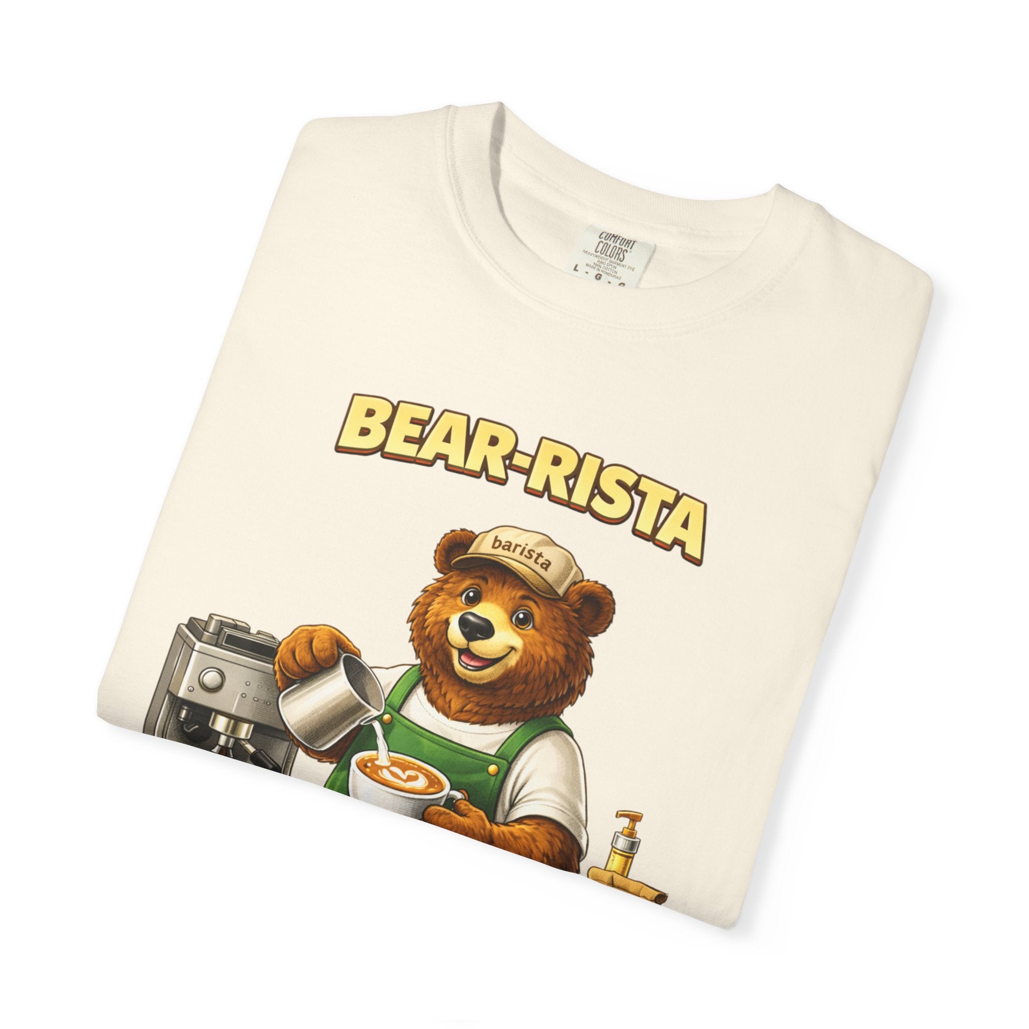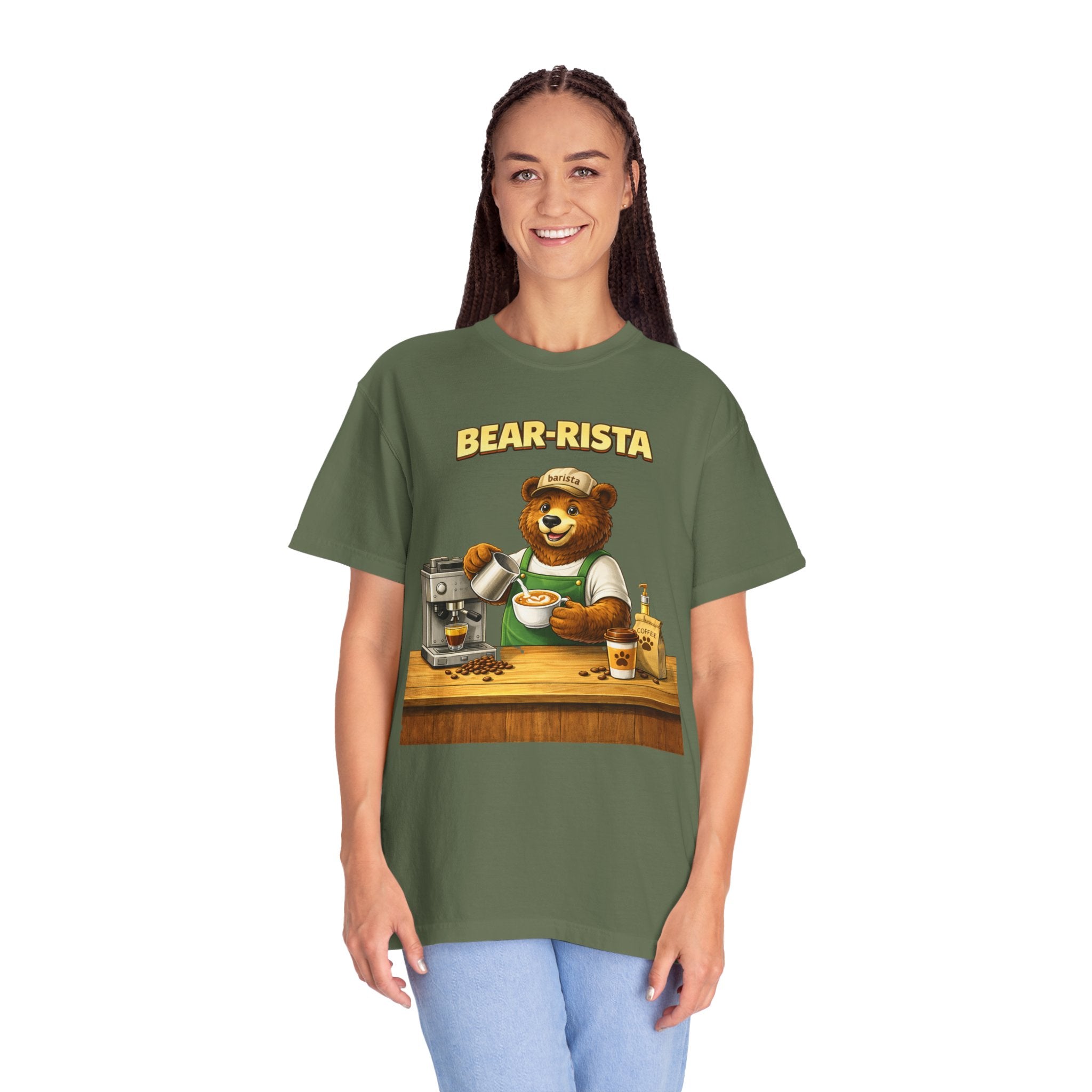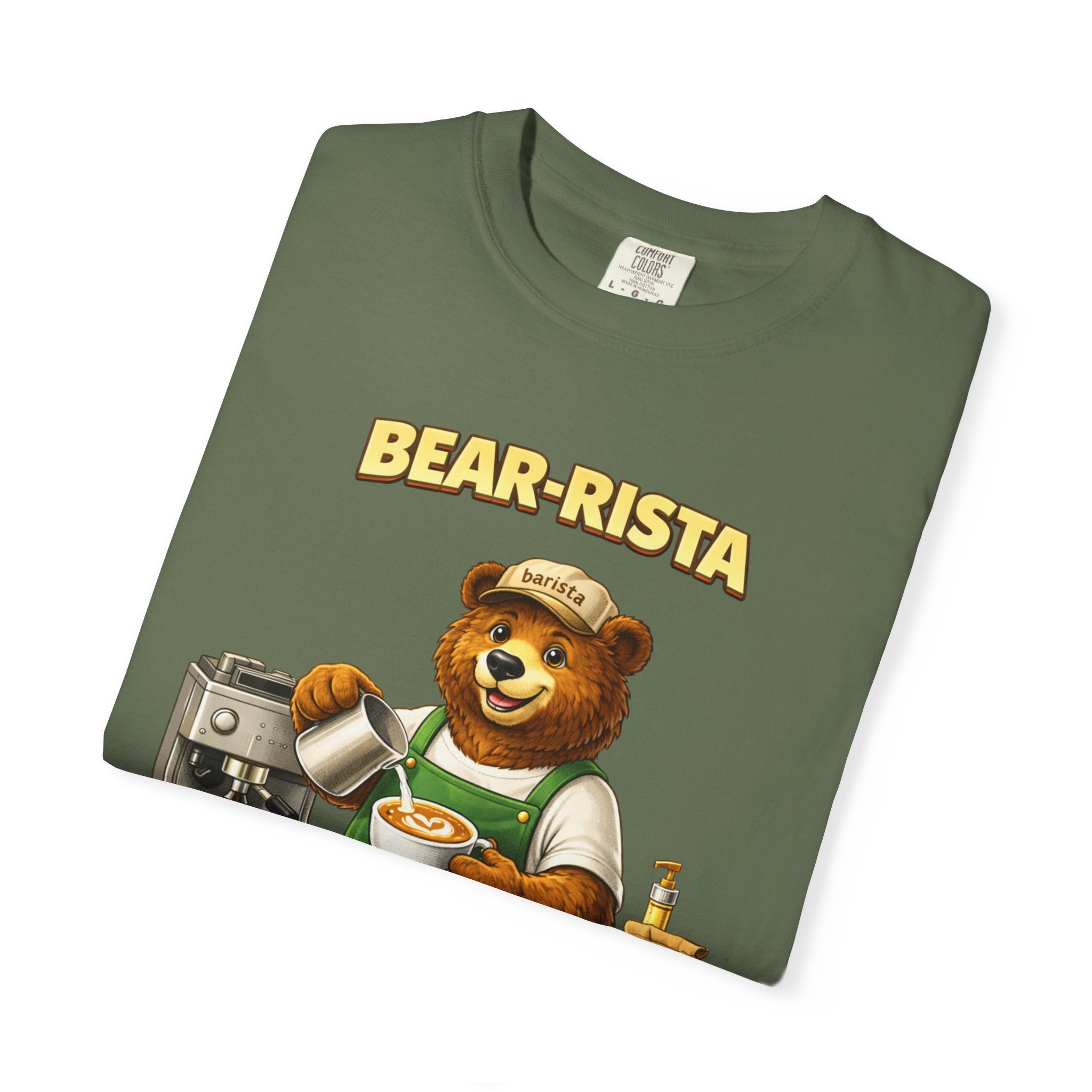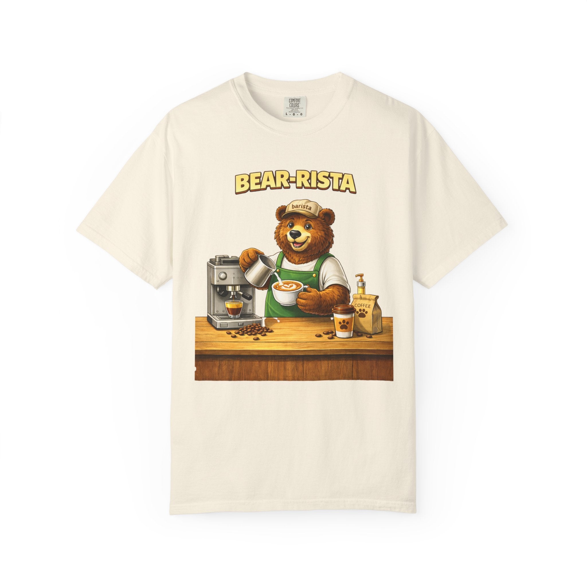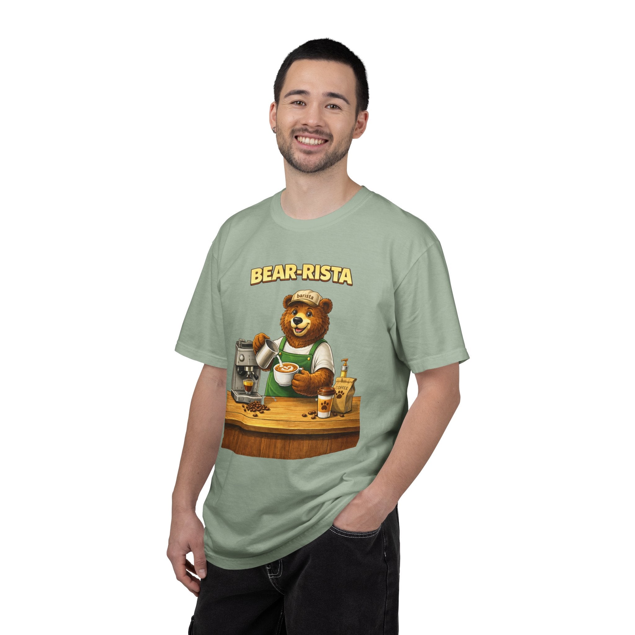 Imagine slipping into a soft, slightly lived-in tee that feels like your favorite café sweater. This Bear-Rista Coffee T-Shirt features a warm, whimsical barista bear graphic that brings a quiet smile to mornings and slow afternoons alike. The garment-dyed cotton has a muted, vintage wash and a weighty, comforting hand that holds its shape while draping easily. It sits relaxed across the shoulders and breathes well during a busy shift or a cozy coffee date. Whether you’re steaming milk, scribbling orders on a notepad, or settling into a corner table with a to-go cup, the tee carries a gentle, approachable vibe — playful but grounded. The design speaks to people who love small coffee rituals, neighborhood cafés, and cozy workwear with character. It layers effortlessly under an apron, flannel, or an open jacket for market mornings, slow Sundays, or casual meetups at the roastery.