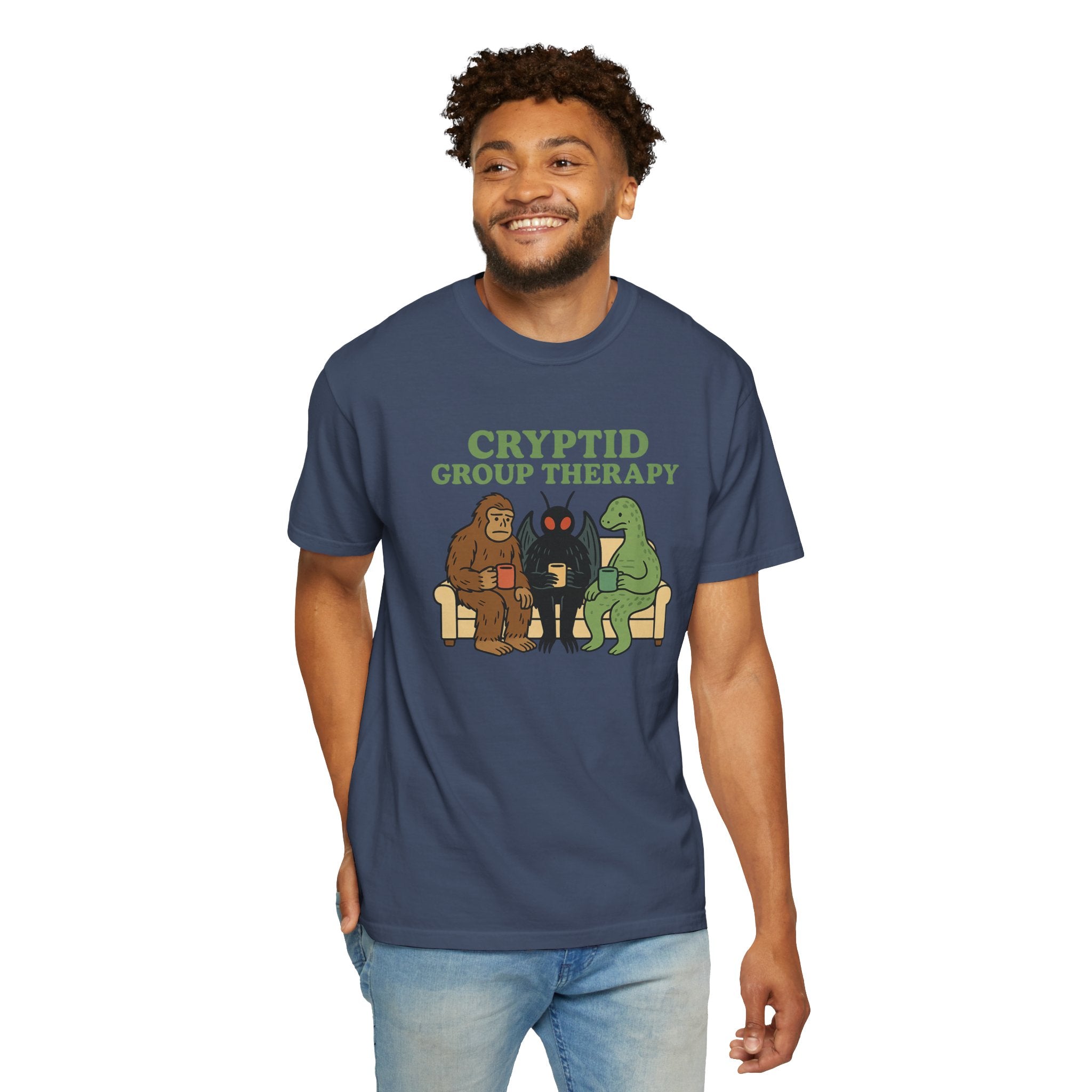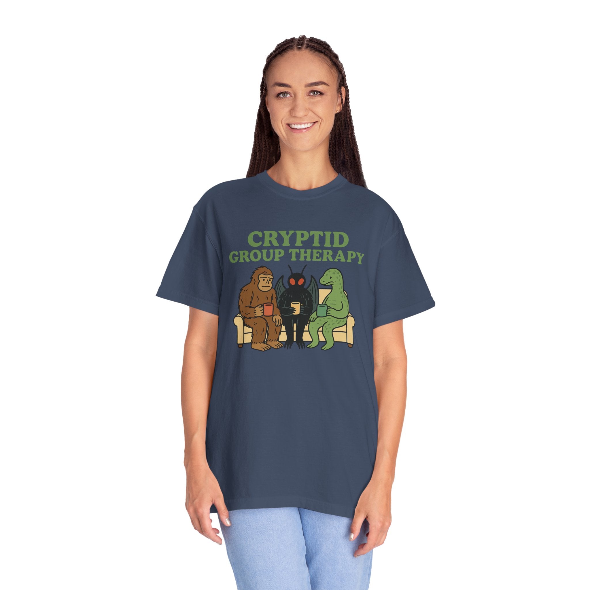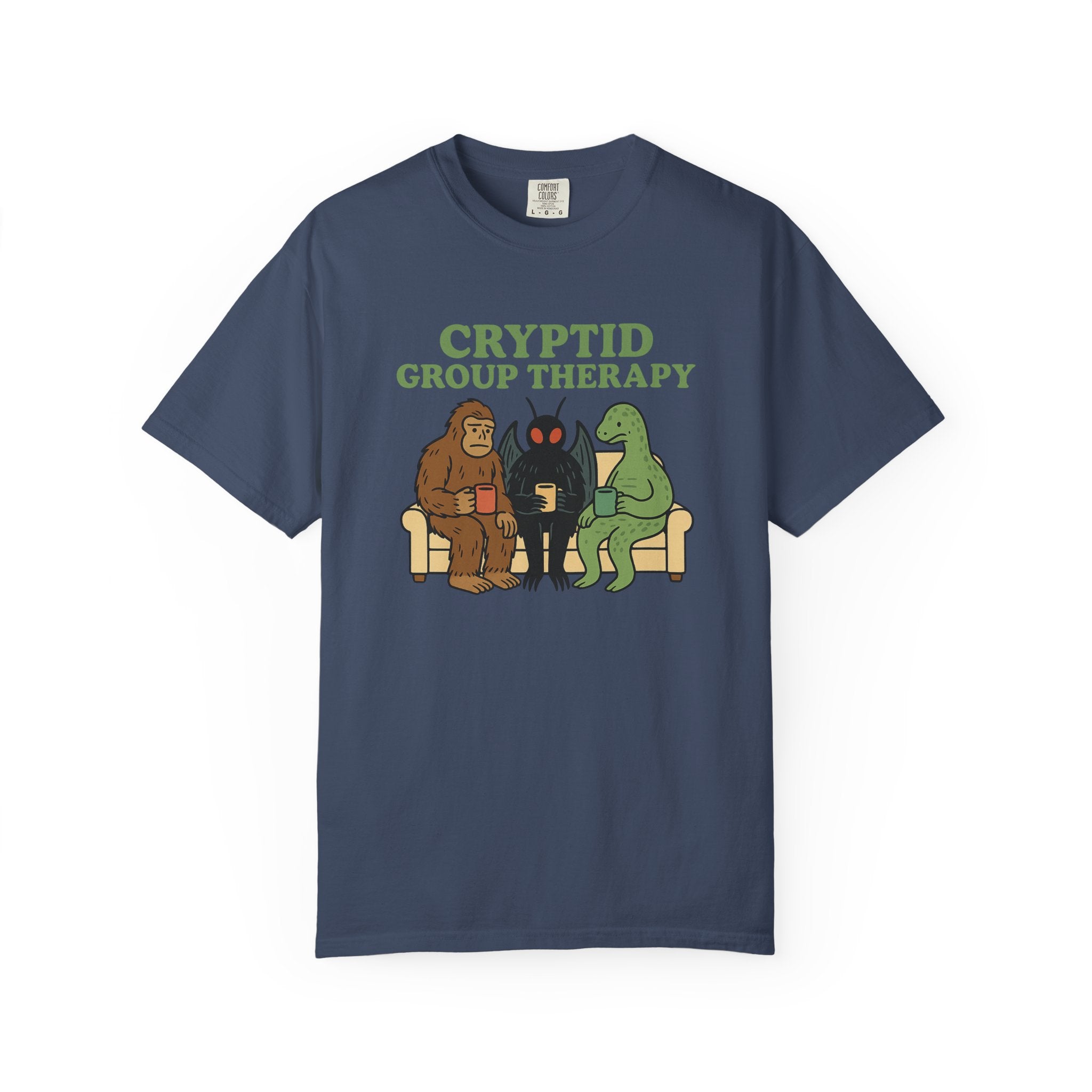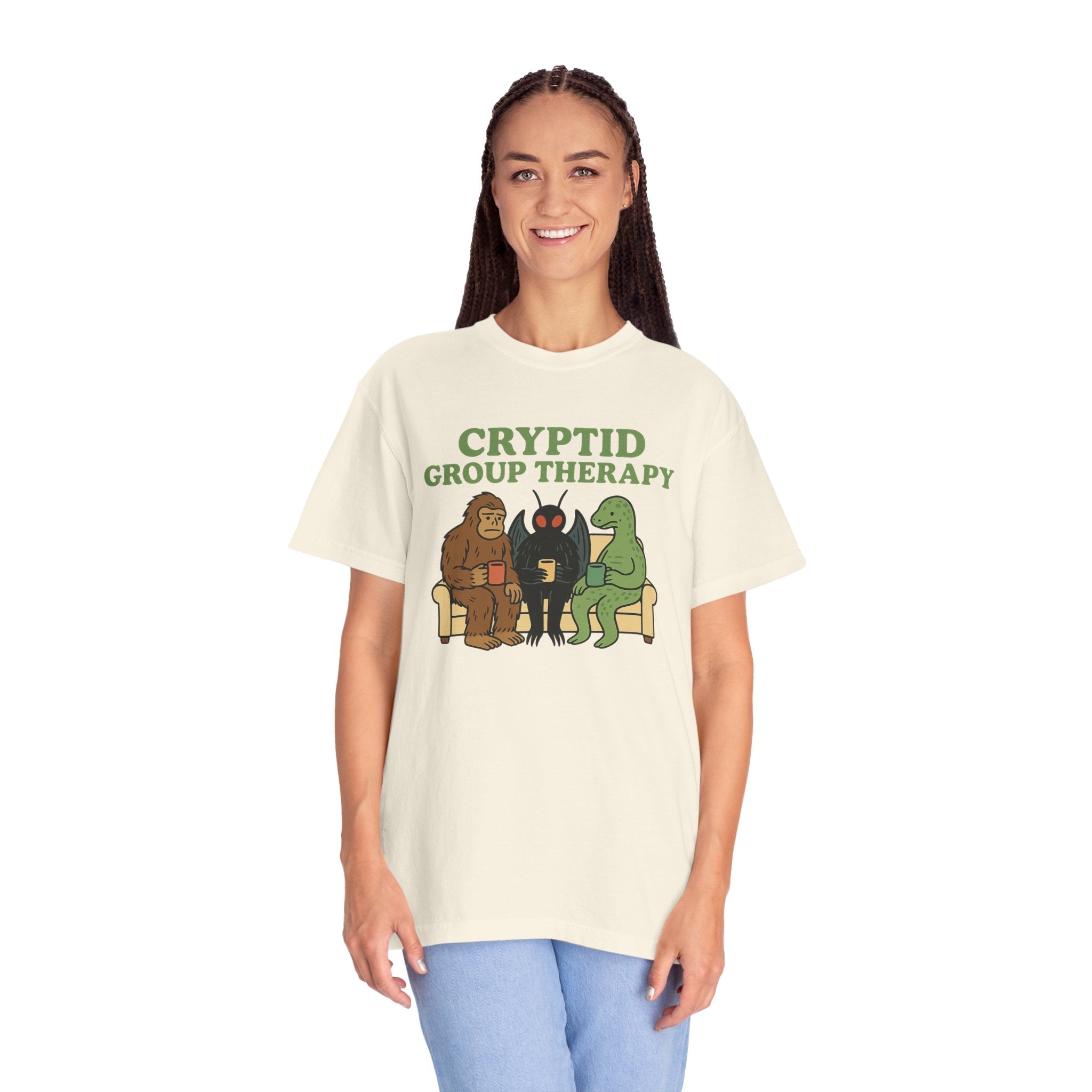 Cryptid Group Therapy Bigfoot, Mothman and Loch Nessie Unisex T-Shirt, perfect for cryptid lovers. This funny graphic tee offers quirky casual wear with cool humor, suitable for both casual and semi-formmal settings. Ideal as a gift for those who love cryptids like Bigfoot, Mothman, and Loch Nessie.