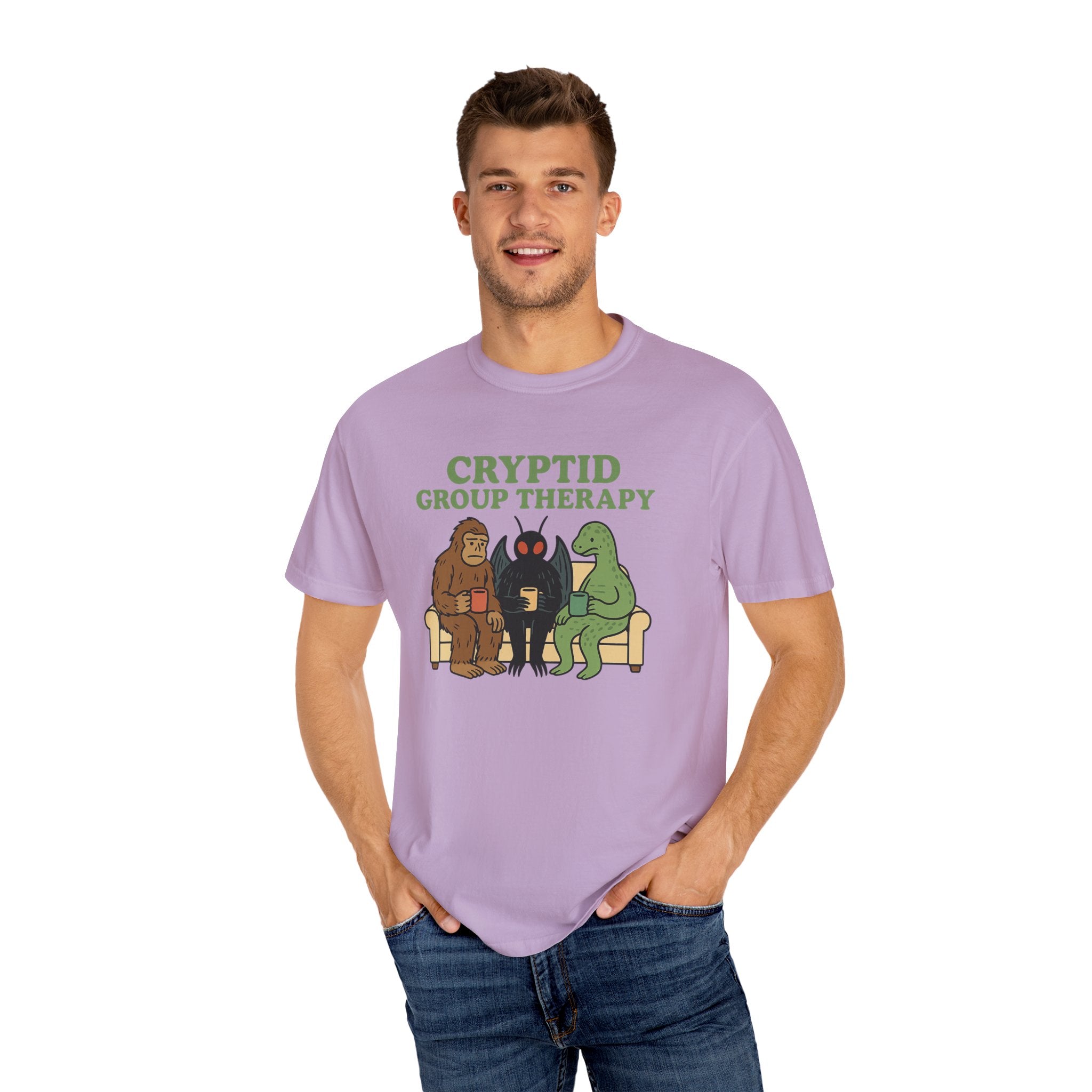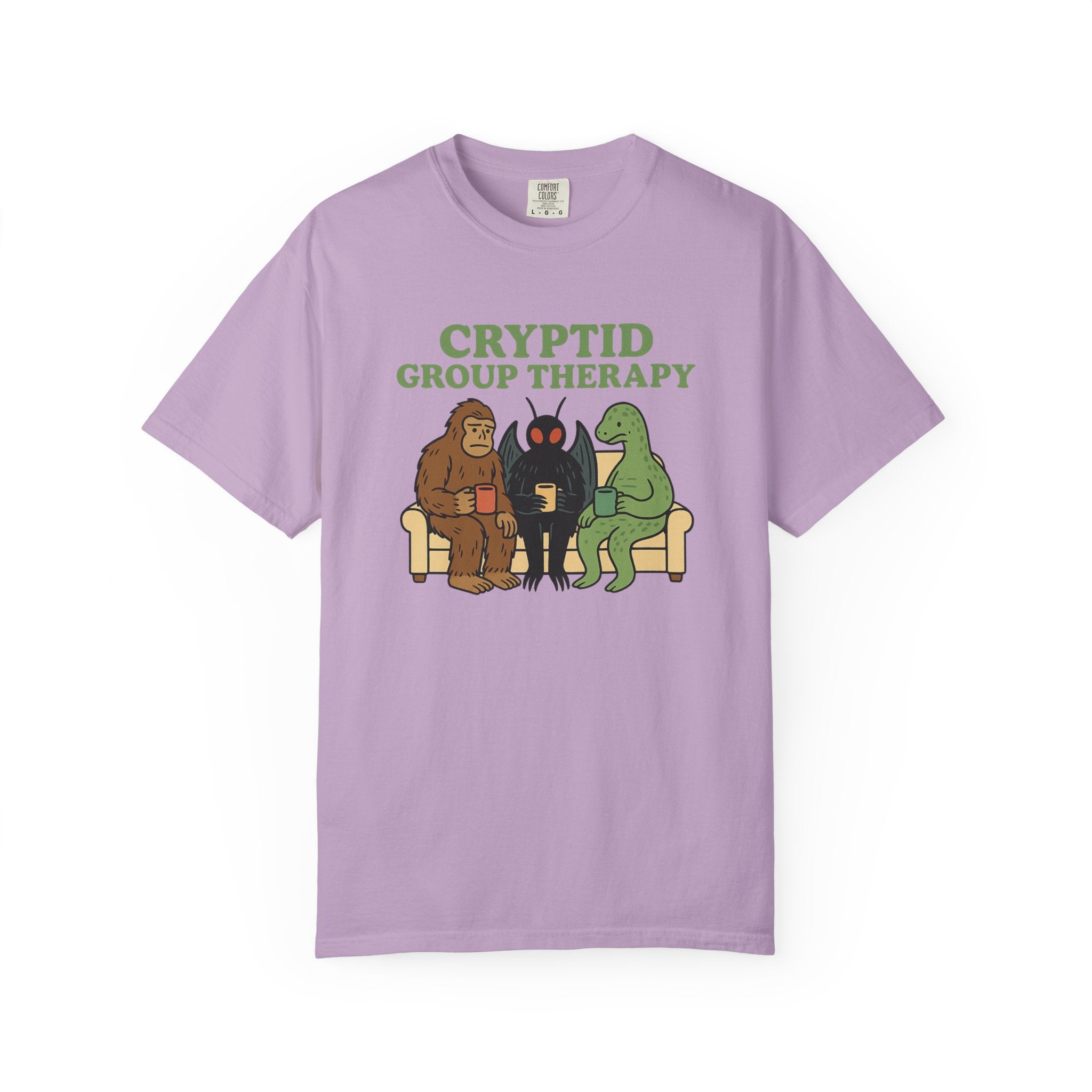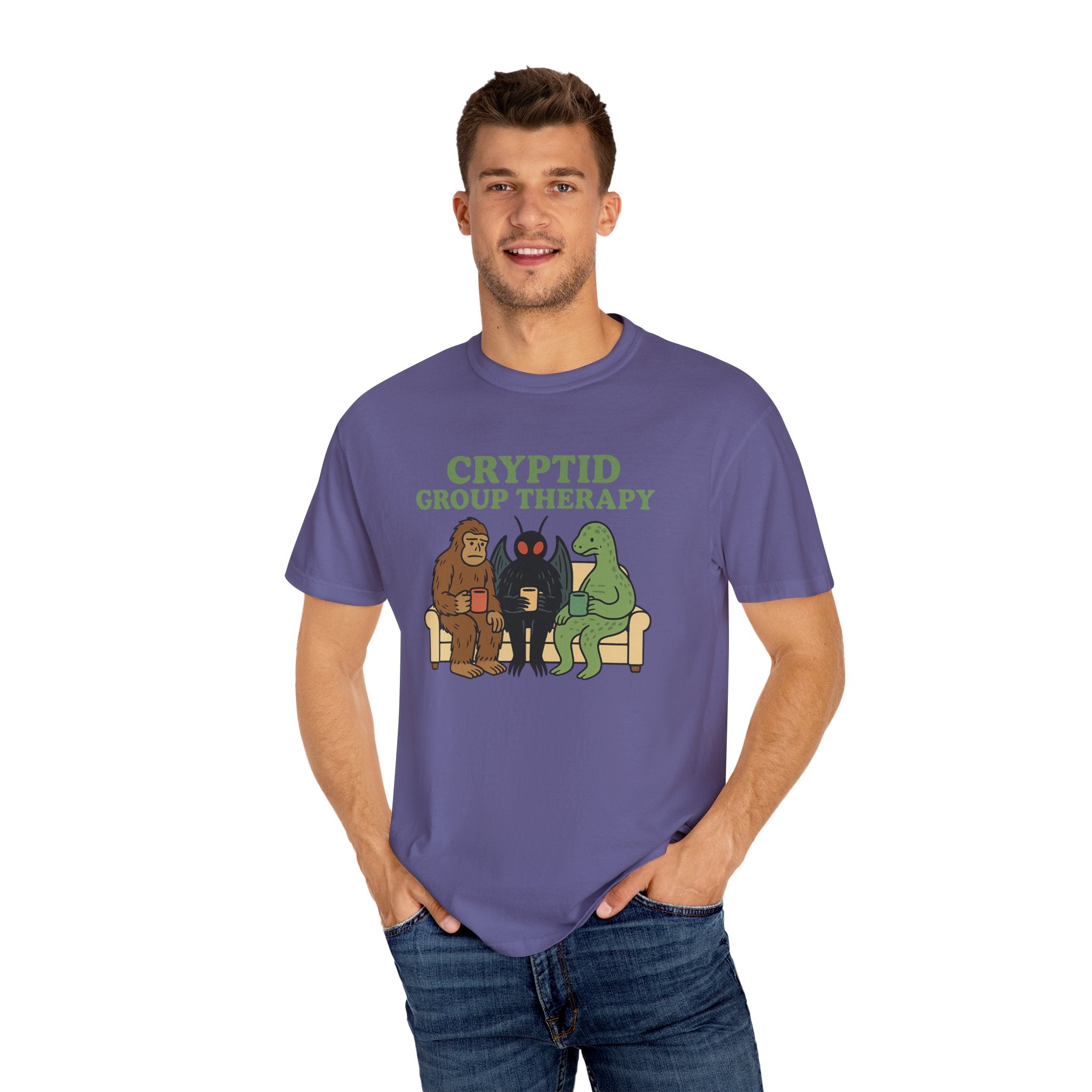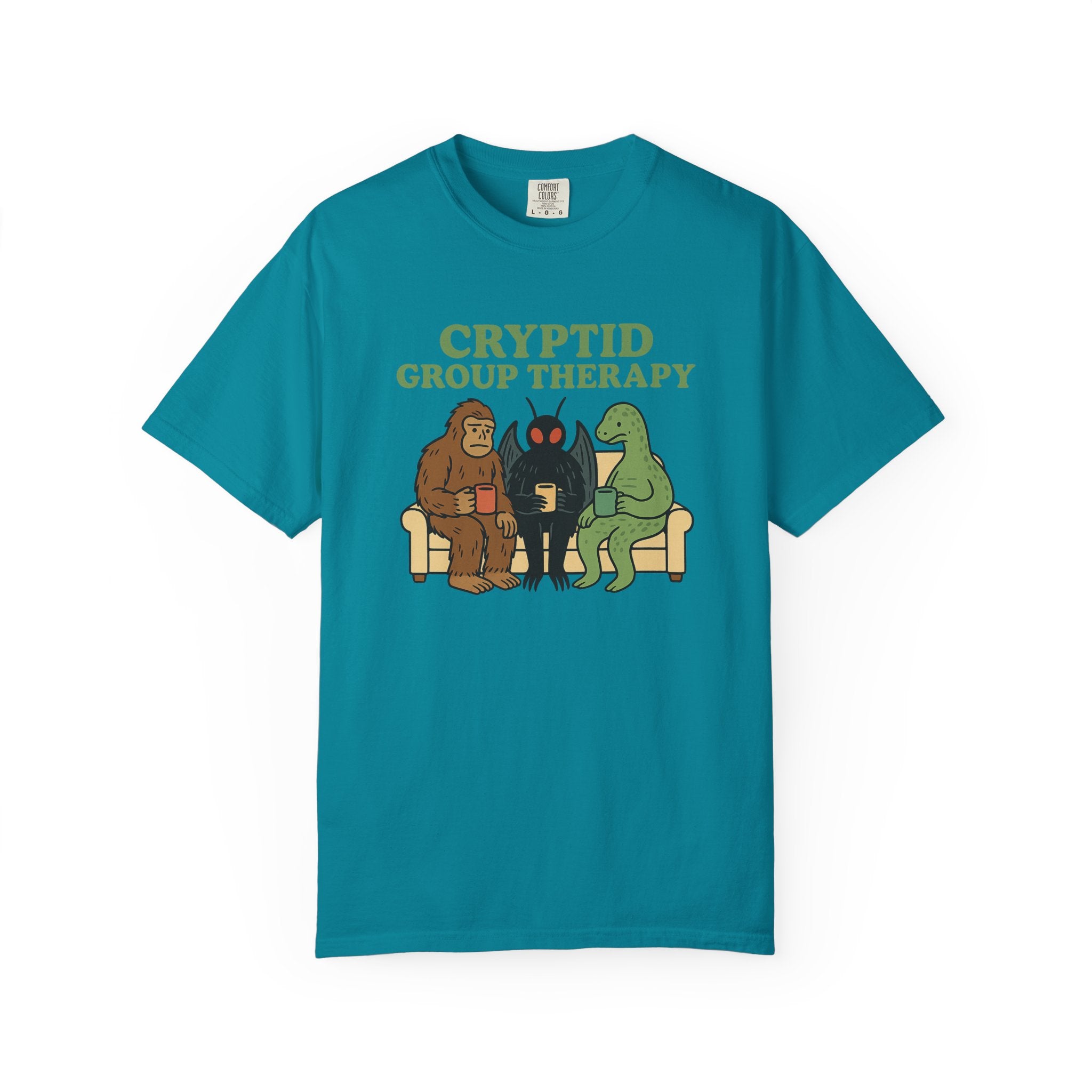 Cryptid Group Therapy Bigfoot, Mothman and Loch Nessie Unisex T-Shirt, perfect for cryptid lovers. This funny graphic tee offers quirky casual wear with cool humor, suitable for both casual and semi-formmal settings. Ideal as a gift for those who love cryptids like Bigfoot, Mothman, and Loch Nessie.
