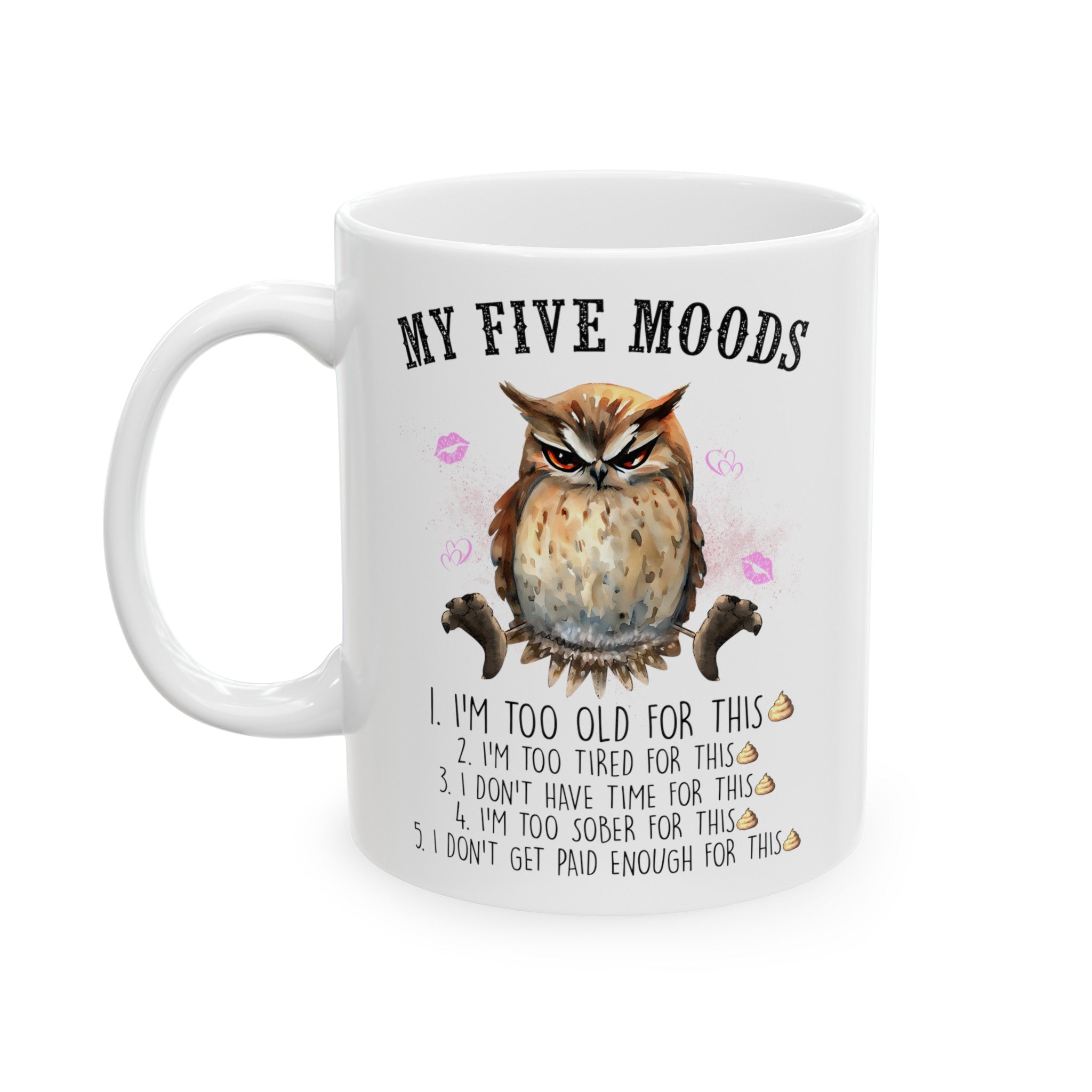 MY FIVE MOODS Owl Mug, funny owl mug, white ceramic mug, 11oz, 15oz, animal lover mug, owl lover mug, gift for her, funny sober owl quote