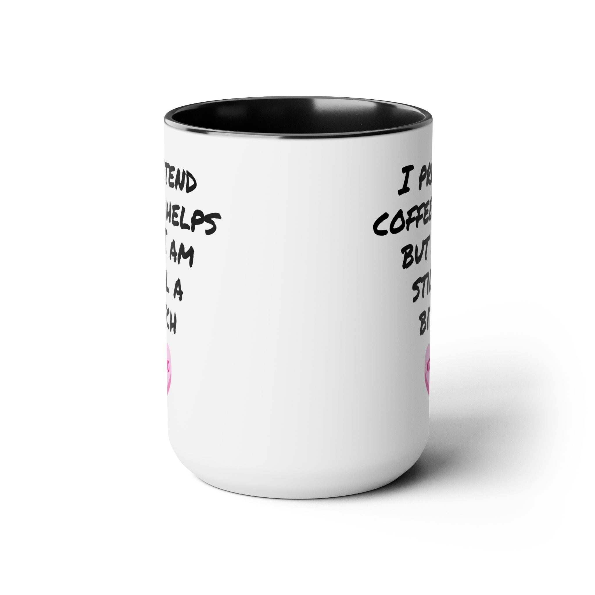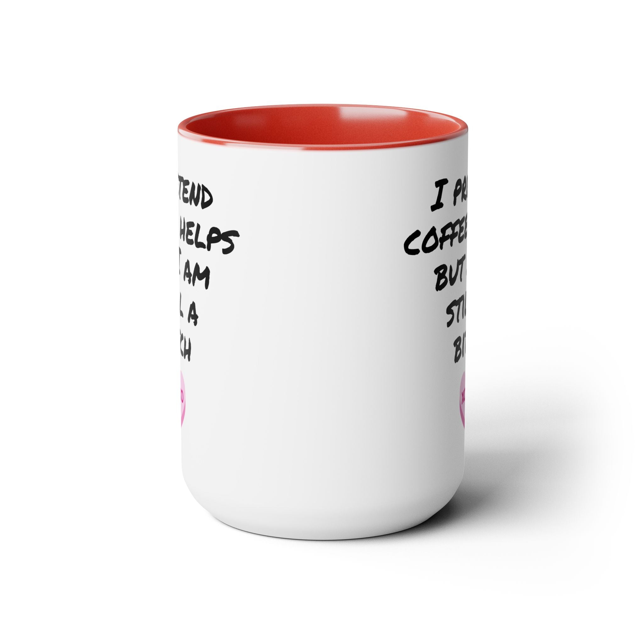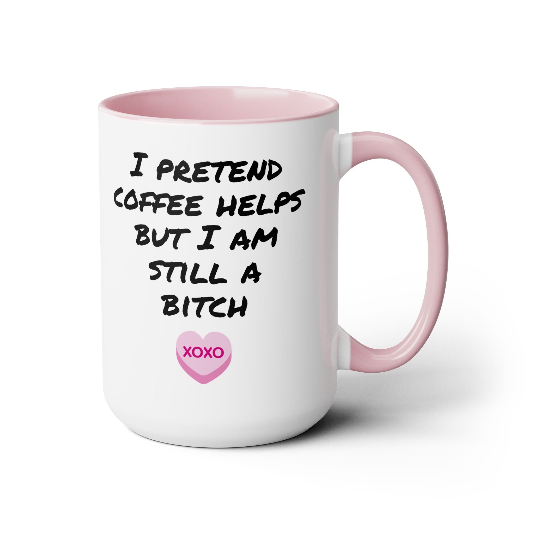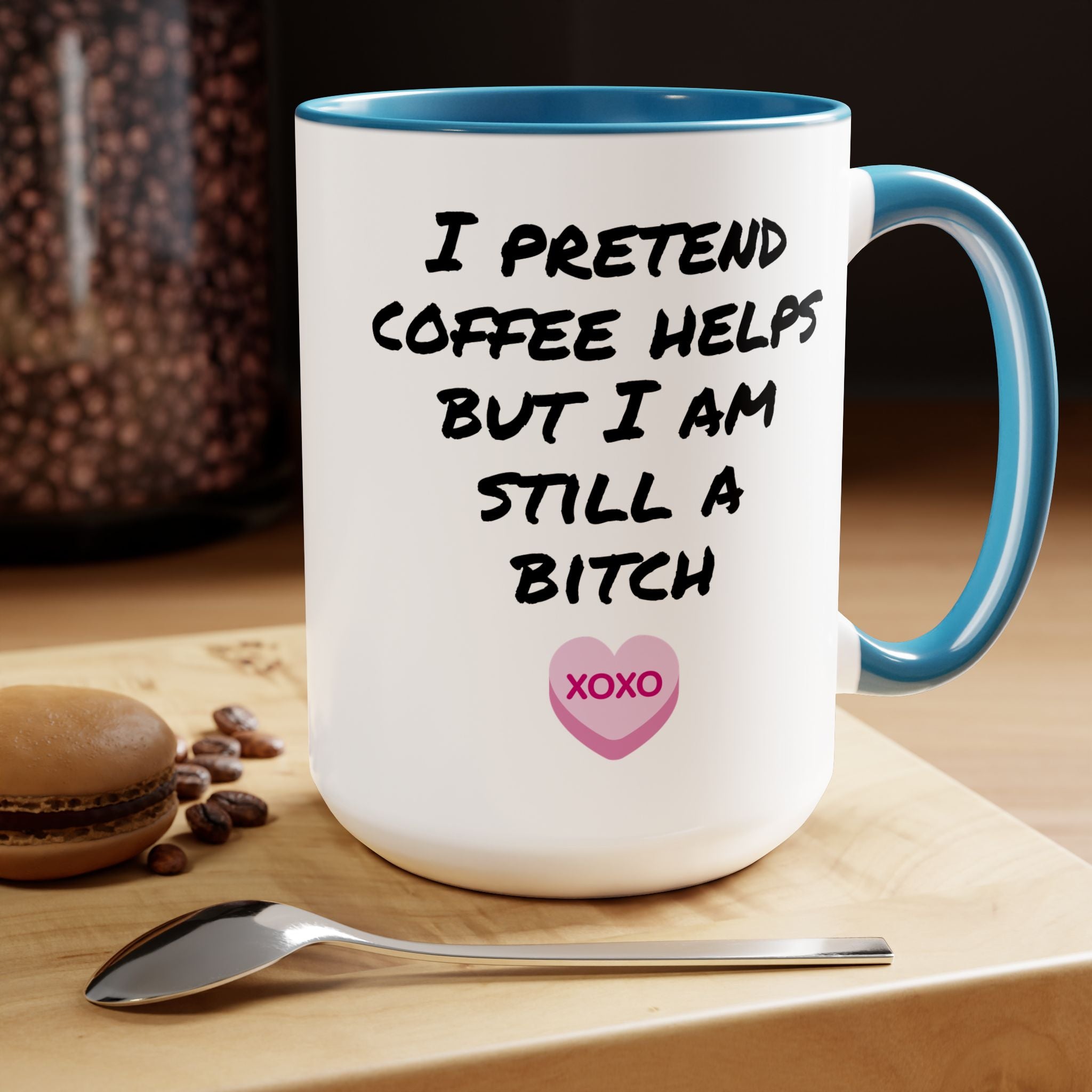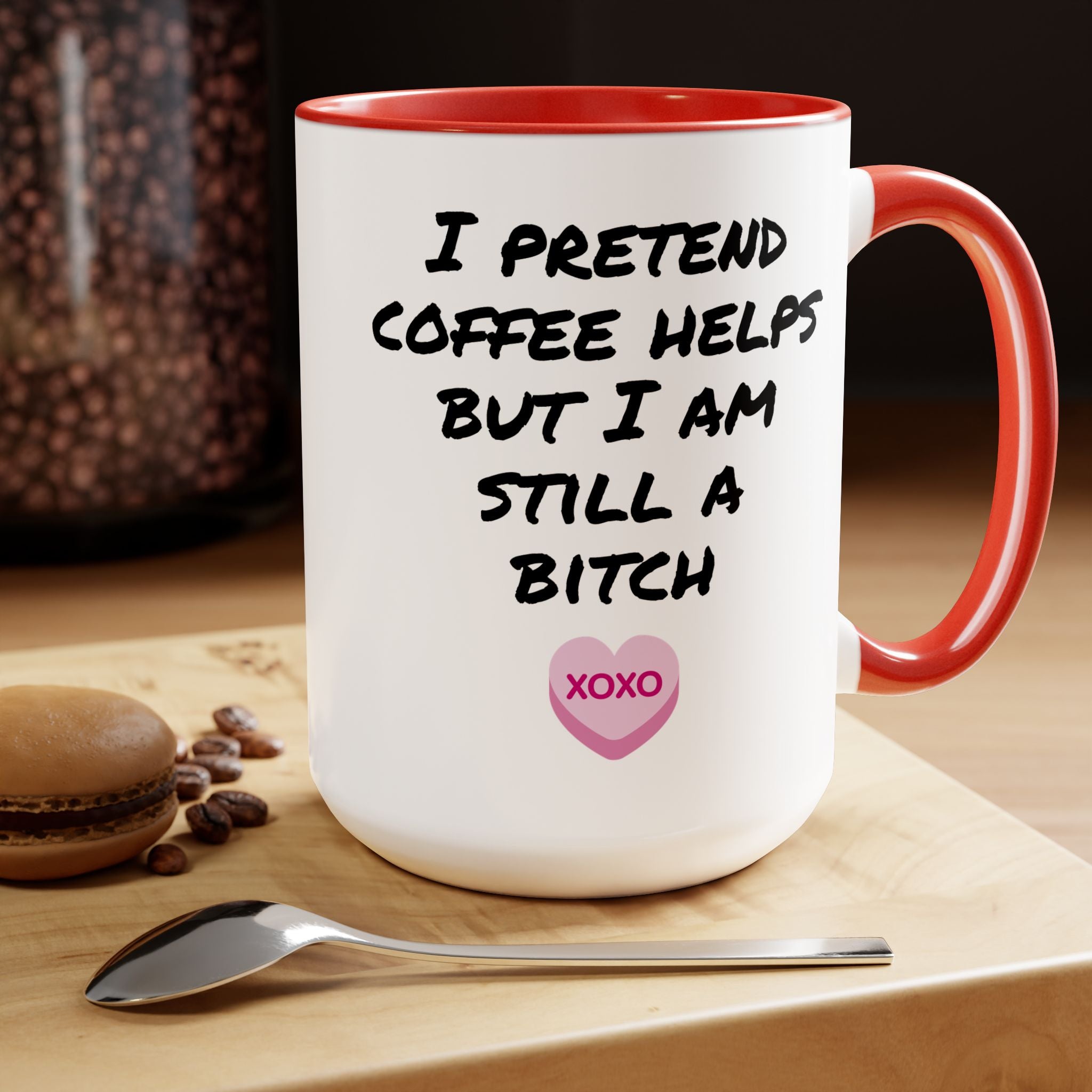 Here to bring big gulps of coffee and style, these two-tone coffee mugs help people around the world start the day just right. Choose between 5 different color options to best complement your taste. Each mug comes with a colored handle, a colored interior, and a classy, glossy finish so that your mugs become an instant favorite. .: Material: 100% ceramic .: One size: 15oz (0.44 l) .: Lead and BPA-free .: Glossy finish .: Interior and handle available in 5 colors Item: I Pretend Coffee Helps But I Am Still A Bitch with a heart graphic - 15 oz Latte Mug / unique gift for her / funny quote / Primary Tags: Funny coffee mug, gift for her, unique latte mug, bitch quote mug, heart graphic mug, 15 oz coffee cup, sarcastic gift, funny quote cup, humorous gift for her, novelty coffee mug, sassy lady gift, pretend coffee helps. Bonus Tag Ideas: Unique bitch mug, quirky latte cup, fun sarcasm gift, special woman present.
