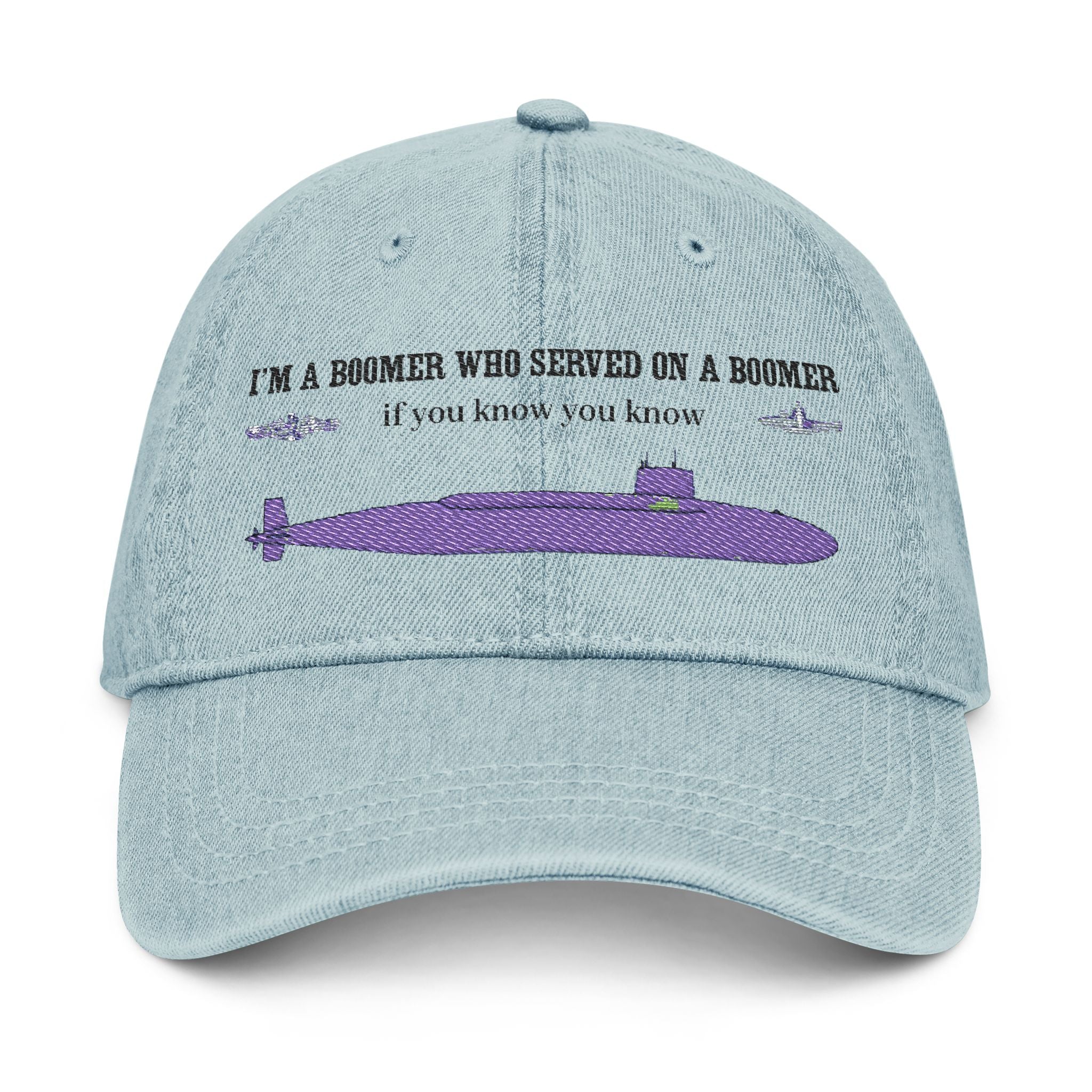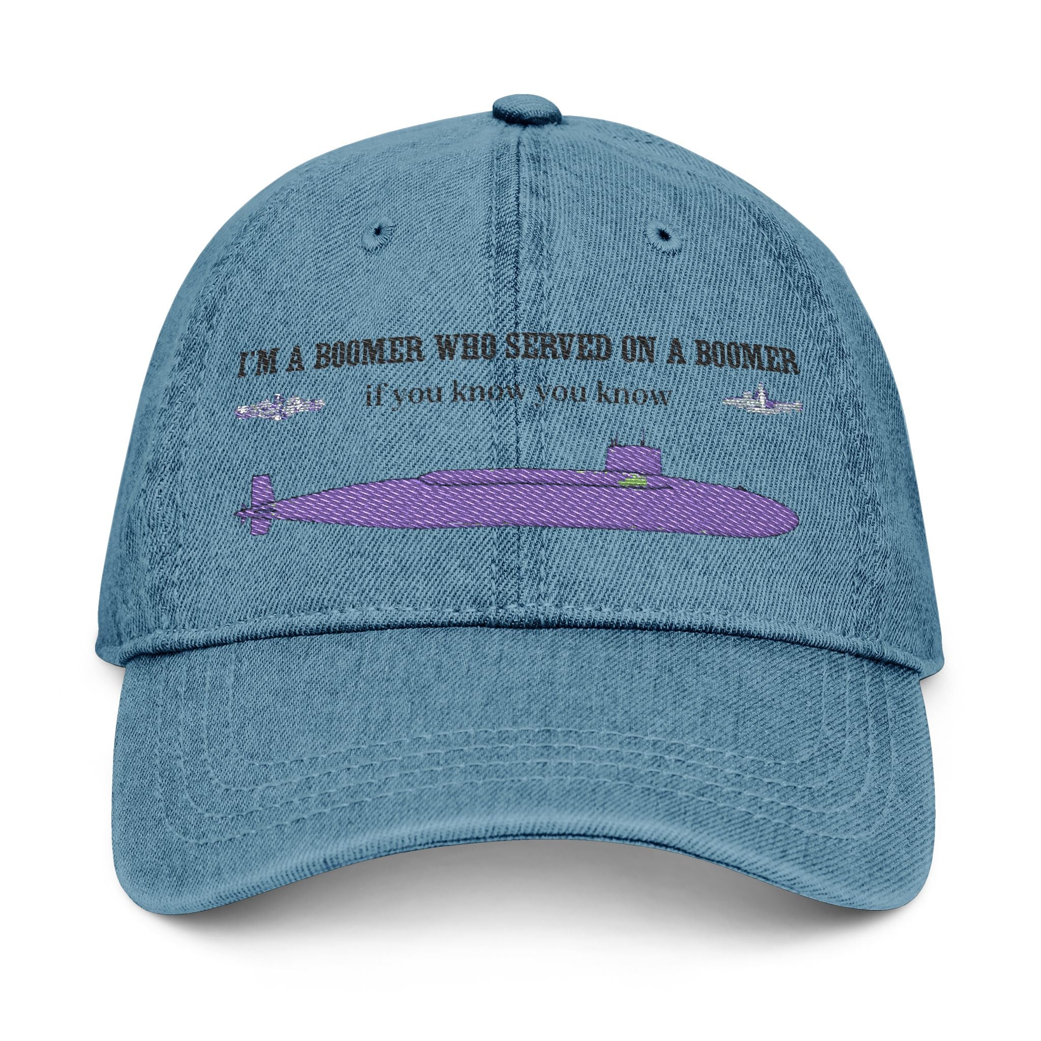 Funny embroidered denim hat perfect for submarine sailors who sailed on FBM submarines. This casual cap is a unique statement piece and a great gift for veterans. It is suitable for outdoor activities and gives off a cool, laid-back vibe. Relevant for Boomers and those interested in military history. Perfect for Father's Day, Veterans Day, and any patriotic occasions.