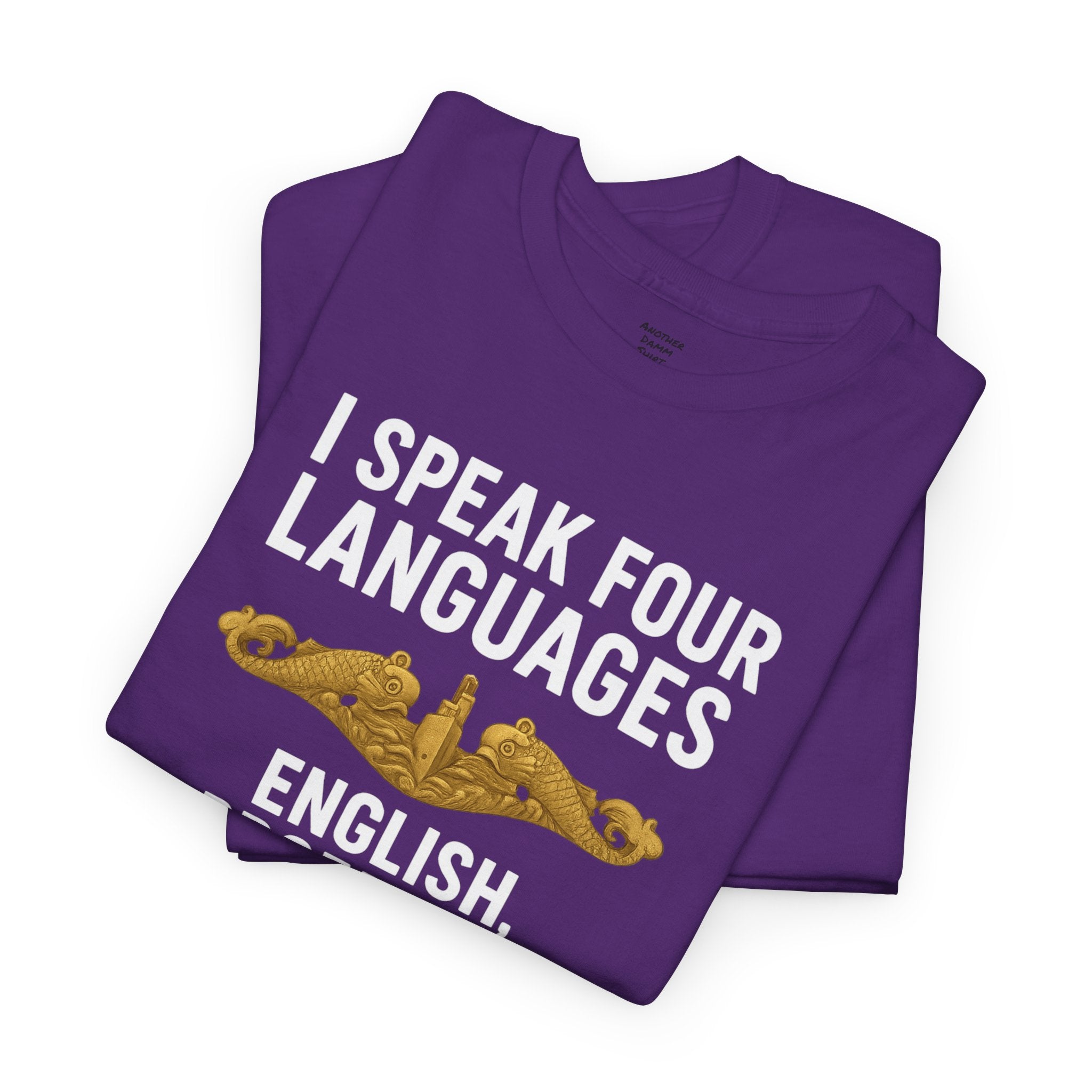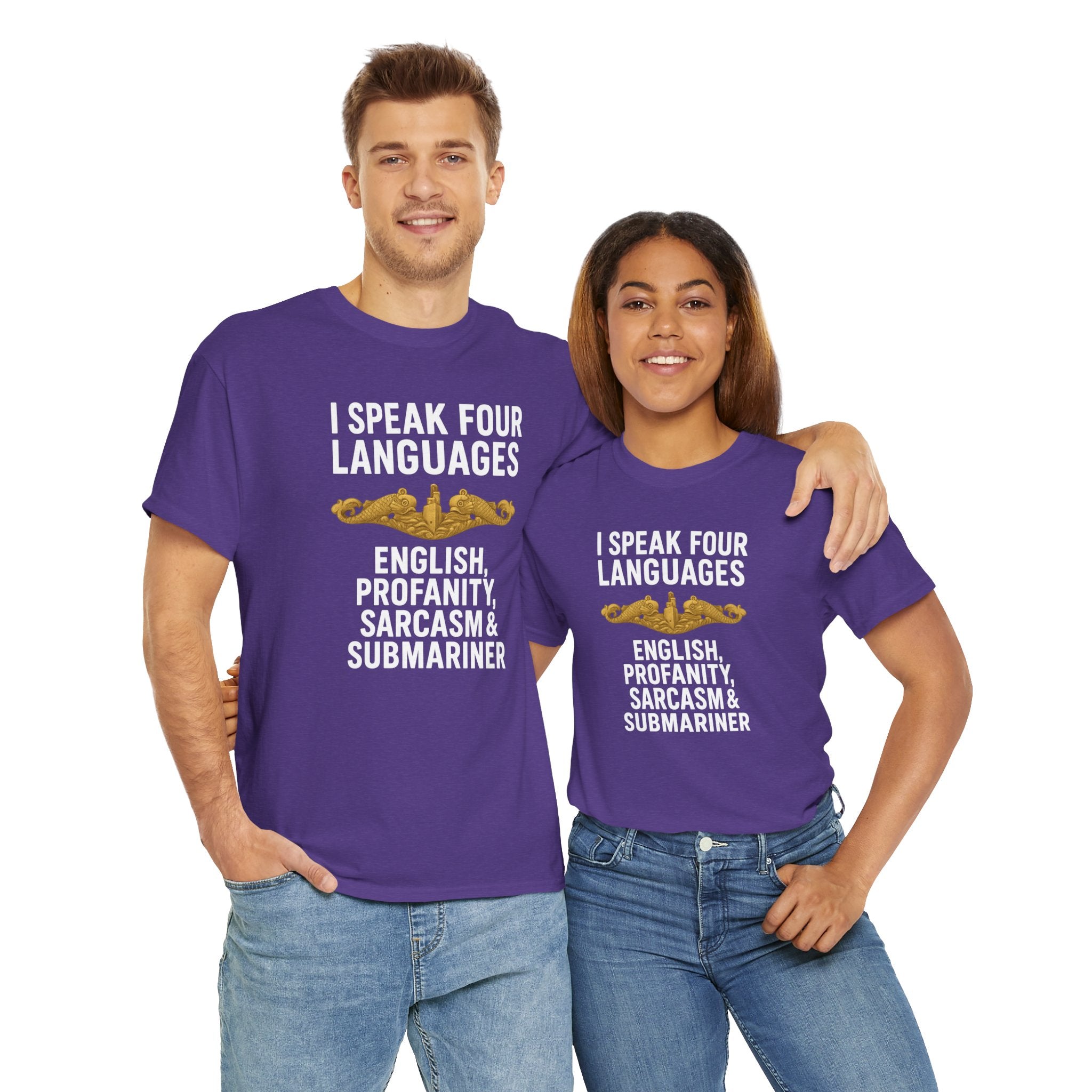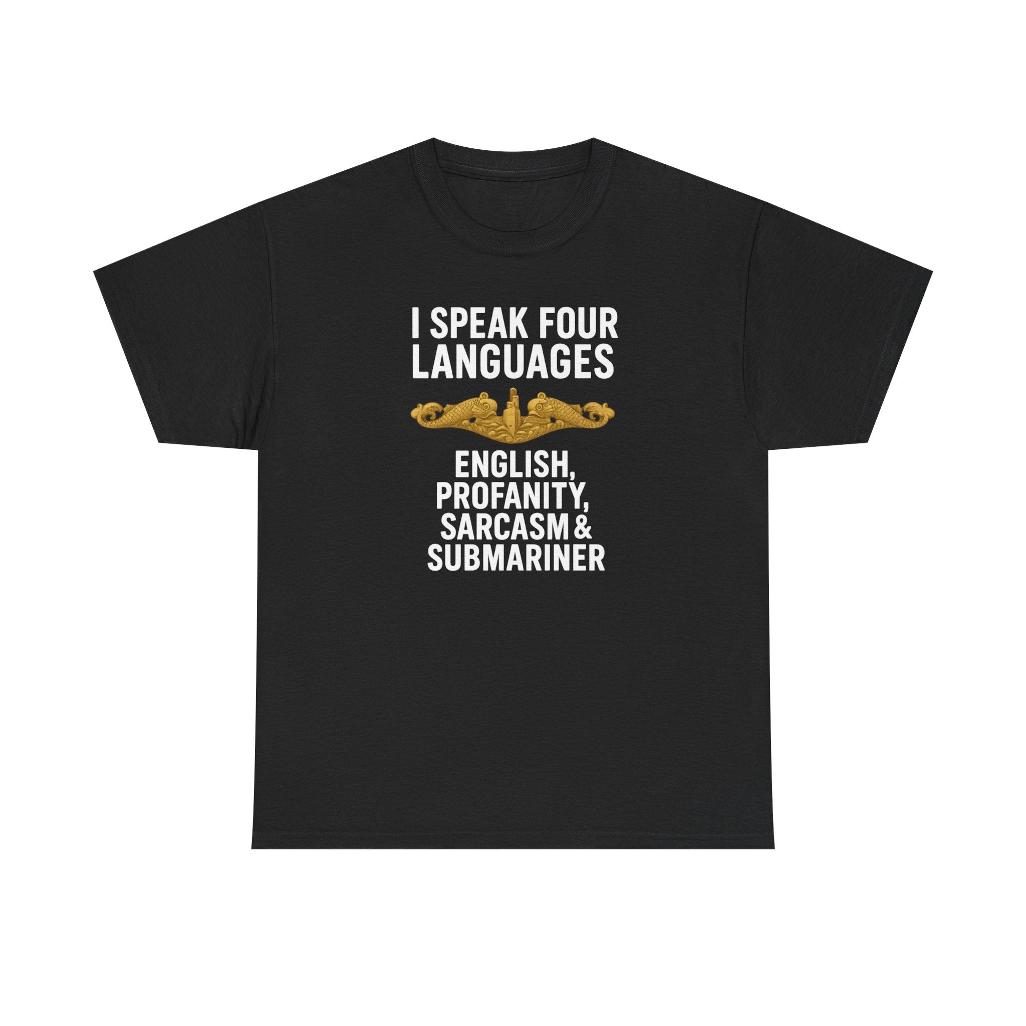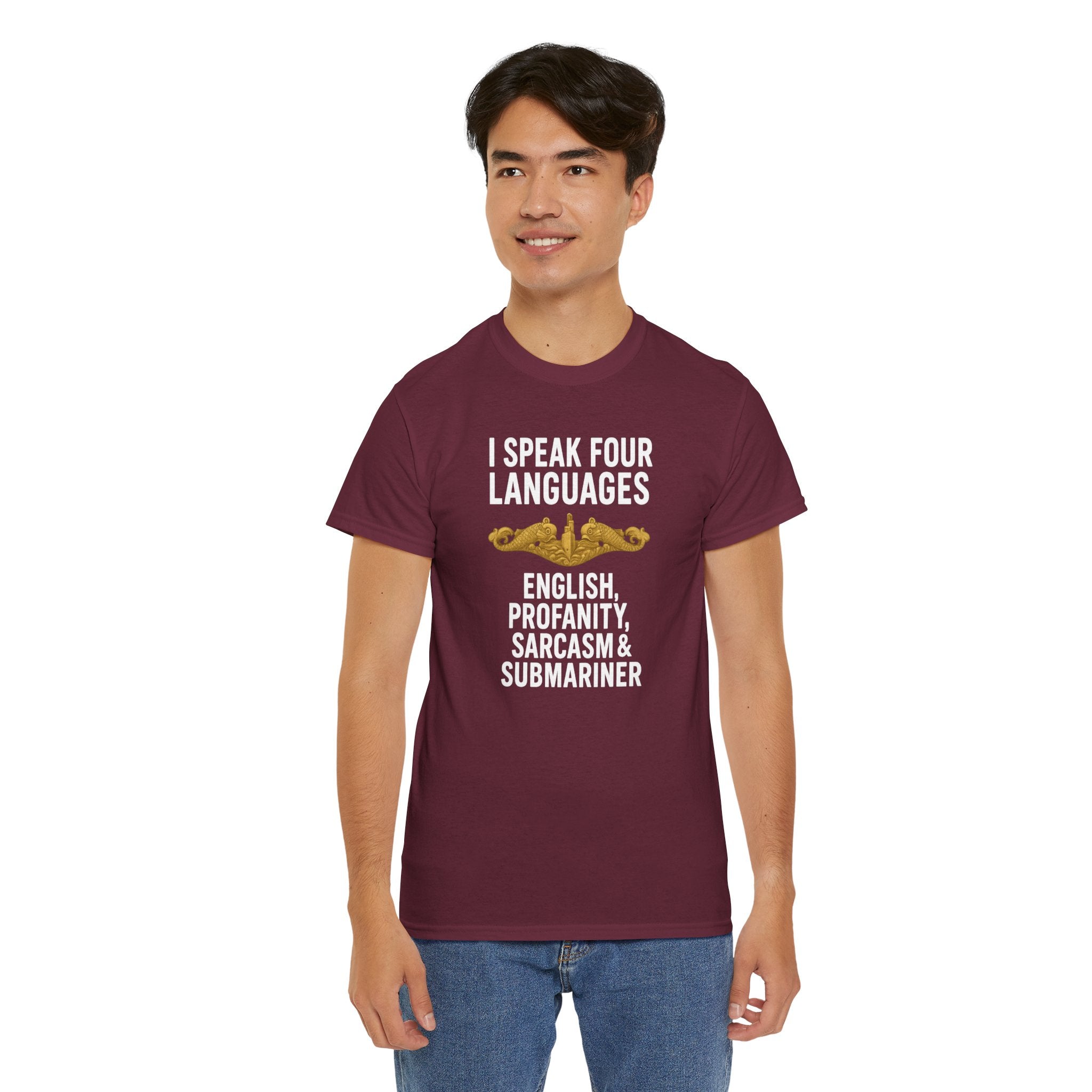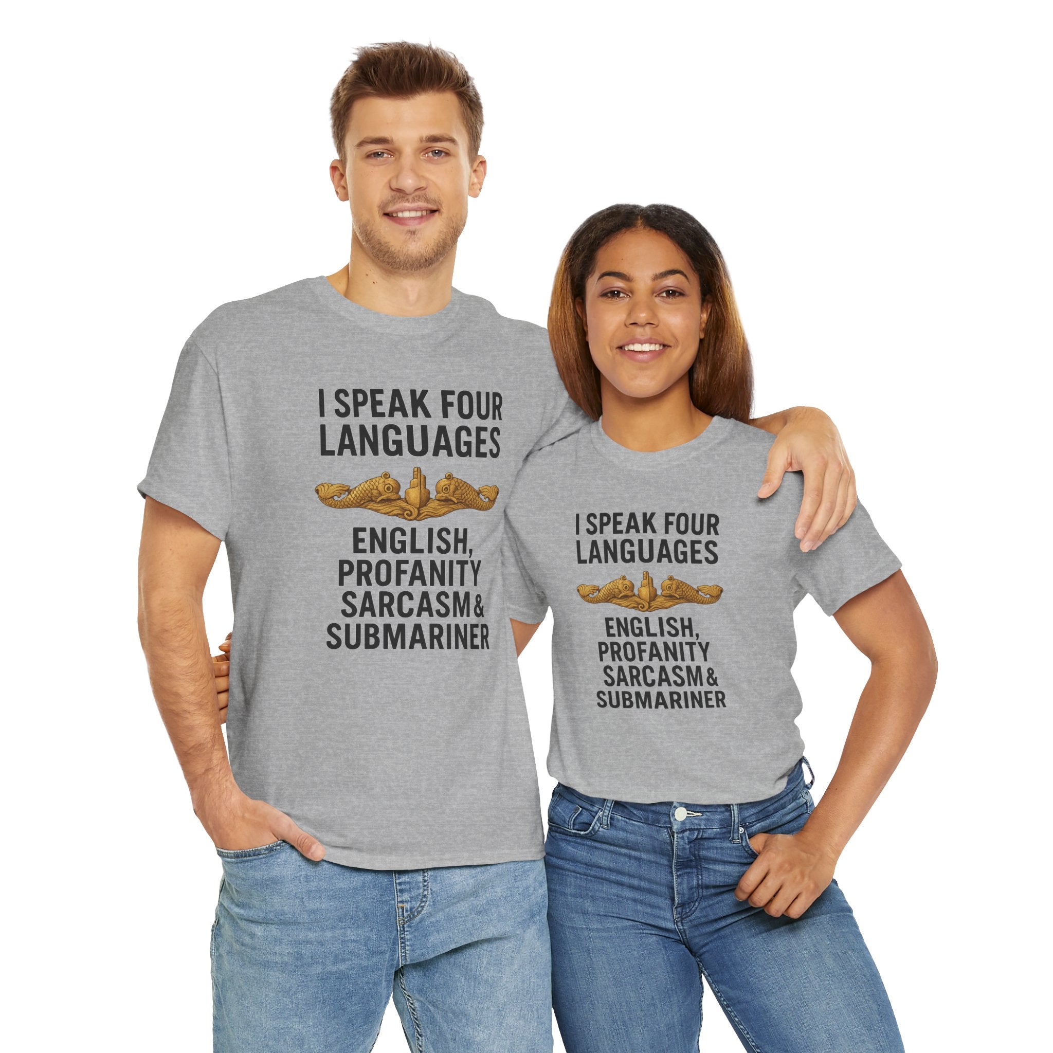 This United States Submarines Funny Multilingual T-Shirt is a perfect gift for language lovers with its humor and sarcastic design. Ideal for birthdays and casual wear, this tee is made from strong and smooth fabric, featuring shoulder tape, ribbed knit collar, and no side seams for a comfortable fit. Suitable for adults and made with medium fabric, this tee offers year-round comfort and sustainability.