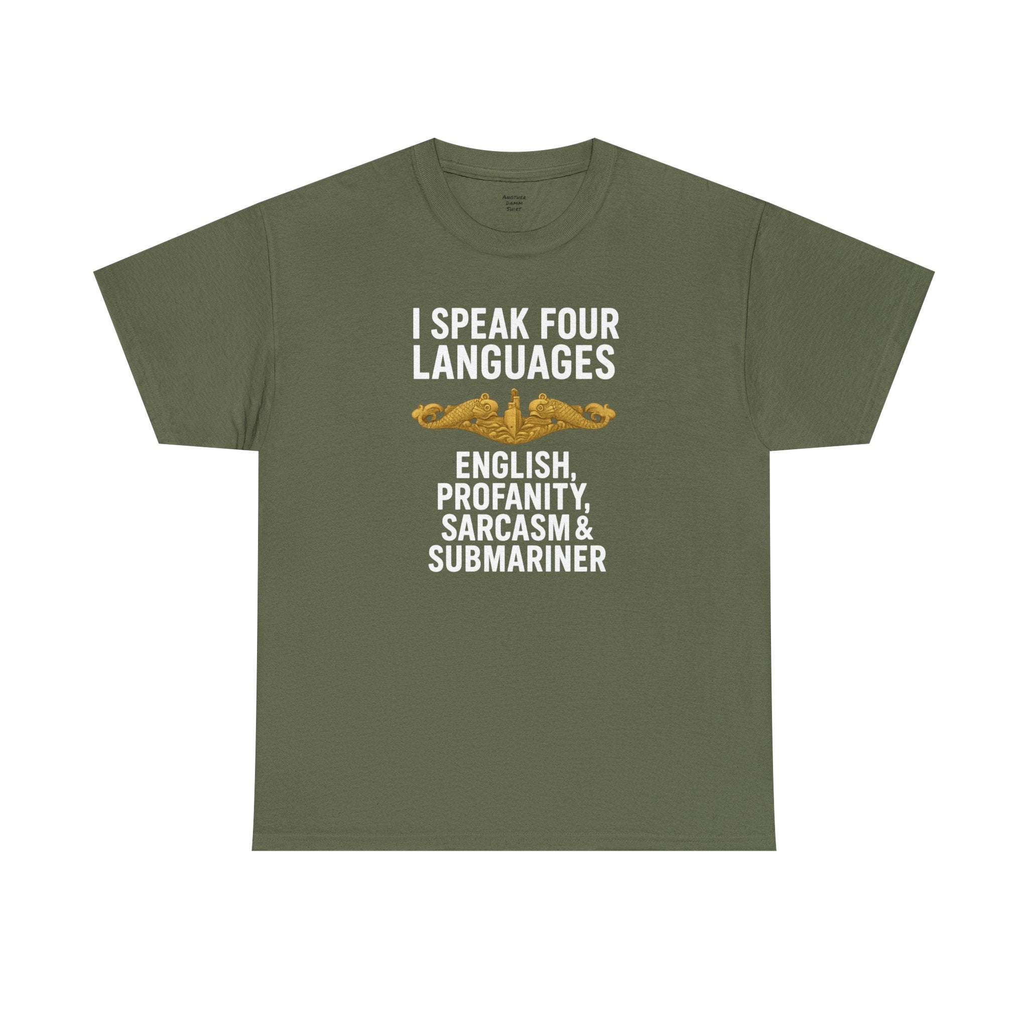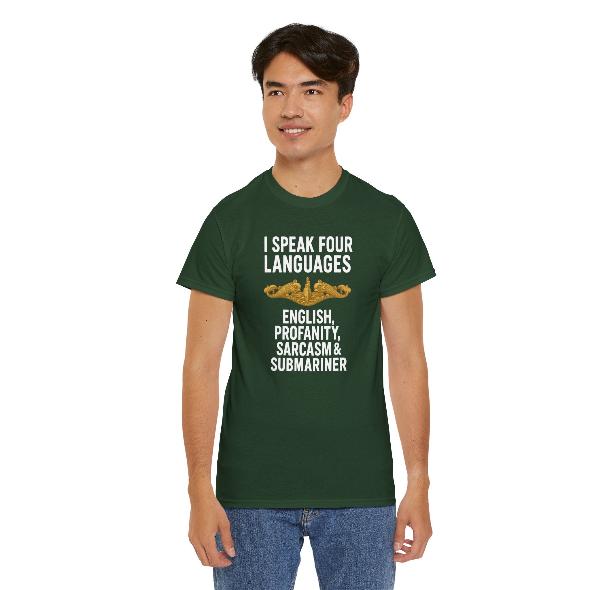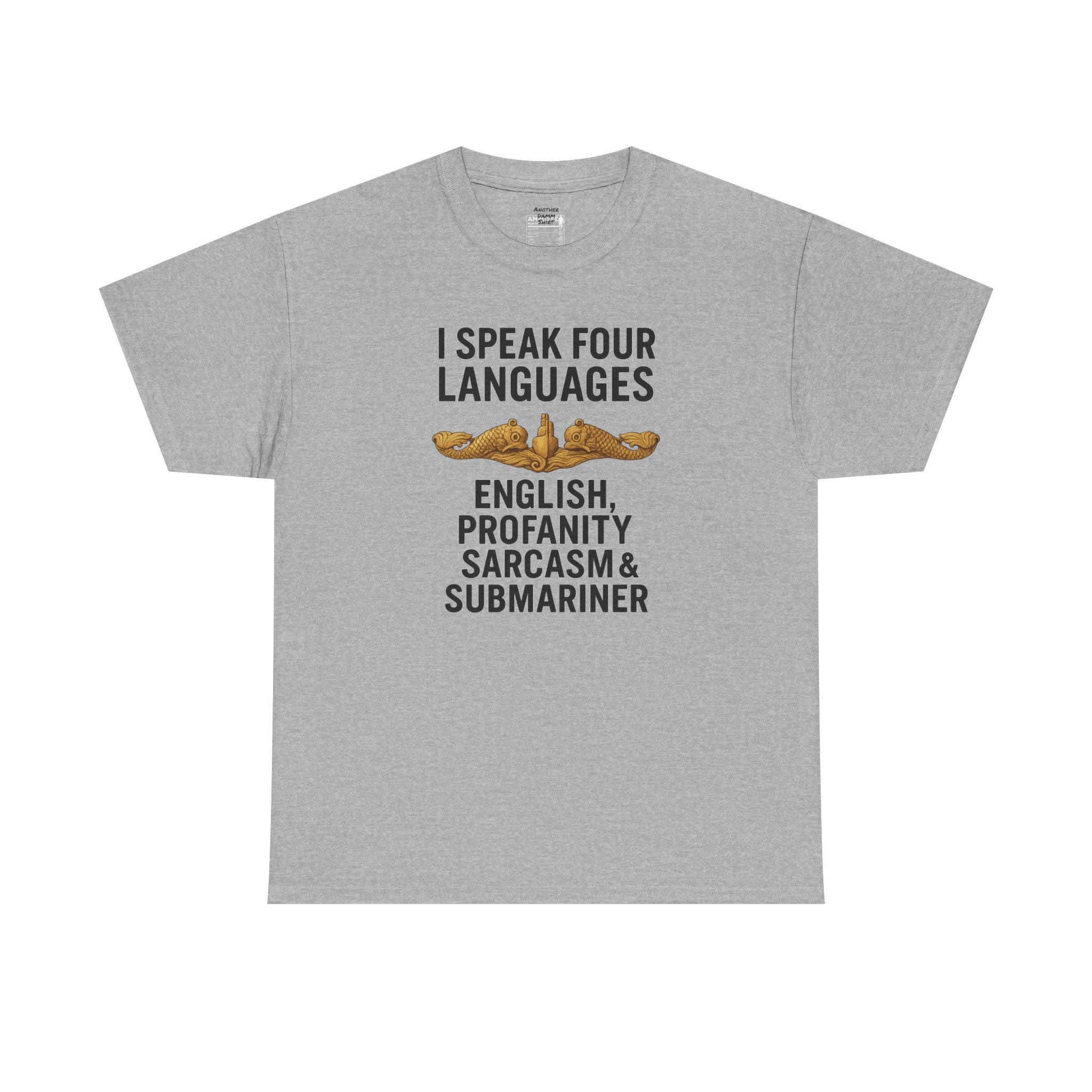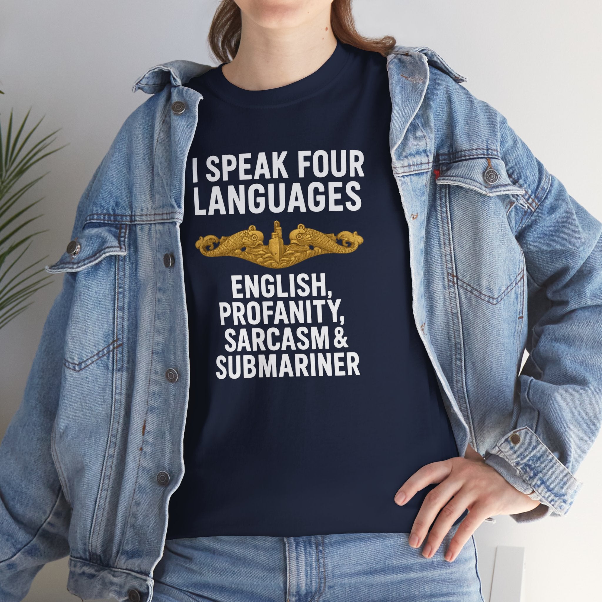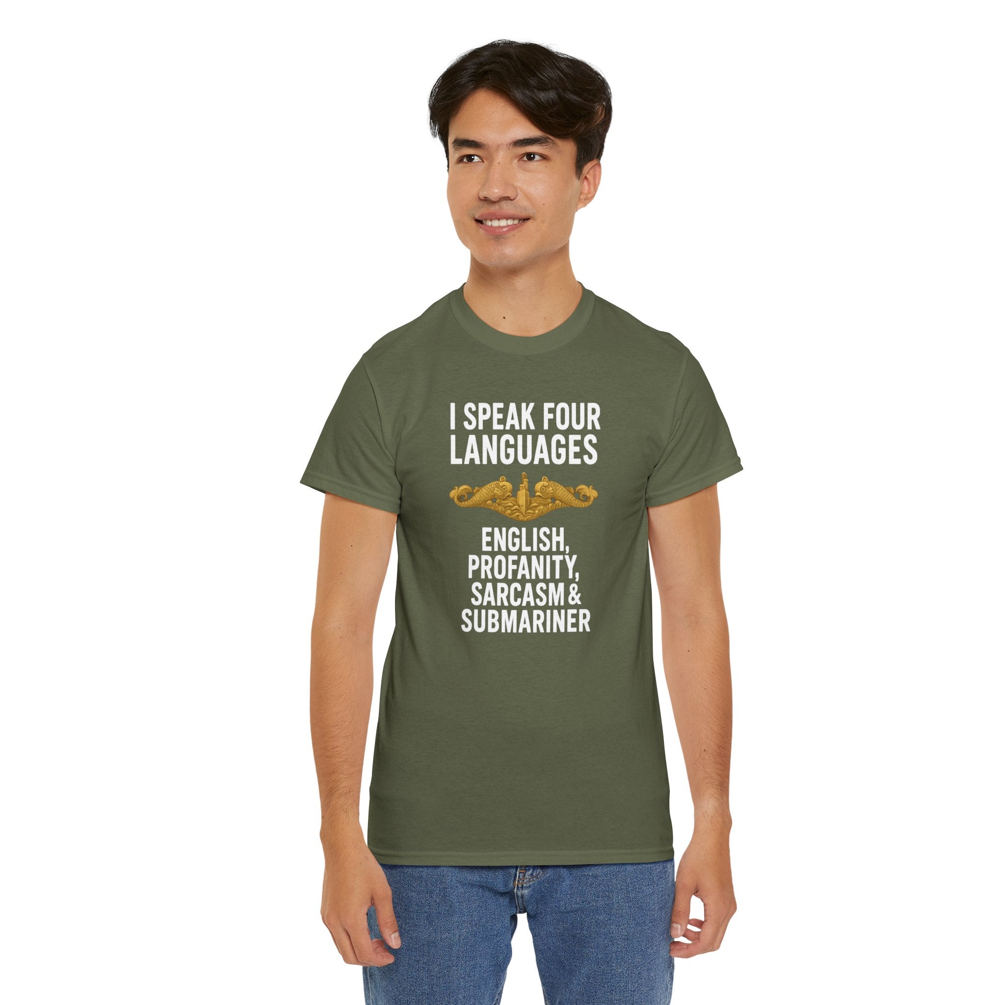 This United States Submarines Funny Multilingual T-Shirt is a perfect gift for language lovers with its humor and sarcastic design. Ideal for birthdays and casual wear, this tee is made from strong and smooth fabric, featuring shoulder tape, ribbed knit collar, and no side seams for a comfortable fit. Suitable for adults and made with medium fabric, this tee offers year-round comfort and sustainability.