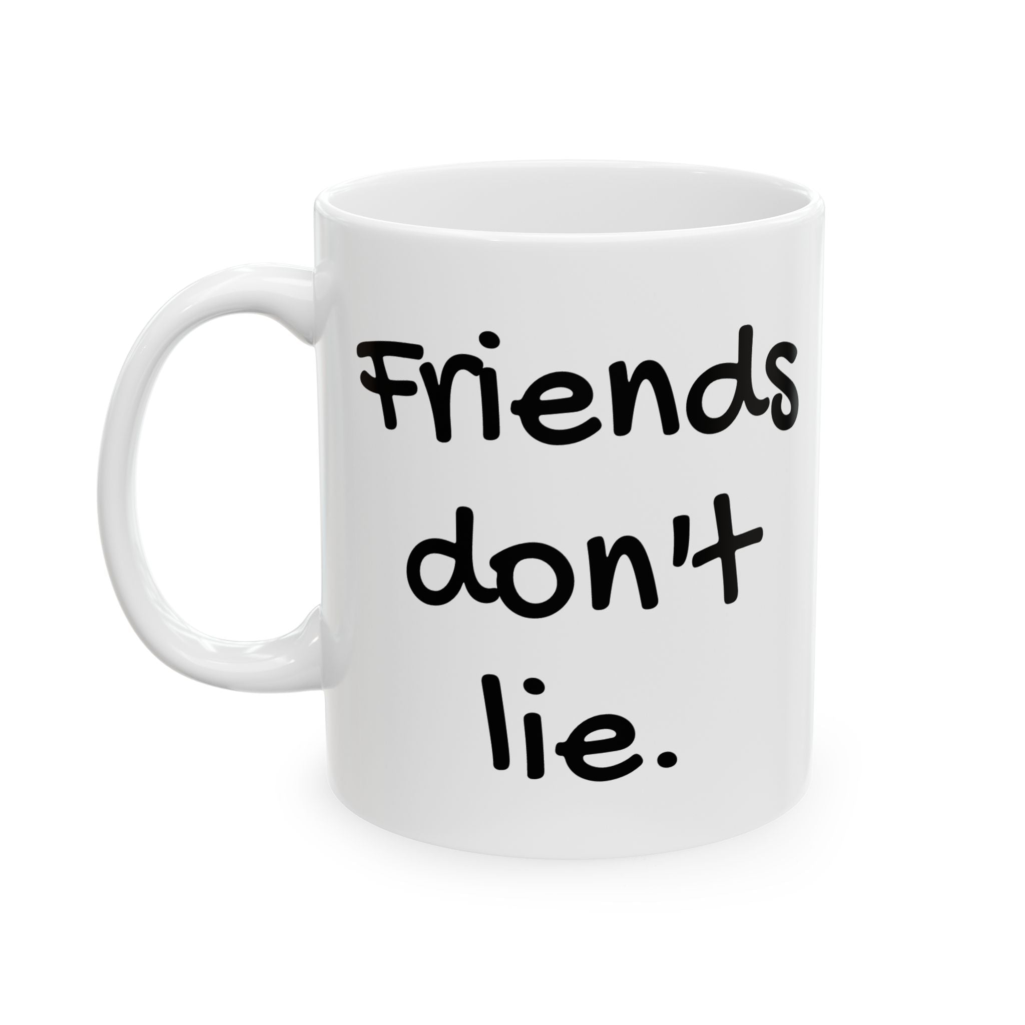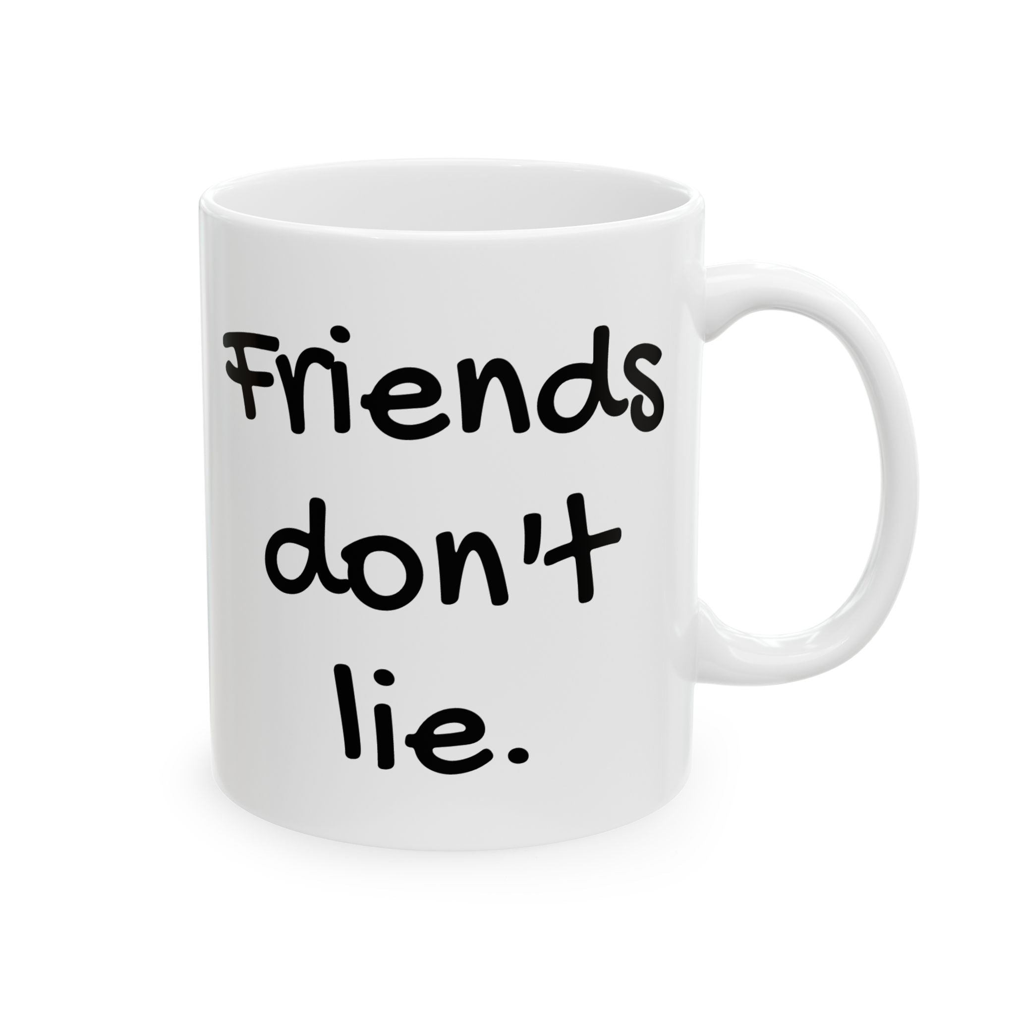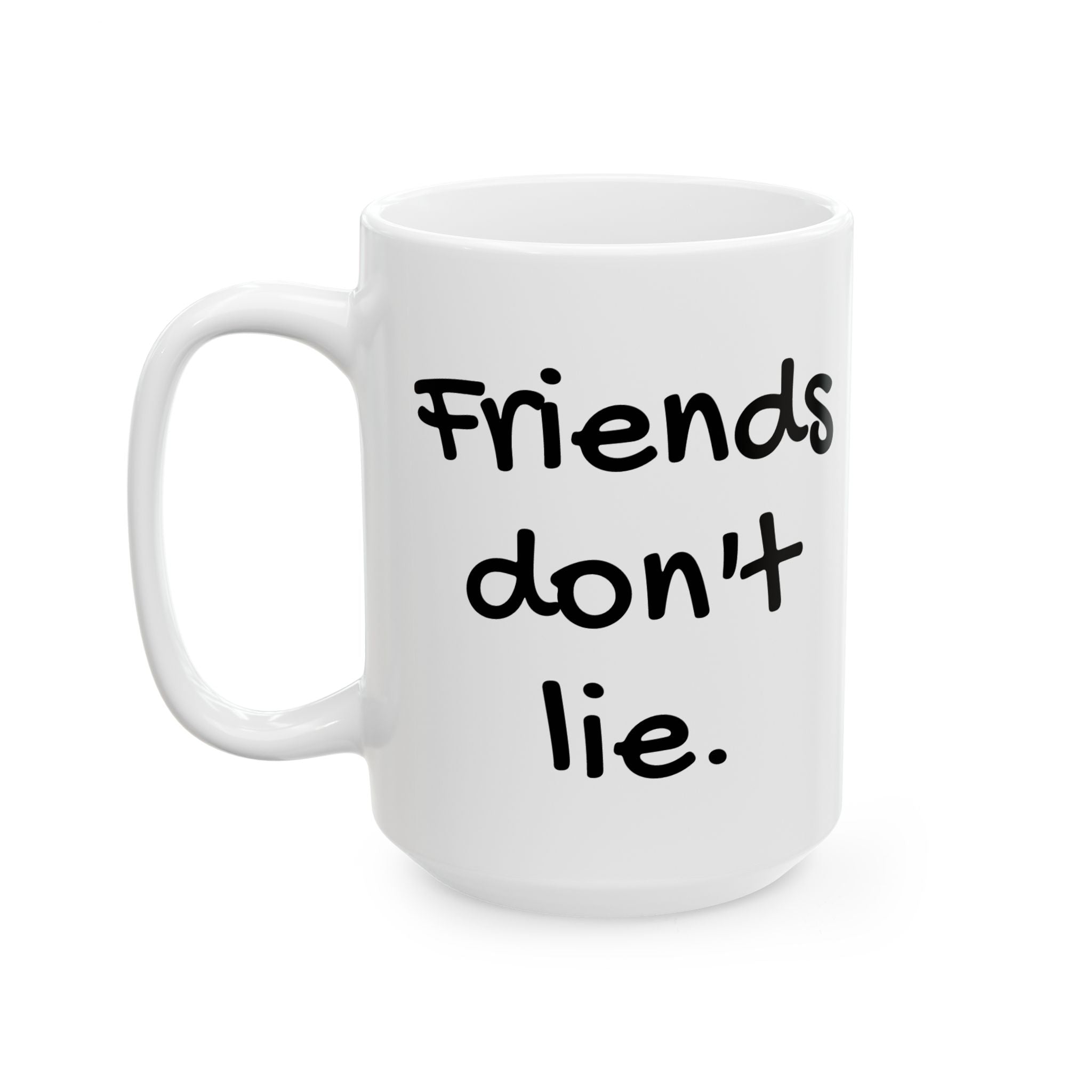Retro 1980s themed 15oz ceramic mug featuring the quote 'Friends don't lie' from Stranger Things. Perfect for fans of the show or anyone who enjoys movie humor and nostalgia. Great gift for birthdays, holidays, or any special occasion.
