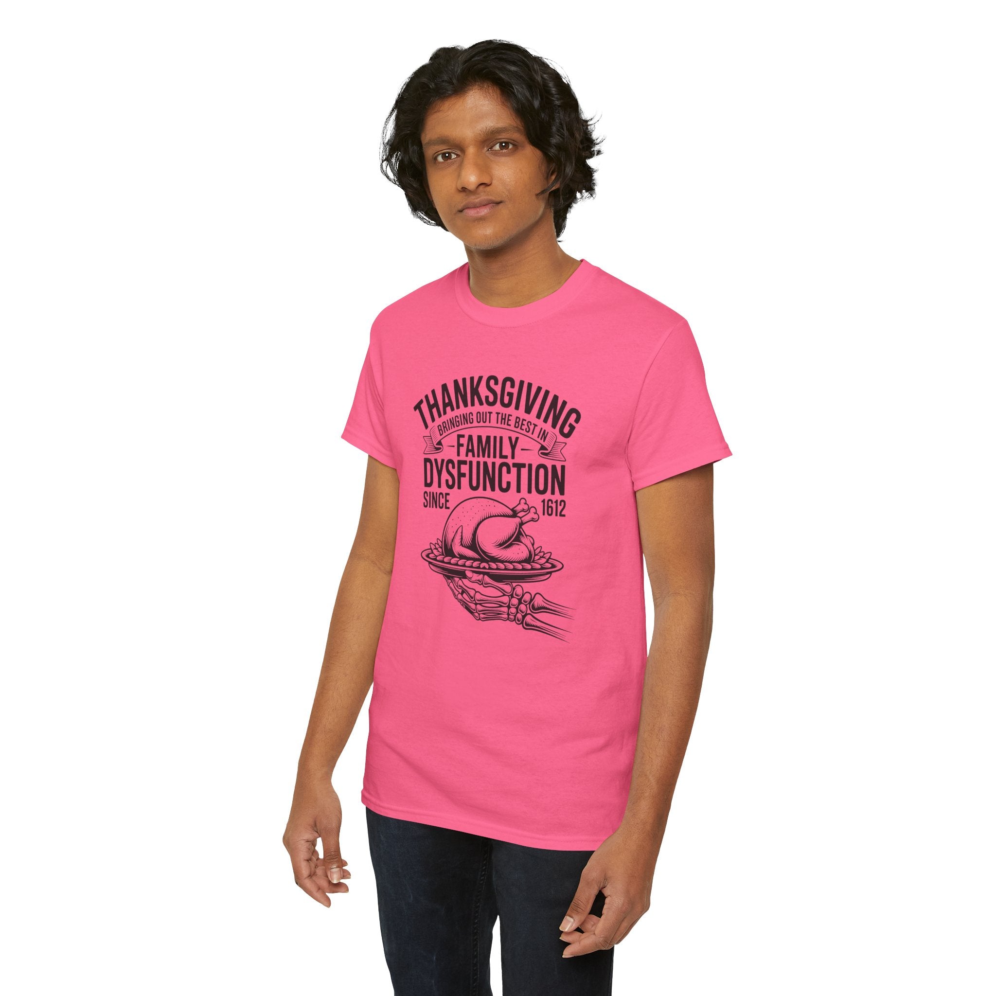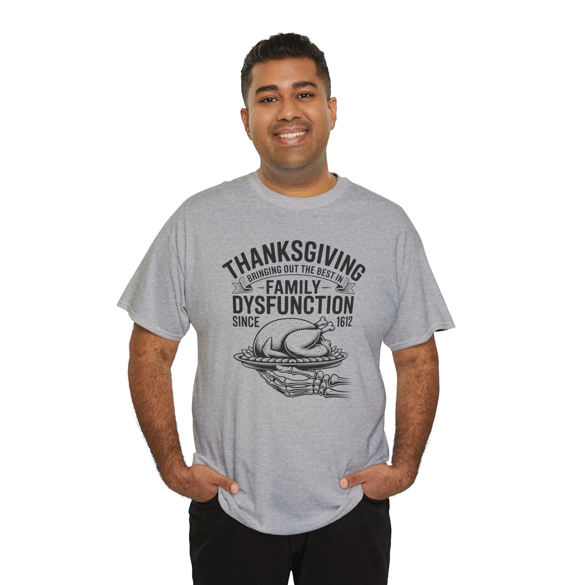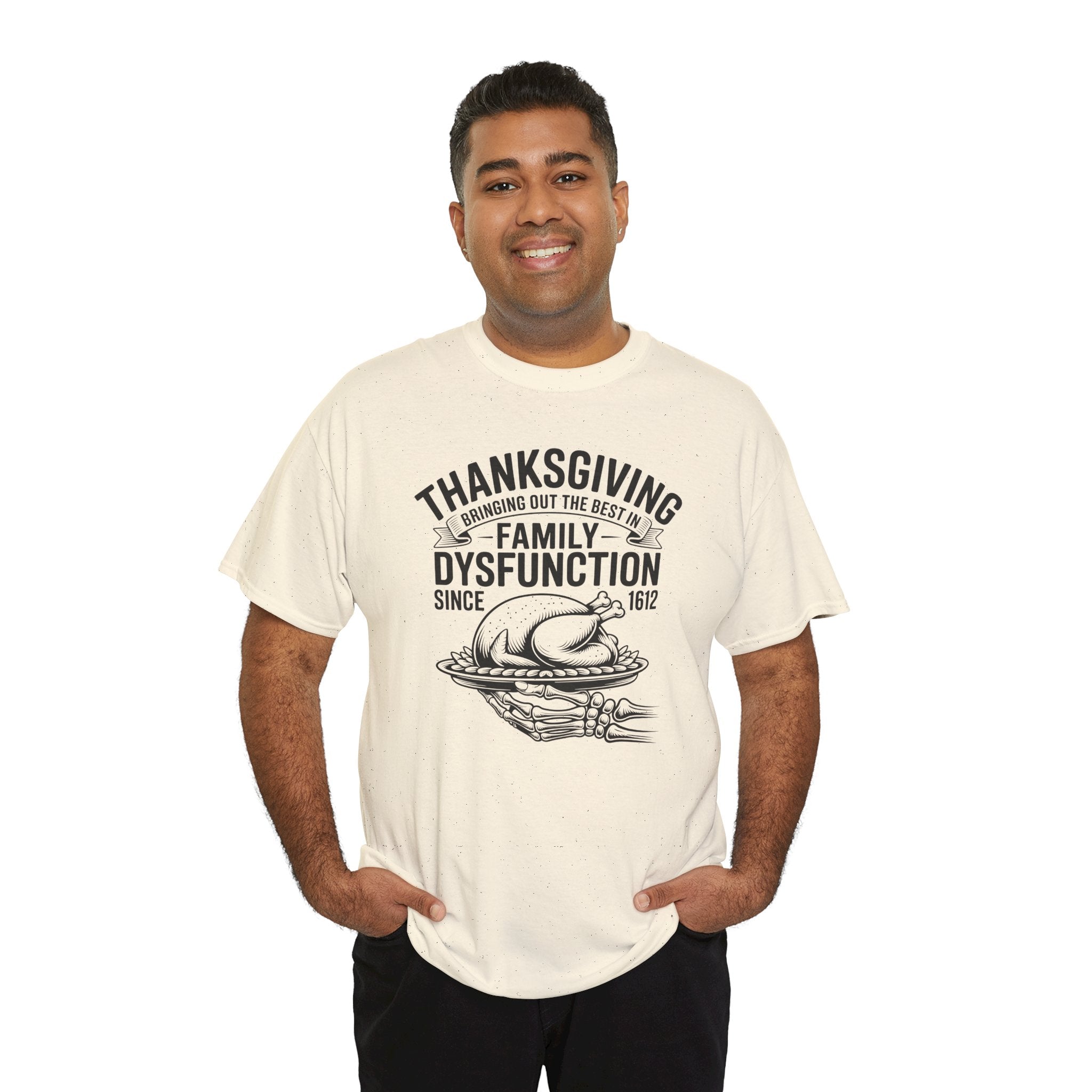 Introducing the perfect unisex heavy cotton tee—a staple for anyone who values comfort and style! This tee radiates a laid-back vibe, effortlessly blending into both casual outings and semi-formal gatherings. Ideal for family gatherings, holiday celebrations, or just relaxing at home, it’s a fantastic way to express yourself while staying comfortable. The shirt is especially relevant for Thanksgiving, making it a fun and humorous piece for the family table. This tee caters to adults looking for a classic style with a modern twist, adding personality to any wardrobe.