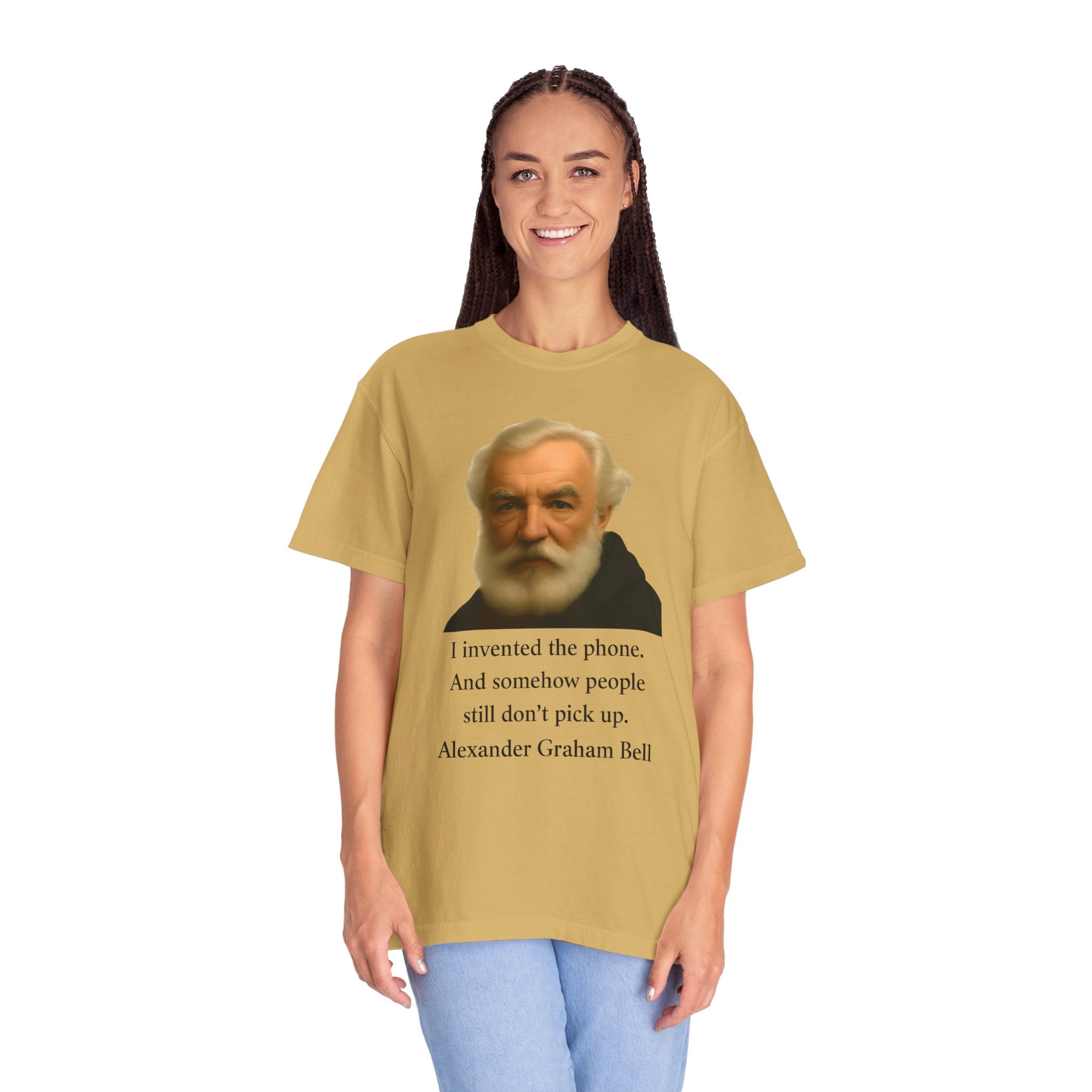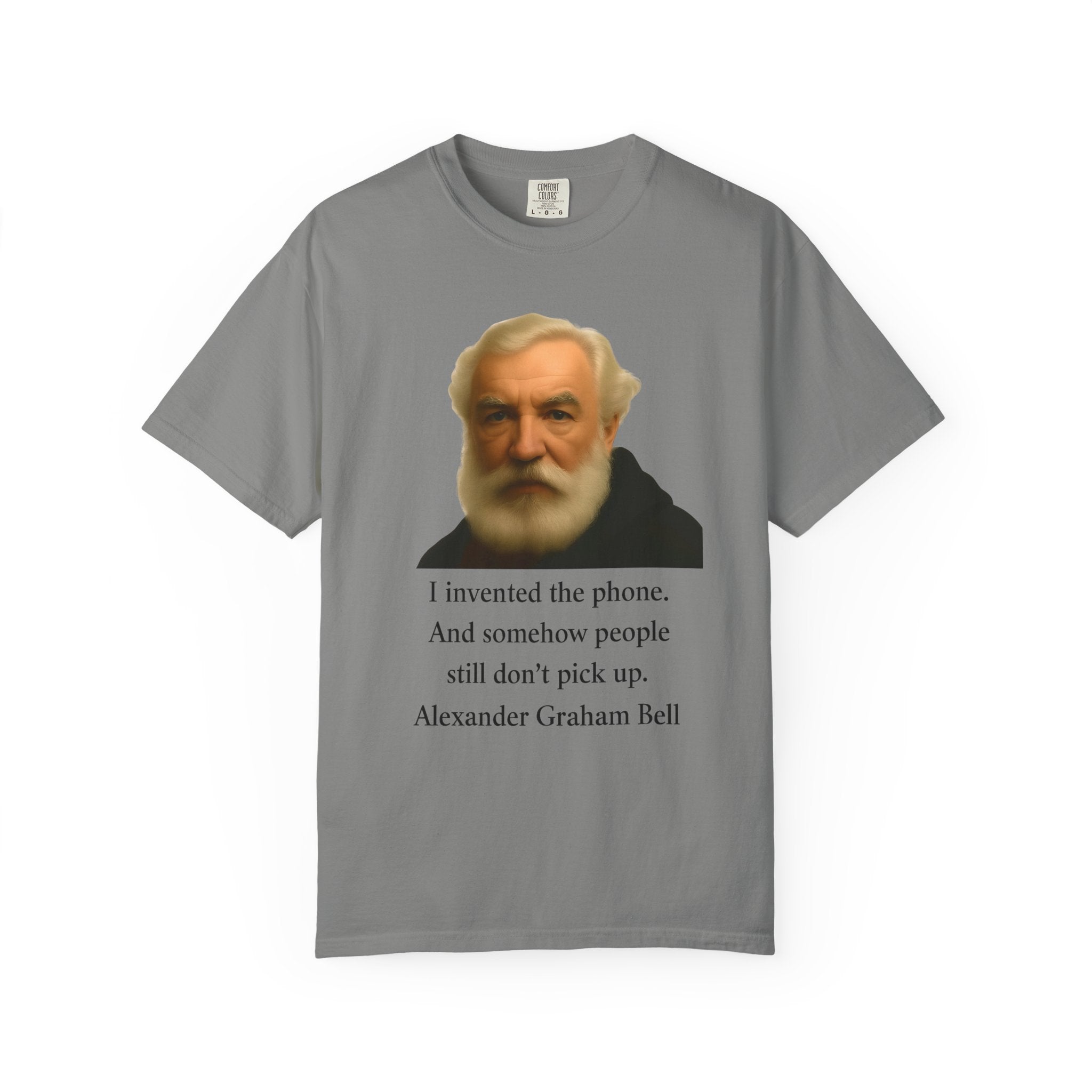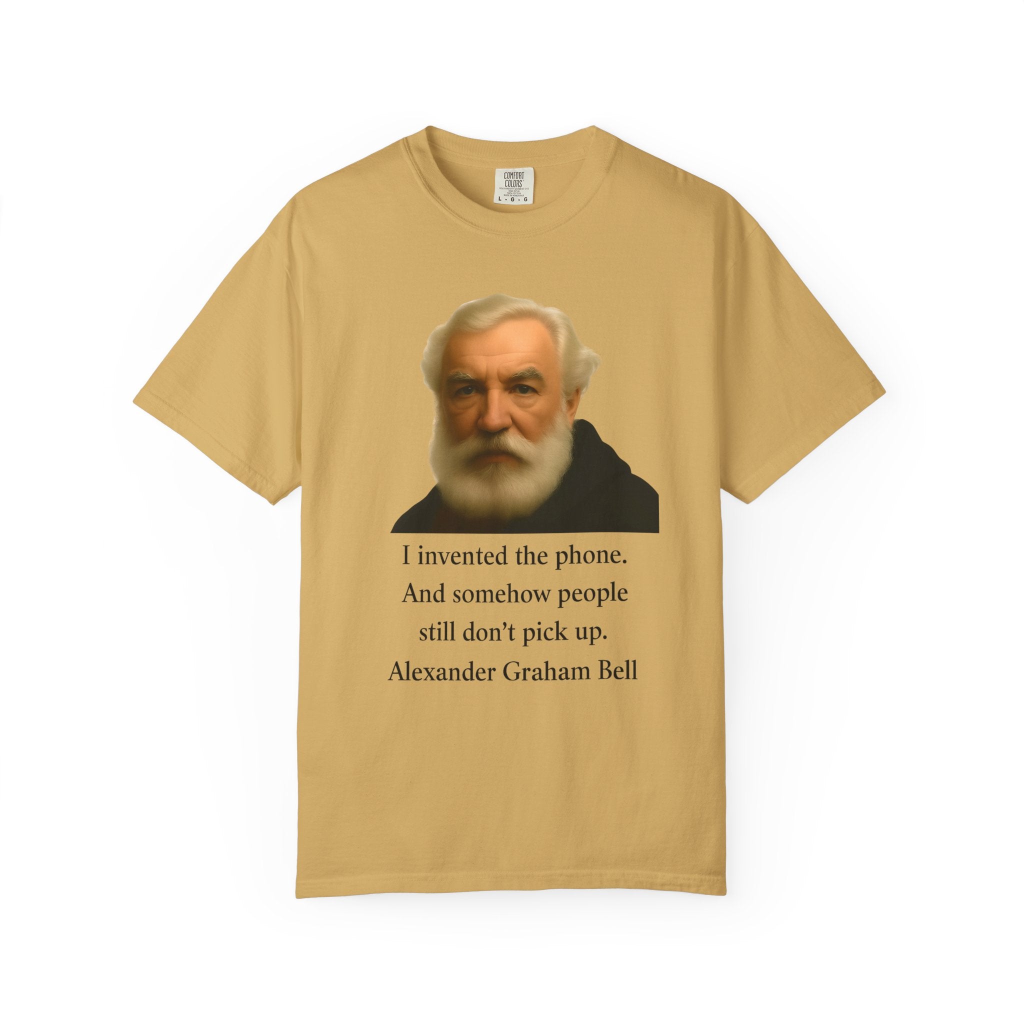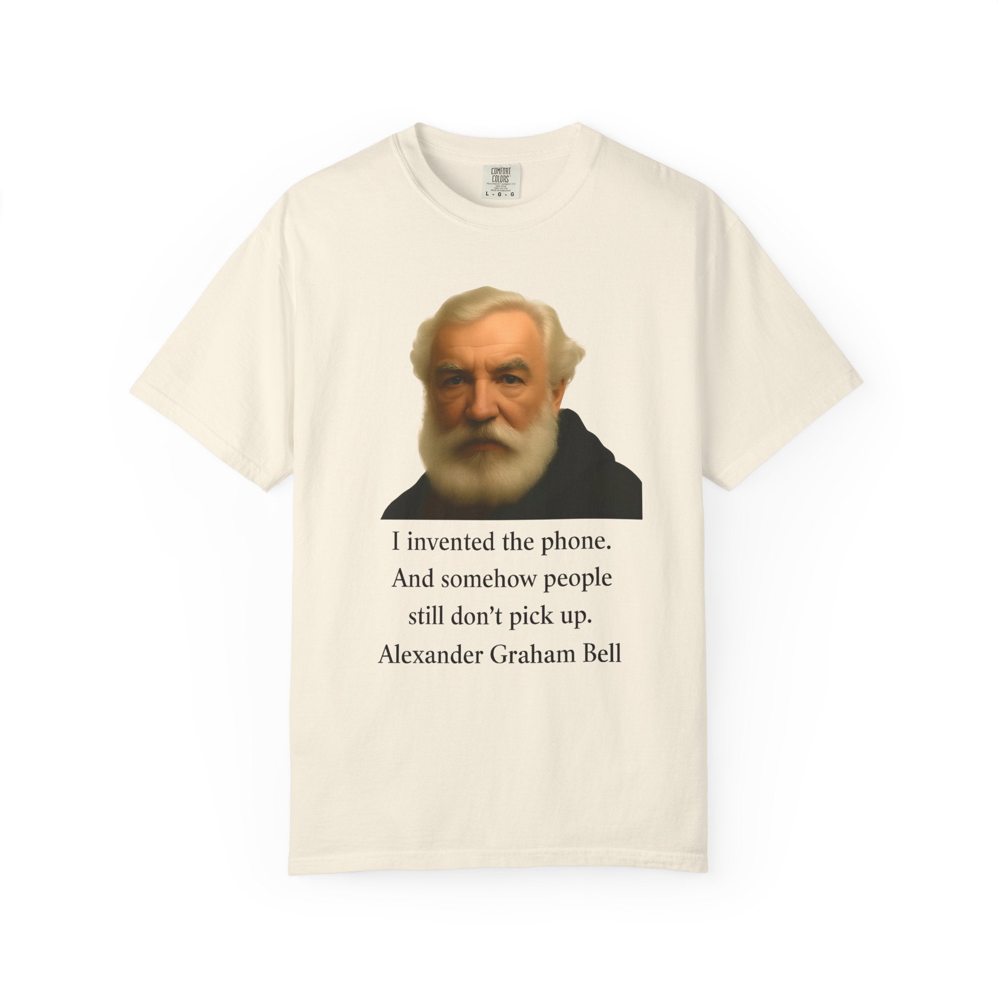Soft, garment-dyed cotton with a quietly clever vintage print — this relaxed tee feels lived-in from the first wear. The front features a muted portrait of Alexander Graham Bell above a wry line about invention and missed calls, laid out with clean type and plenty of white space. It sits comfortably over jeans or layered under a jacket, working as both a low-key conversation starter and an every-day staple. Wear it when you want subtle humor that reads smart, not loud.