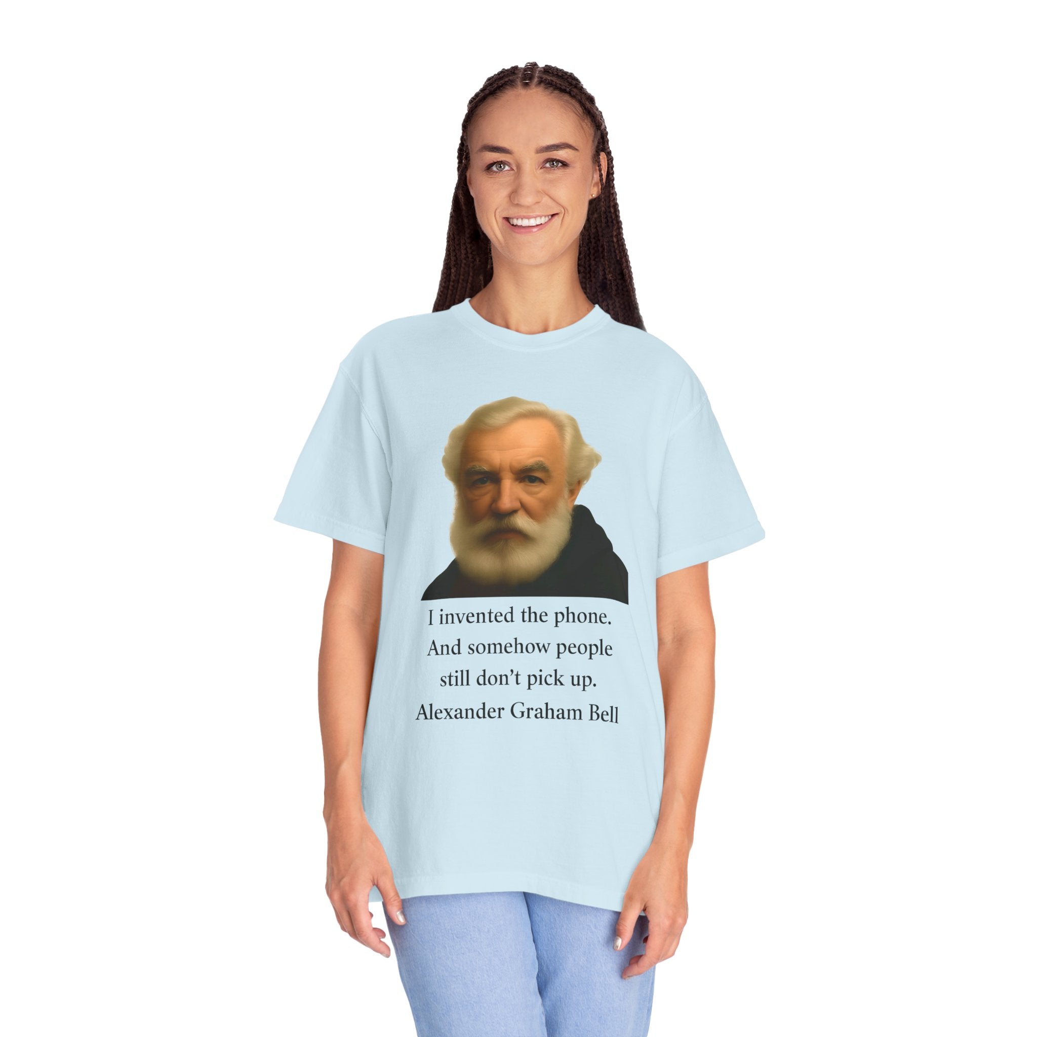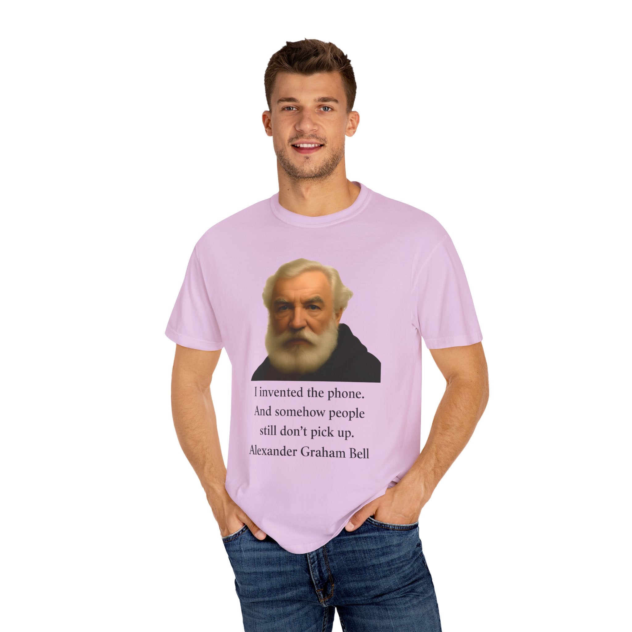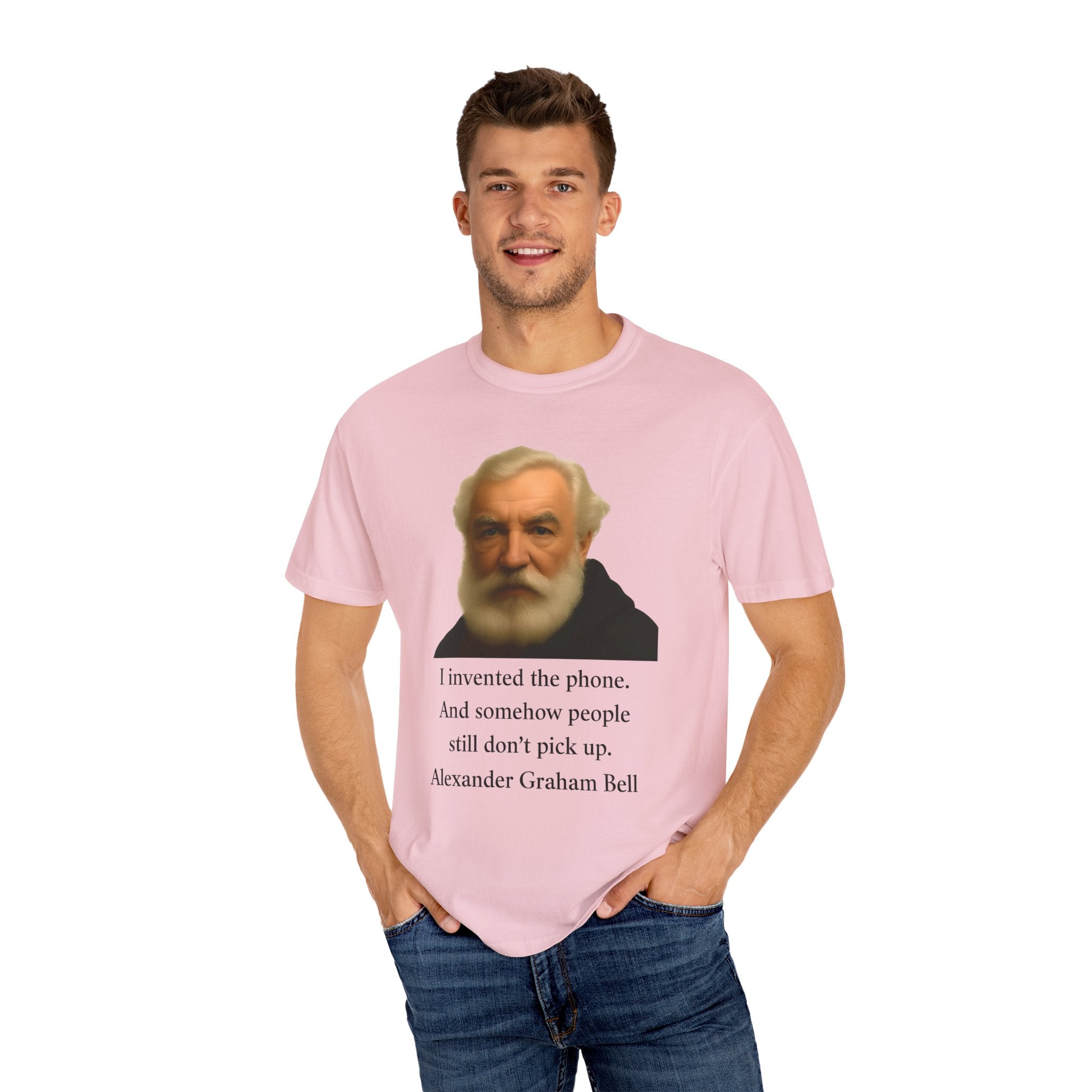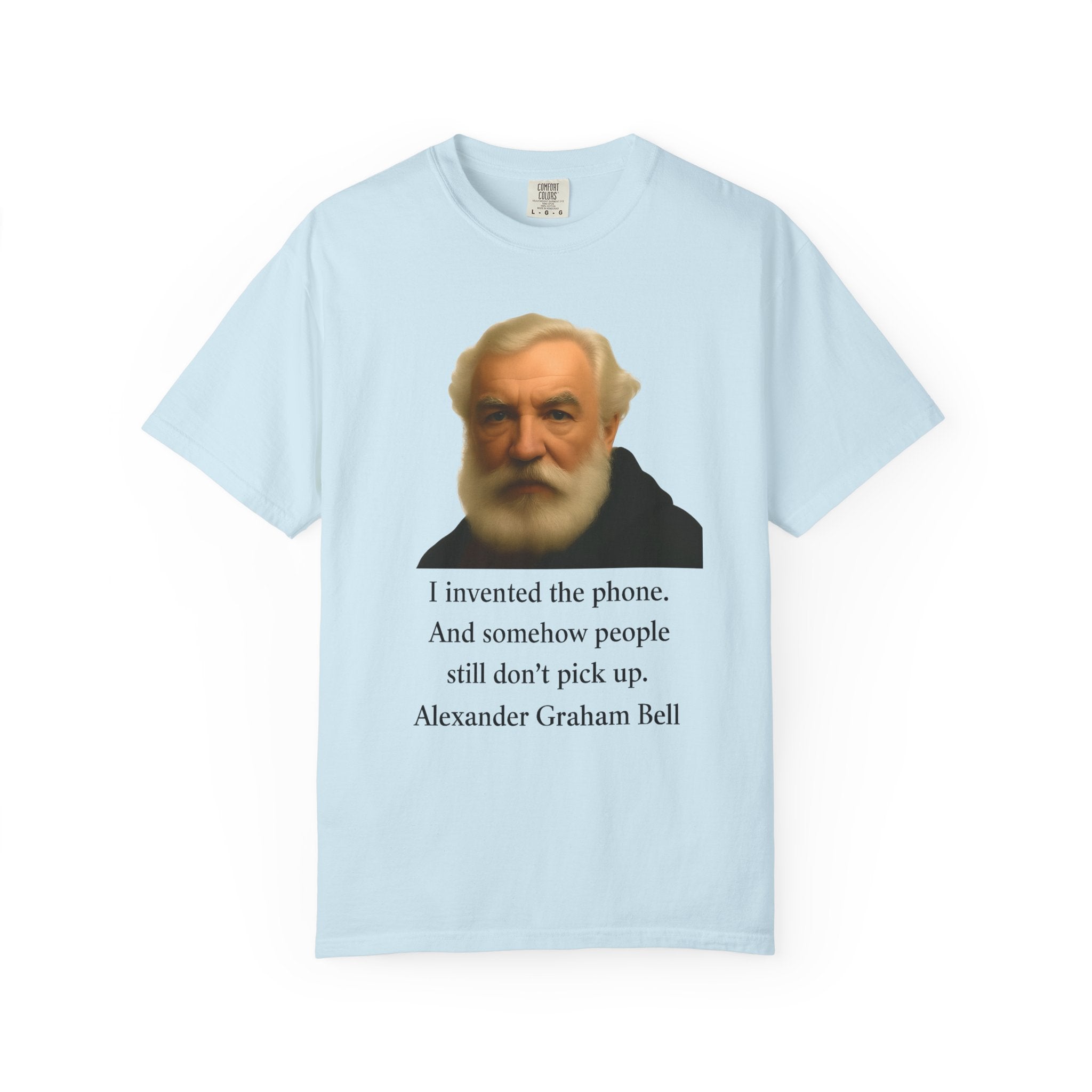Soft, garment-dyed cotton with a quietly clever vintage print — this relaxed tee feels lived-in from the first wear. The front features a muted portrait of Alexander Graham Bell above a wry line about invention and missed calls, laid out with clean type and plenty of white space. It sits comfortably over jeans or layered under a jacket, working as both a low-key conversation starter and an every-day staple. Wear it when you want subtle humor that reads smart, not loud.