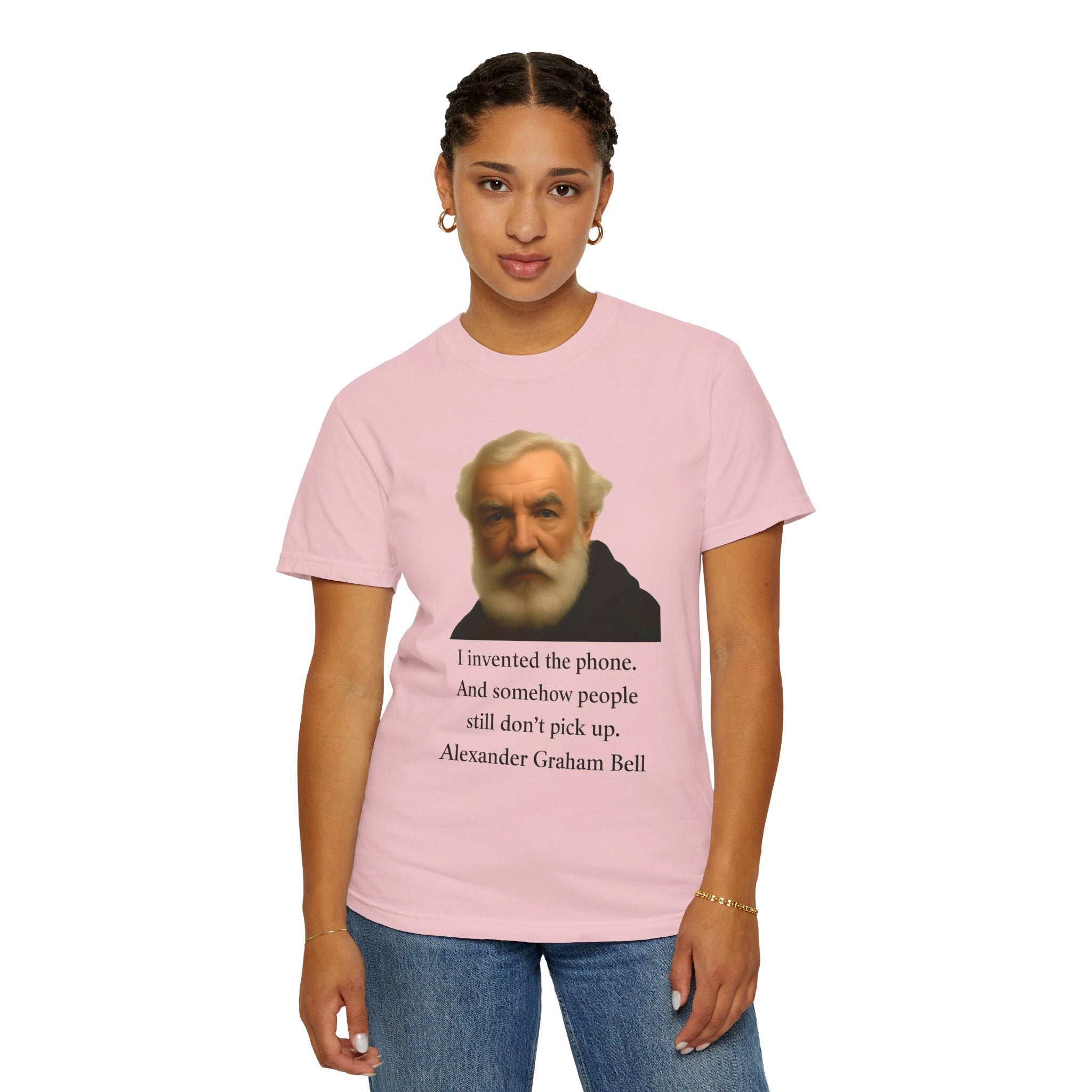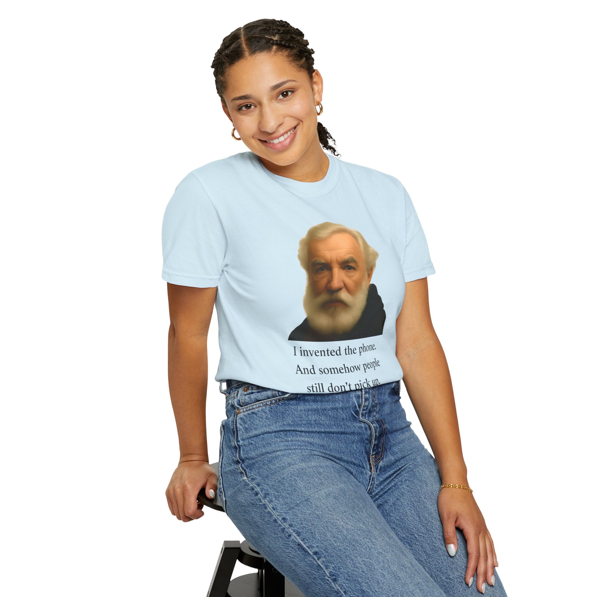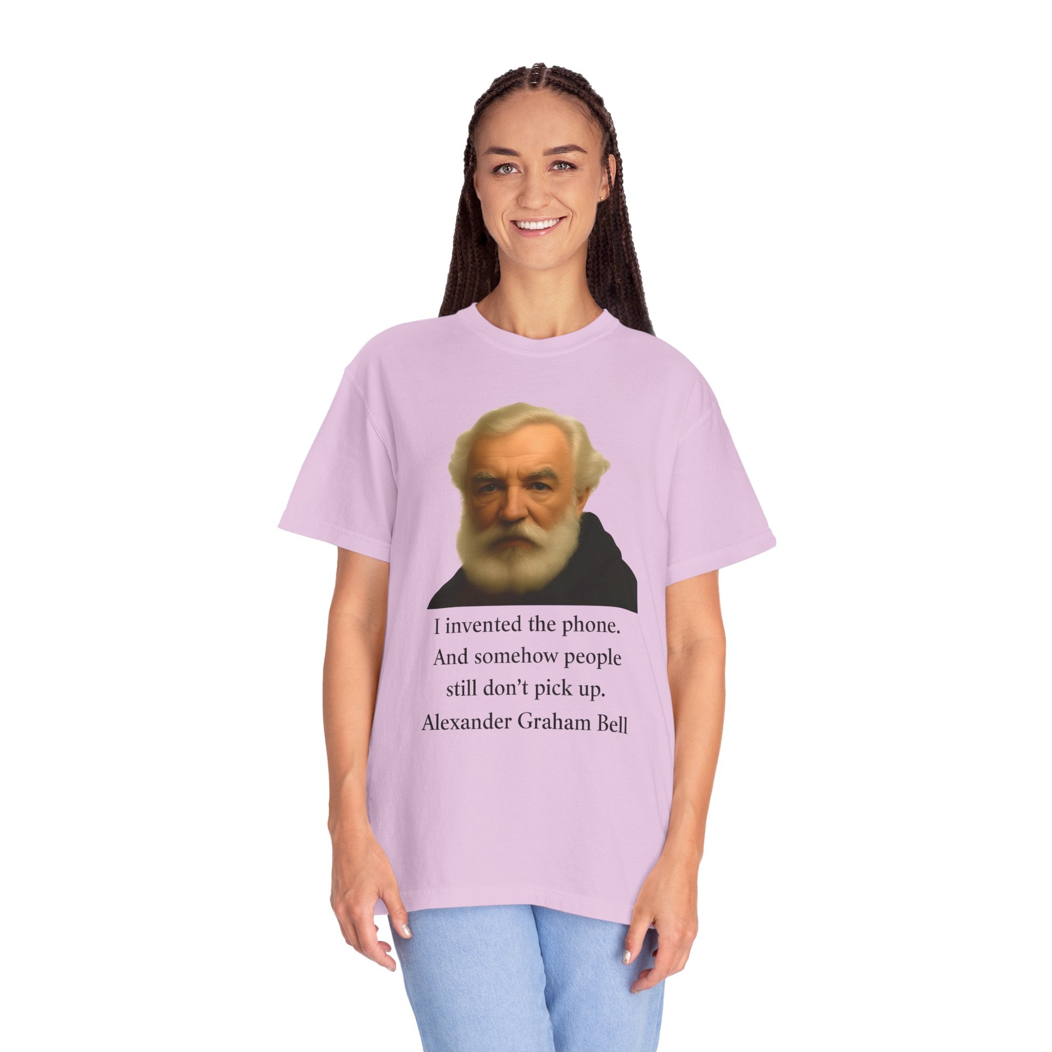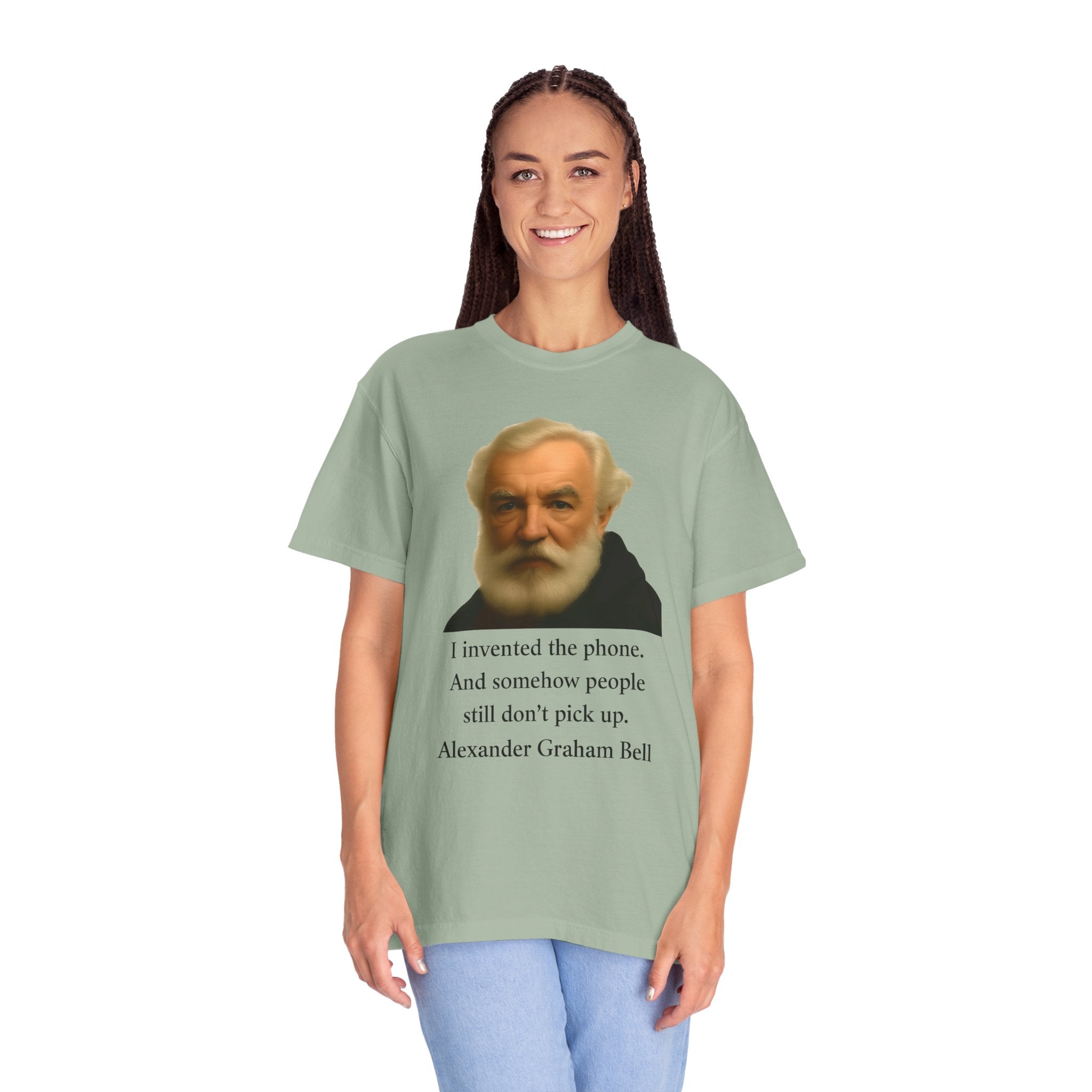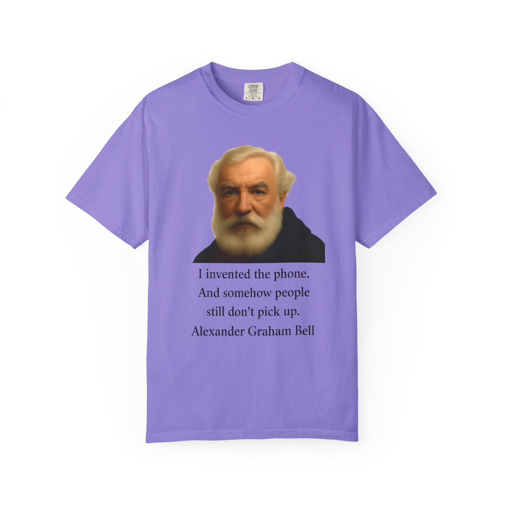 Soft, garment-dyed cotton with a quietly clever vintage print — this relaxed tee feels lived-in from the first wear. The front features a muted portrait of Alexander Graham Bell above a wry line about invention and missed calls, laid out with clean type and plenty of white space. It sits comfortably over jeans or layered under a jacket, working as both a low-key conversation starter and an every-day staple. Wear it when you want subtle humor that reads smart, not loud.