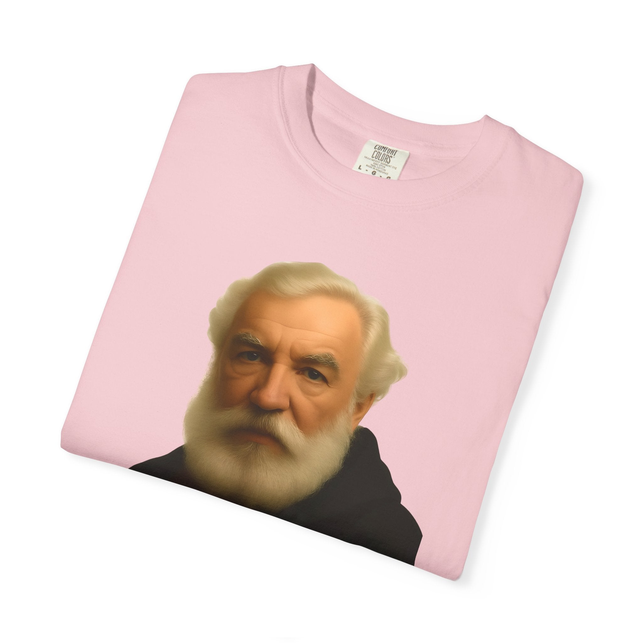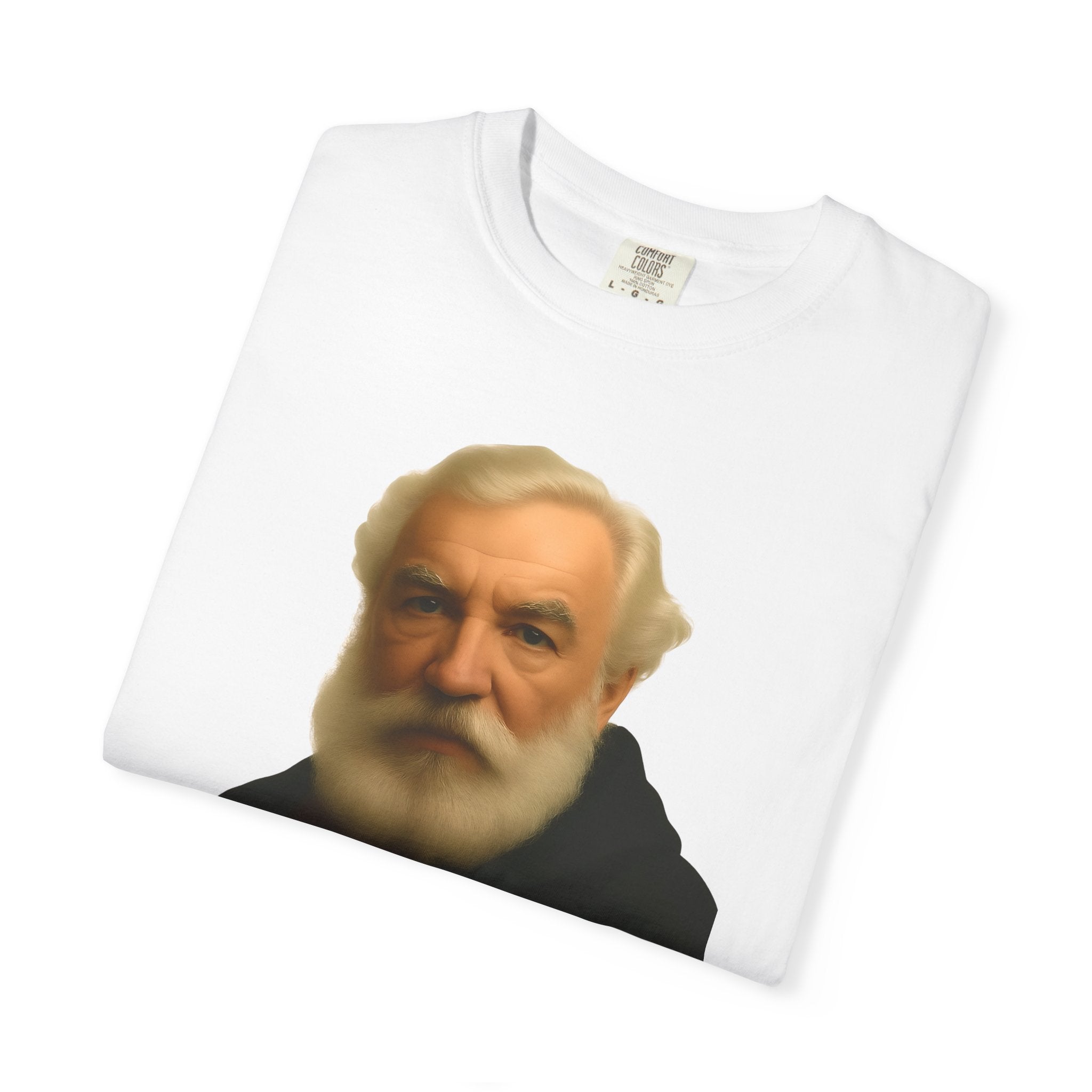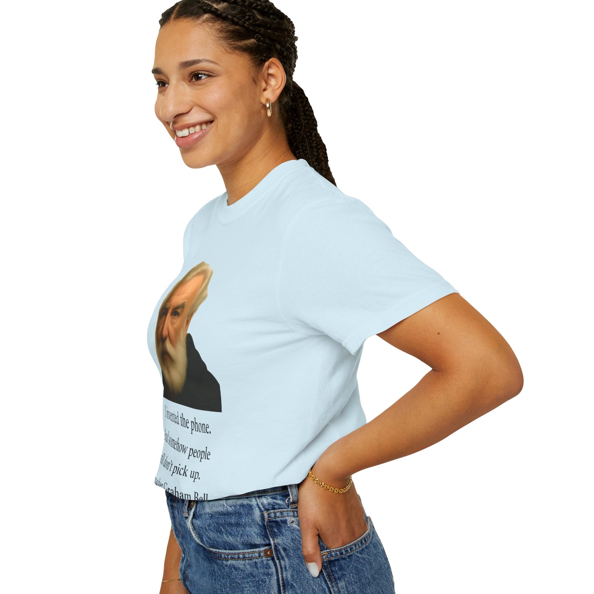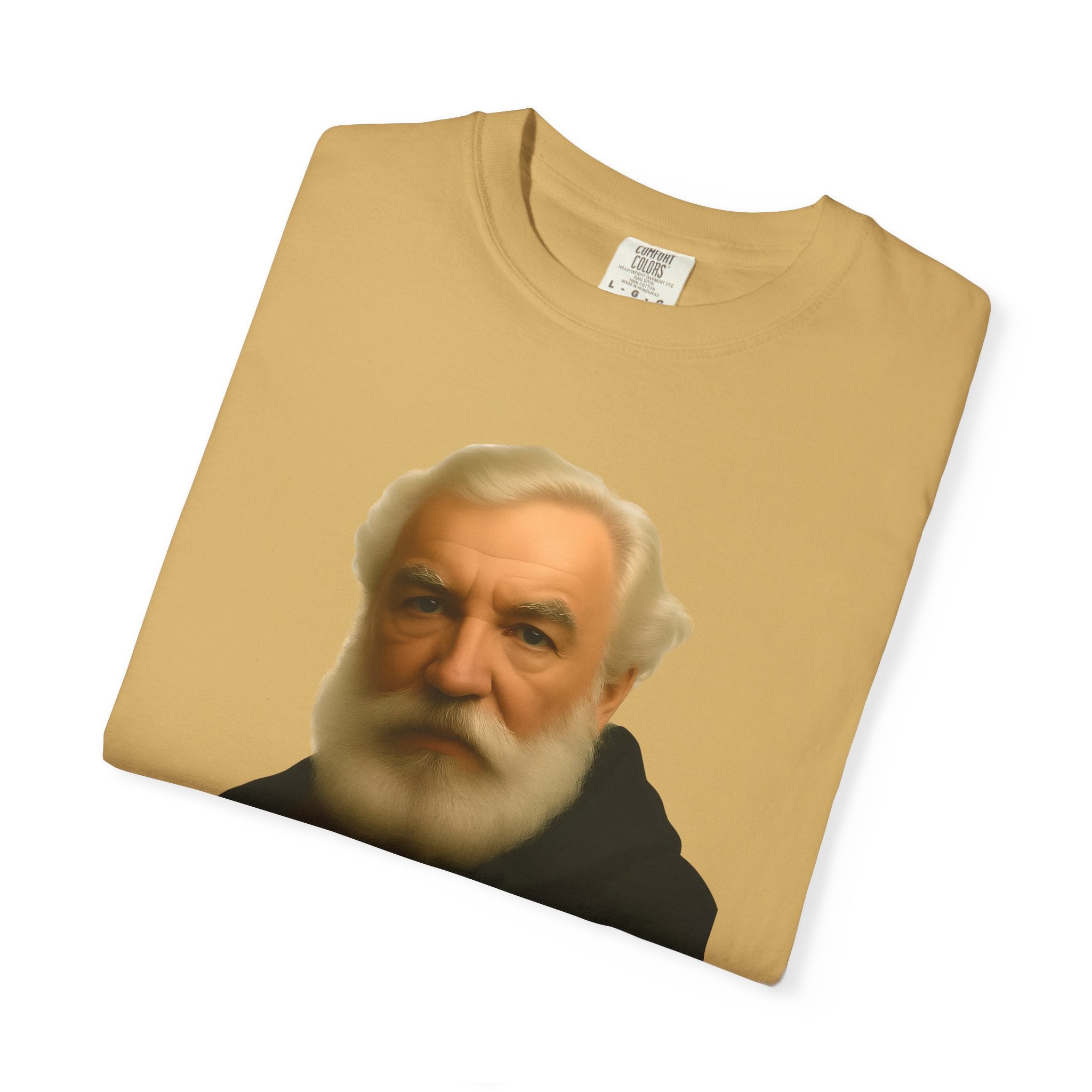 Soft, garment-dyed cotton with a quietly clever vintage print — this relaxed tee feels lived-in from the first wear. The front features a muted portrait of Alexander Graham Bell above a wry line about invention and missed calls, laid out with clean type and plenty of white space. It sits comfortably over jeans or layered under a jacket, working as both a low-key conversation starter and an every-day staple. Wear it when you want subtle humor that reads smart, not loud.