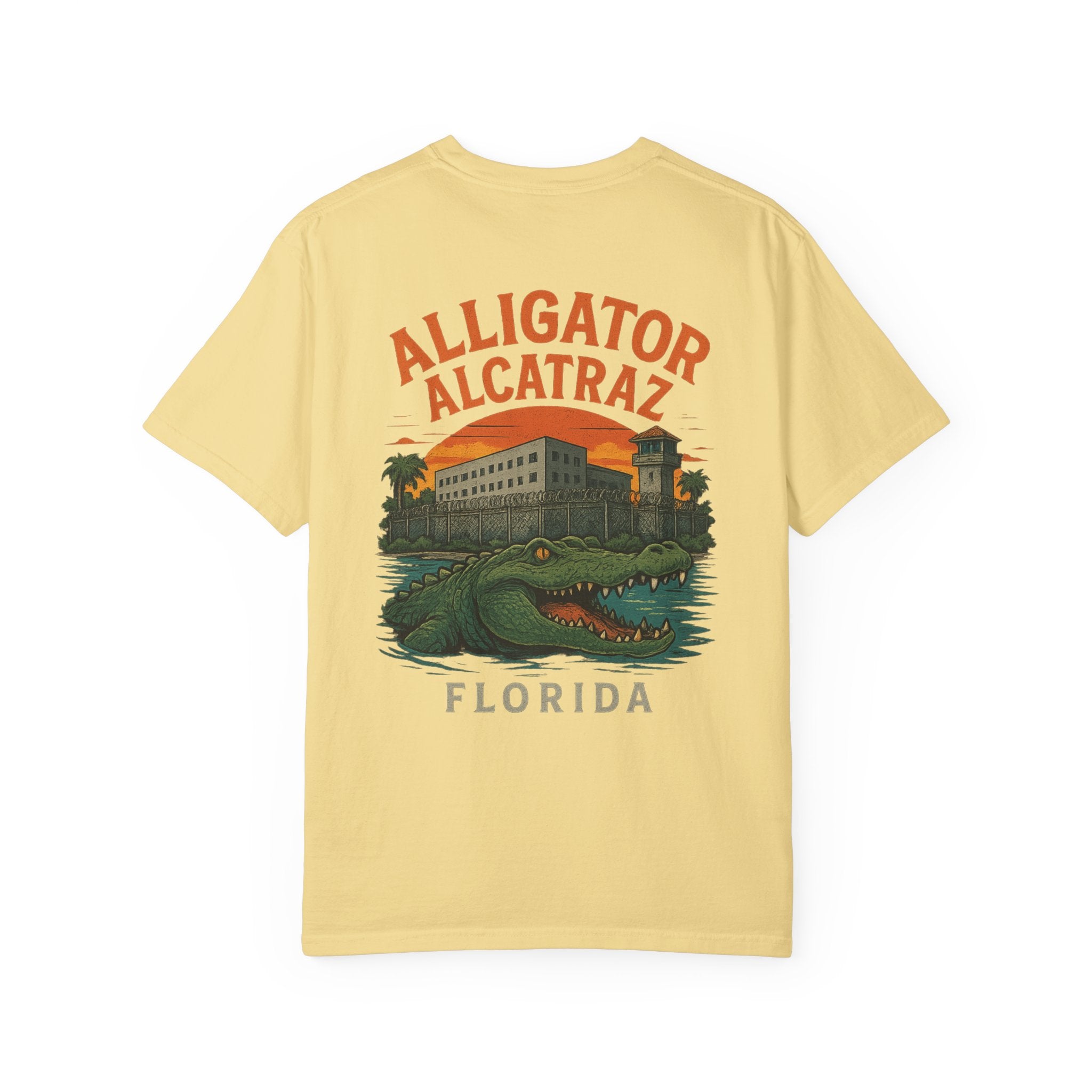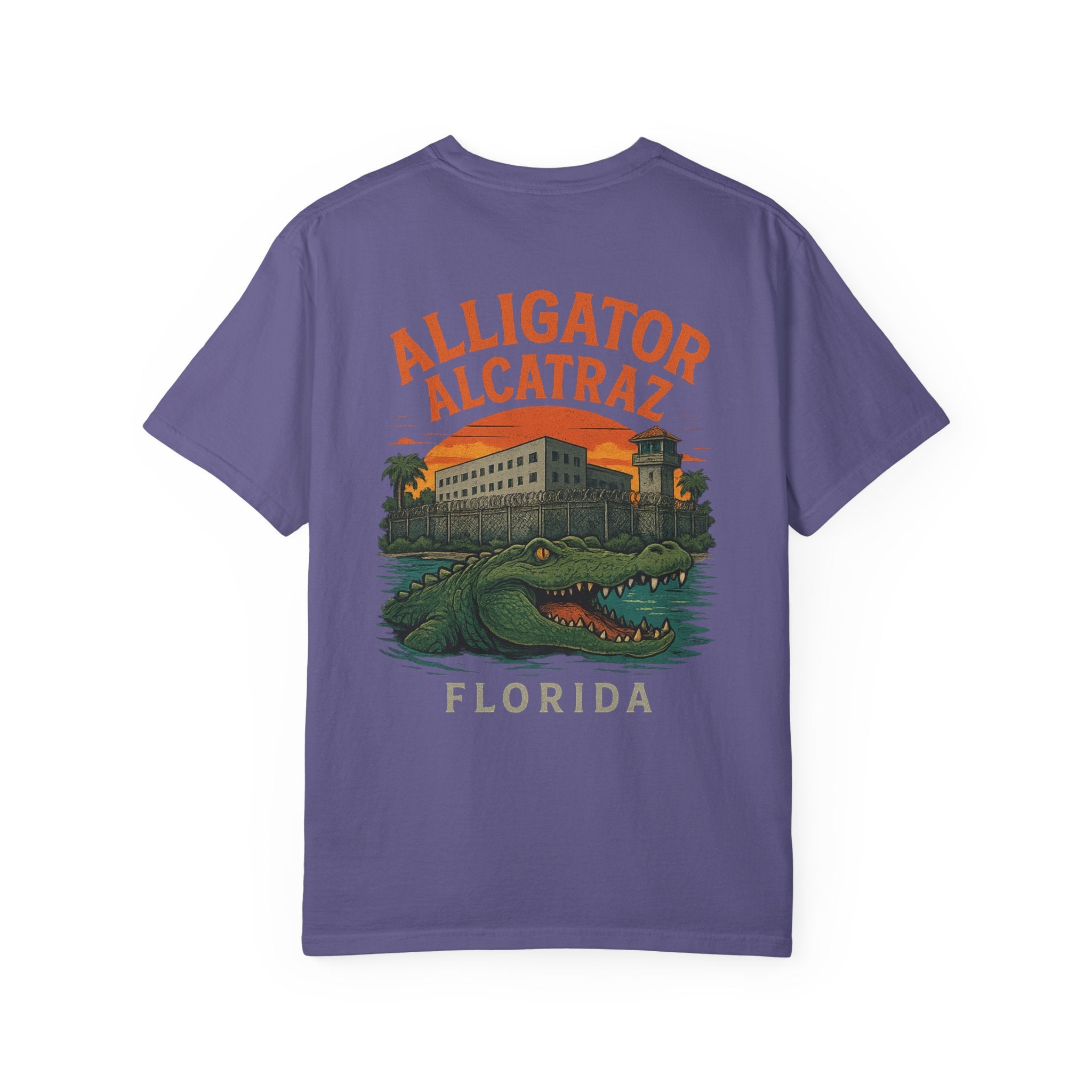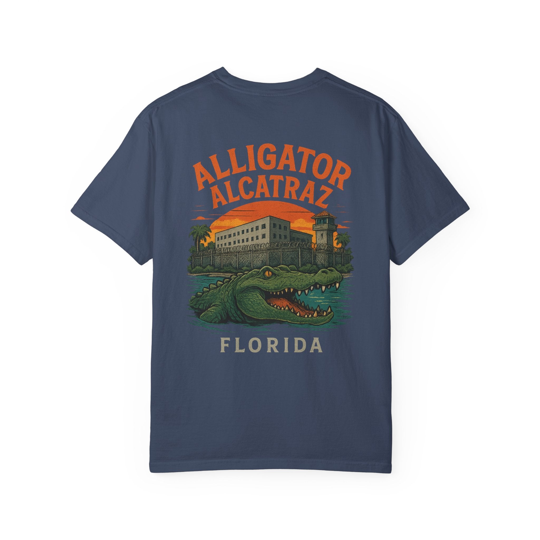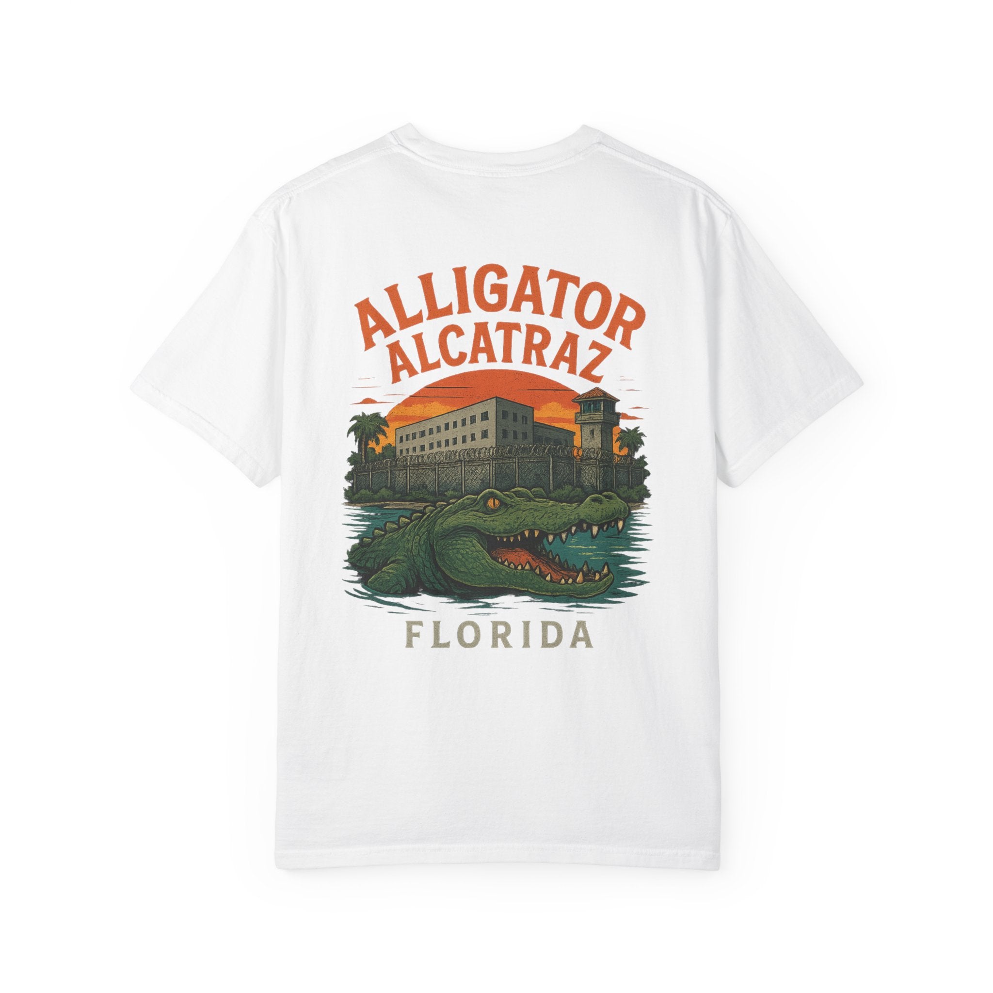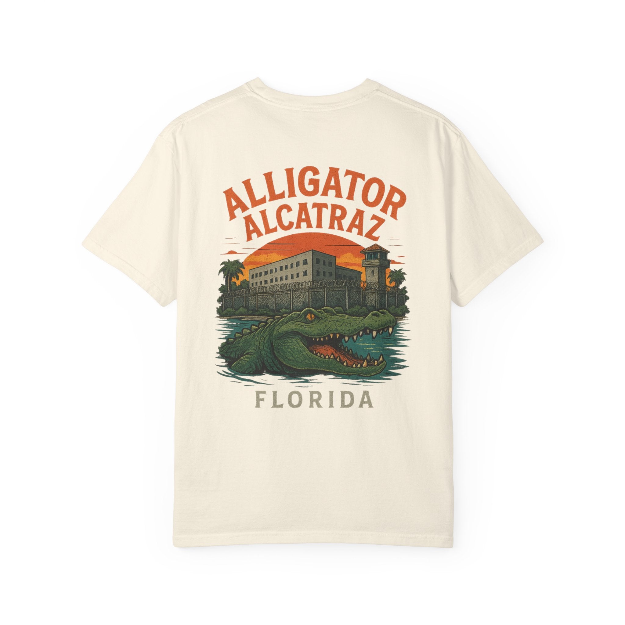 Vintage-style Alligator Alcatraz T-Shirt, perfect for Florida souvenir collectors. This comfortable unisex graphic top is ideal for casual wear, giving off a laid-back vibe. It fits well in a relaxed setting and is a great addition to any wardrobe. Suitable for adults, this tee is a must-have for Florida-themed holidays and vacations.