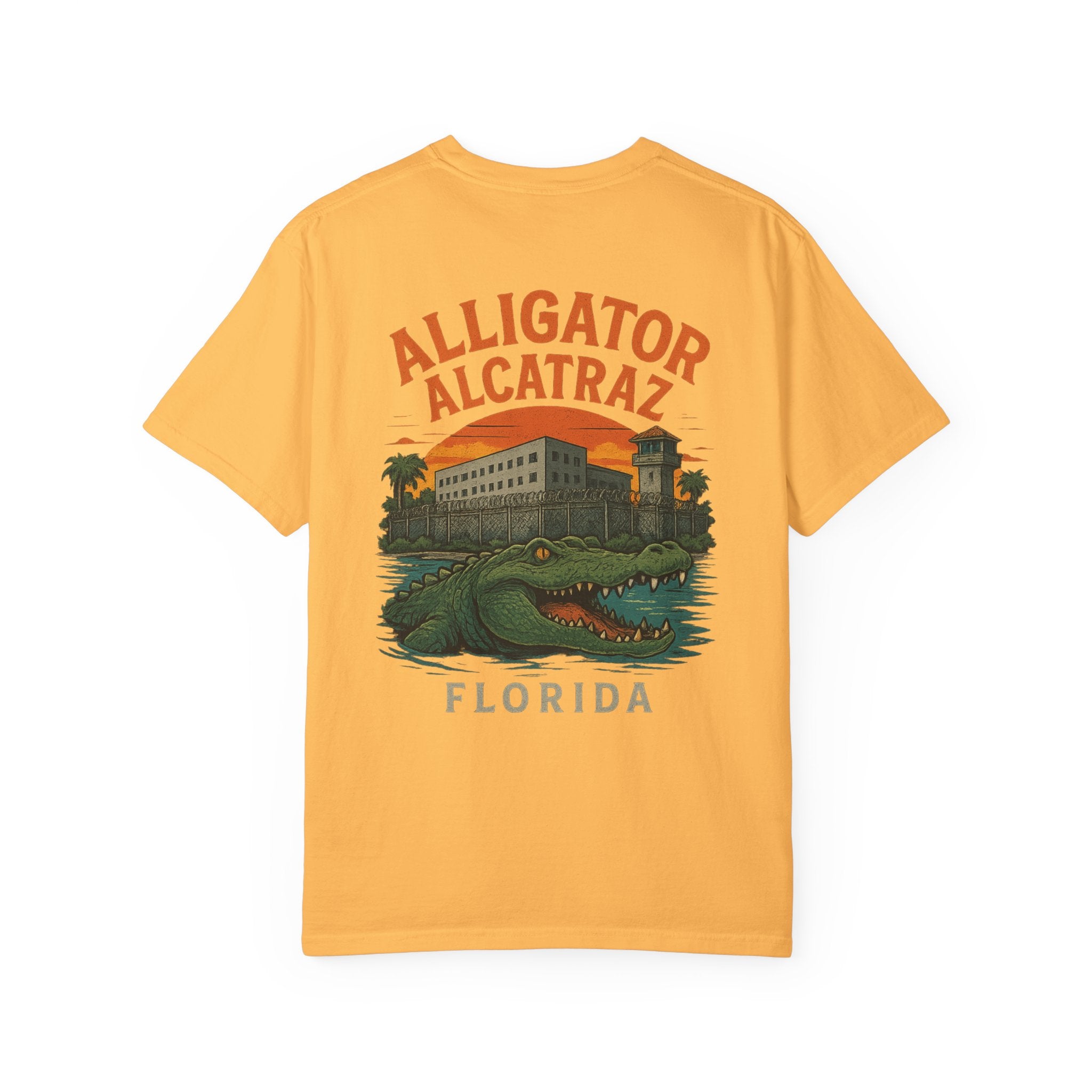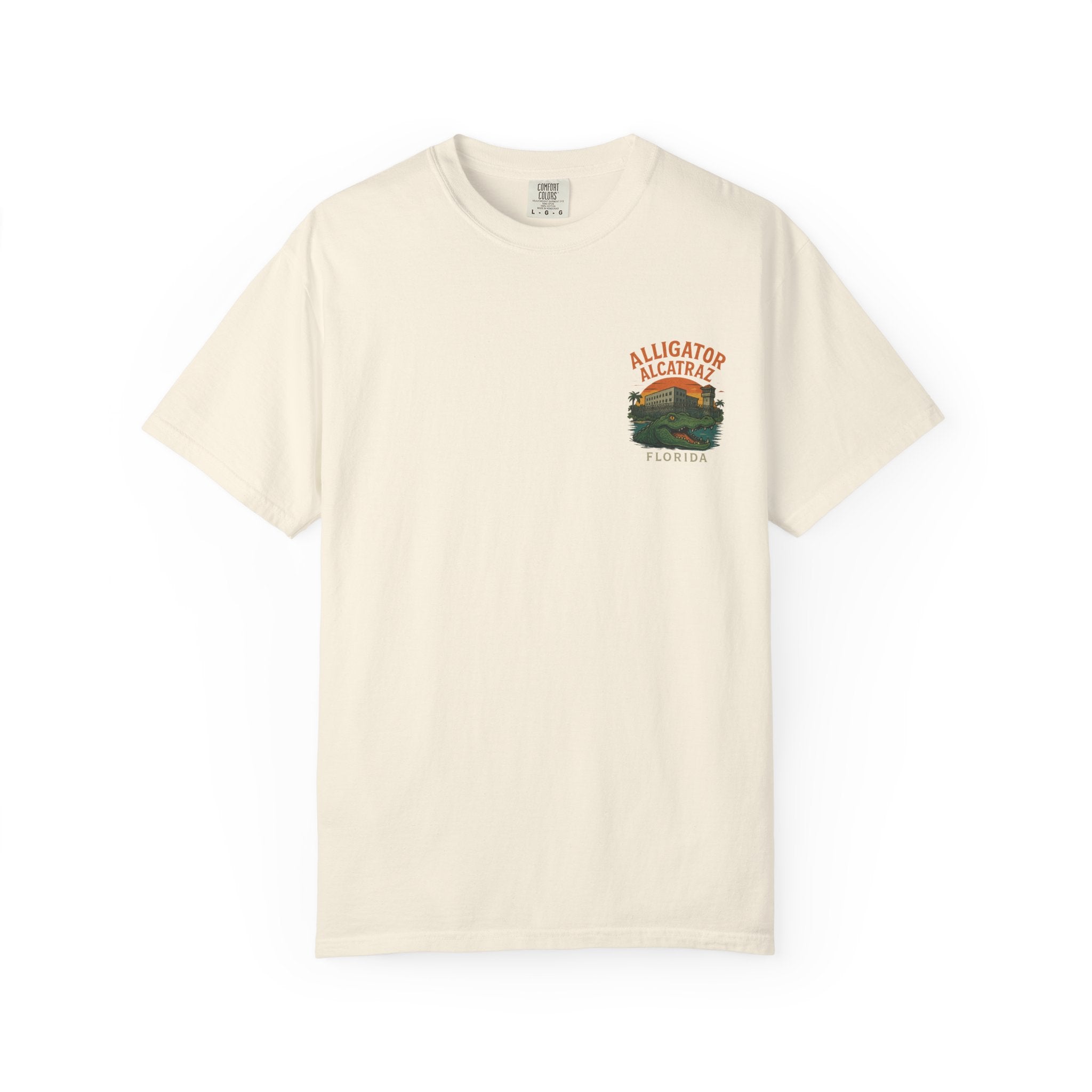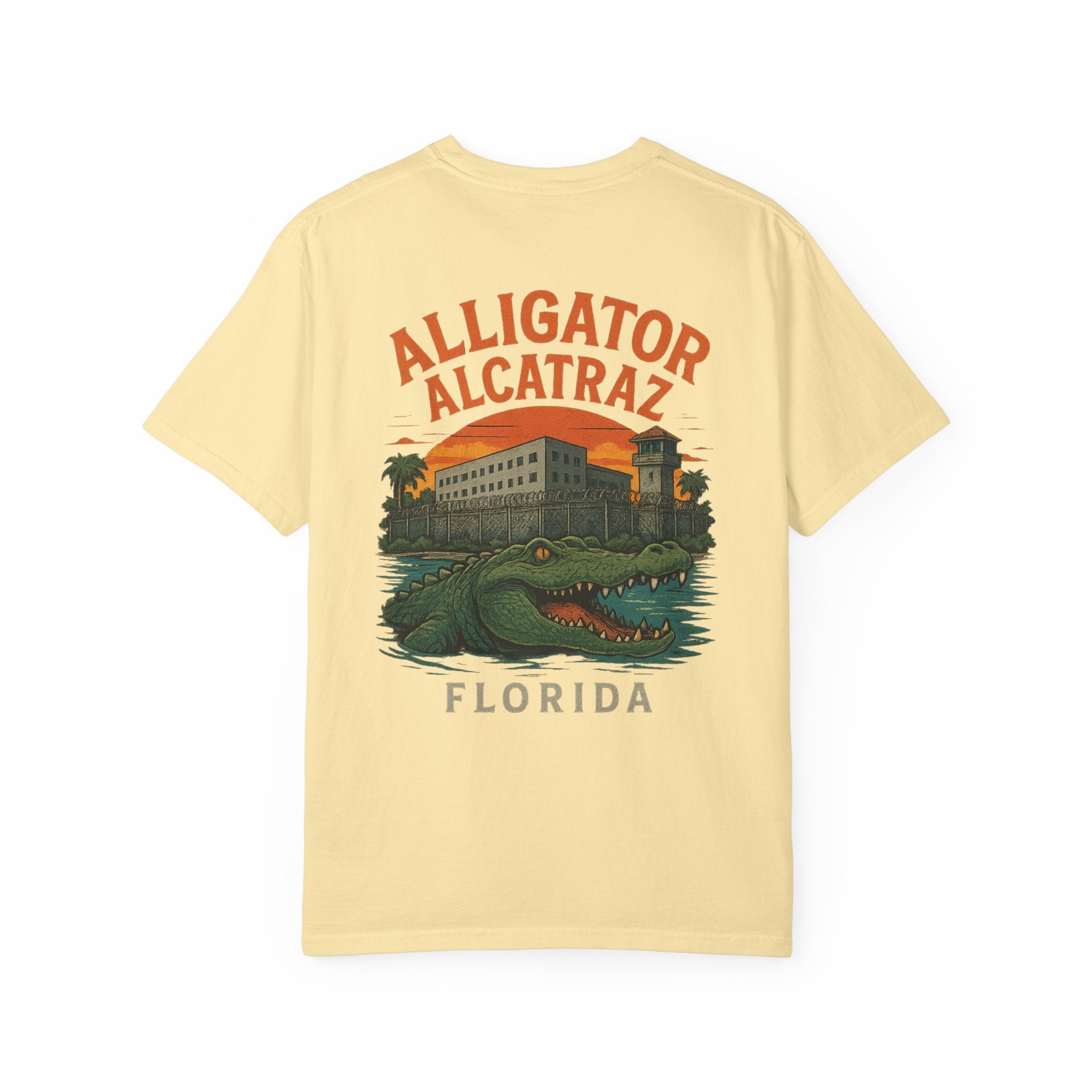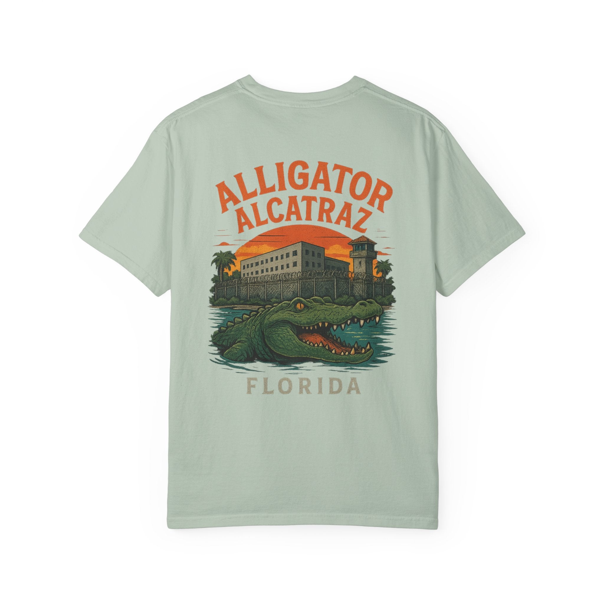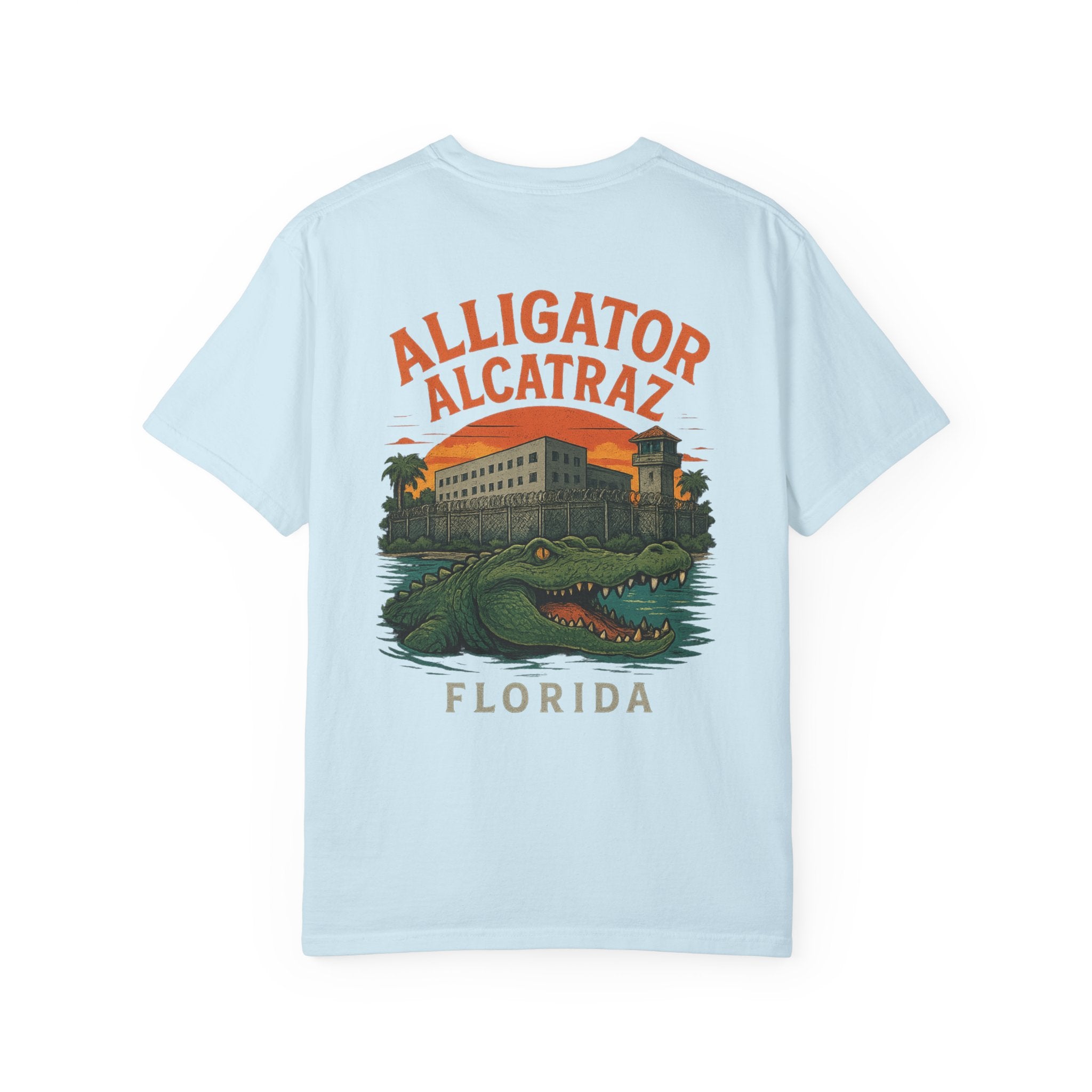 Vintage-style Alligator Alcatraz T-Shirt, perfect for Florida souvenir collectors. This comfortable unisex graphic top is ideal for casual wear, giving off a laid-back vibe. It fits well in a relaxed setting and is a great addition to any wardrobe. Suitable for adults, this tee is a must-have for Florida-themed holidays and vacations.