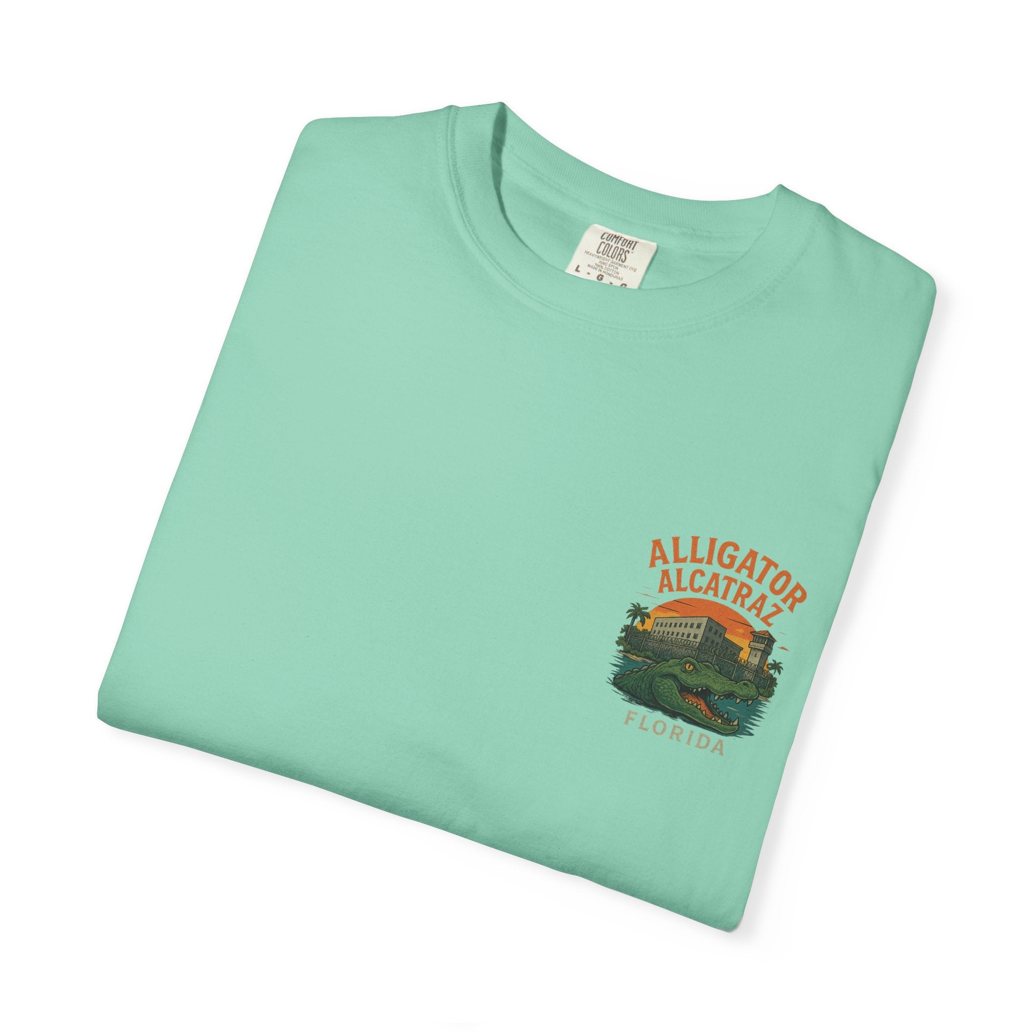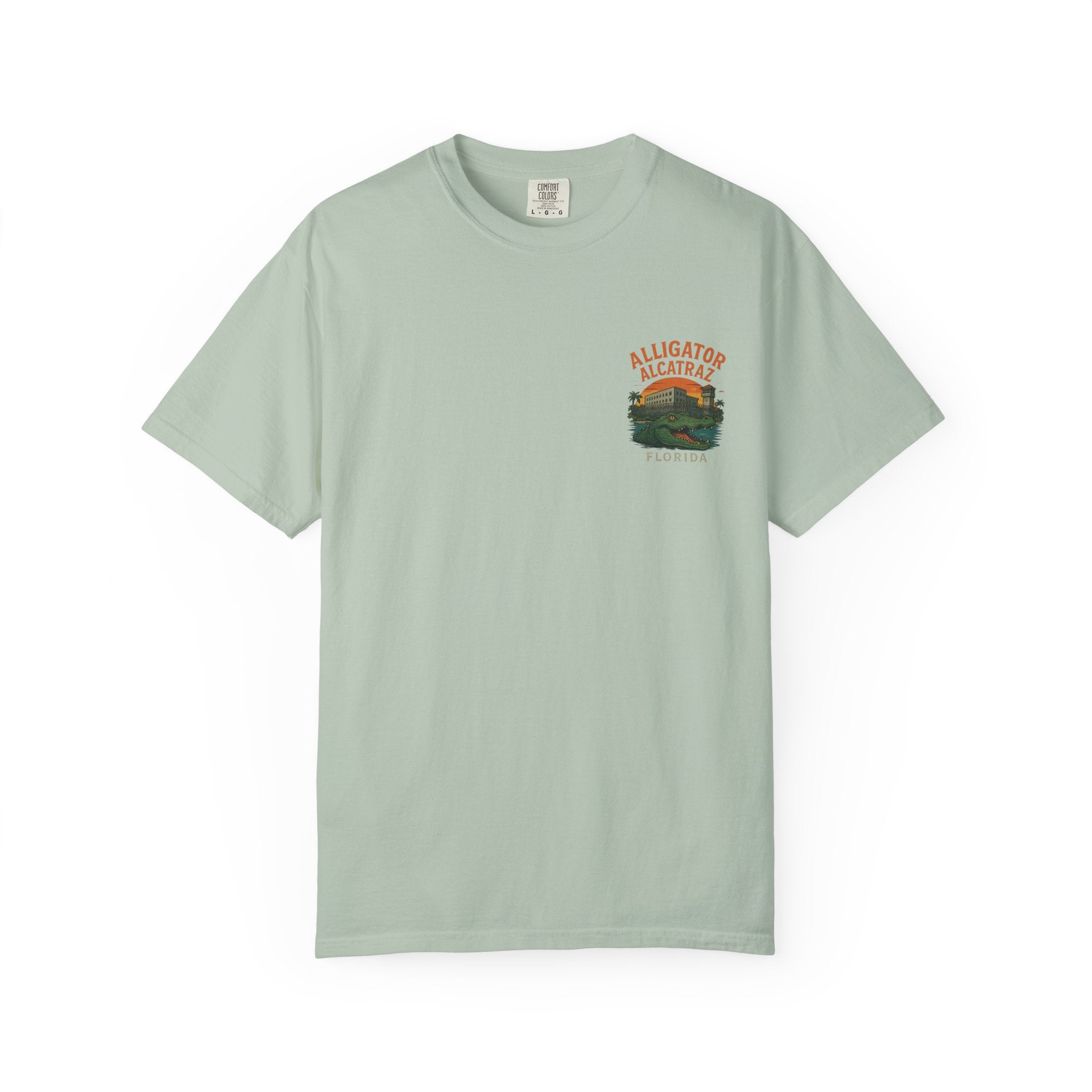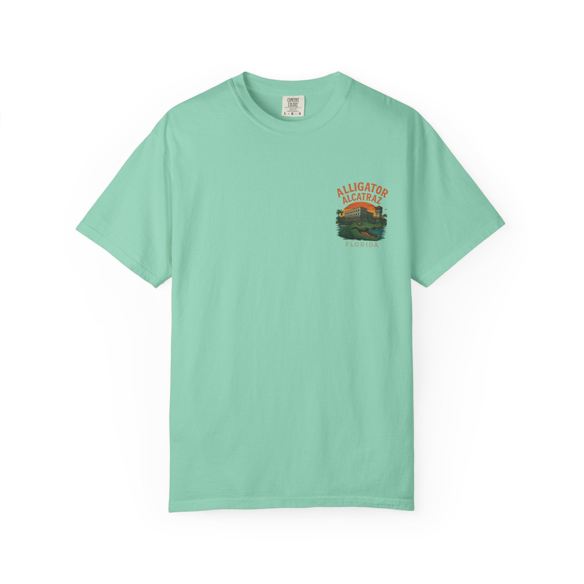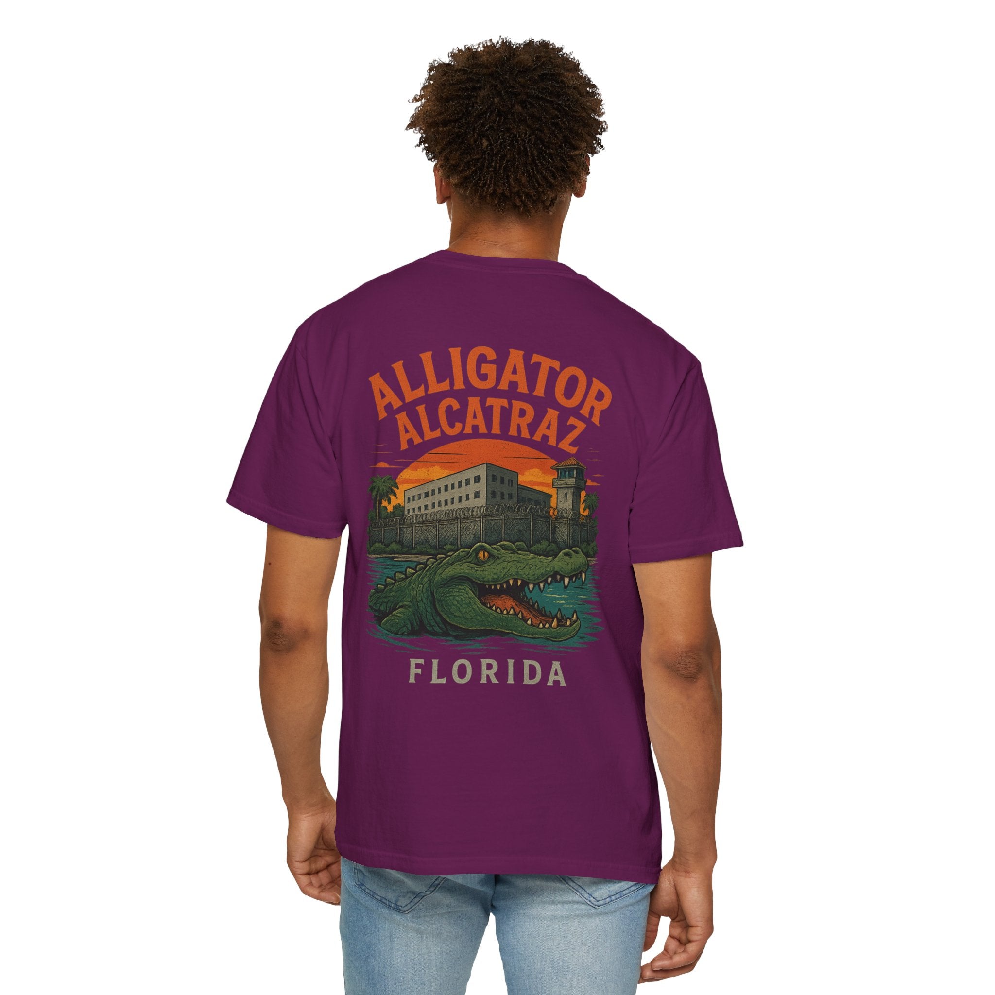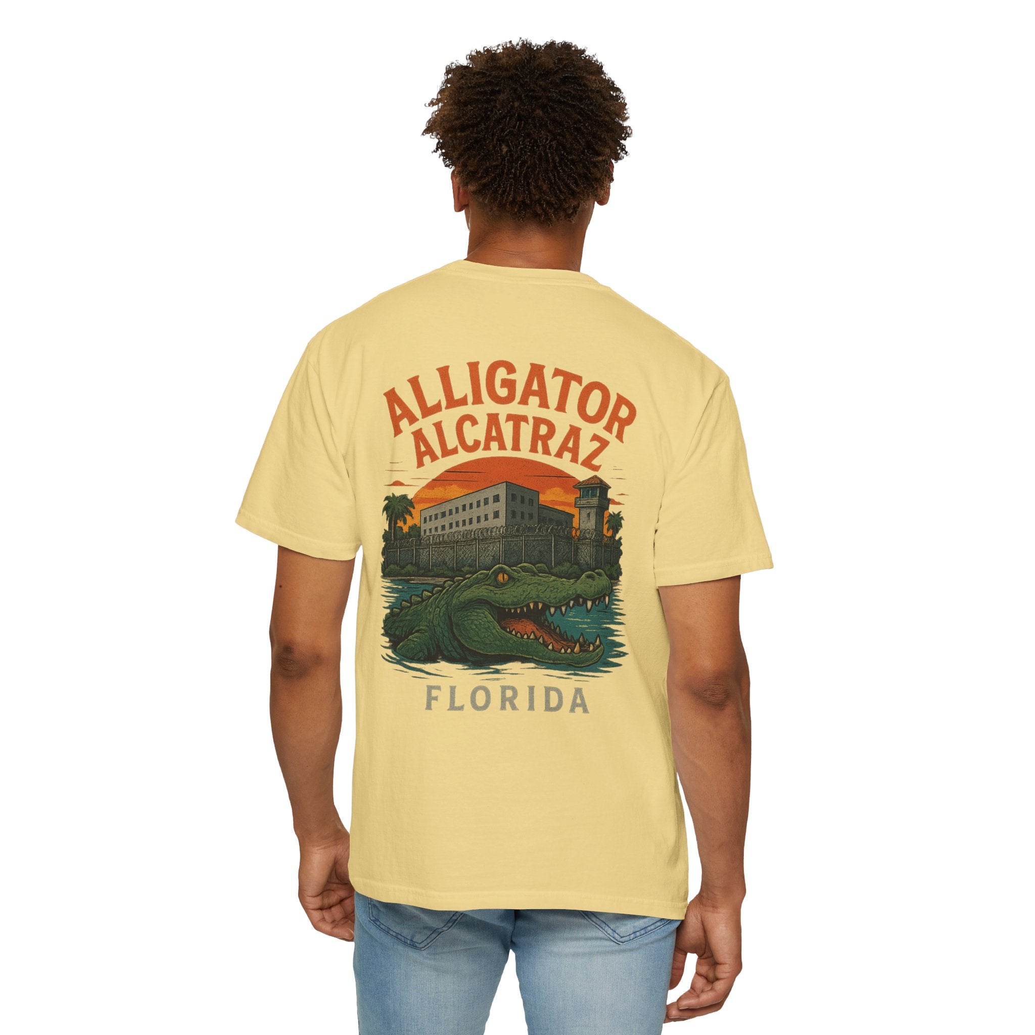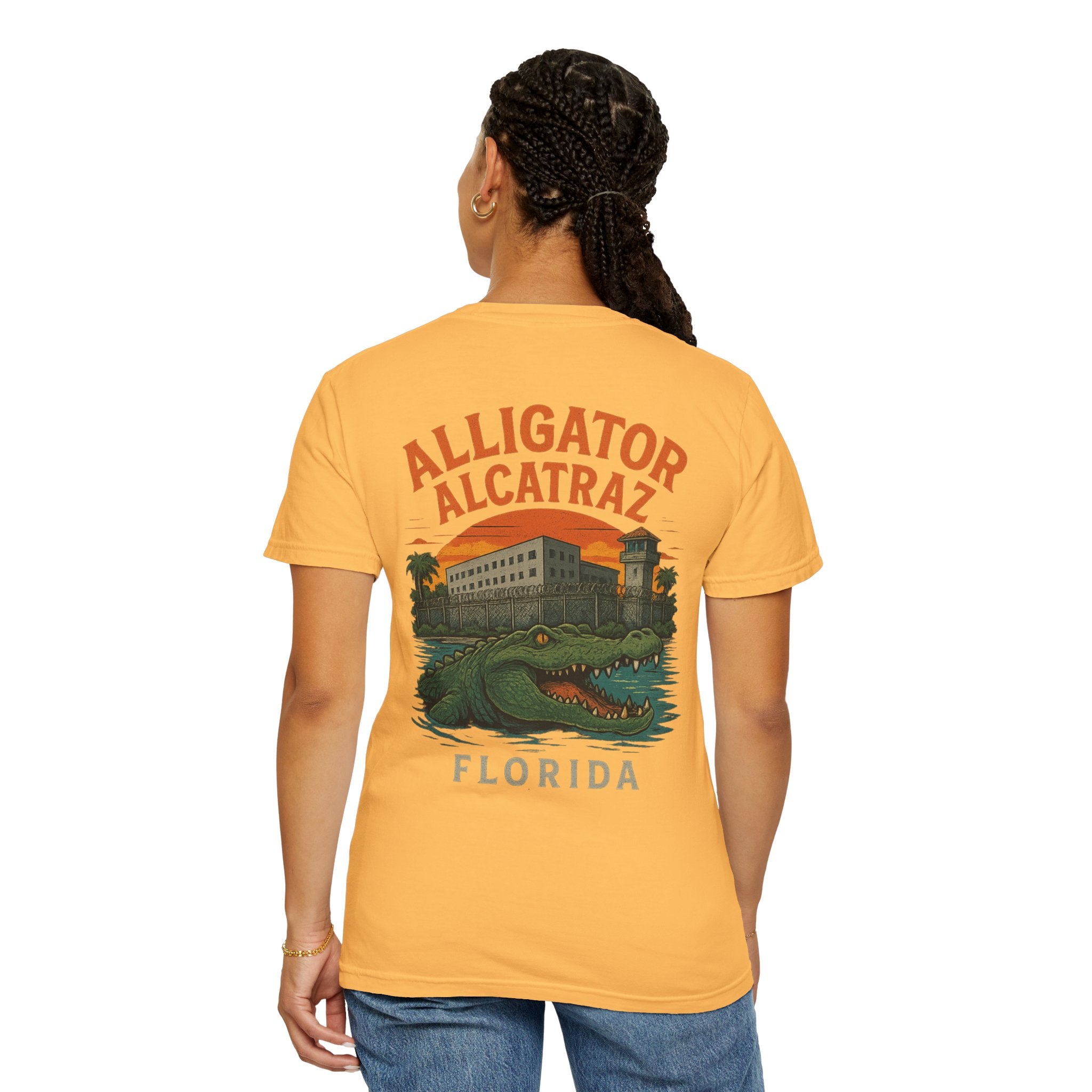 Vintage-style Alligator Alcatraz T-Shirt, perfect for Florida souvenir collectors. This comfortable unisex graphic top is ideal for casual wear, giving off a laid-back vibe. It fits well in a relaxed setting and is a great addition to any wardrobe. Suitable for adults, this tee is a must-have for Florida-themed holidays and vacations.