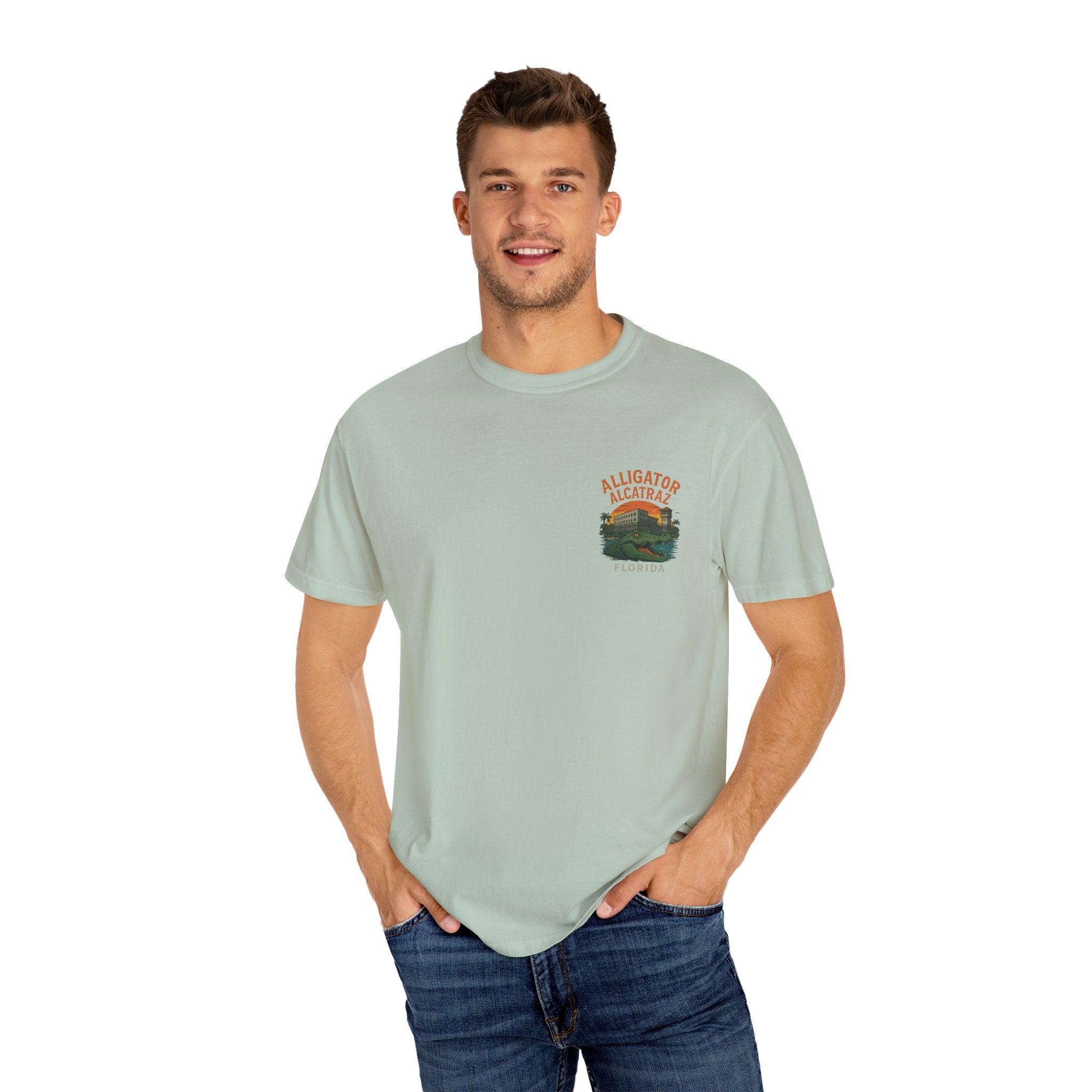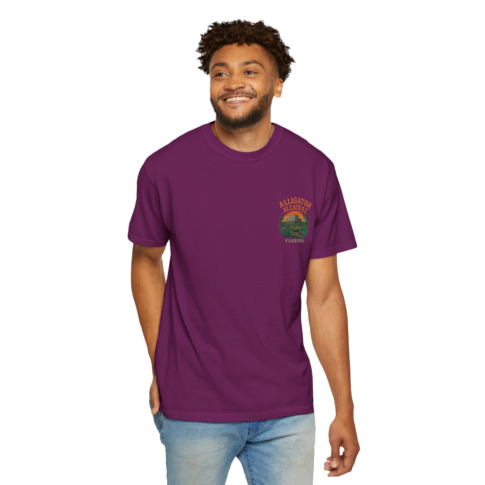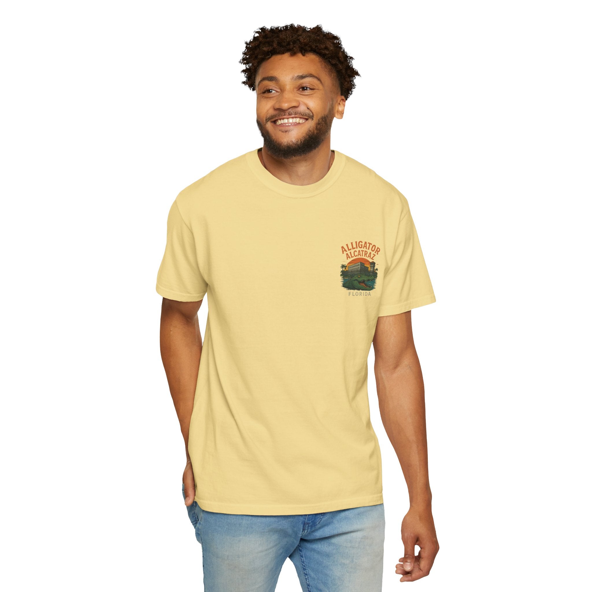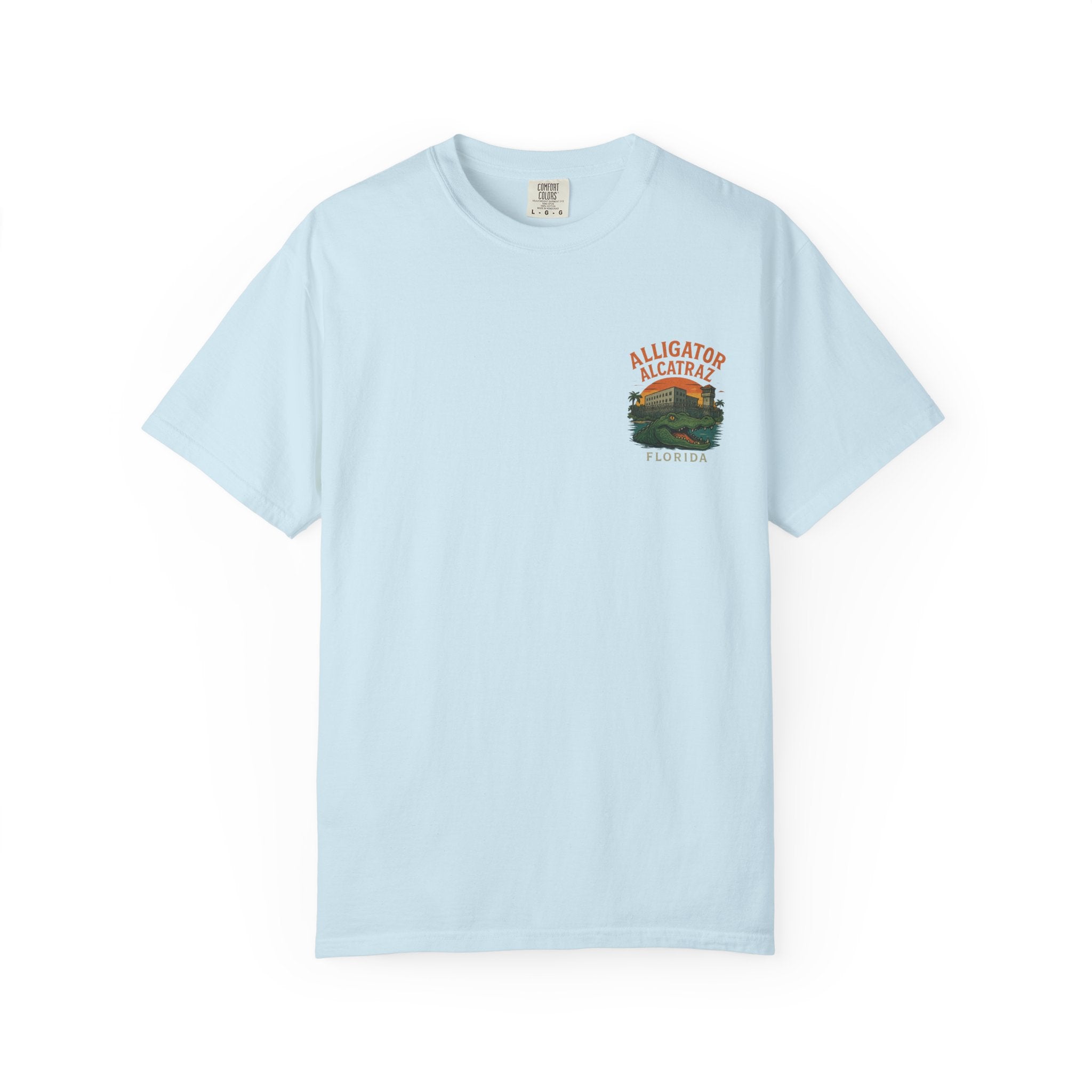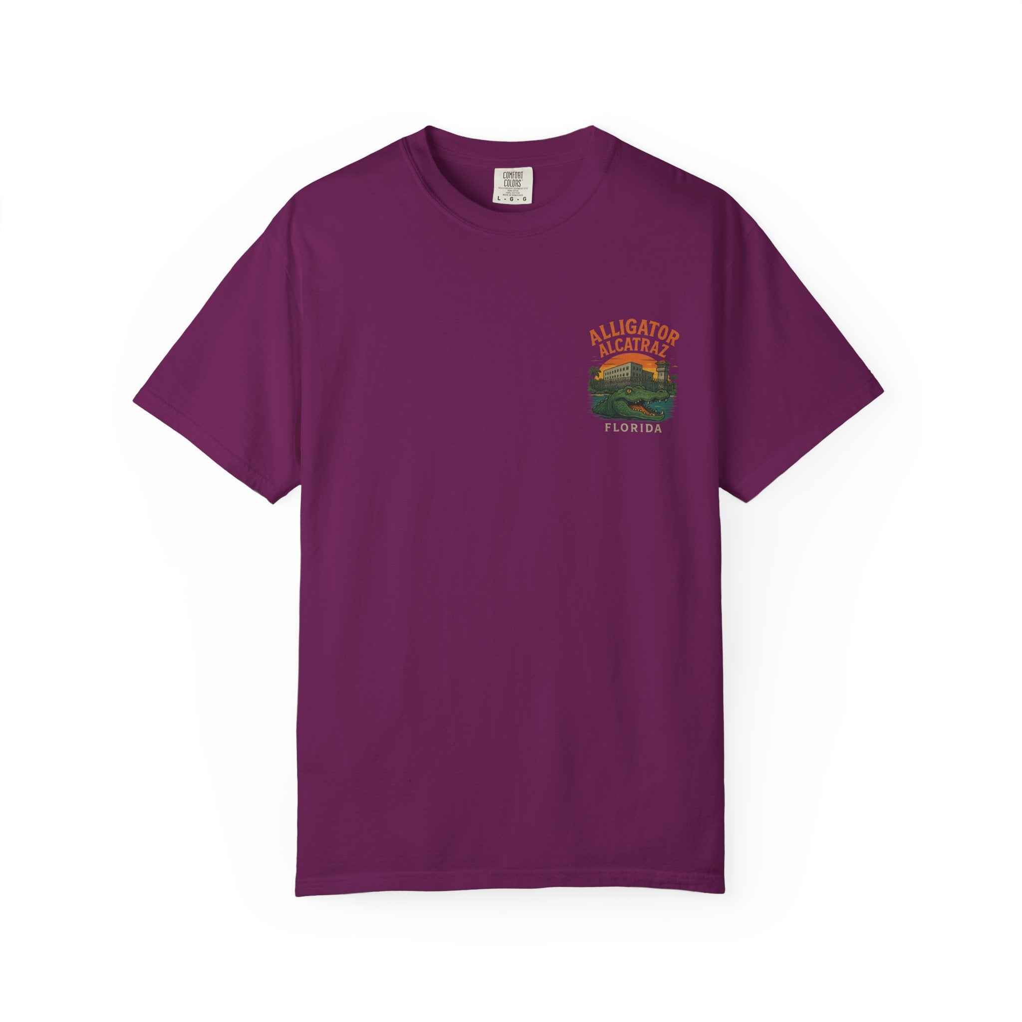 Vintage-style Alligator Alcatraz T-Shirt, perfect for Florida souvenir collectors. This comfortable unisex graphic top is ideal for casual wear, giving off a laid-back vibe. It fits well in a relaxed setting and is a great addition to any wardrobe. Suitable for adults, this tee is a must-have for Florida-themed holidays and vacations.