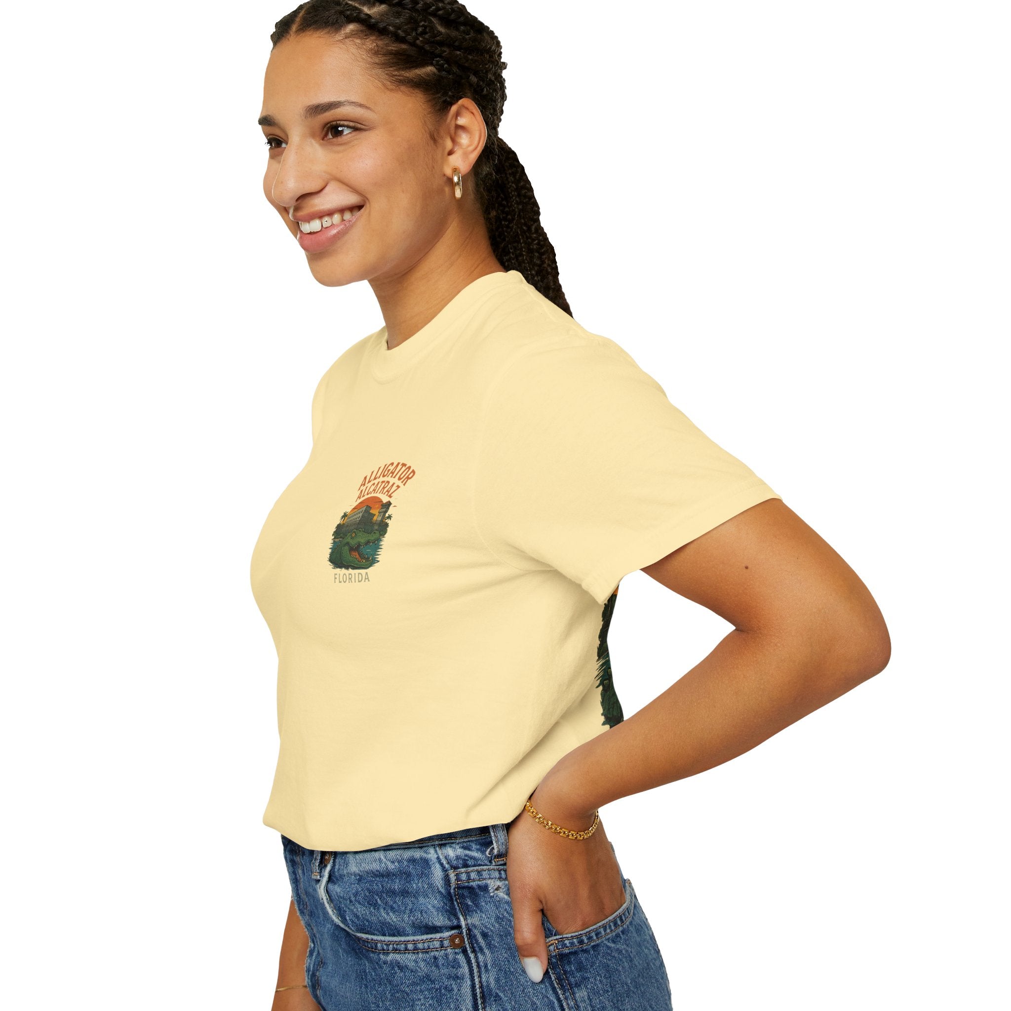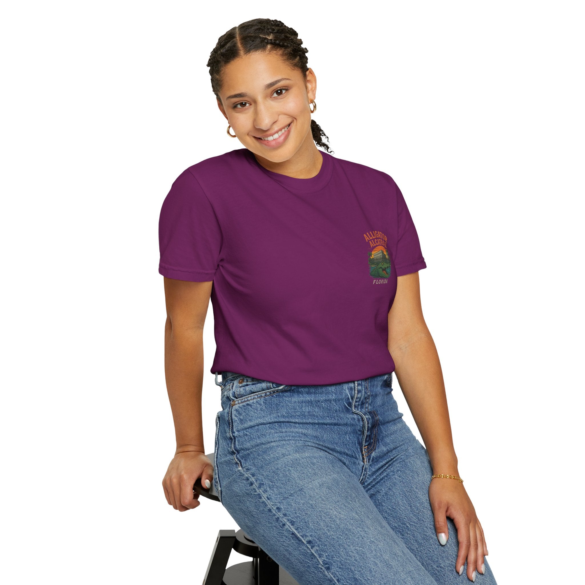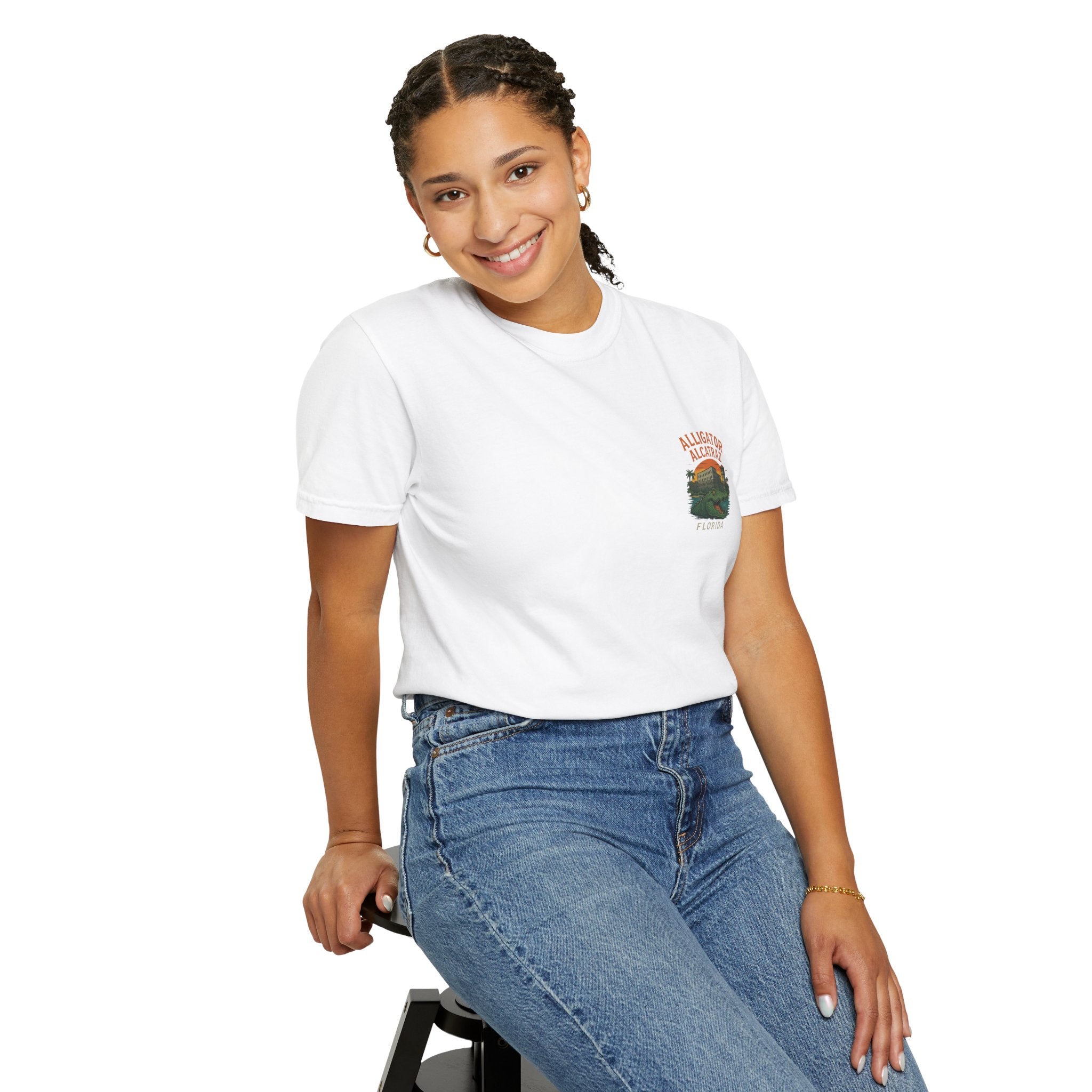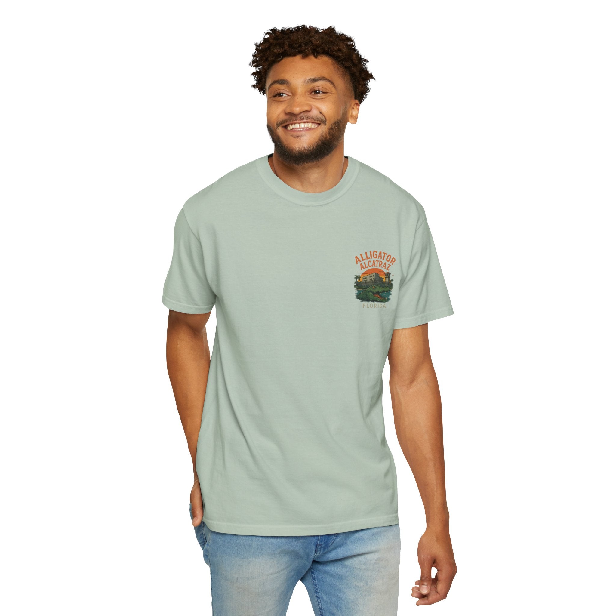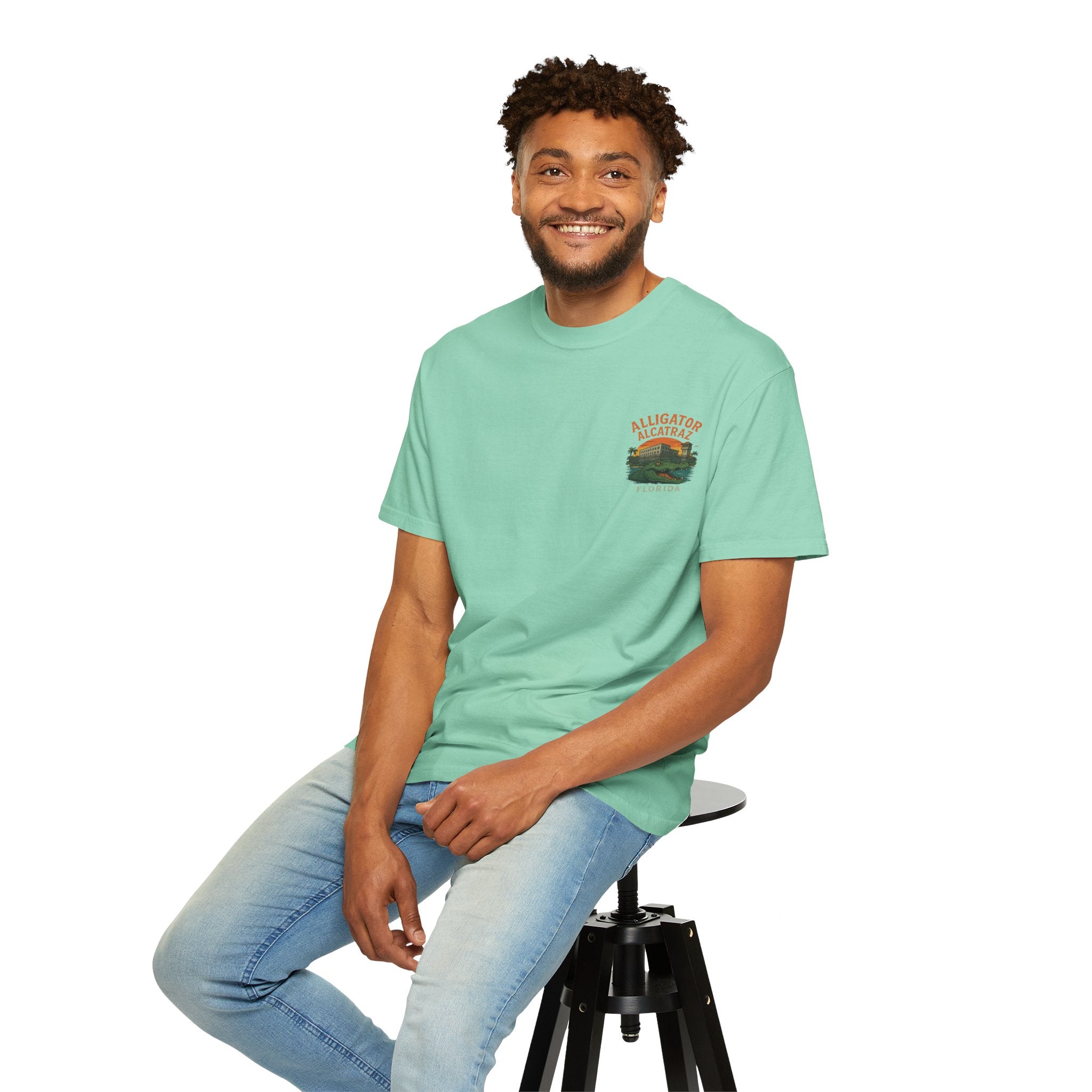 Vintage-style Alligator Alcatraz T-Shirt, perfect for Florida souvenir collectors. This comfortable unisex graphic top is ideal for casual wear, giving off a laid-back vibe. It fits well in a relaxed setting and is a great addition to any wardrobe. Suitable for adults, this tee is a must-have for Florida-themed holidays and vacations.