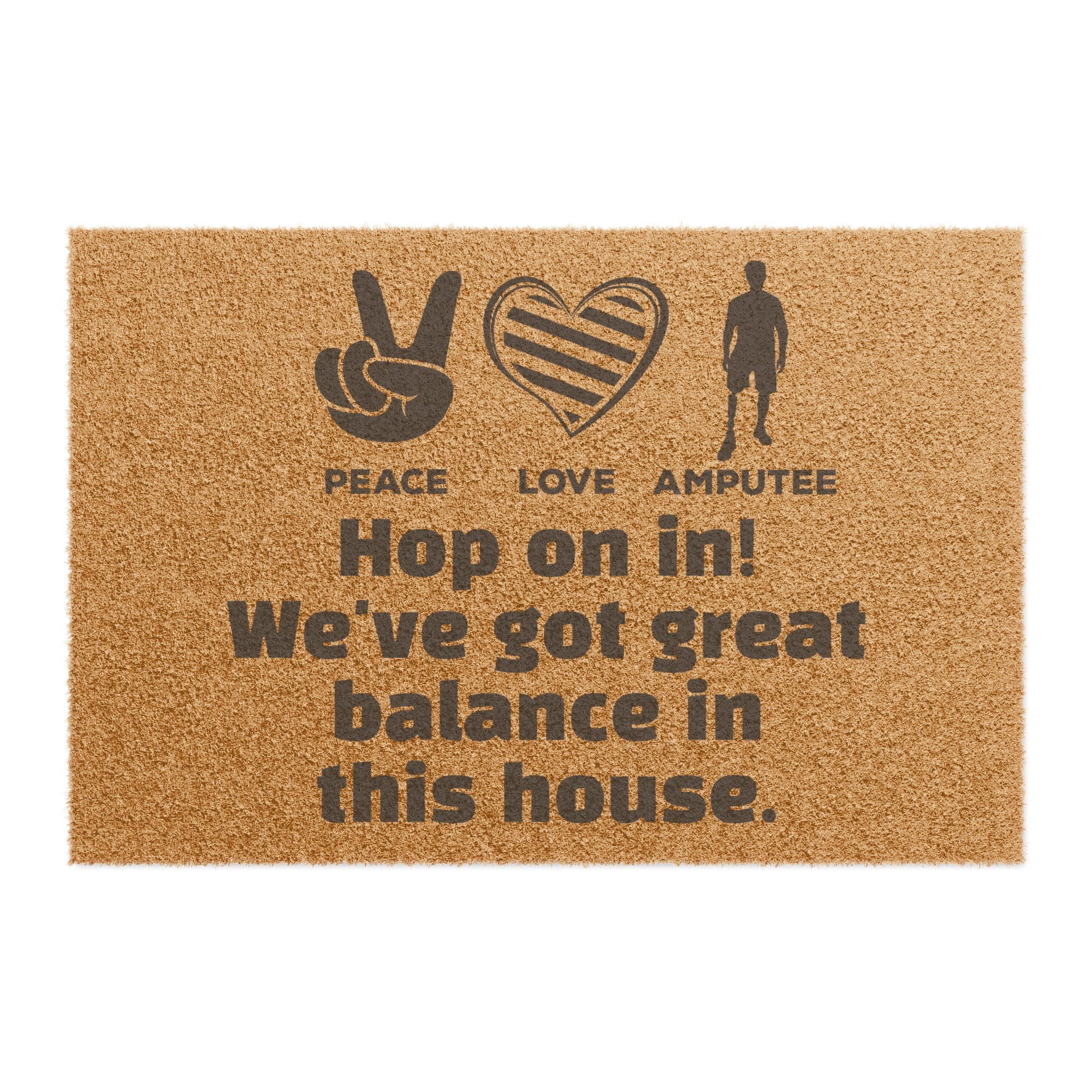 Amputee doormat, amputee awareness, limb awareness, amputee humor, leg amputee gift, unique doormat, disability gift, prosthetic gift, inspirational gift, motivational doormat, special needs gift, adaptive athlete gift, Amputation recovery, resilience gift, strength doormat. Meet the perfect welcoming doormat for amputees coming or going. Each custom mat comes in a 24" x 16" size and is made with Grade A tufted coir coconut fiber, making it perfect for outdoor use. All mats feature black vinyl backing for increased stability. .: One size: 24" × 16" (61cm x 40.6cm) .: Material: Grade A tufted coir coconut fiber .: Black vinyl backing .: Mainly for outdoor use .: Assembled in the USA from globally sourced parts
