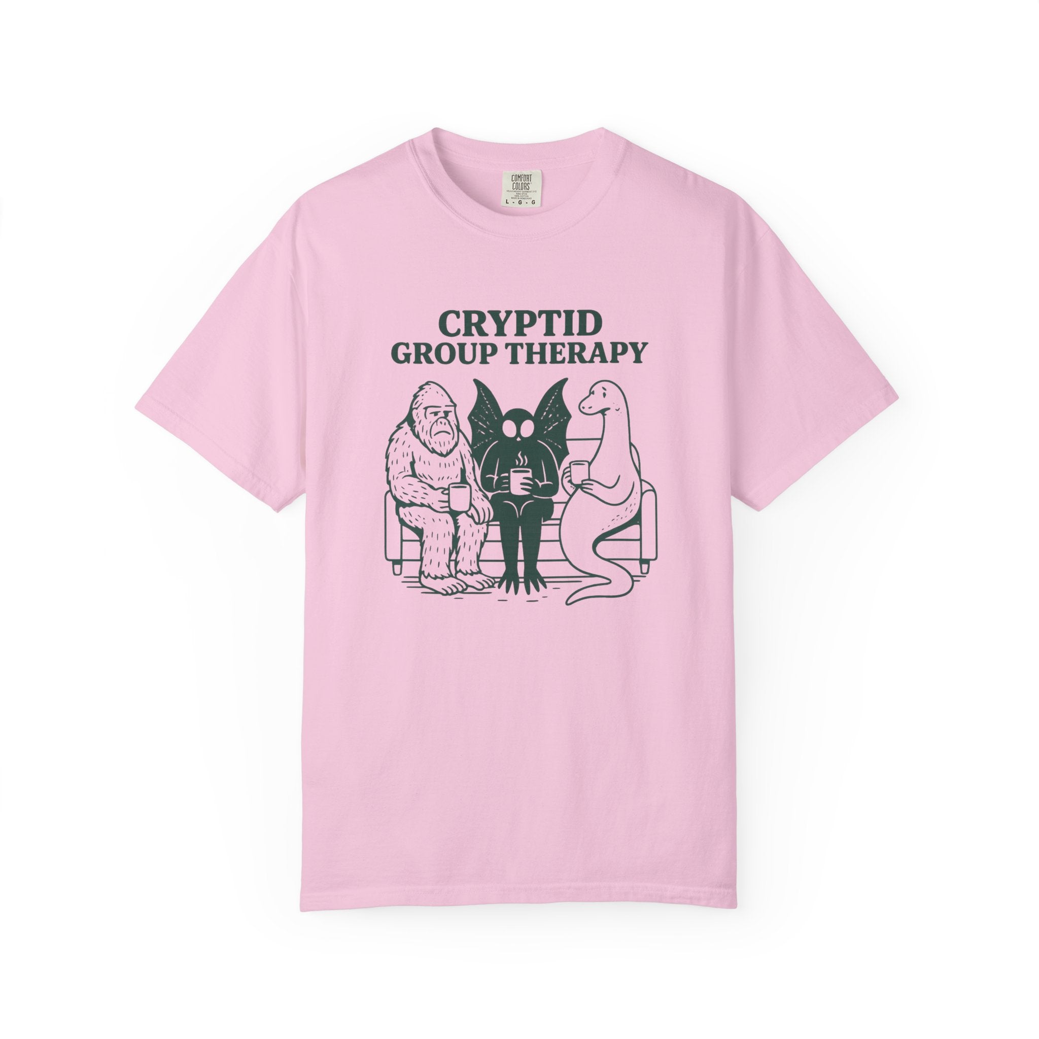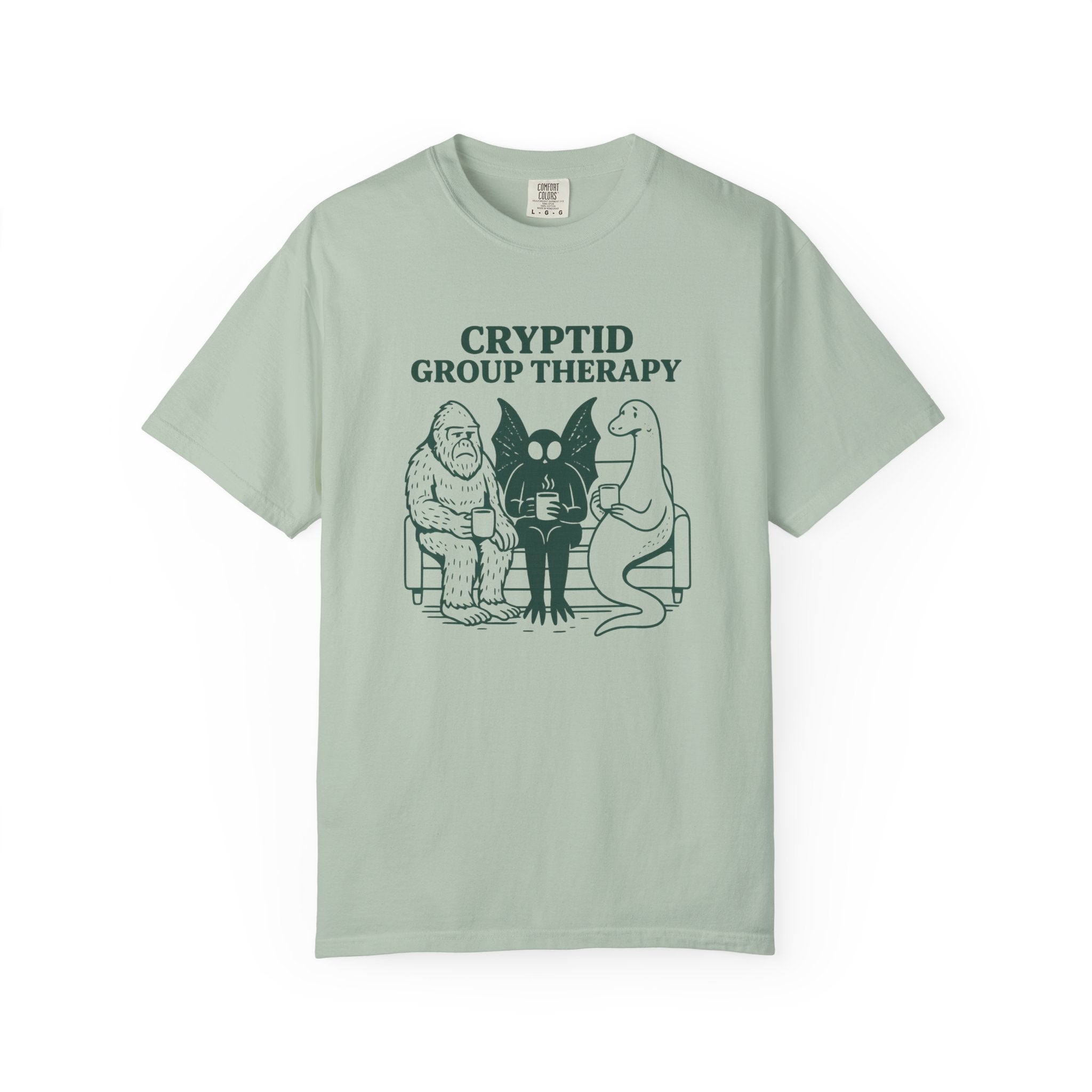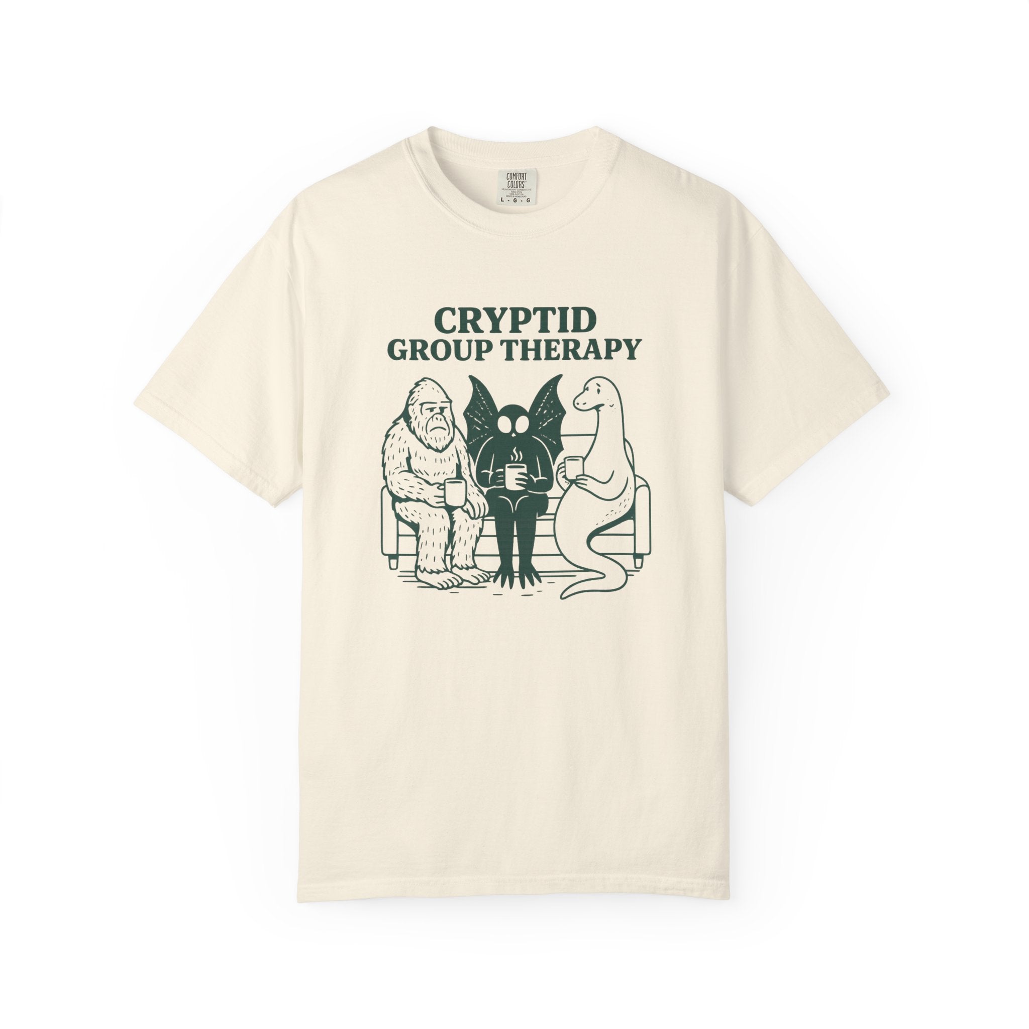 Cryptid Group Therapy Bigfoot, Mothman and Loch Nessie Unisex T-Shirt, perfect for cryptid lovers. This funny graphic tee offers quirky casual wear with cool humor, suitable for both casual and semi-formmal settings. Ideal as a gift for those who love cryptids like Bigfoot, Mothman, and Loch Nessie.