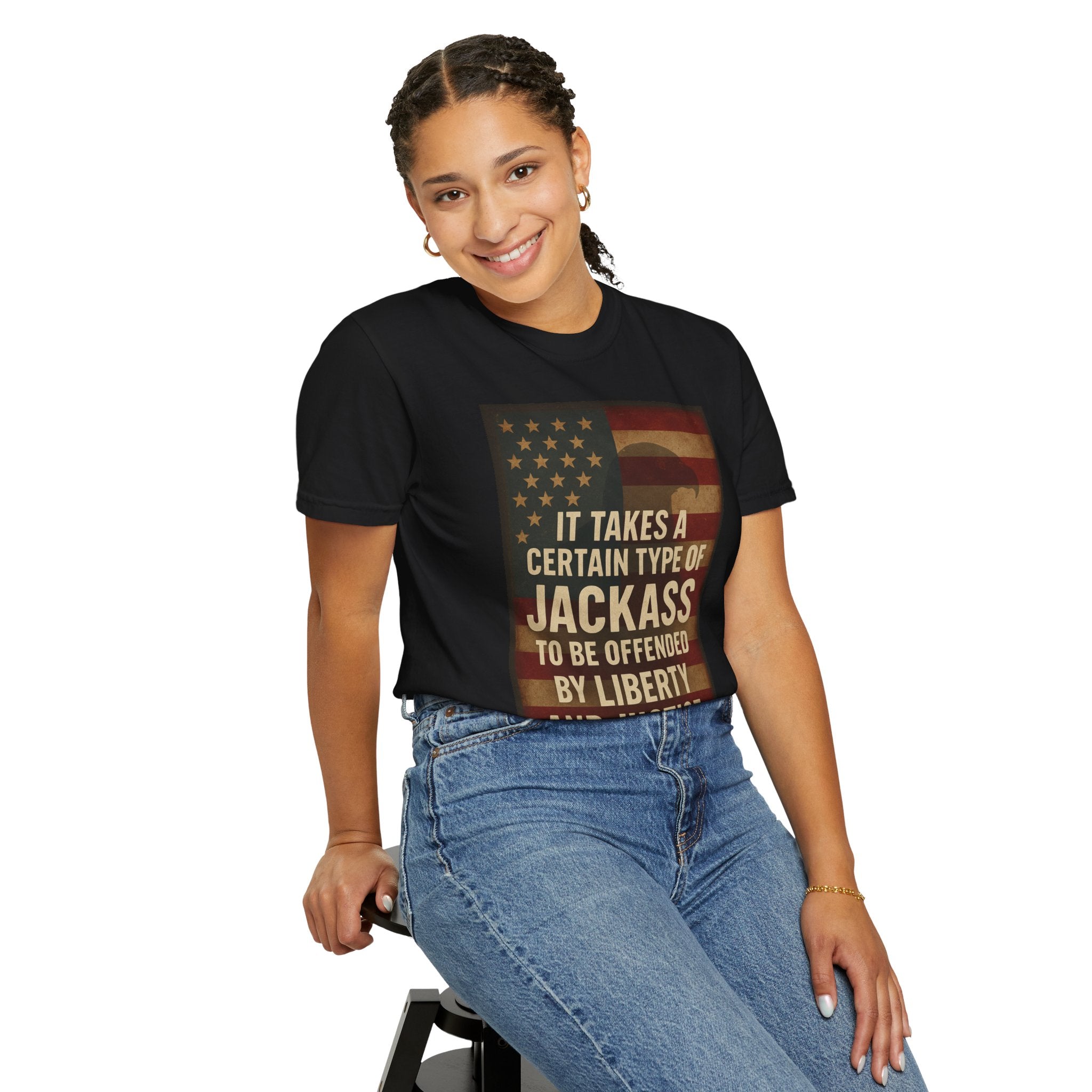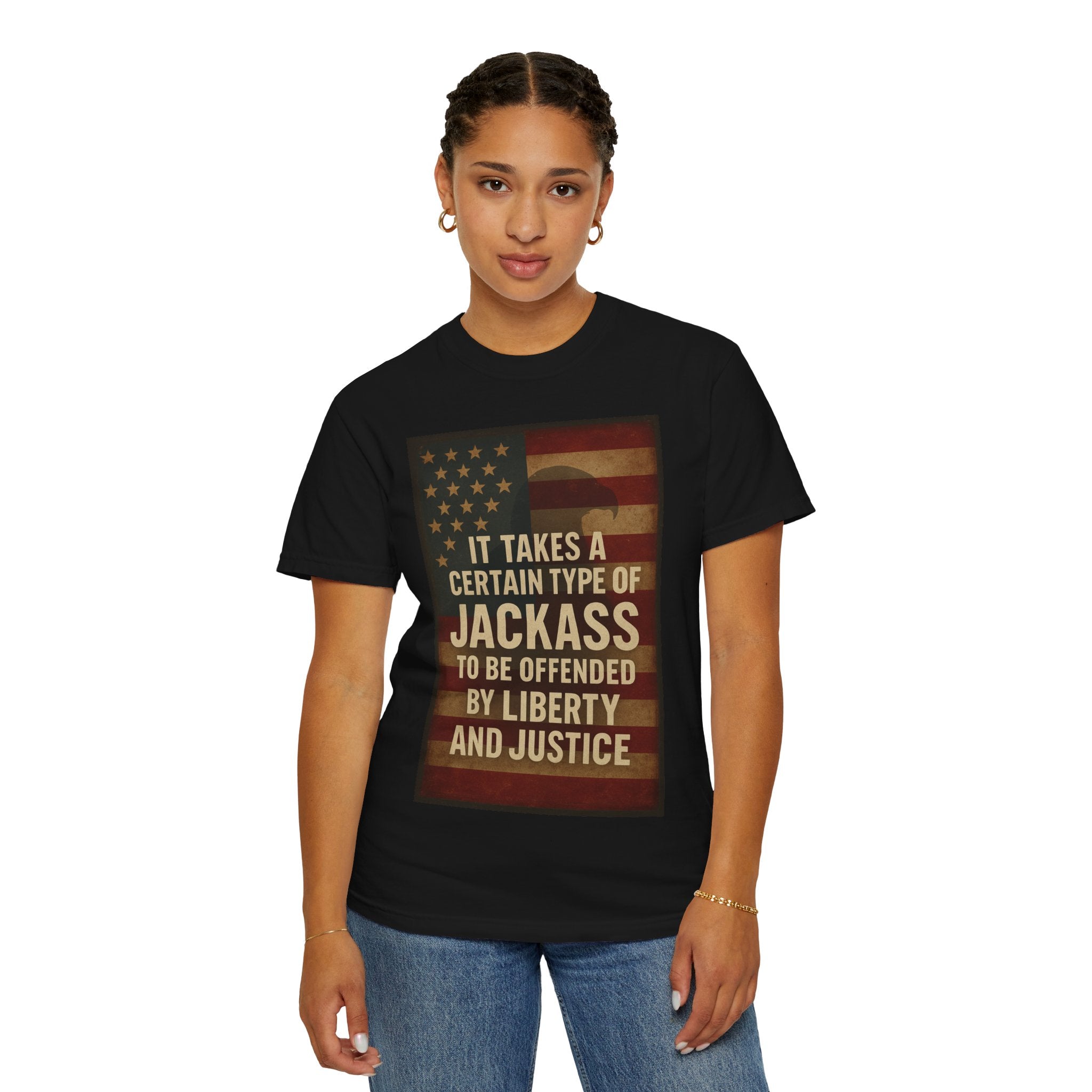 This garment-dyed tee carries a worn-in, Americana attitude. The front print layers a distressed U.S. flag behind bold text that reads with unapologetic humor, giving the shirt a vintage rally-poster feel. Soft, pre-shrunk ring-spun cotton and the after-construction dye create a lived-in hand that breaks in with you. Wear it to spark conversation at backyard barbecues, local meetups, or weekend errands — it sits relaxed, moves easy, and keeps its character wash after wash.