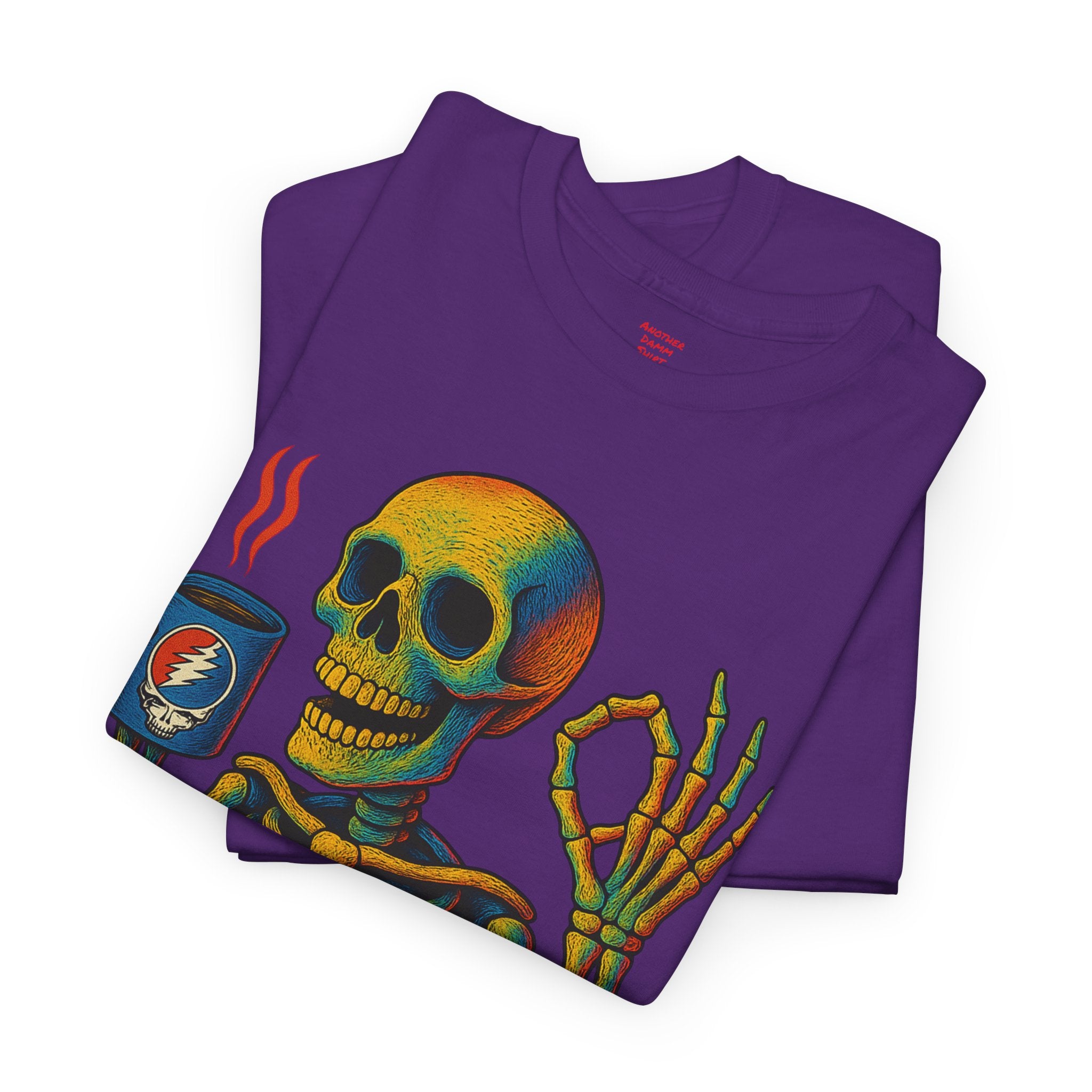 A Grateful Dead inspired Tee featuring a Sarcastic Skeleton holding a Deadhead Mug with a Funny Quote. This Tee exudes a laid-back and humorous vibe, perfect for music lovers and fans of the iconic band. It's ideal for casual wear, concerts, festivals, and everyday use, adding a touch of fun and personality to any outfit.