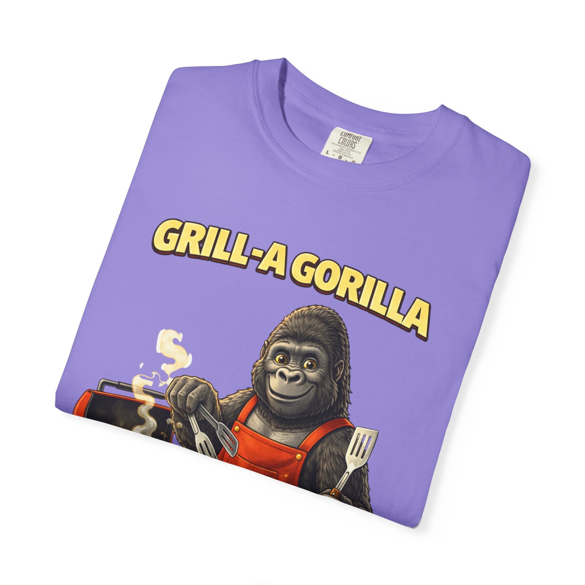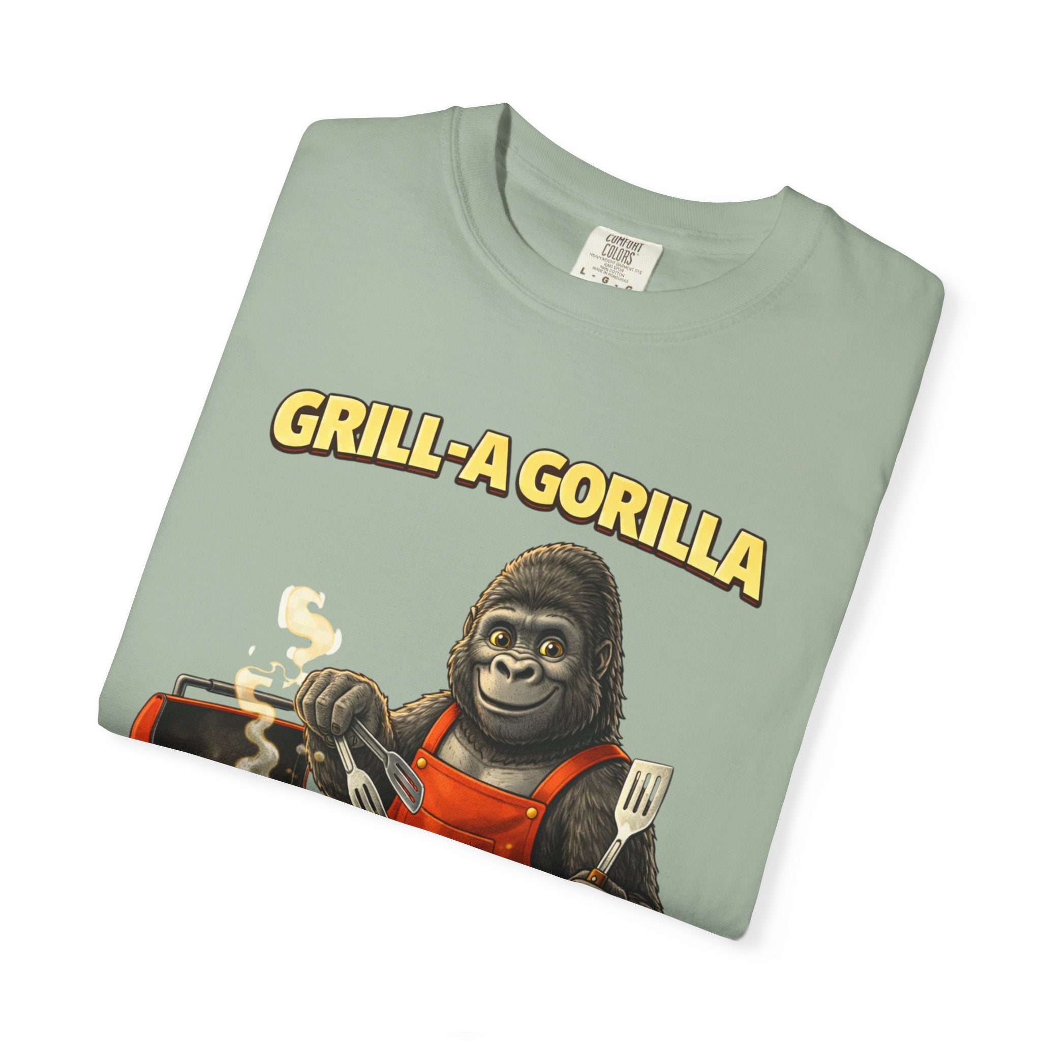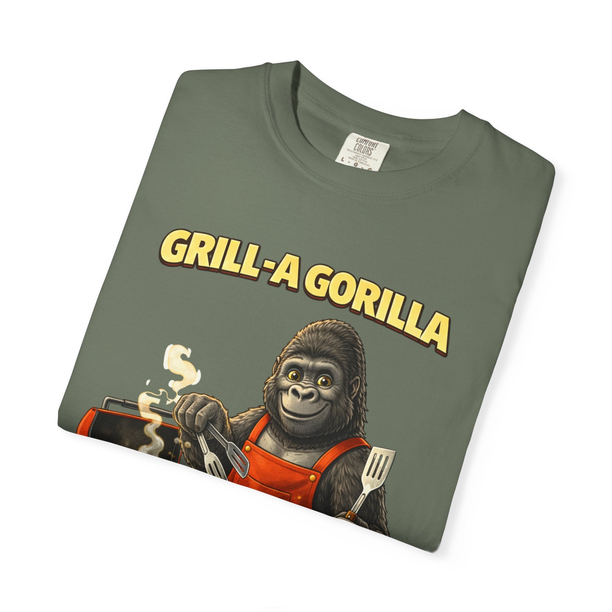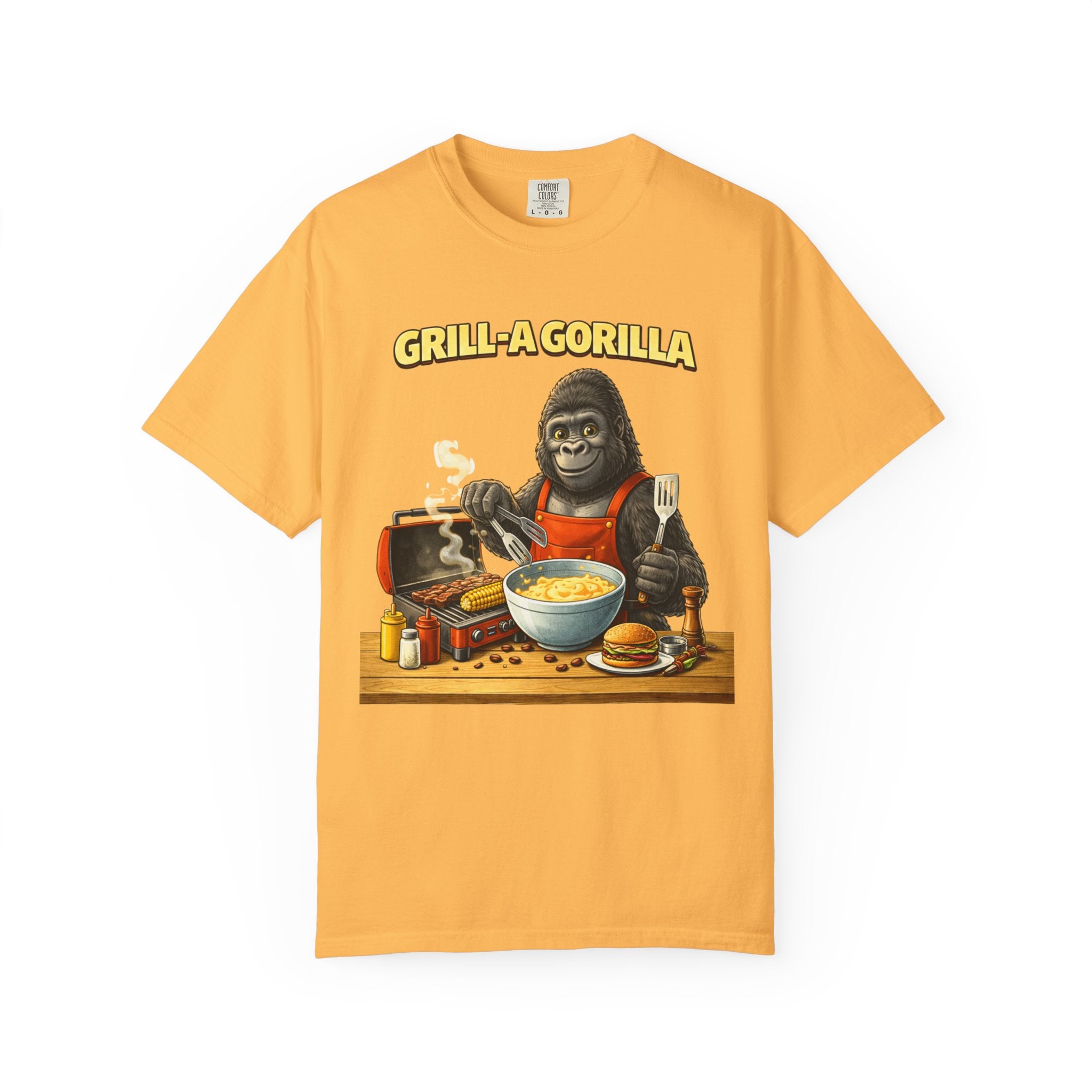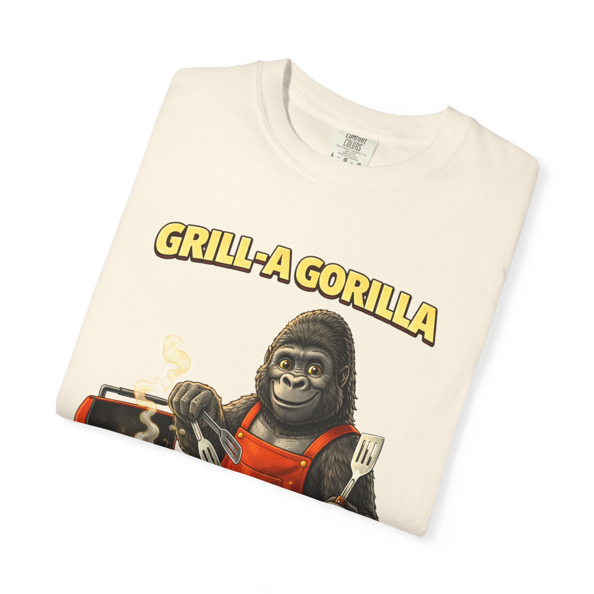 This heavyweight cotton tee brings the Grill-A-Gorilla illustration to life with a worn-in, retro BBQ vibe. Imagine a lazy summer afternoon where smoke curls from the grate and a confident ape tends the coals — that scene lives on the chest of this shirt. The garment-dyed finish gives a lived-in softness and slightly faded tone that pairs with denim, work aprons, or a weathered cap. It sits relaxed through the shoulders and torso so you can move freely while manning the grill or leaning back with a cold drink. The vintage graphic reads like a story: hands-on, rowdy, and a little mischievous — it’s the kind of shirt a home pitmaster or backyard crew reaches for when friends arrive and the fire is lit. The sturdy construction and midweight fabric mean it stands up to seasons of cookouts and washes without losing character.
