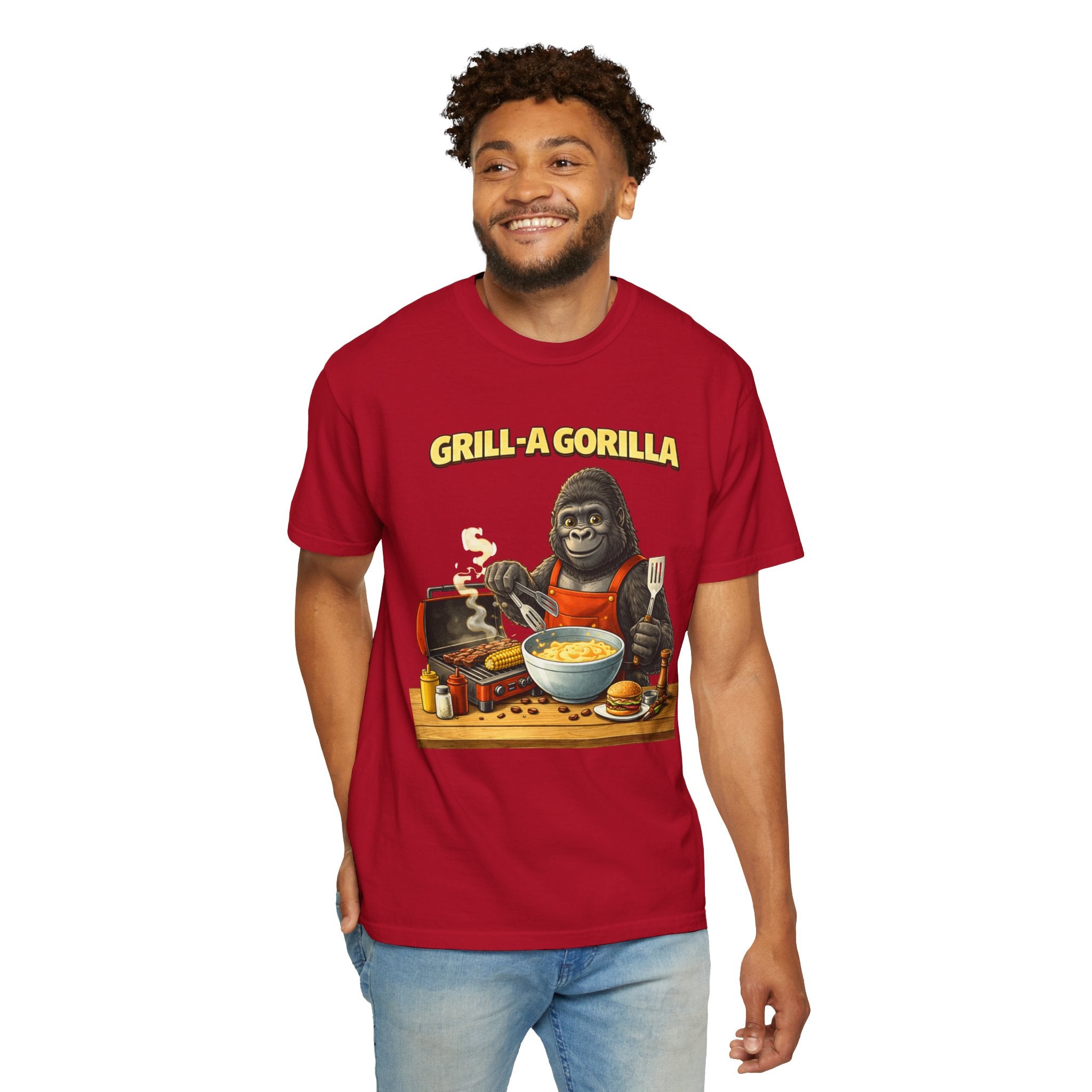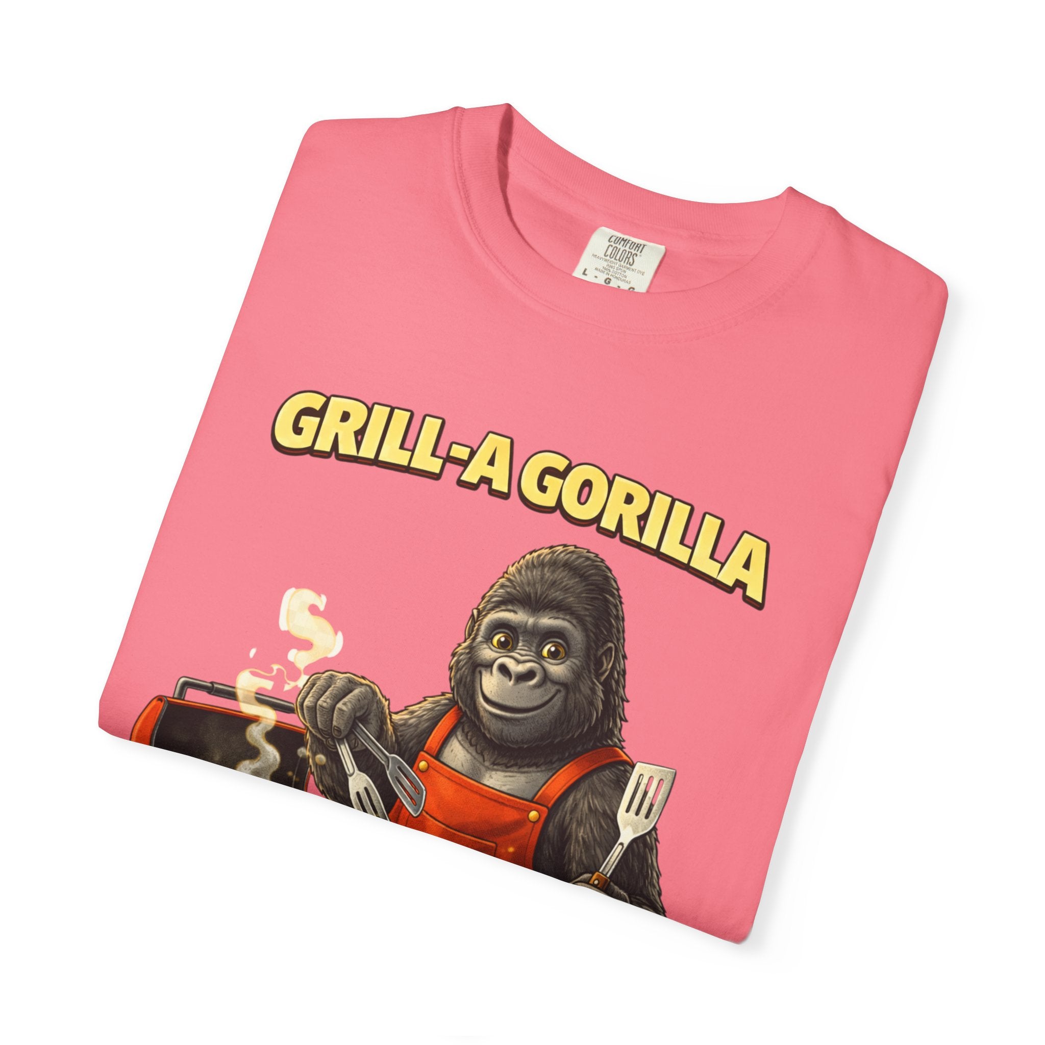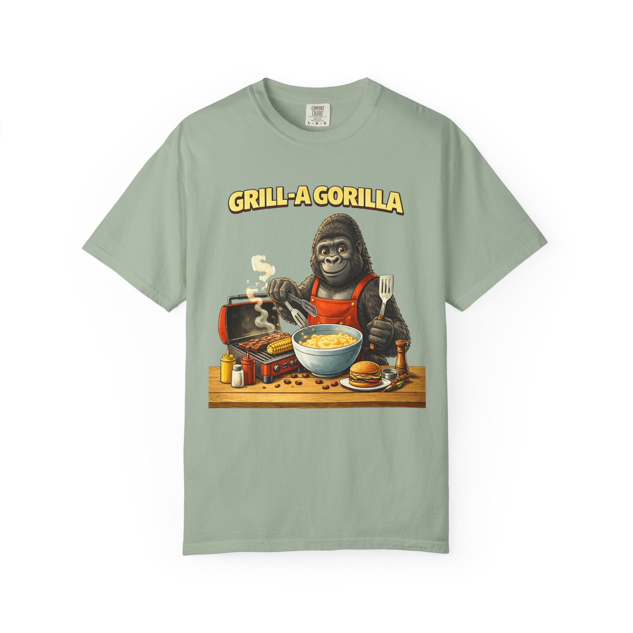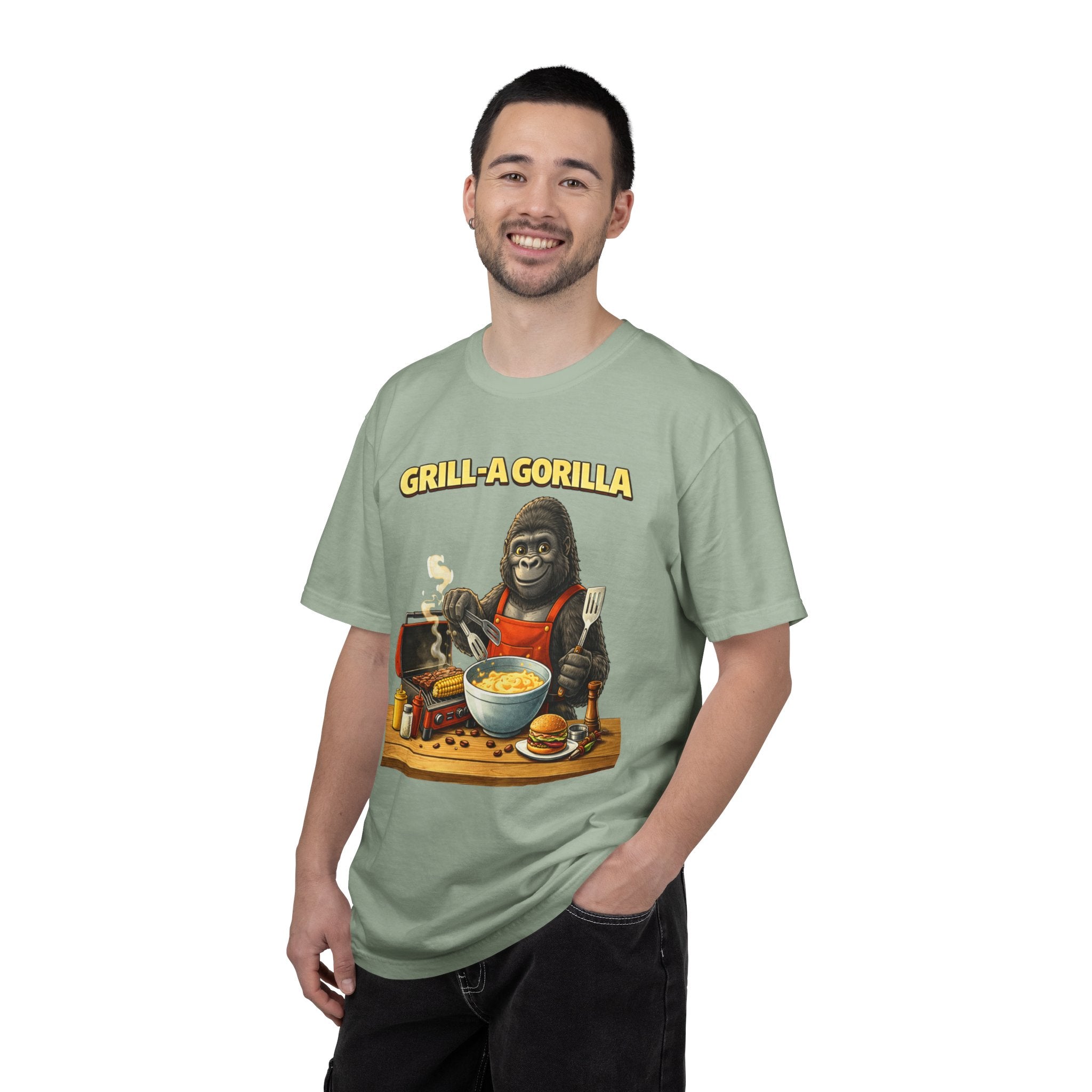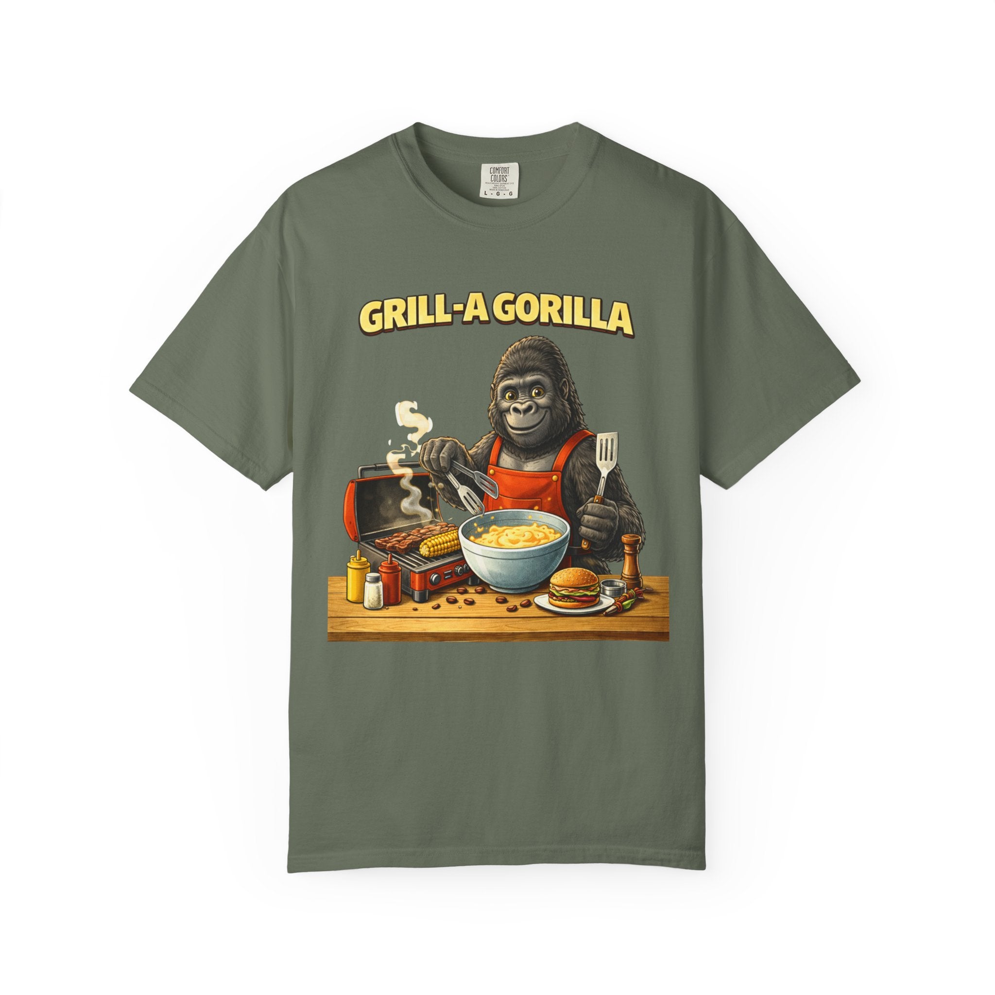 This heavyweight cotton tee brings the Grill-A-Gorilla illustration to life with a worn-in, retro BBQ vibe. Imagine a lazy summer afternoon where smoke curls from the grate and a confident ape tends the coals — that scene lives on the chest of this shirt. The garment-dyed finish gives a lived-in softness and slightly faded tone that pairs with denim, work aprons, or a weathered cap. It sits relaxed through the shoulders and torso so you can move freely while manning the grill or leaning back with a cold drink. The vintage graphic reads like a story: hands-on, rowdy, and a little mischievous — it’s the kind of shirt a home pitmaster or backyard crew reaches for when friends arrive and the fire is lit. The sturdy construction and midweight fabric mean it stands up to seasons of cookouts and washes without losing character.