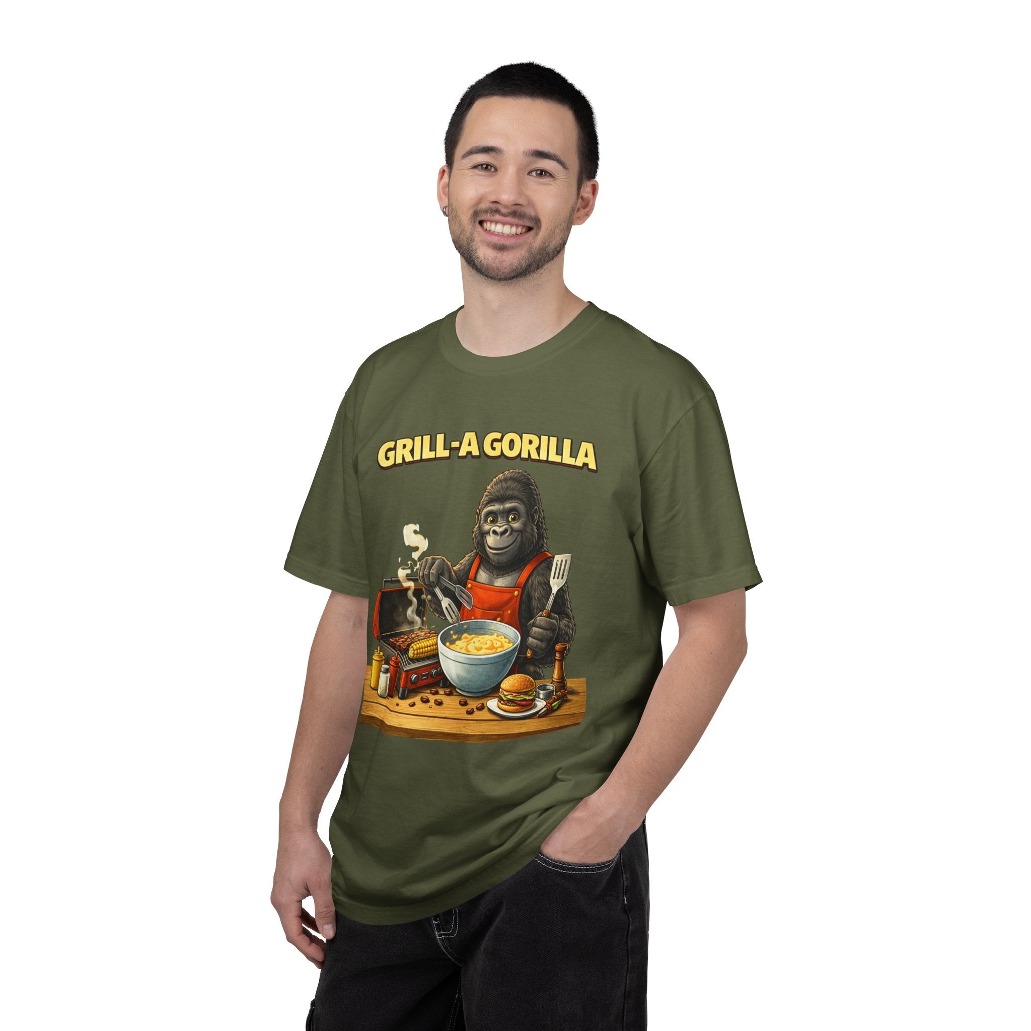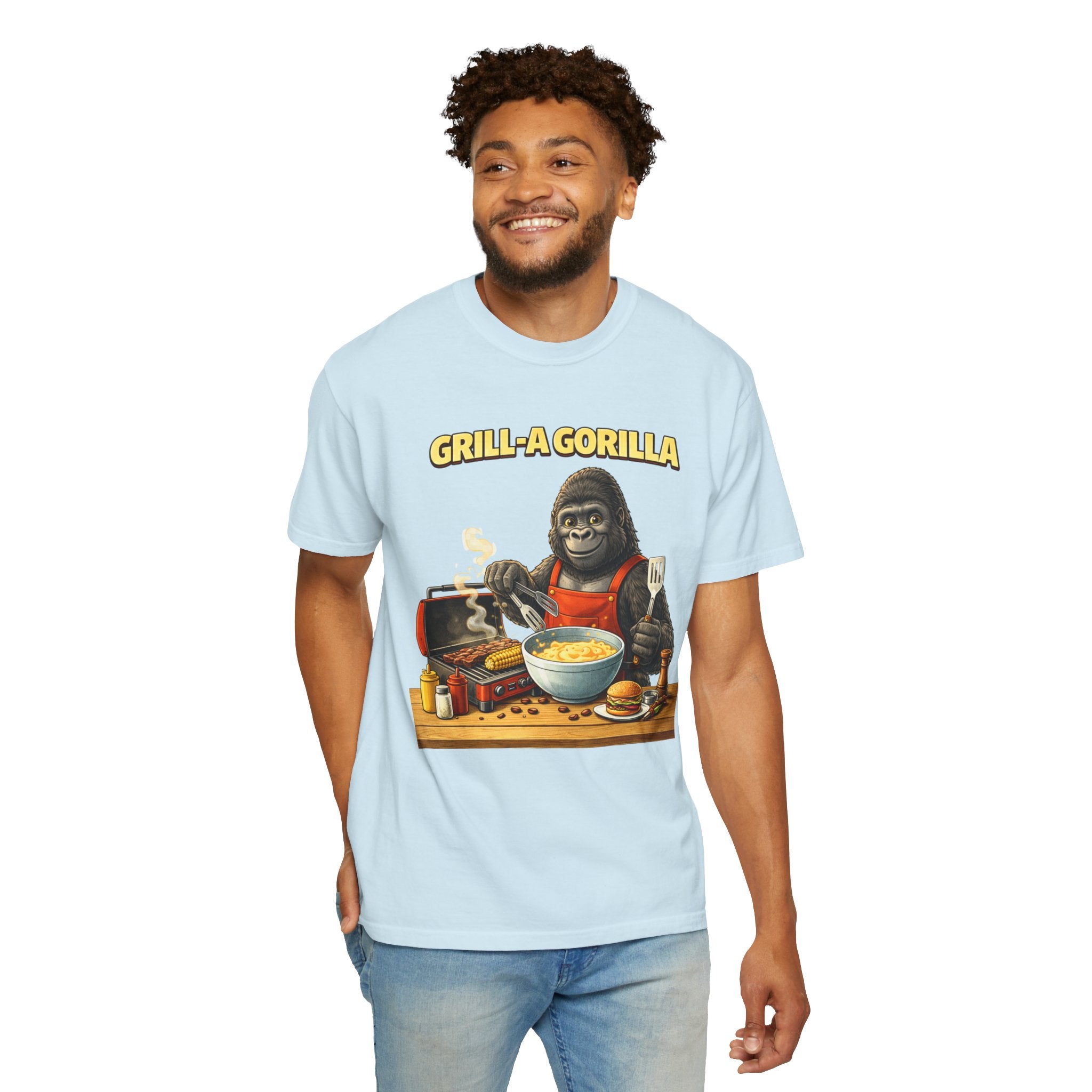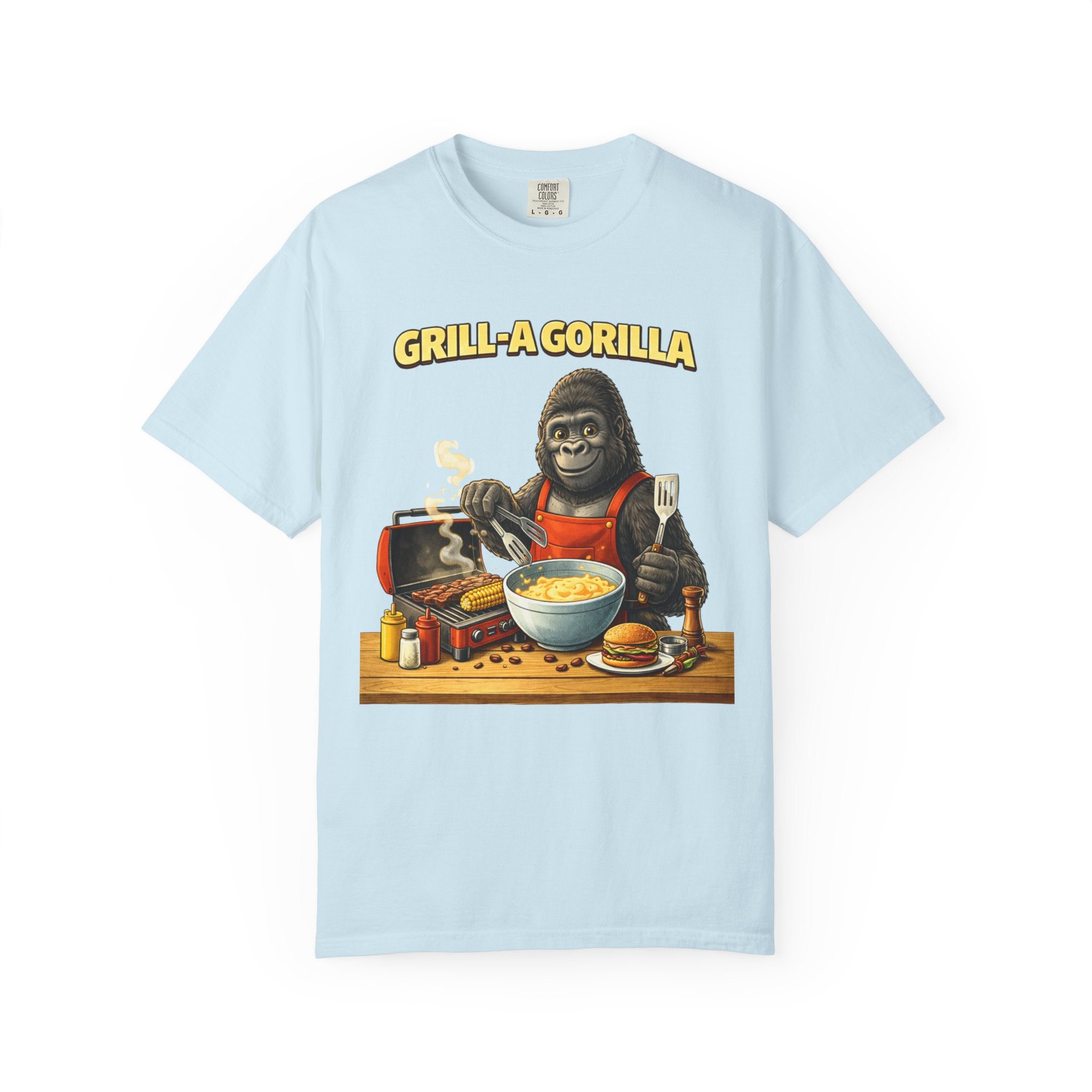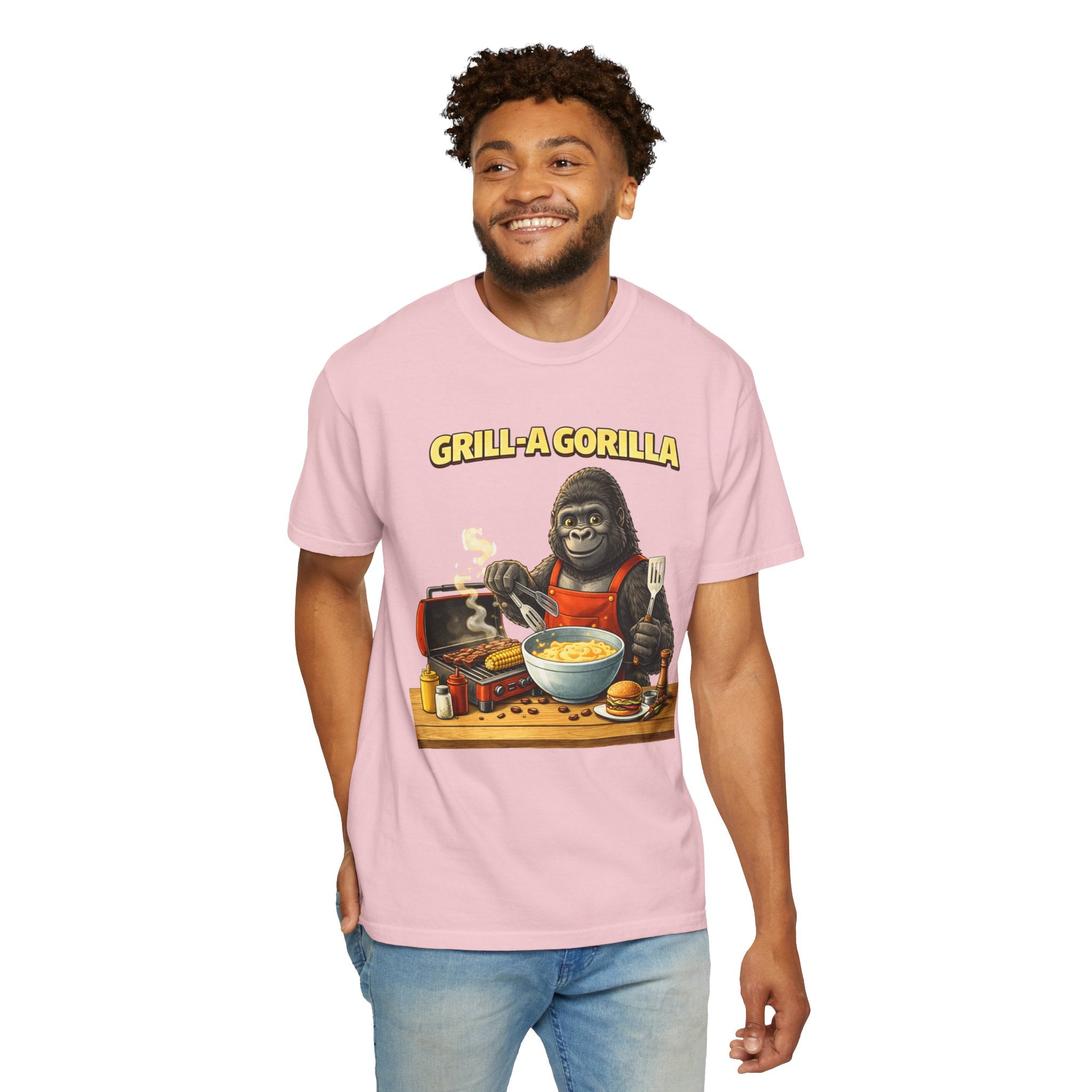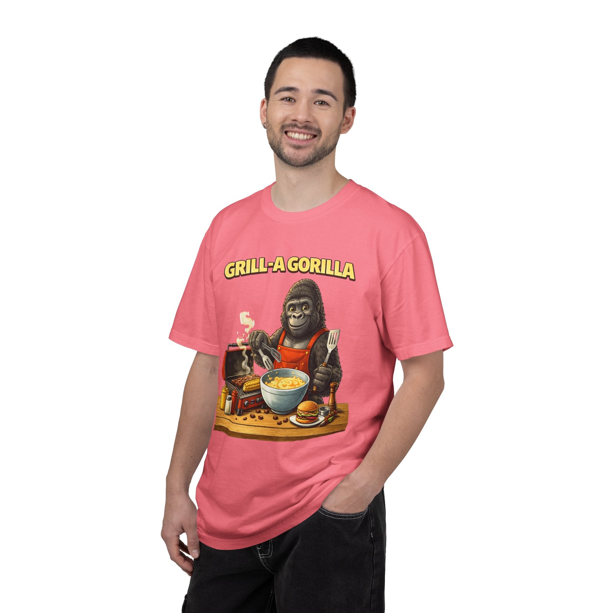 This heavyweight cotton tee brings the Grill-A-Gorilla illustration to life with a worn-in, retro BBQ vibe. Imagine a lazy summer afternoon where smoke curls from the grate and a confident ape tends the coals — that scene lives on the chest of this shirt. The garment-dyed finish gives a lived-in softness and slightly faded tone that pairs with denim, work aprons, or a weathered cap. It sits relaxed through the shoulders and torso so you can move freely while manning the grill or leaning back with a cold drink. The vintage graphic reads like a story: hands-on, rowdy, and a little mischievous — it’s the kind of shirt a home pitmaster or backyard crew reaches for when friends arrive and the fire is lit. The sturdy construction and midweight fabric mean it stands up to seasons of cookouts and washes without losing character.