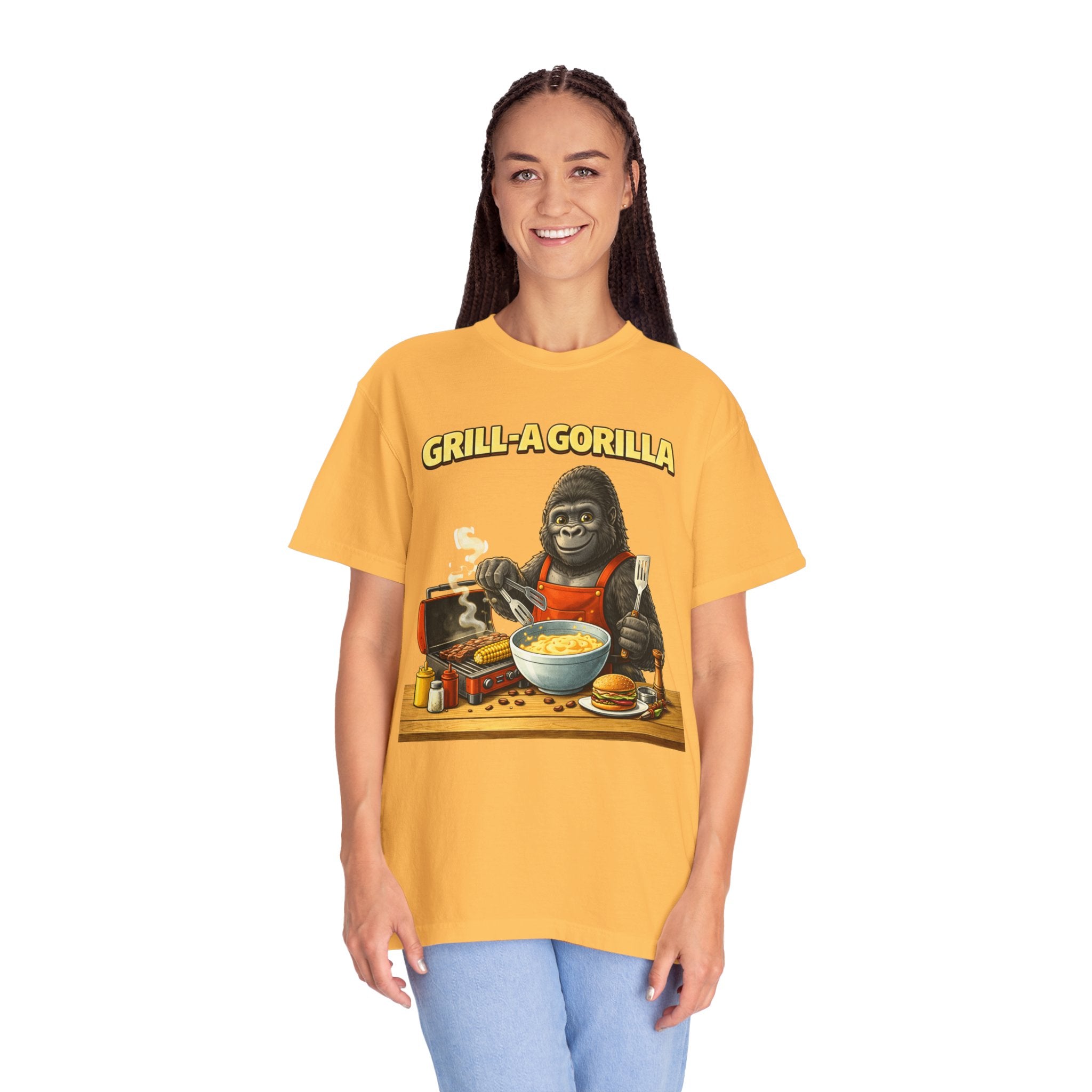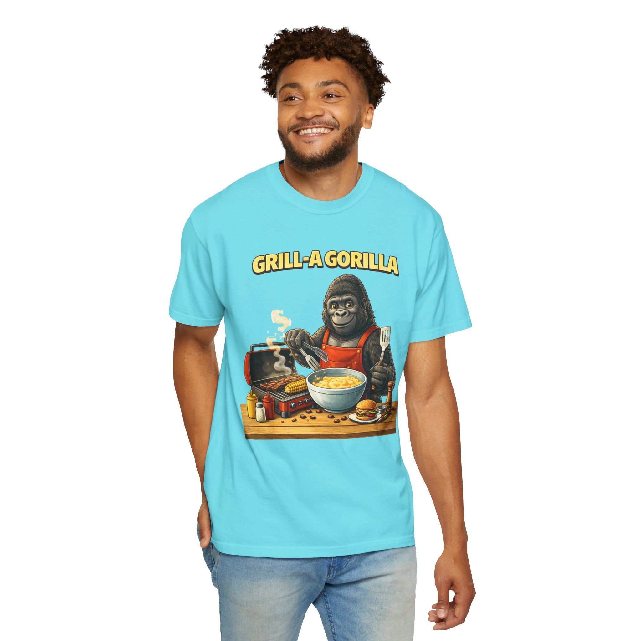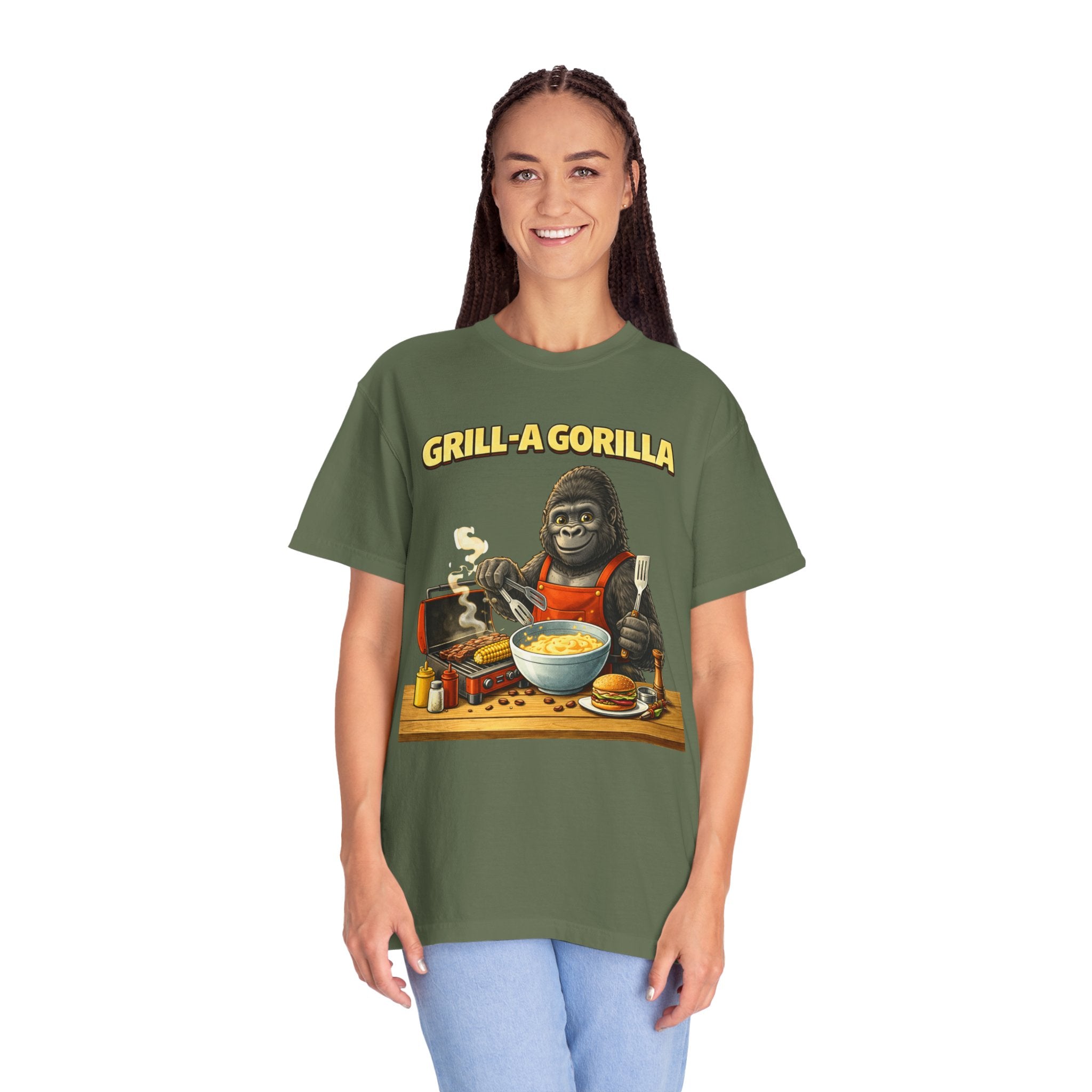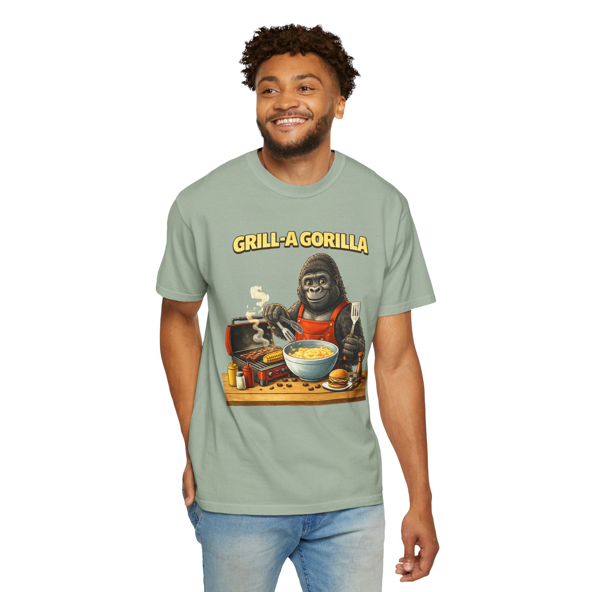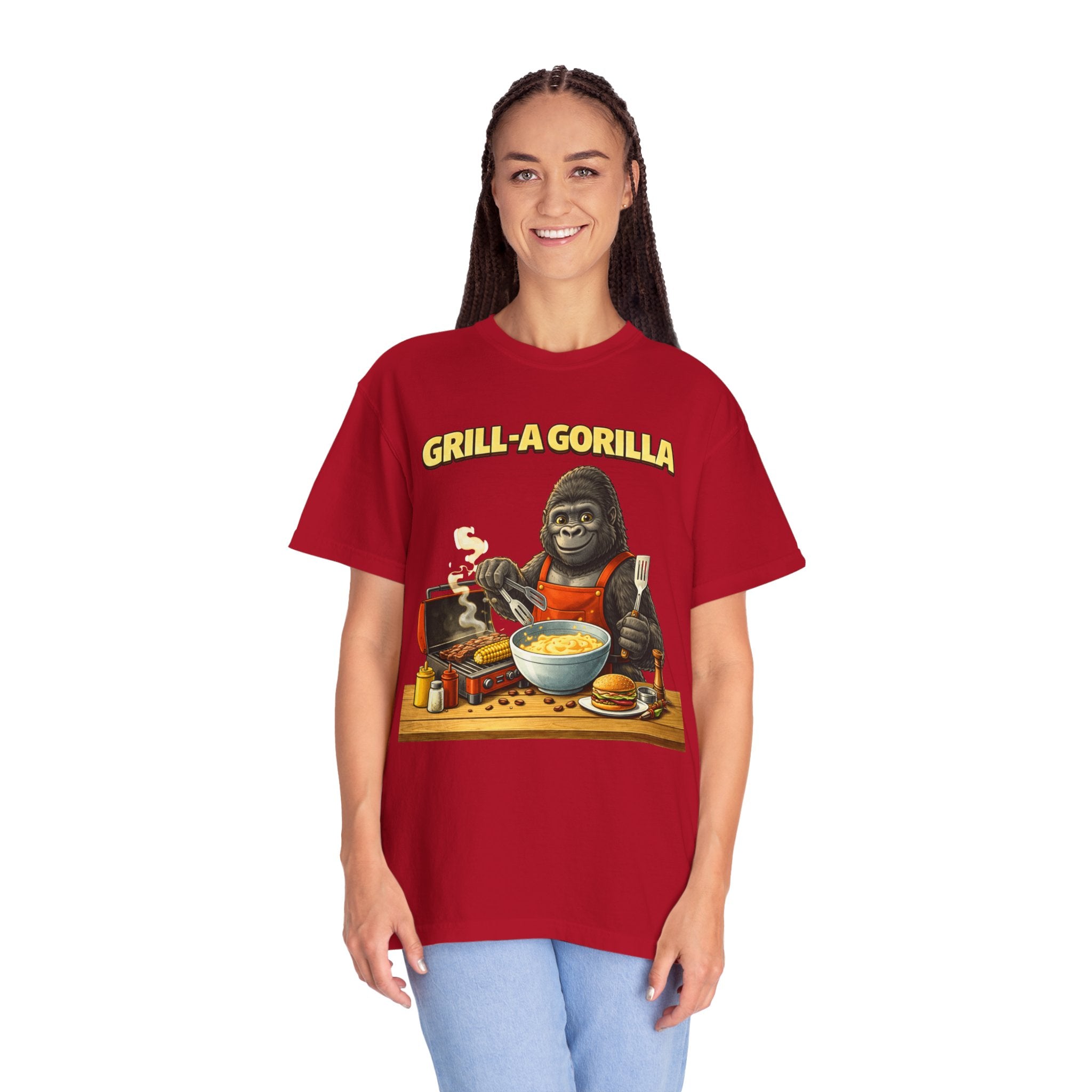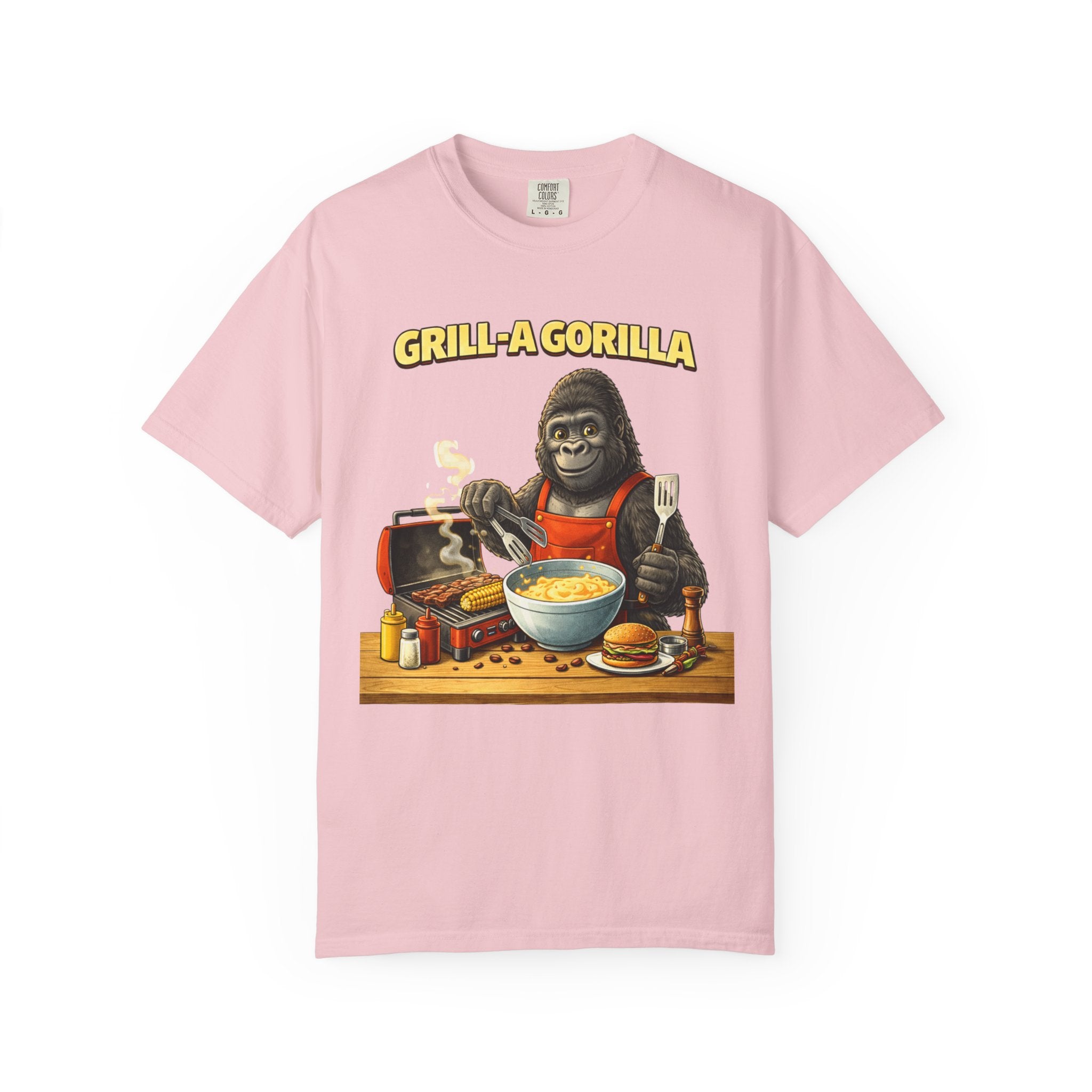 This heavyweight cotton tee brings the Grill-A-Gorilla illustration to life with a worn-in, retro BBQ vibe. Imagine a lazy summer afternoon where smoke curls from the grate and a confident ape tends the coals — that scene lives on the chest of this shirt. The garment-dyed finish gives a lived-in softness and slightly faded tone that pairs with denim, work aprons, or a weathered cap. It sits relaxed through the shoulders and torso so you can move freely while manning the grill or leaning back with a cold drink. The vintage graphic reads like a story: hands-on, rowdy, and a little mischievous — it’s the kind of shirt a home pitmaster or backyard crew reaches for when friends arrive and the fire is lit. The sturdy construction and midweight fabric mean it stands up to seasons of cookouts and washes without losing character.
