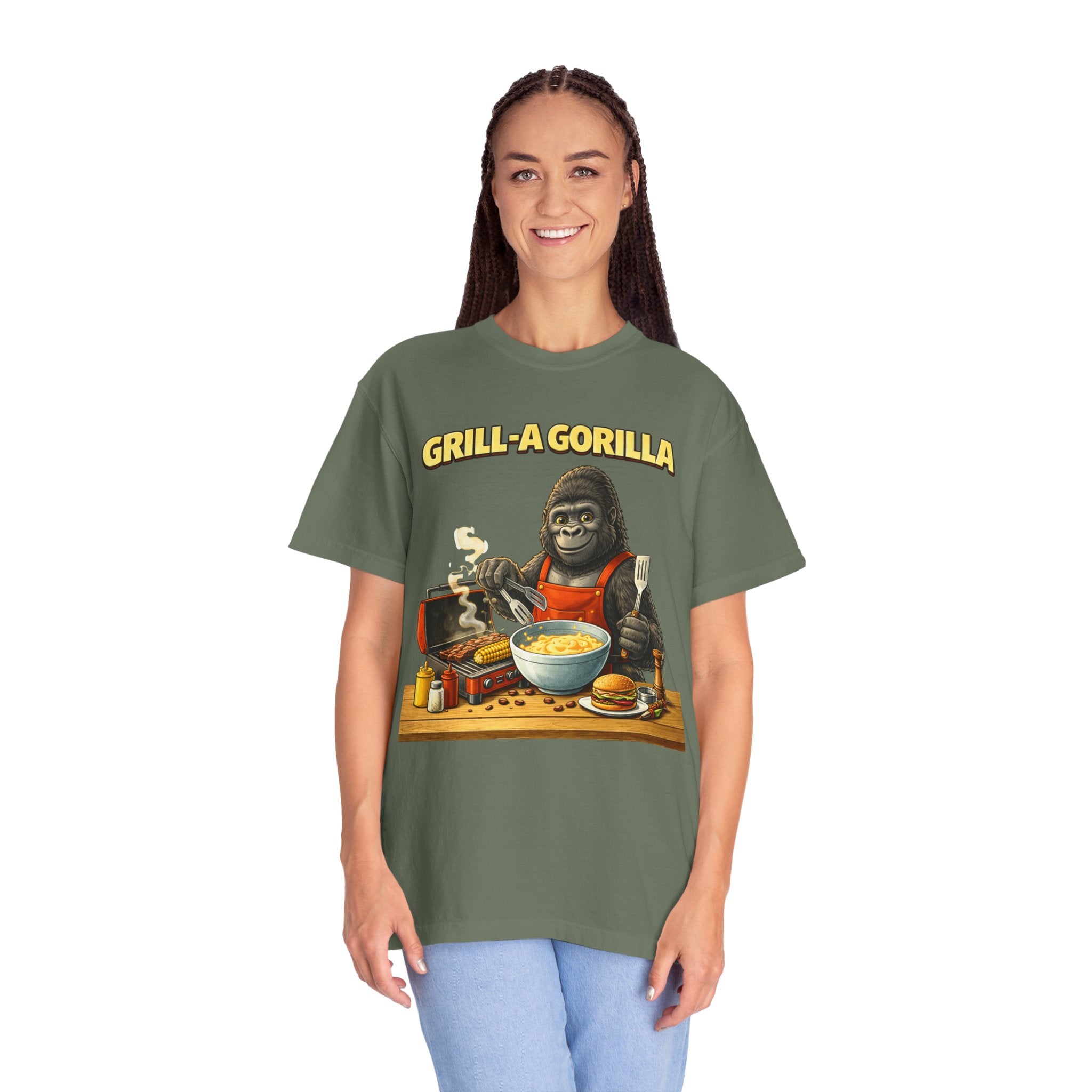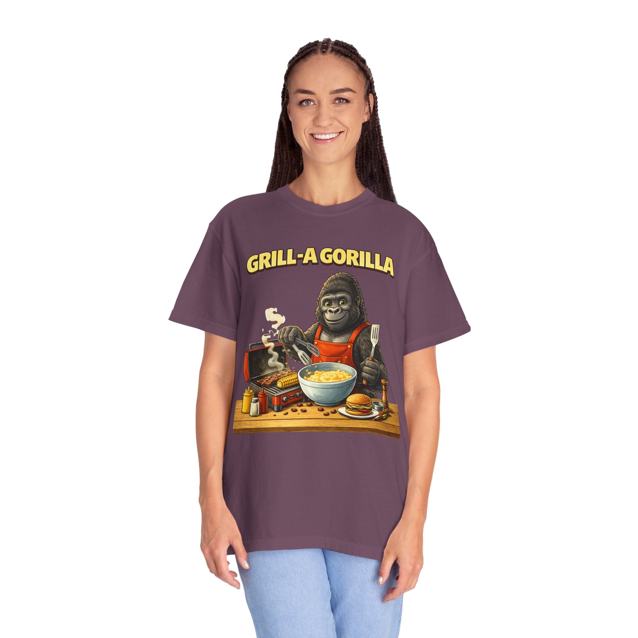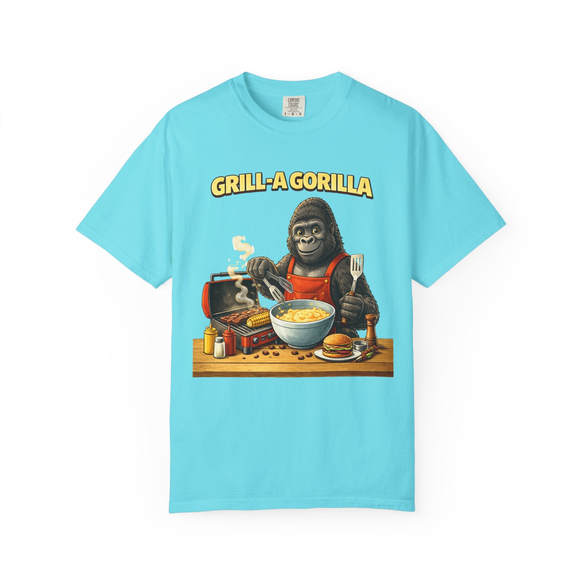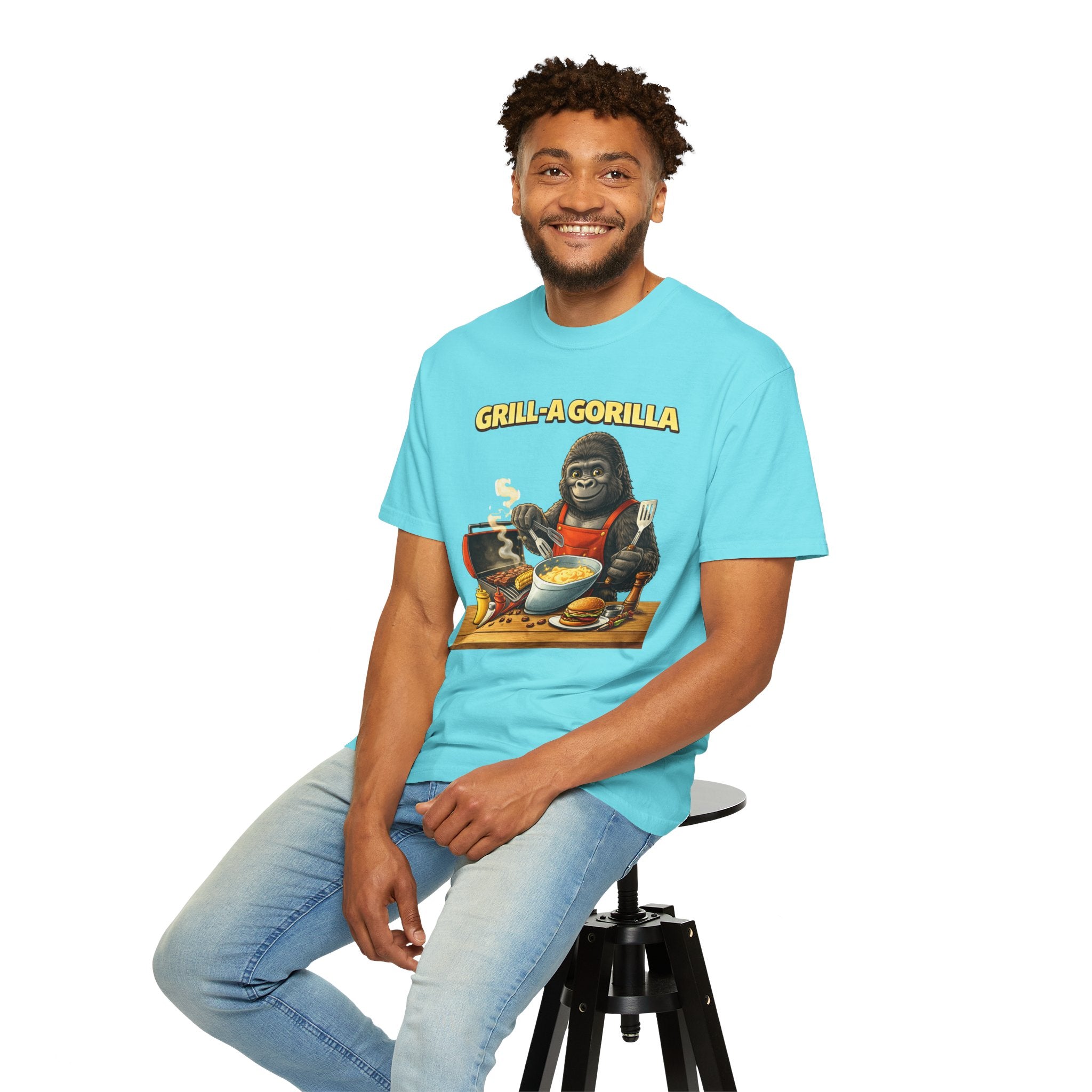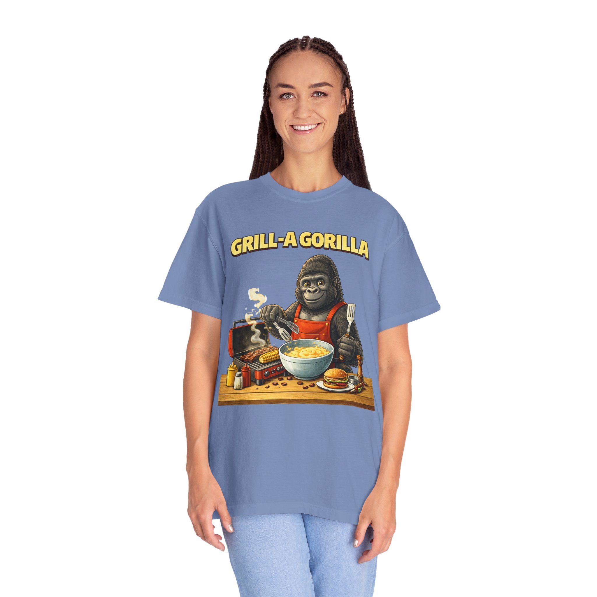 This heavyweight cotton tee brings the Grill-A-Gorilla illustration to life with a worn-in, retro BBQ vibe. Imagine a lazy summer afternoon where smoke curls from the grate and a confident ape tends the coals — that scene lives on the chest of this shirt. The garment-dyed finish gives a lived-in softness and slightly faded tone that pairs with denim, work aprons, or a weathered cap. It sits relaxed through the shoulders and torso so you can move freely while manning the grill or leaning back with a cold drink. The vintage graphic reads like a story: hands-on, rowdy, and a little mischievous — it’s the kind of shirt a home pitmaster or backyard crew reaches for when friends arrive and the fire is lit. The sturdy construction and midweight fabric mean it stands up to seasons of cookouts and washes without losing character.