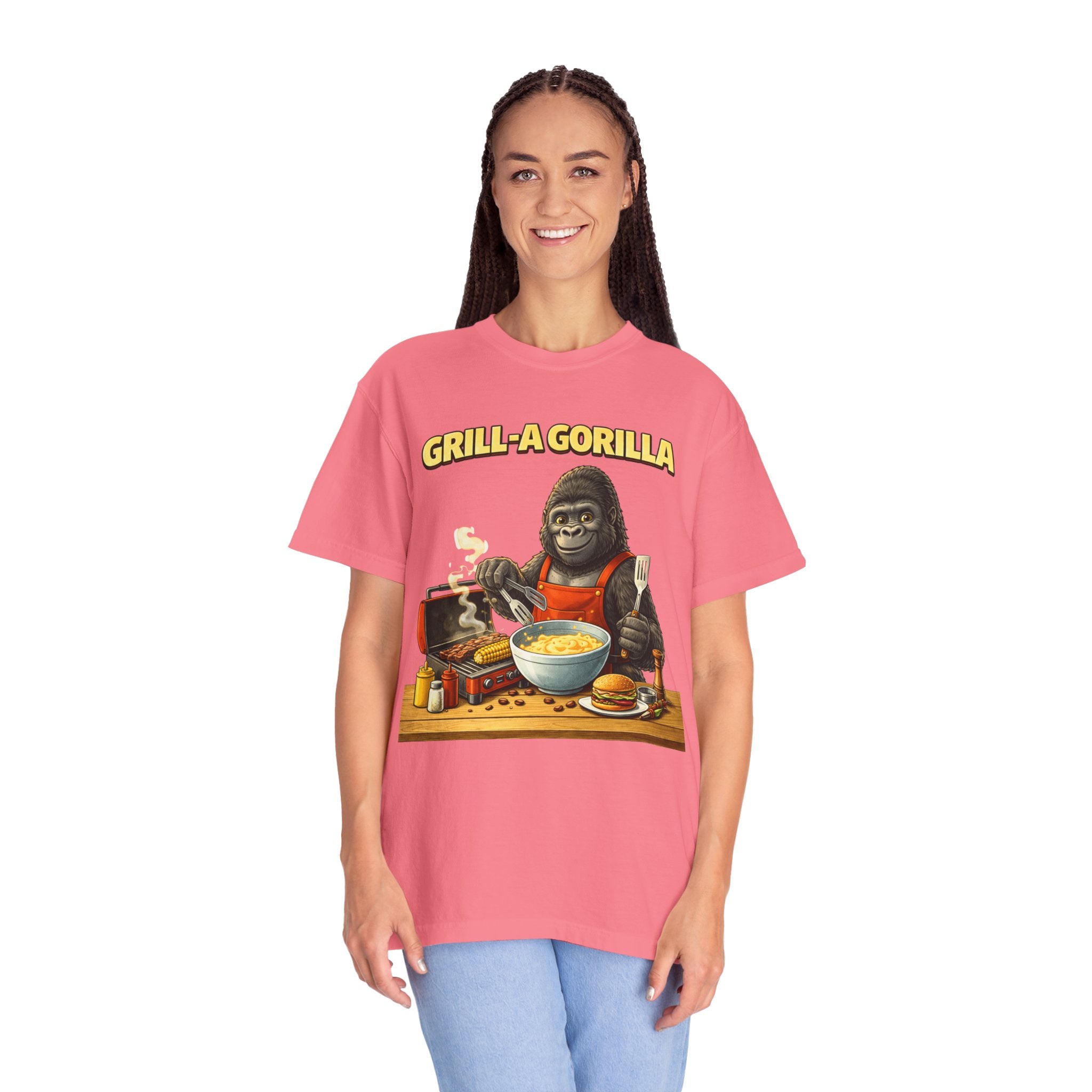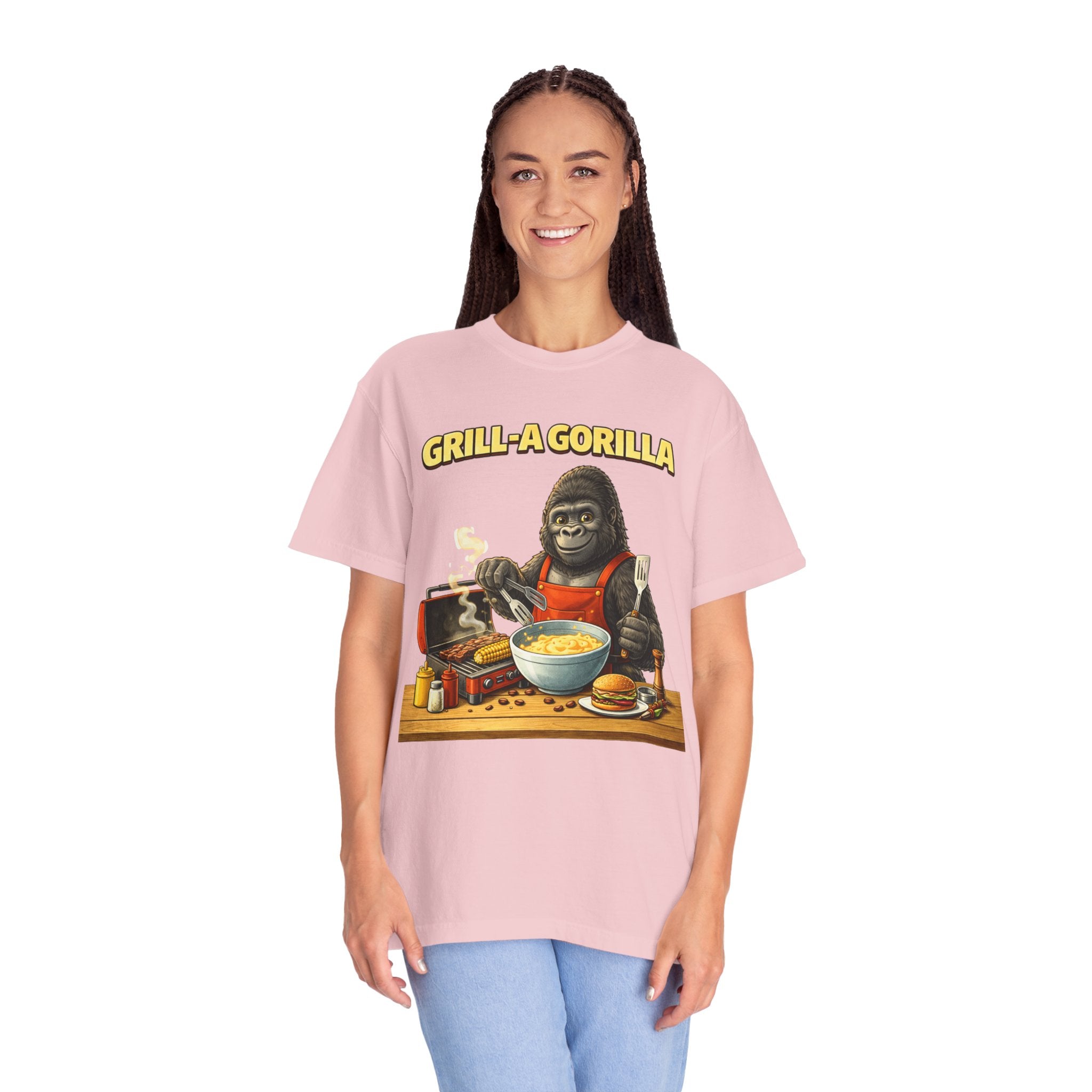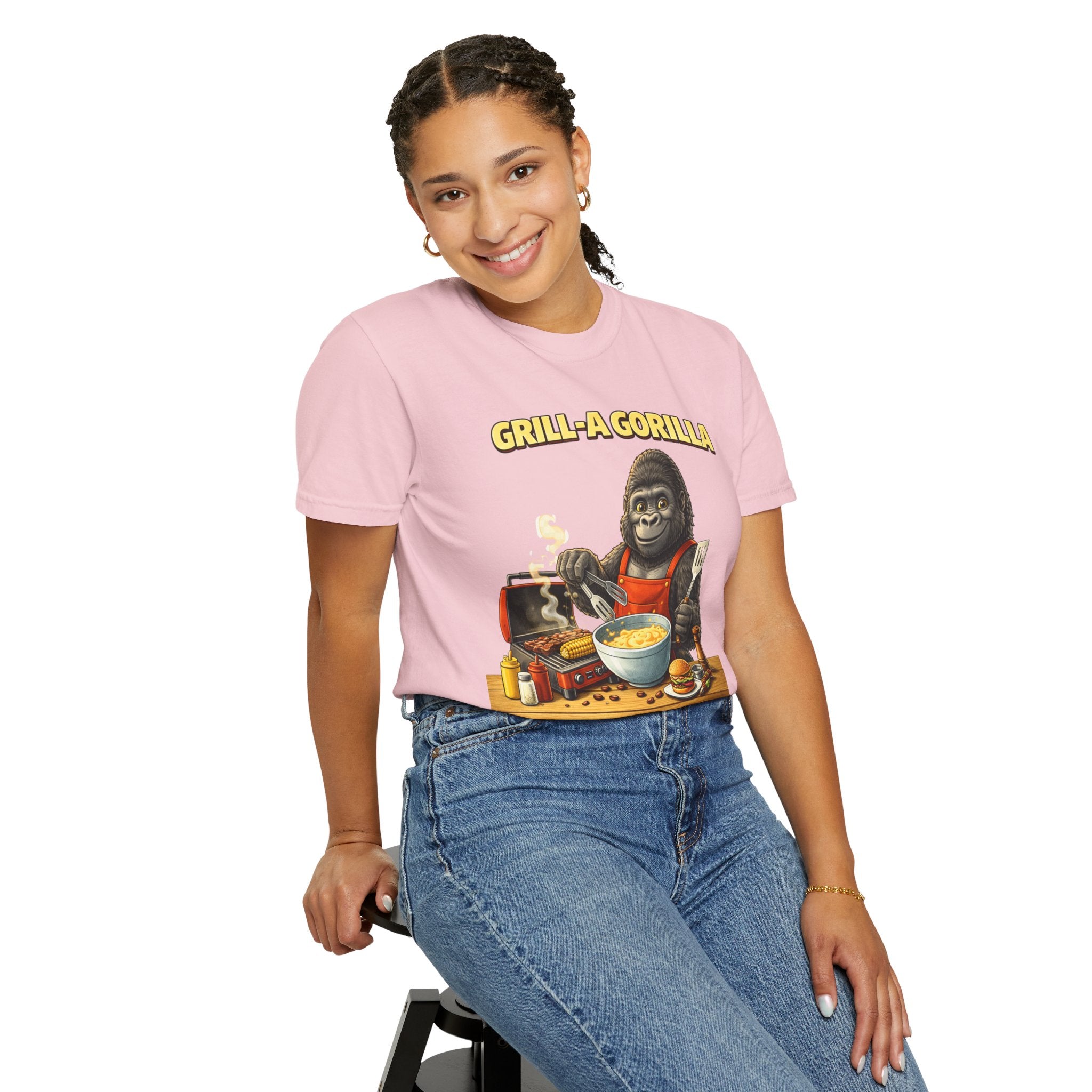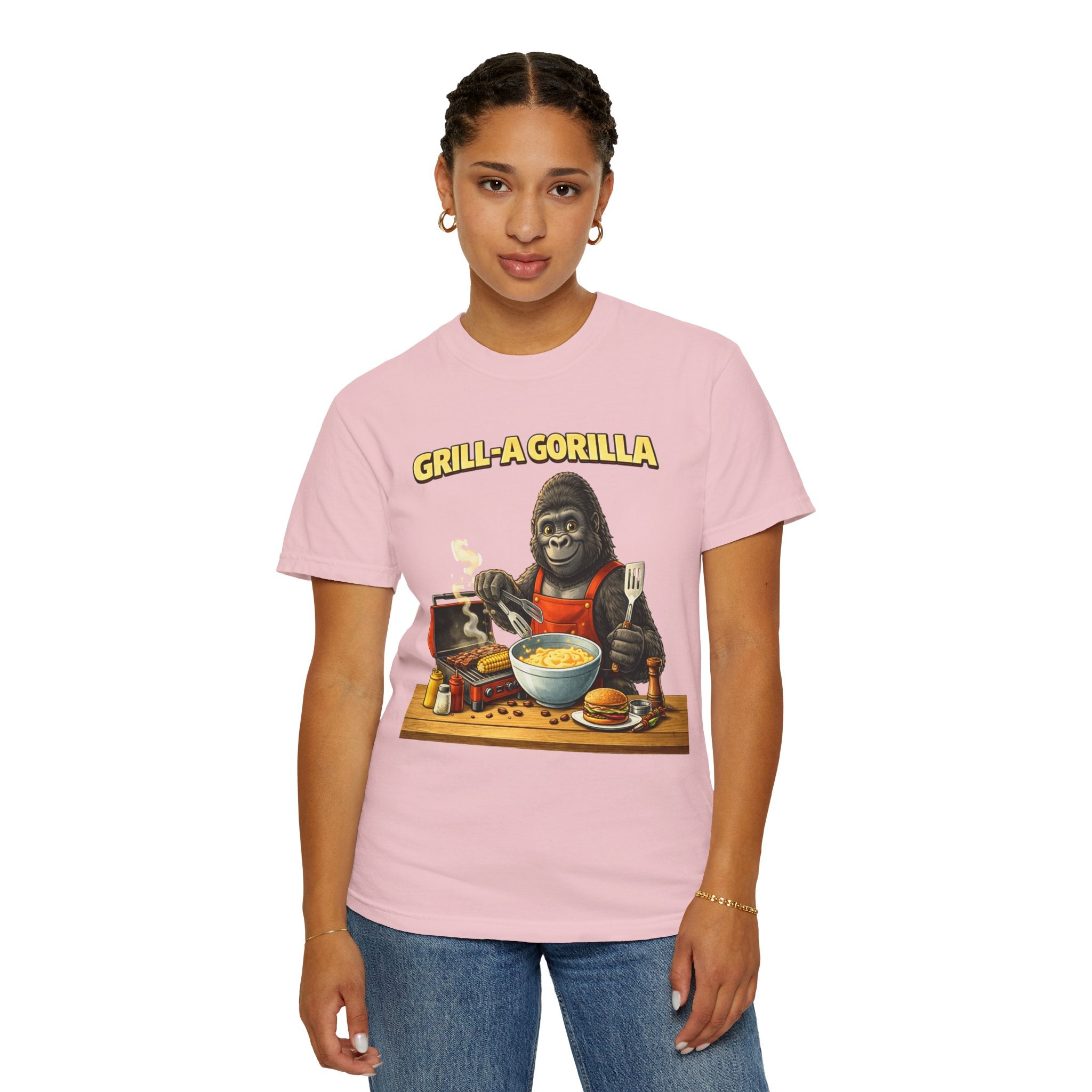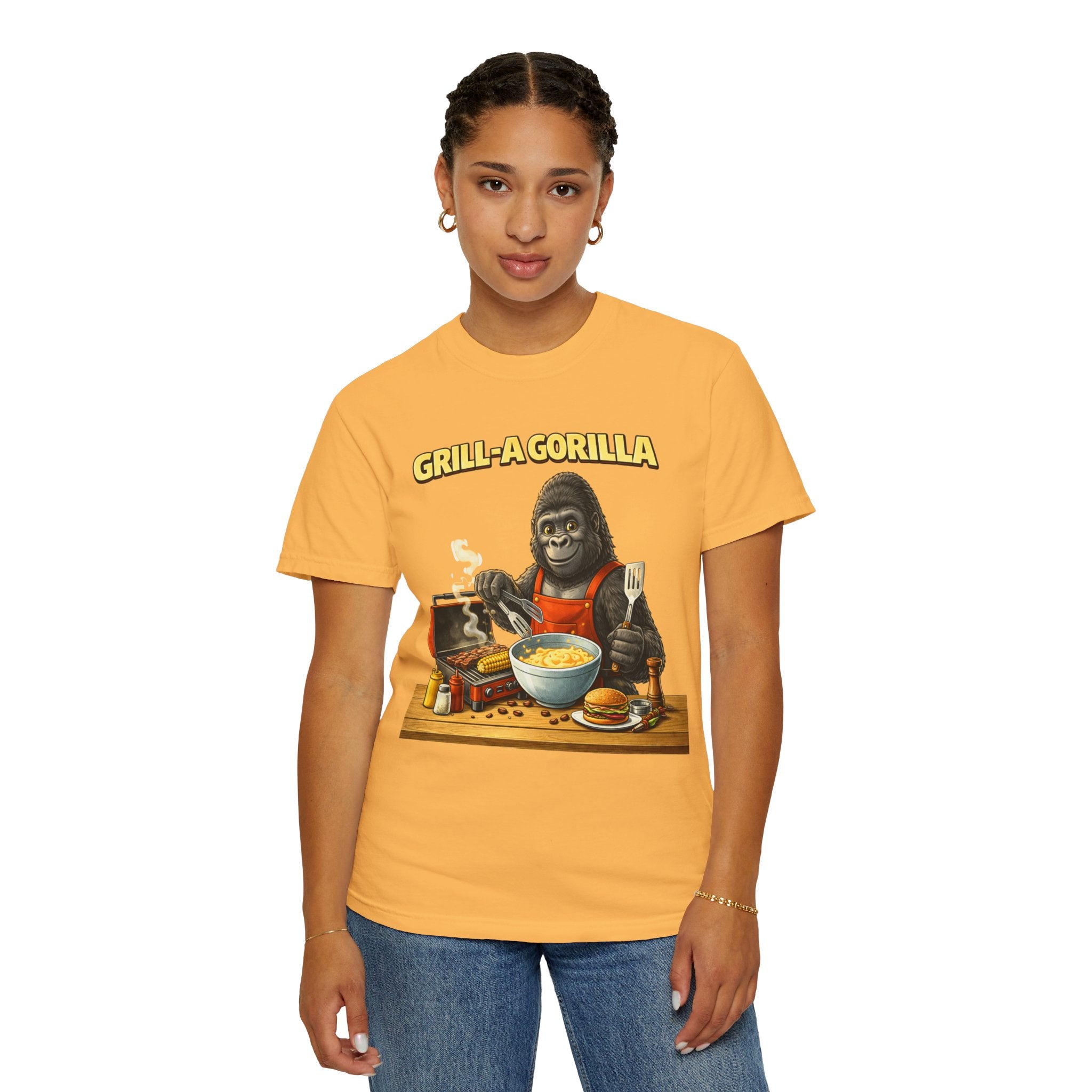 This heavyweight cotton tee brings the Grill-A-Gorilla illustration to life with a worn-in, retro BBQ vibe. Imagine a lazy summer afternoon where smoke curls from the grate and a confident ape tends the coals — that scene lives on the chest of this shirt. The garment-dyed finish gives a lived-in softness and slightly faded tone that pairs with denim, work aprons, or a weathered cap. It sits relaxed through the shoulders and torso so you can move freely while manning the grill or leaning back with a cold drink. The vintage graphic reads like a story: hands-on, rowdy, and a little mischievous — it’s the kind of shirt a home pitmaster or backyard crew reaches for when friends arrive and the fire is lit. The sturdy construction and midweight fabric mean it stands up to seasons of cookouts and washes without losing character.
