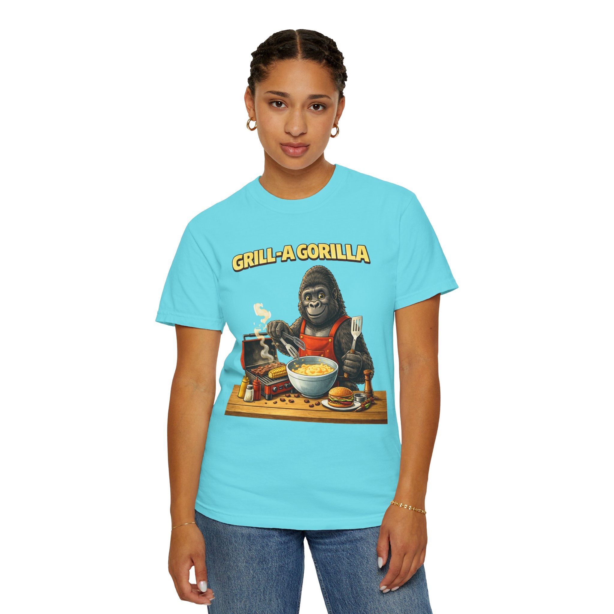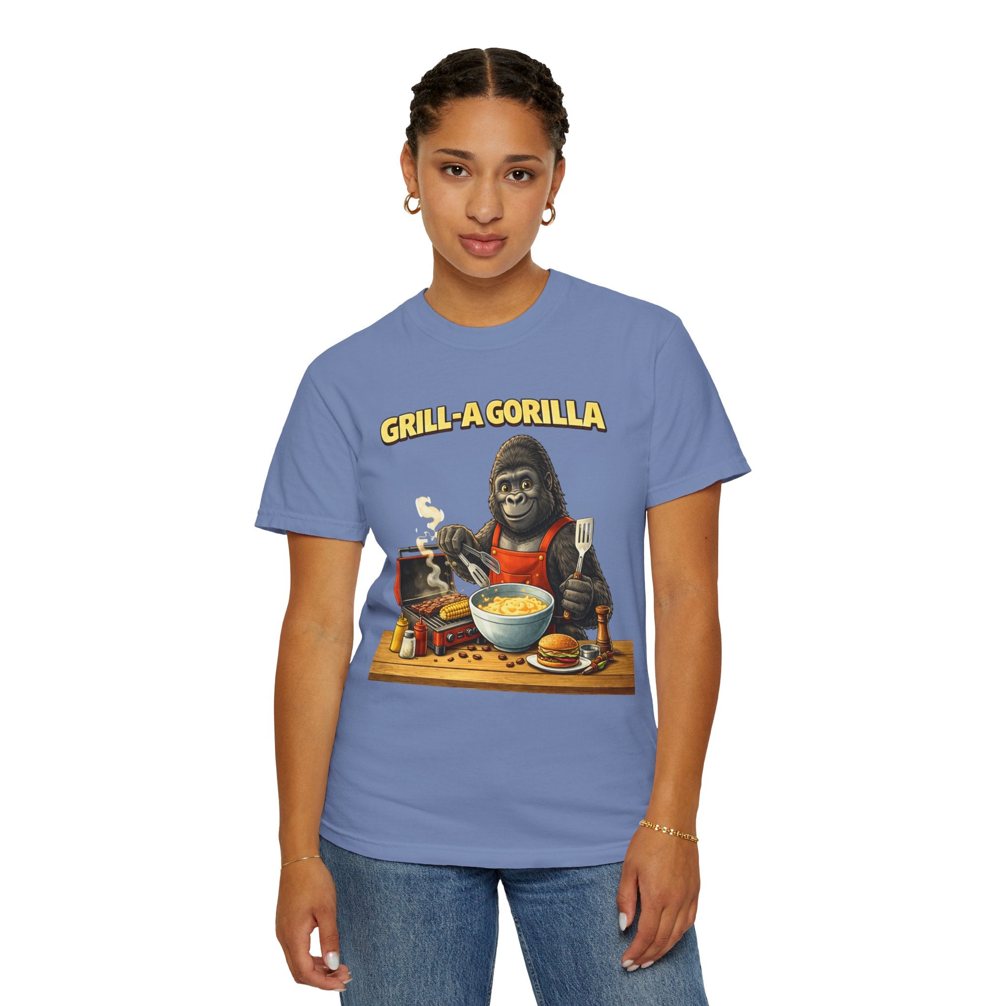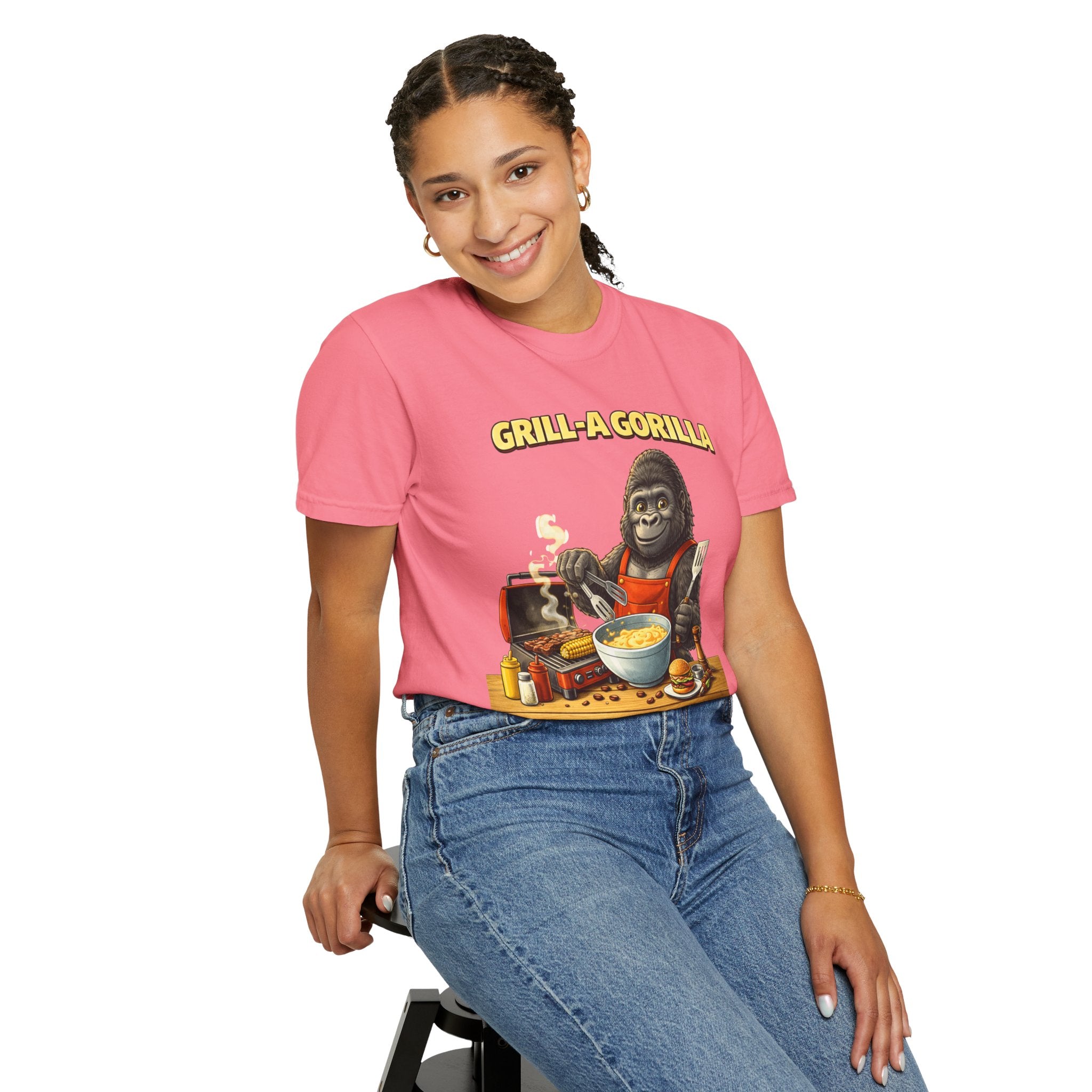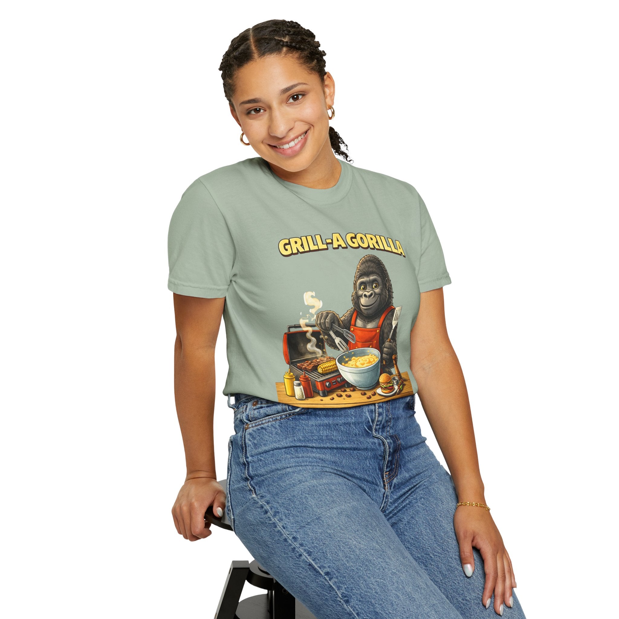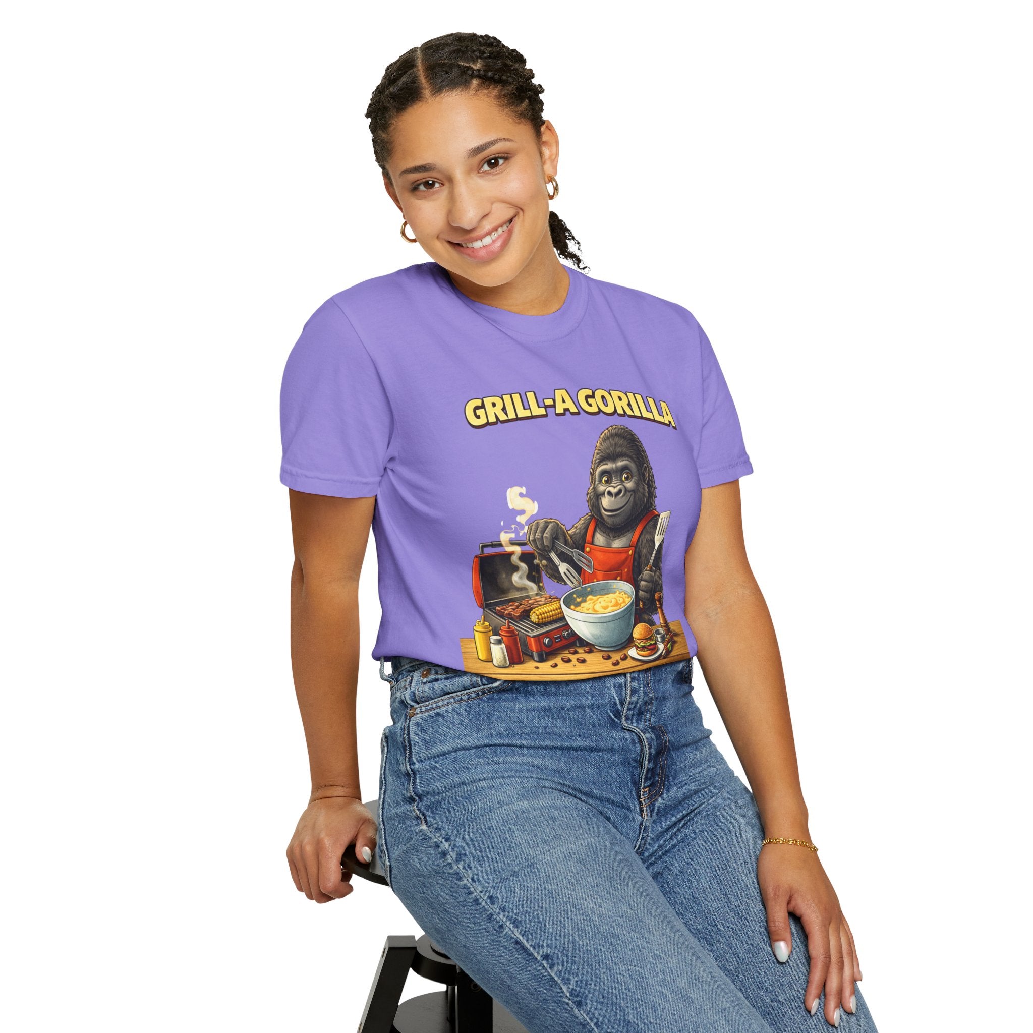 This heavyweight cotton tee brings the Grill-A-Gorilla illustration to life with a worn-in, retro BBQ vibe. Imagine a lazy summer afternoon where smoke curls from the grate and a confident ape tends the coals — that scene lives on the chest of this shirt. The garment-dyed finish gives a lived-in softness and slightly faded tone that pairs with denim, work aprons, or a weathered cap. It sits relaxed through the shoulders and torso so you can move freely while manning the grill or leaning back with a cold drink. The vintage graphic reads like a story: hands-on, rowdy, and a little mischievous — it’s the kind of shirt a home pitmaster or backyard crew reaches for when friends arrive and the fire is lit. The sturdy construction and midweight fabric mean it stands up to seasons of cookouts and washes without losing character.