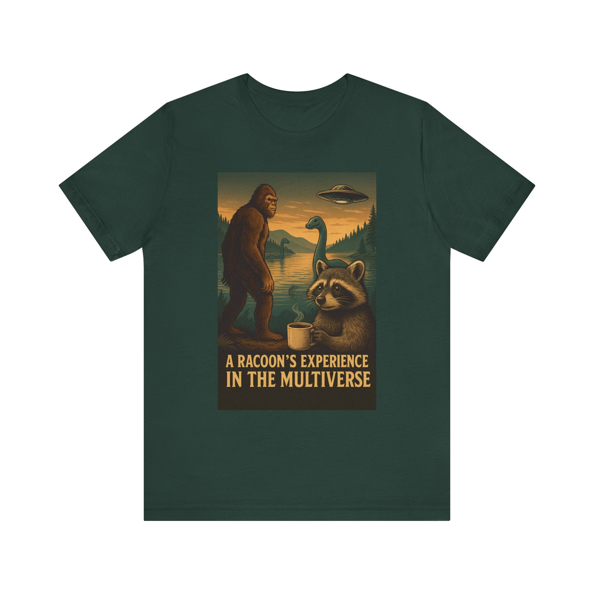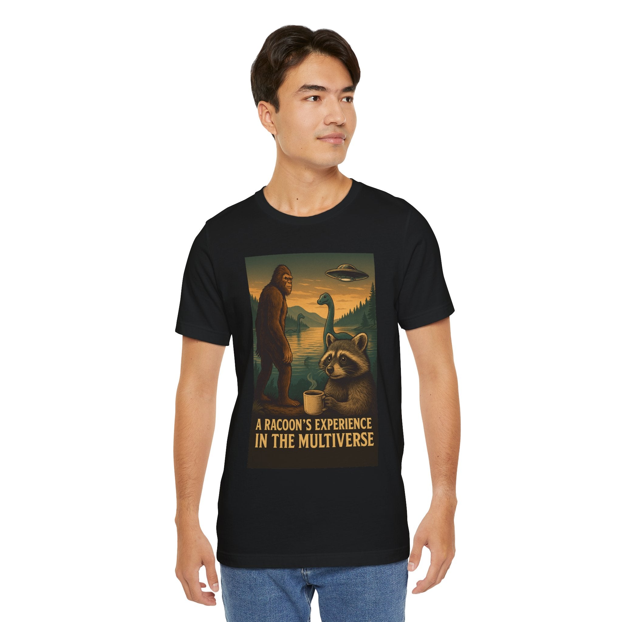 Experience the fun and quirky charm of the Raccoon Multiverse Tee, a unique Unisex T-Shirt perfect for nature lovers and retro style enthusiasts. Featuring Loch Ness, Big Foot, Werewolf, and UFO graphics, this tee is a great gift idea for those who enjoy a bit of mystery and adventure. Suitable for casual outings, this tee adds a touch of whimsy to your wardrobe.