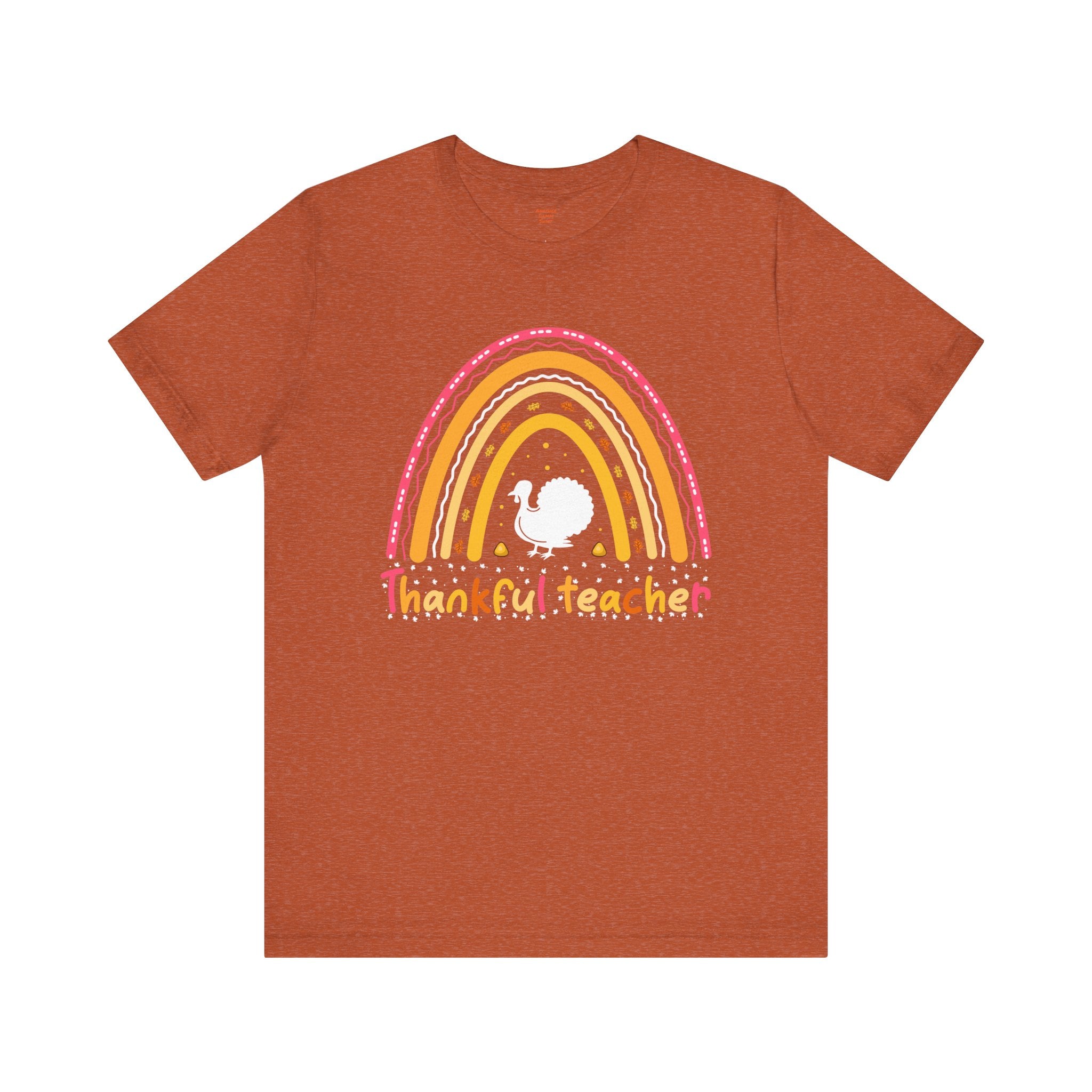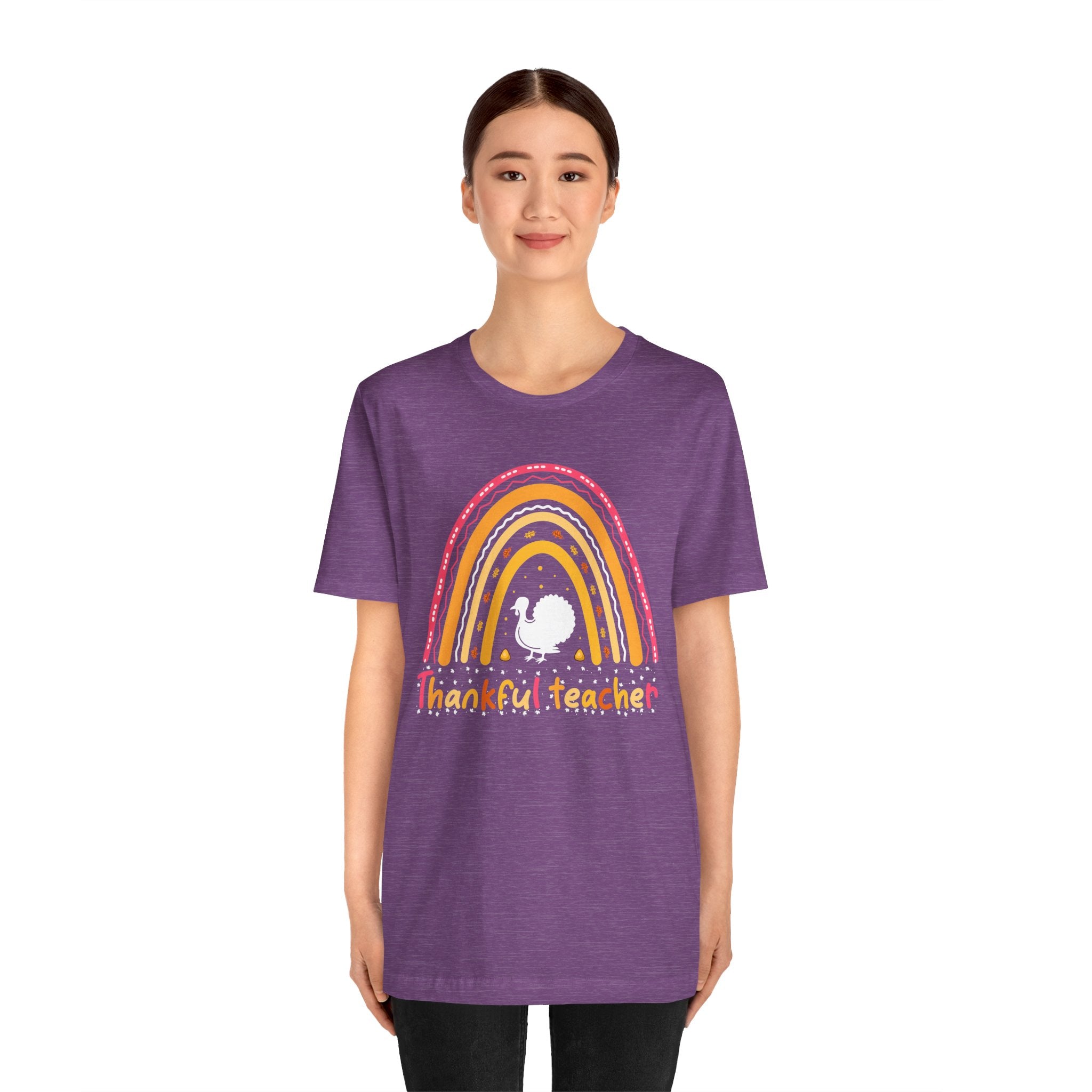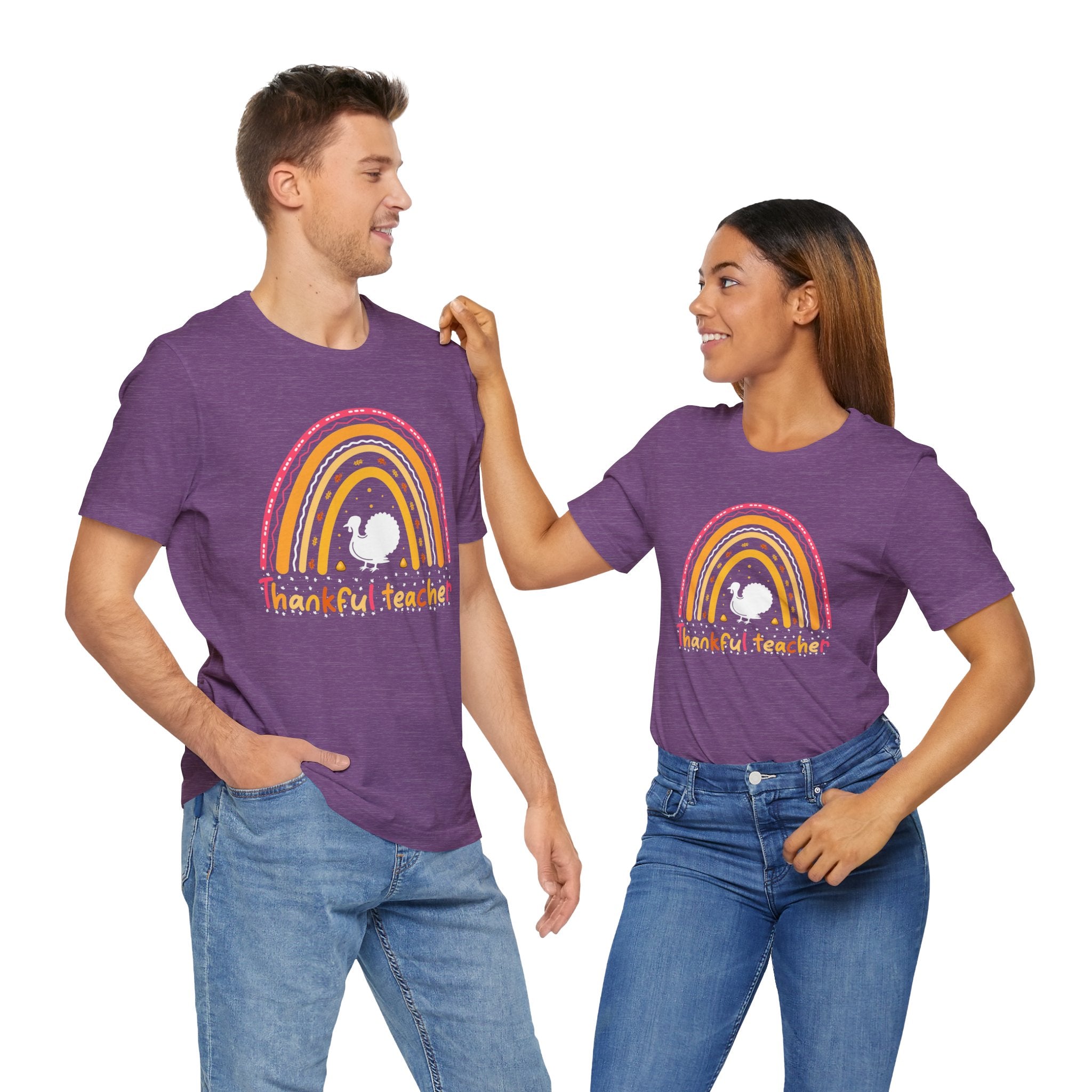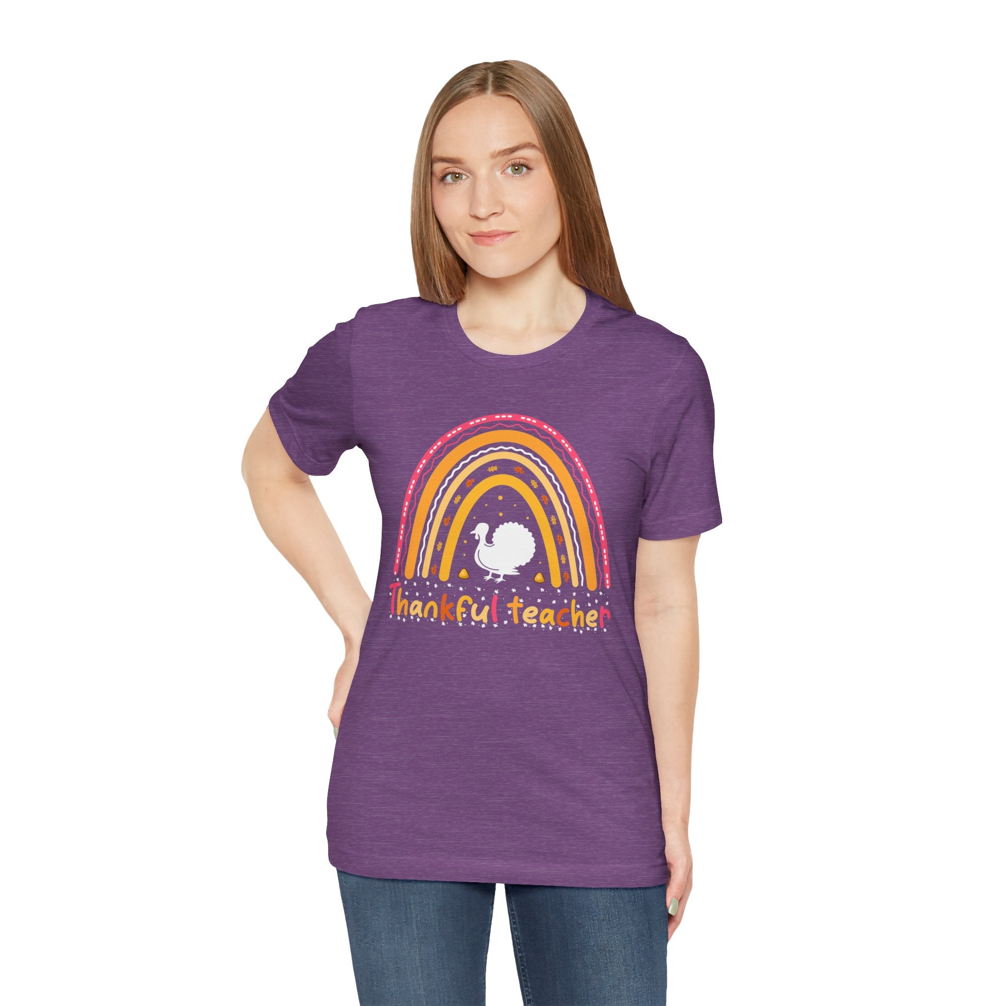 Soft, breathable tee that celebrates teachers with warm, vintage-inspired color. The relaxed retail fit and crew neckline make it easy to layer over a cardigan or wear on its own during busy school days. A cheerful distressed rainbow arches over a small, hand-drawn turkey silhouette and the hand-lettered phrase grateful teacher — subtle, playful, and made to wear throughout the season of gratitude. Lightweight Airlume combed cotton keeps the shirt comfortable from morning homeroom to after-school conferences, while thoughtful construction details ensure it holds up to frequent washing and everyday movement.