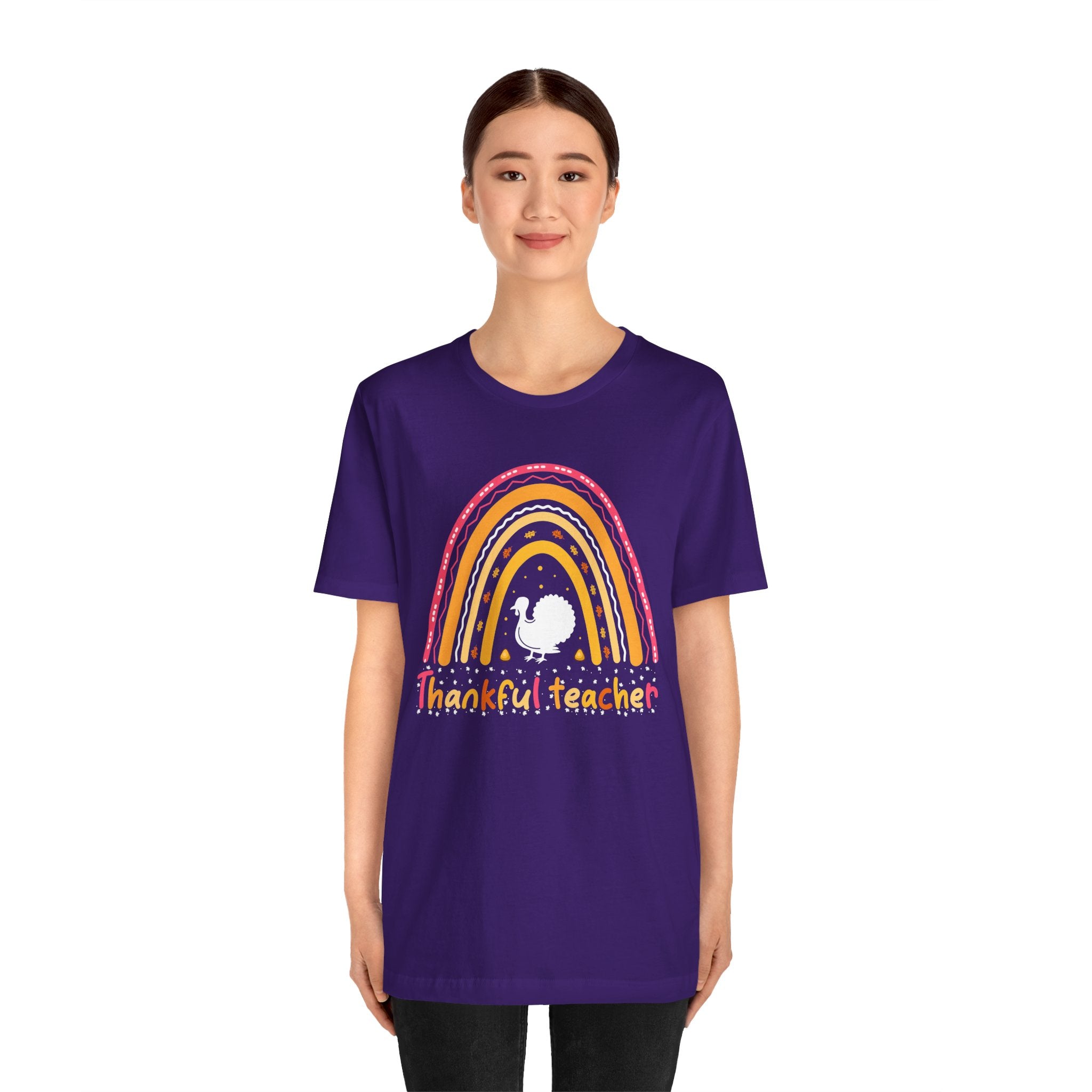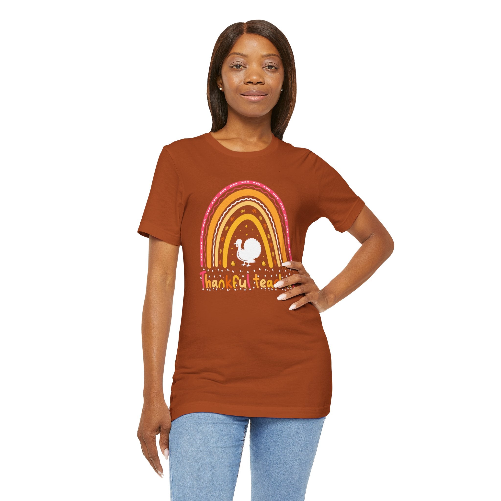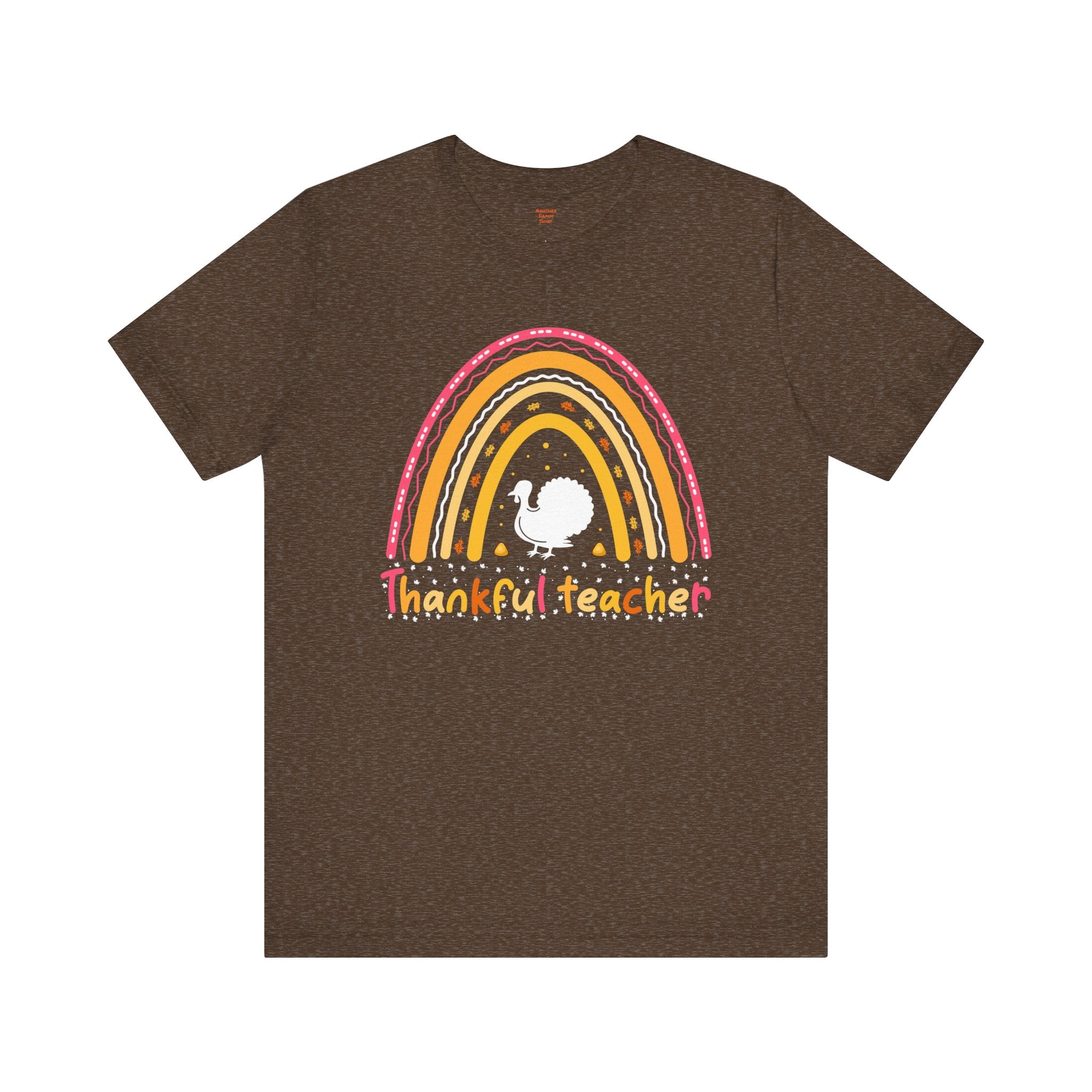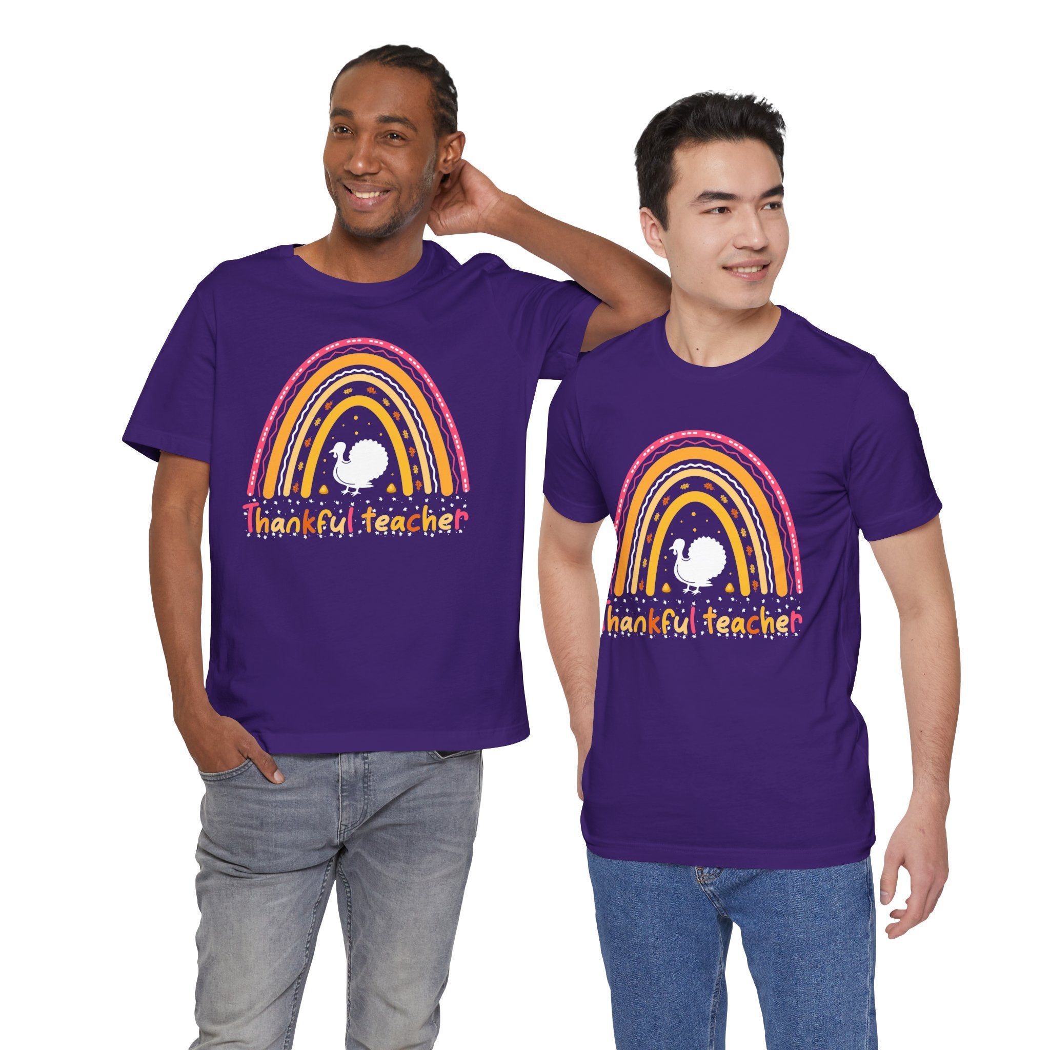Soft, breathable tee that celebrates teachers with warm, vintage-inspired color. The relaxed retail fit and crew neckline make it easy to layer over a cardigan or wear on its own during busy school days. A cheerful distressed rainbow arches over a small, hand-drawn turkey silhouette and the hand-lettered phrase grateful teacher — subtle, playful, and made to wear throughout the season of gratitude. Lightweight Airlume combed cotton keeps the shirt comfortable from morning homeroom to after-school conferences, while thoughtful construction details ensure it holds up to frequent washing and everyday movement.