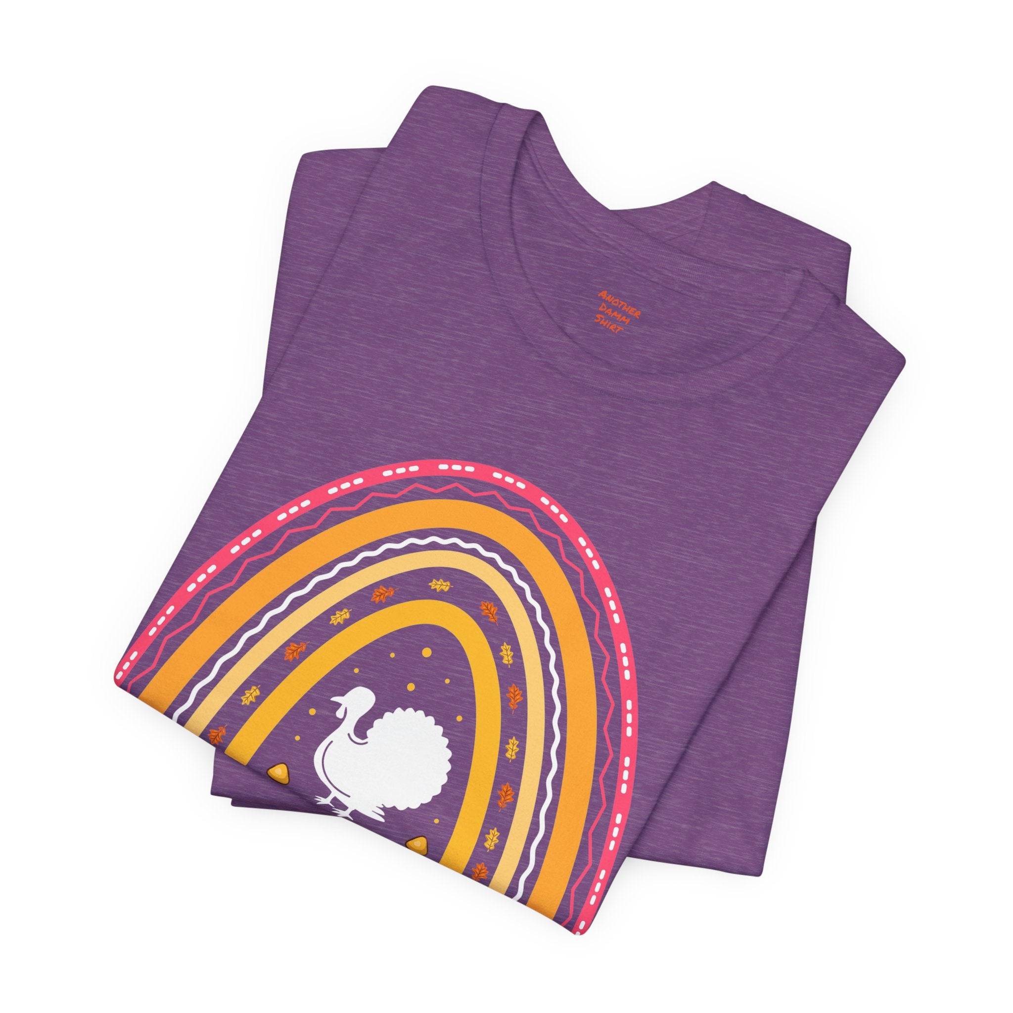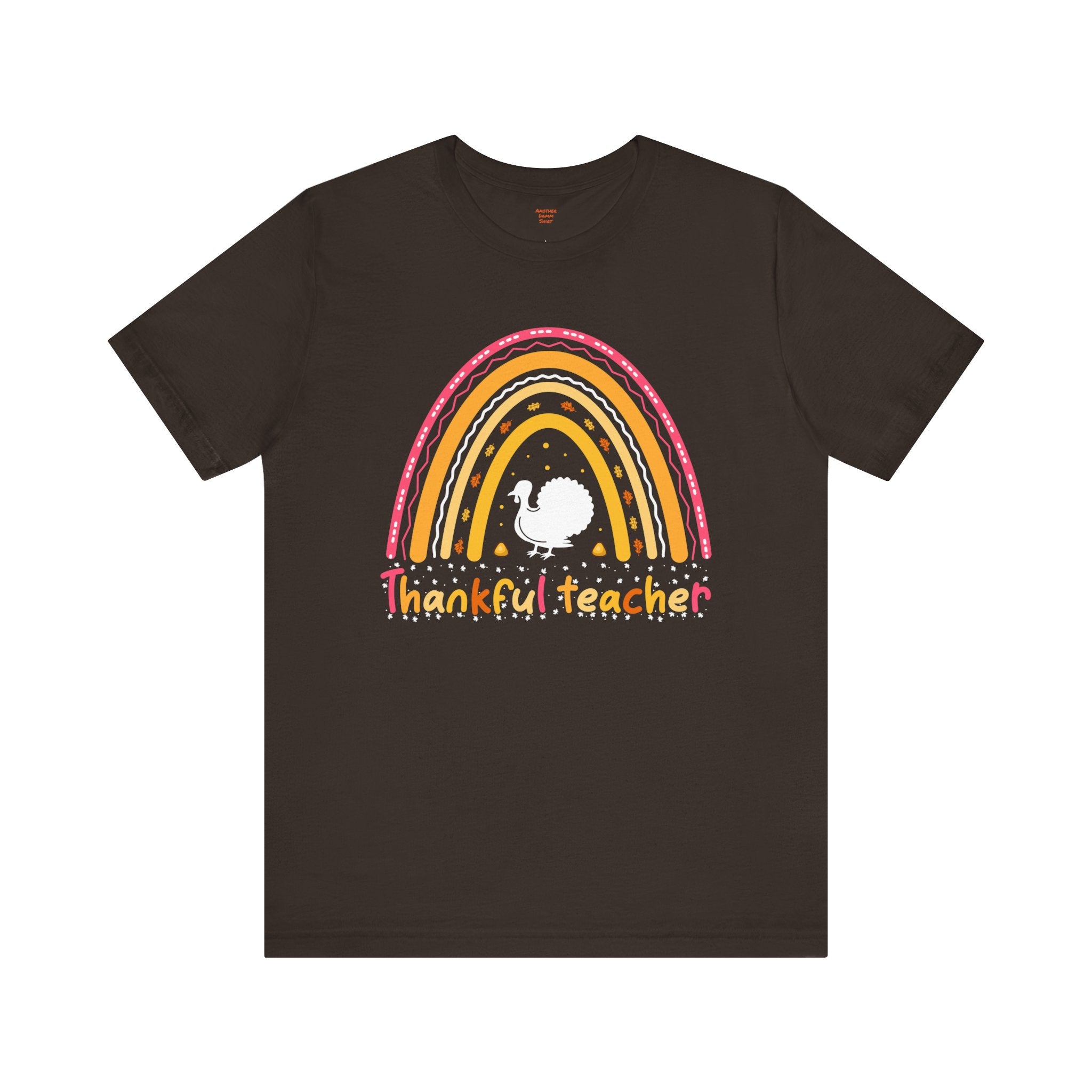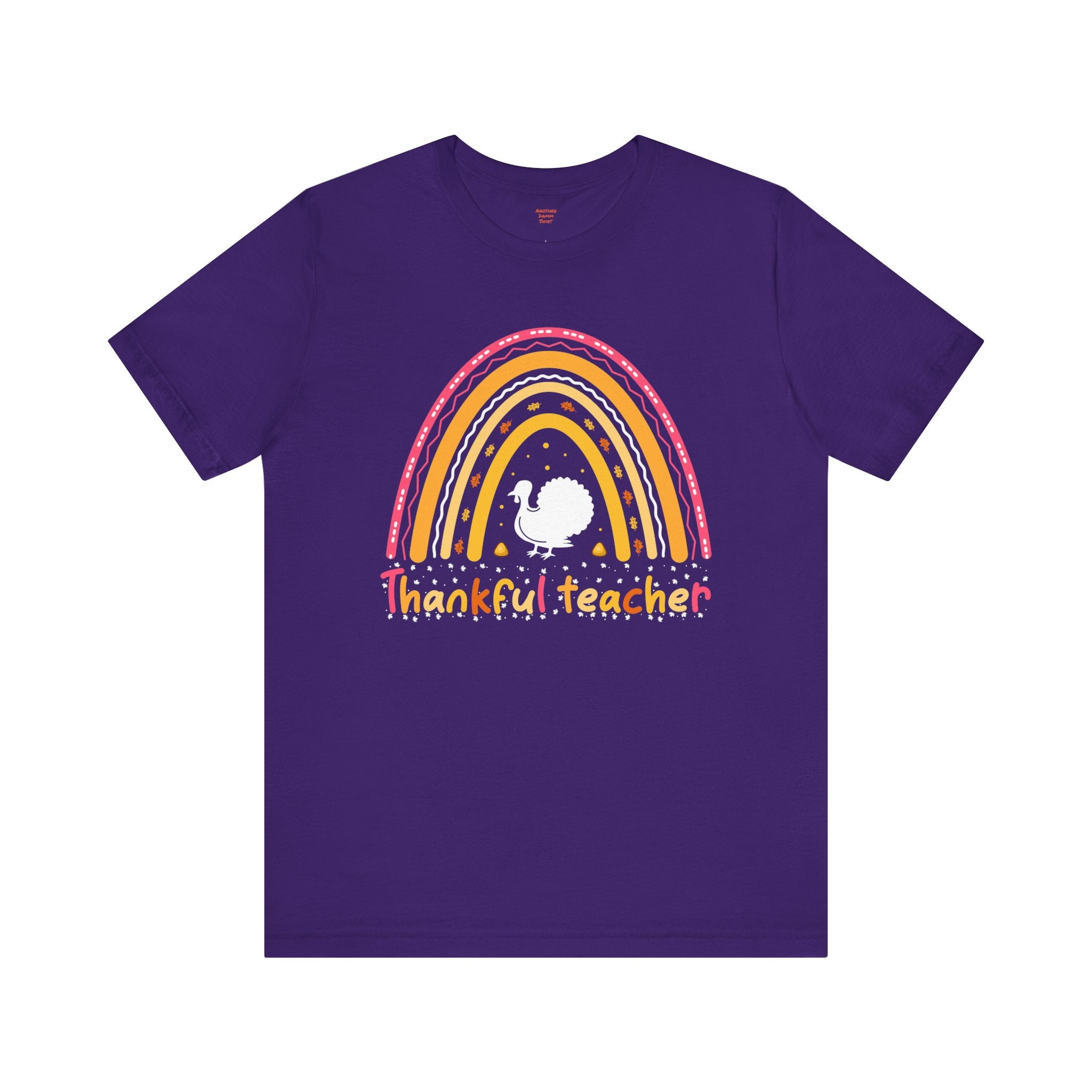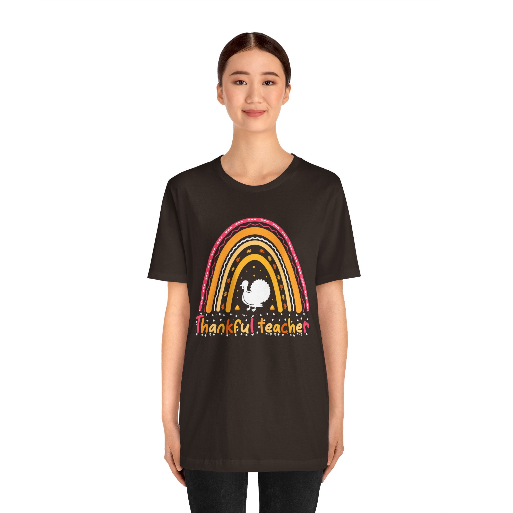 Soft, breathable tee that celebrates teachers with warm, vintage-inspired color. The relaxed retail fit and crew neckline make it easy to layer over a cardigan or wear on its own during busy school days. A cheerful distressed rainbow arches over a small, hand-drawn turkey silhouette and the hand-lettered phrase grateful teacher — subtle, playful, and made to wear throughout the season of gratitude. Lightweight Airlume combed cotton keeps the shirt comfortable from morning homeroom to after-school conferences, while thoughtful construction details ensure it holds up to frequent washing and everyday movement.