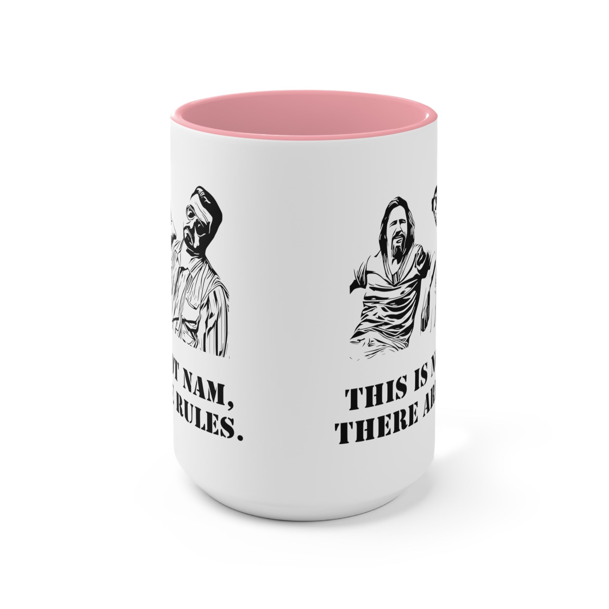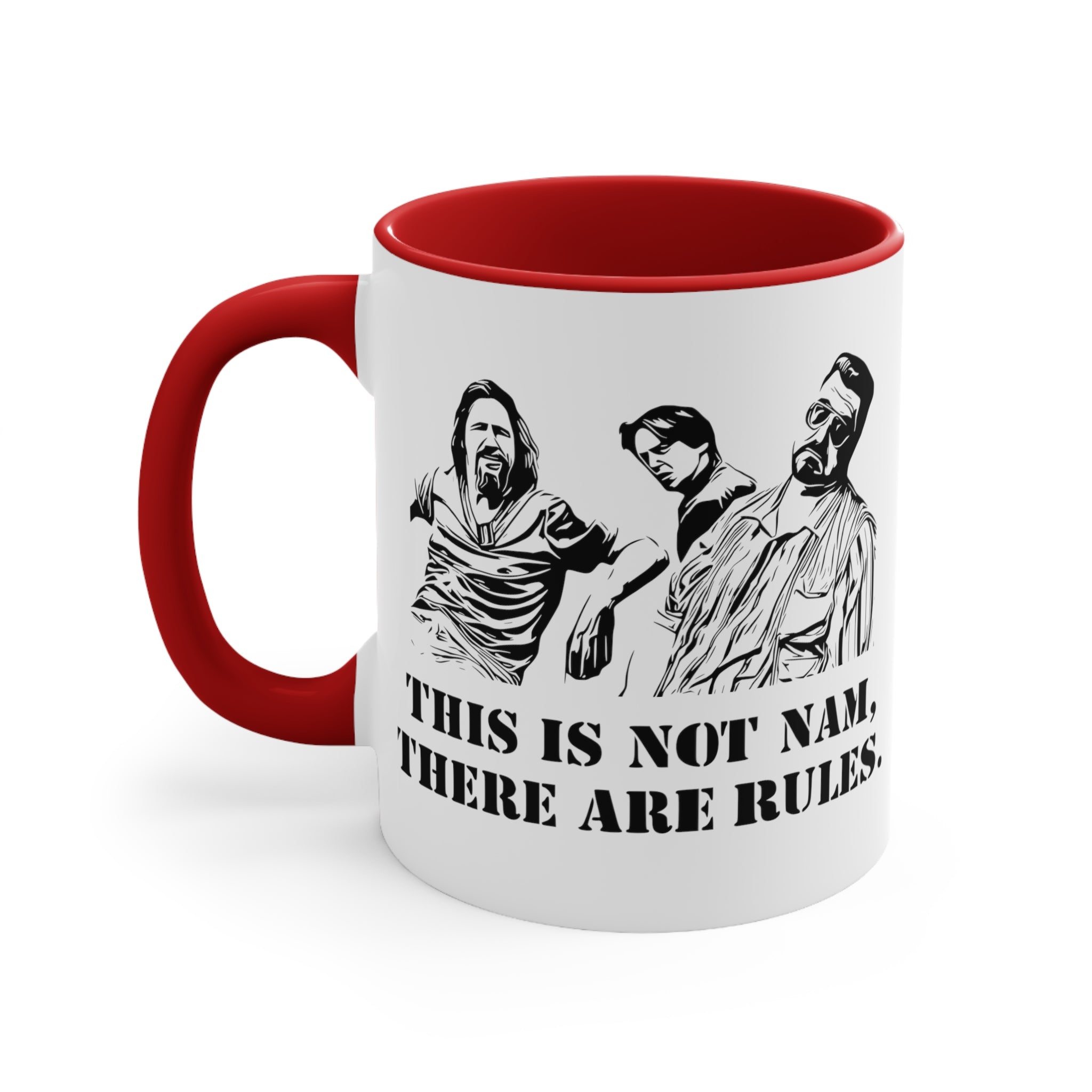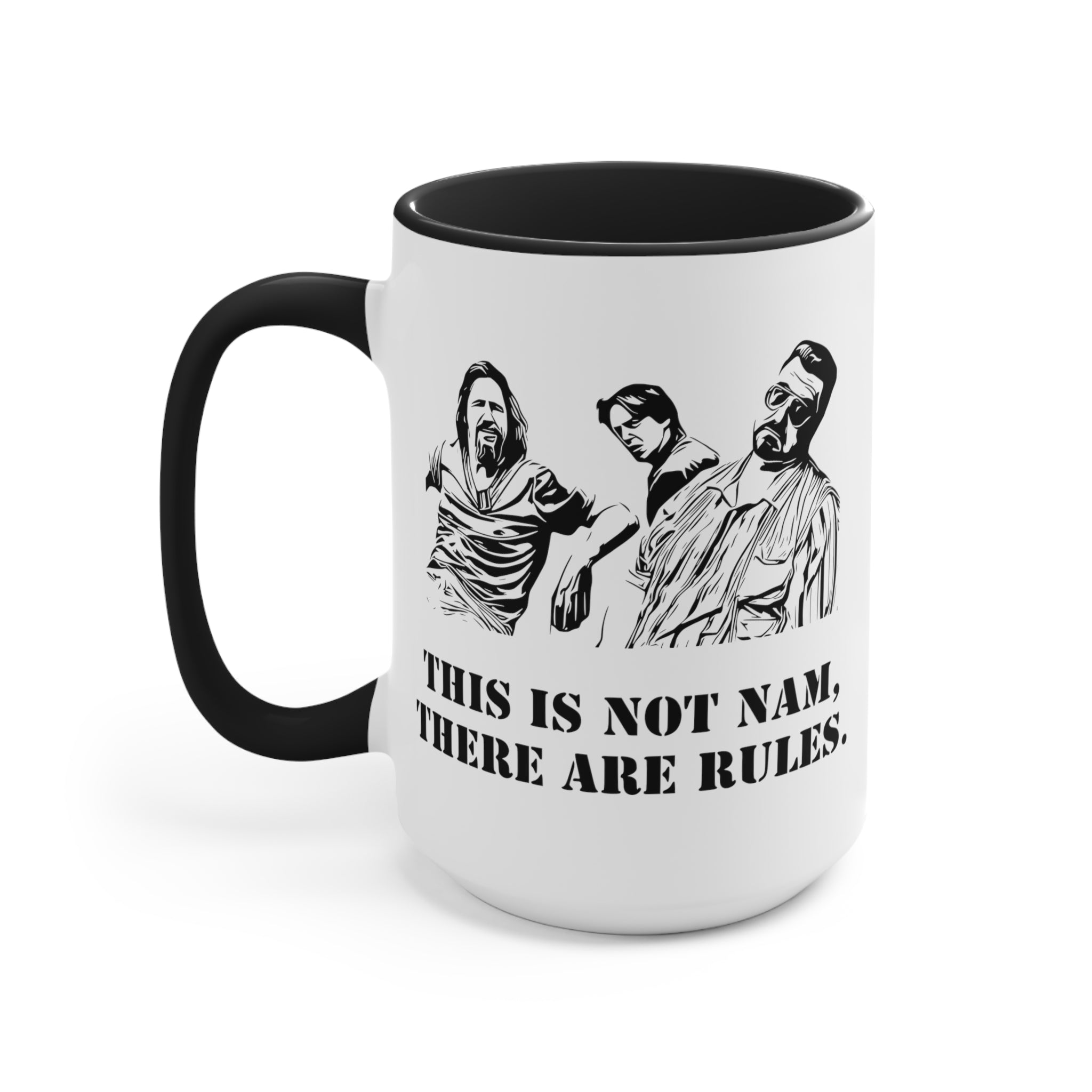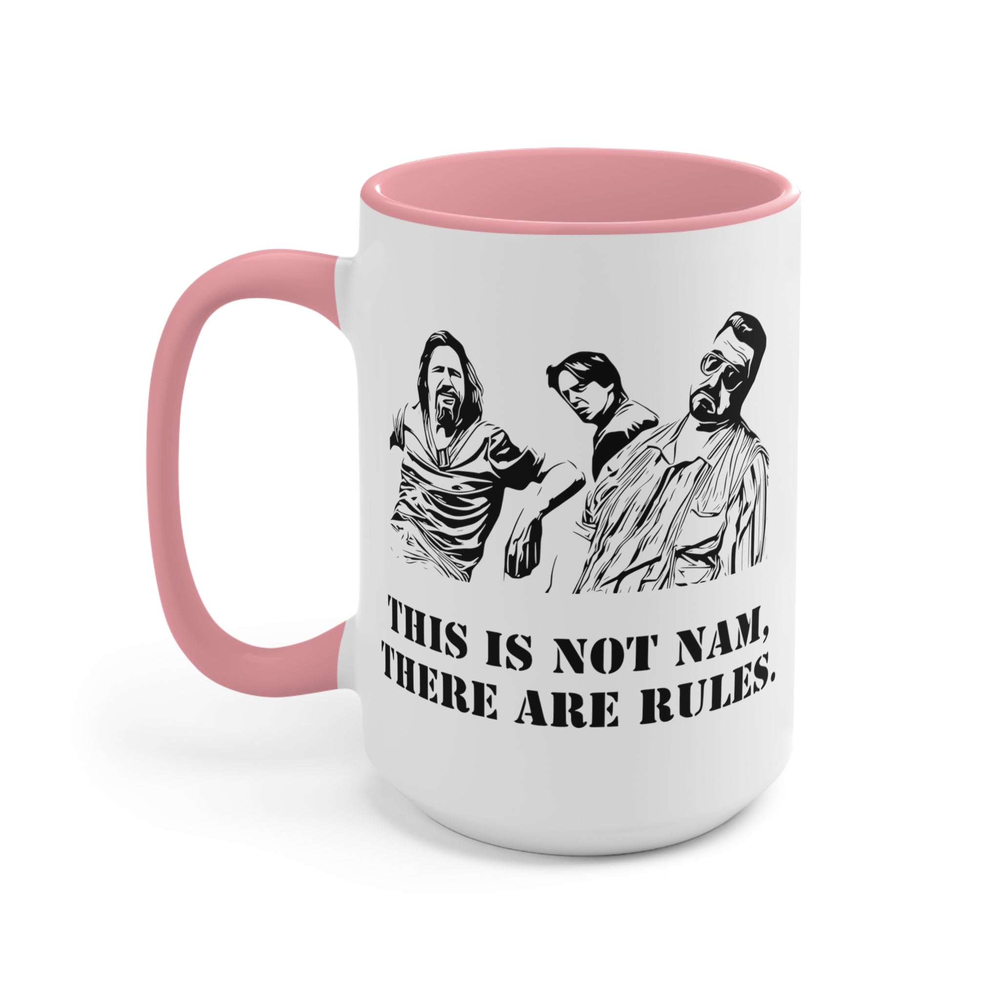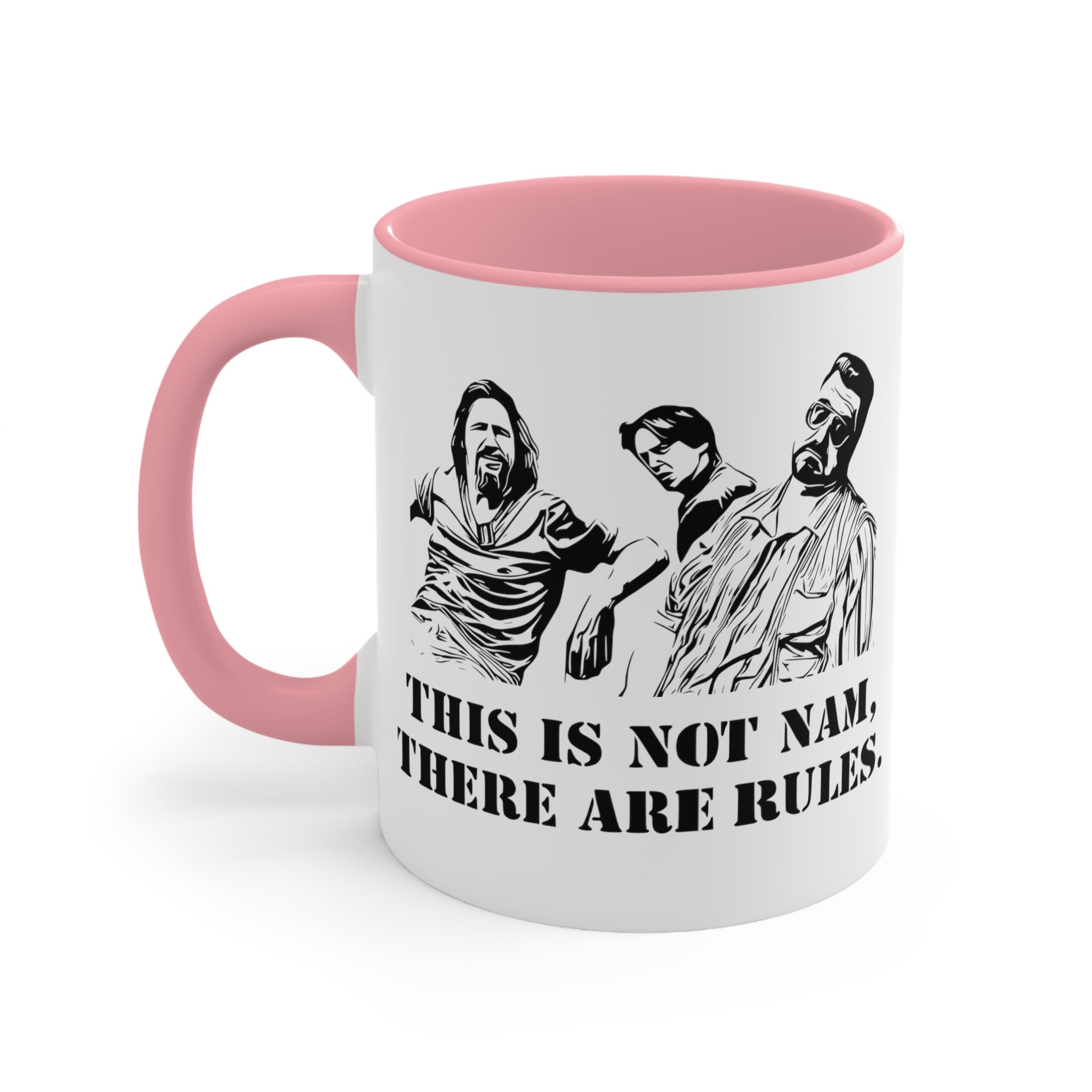 This custom two-tone mug is here to accommodate all your favorite pick-me-up elixirs in style. Its durable ceramic build is microwave & dishwasher-safe, as is the Lebowski image and quote on these mugs. These custom dual-color mugs are available in 2x sizes: 11oz and 15oz, as well as in 3x different color schemes: white with red inside, white with pink inside, and white with black inside.