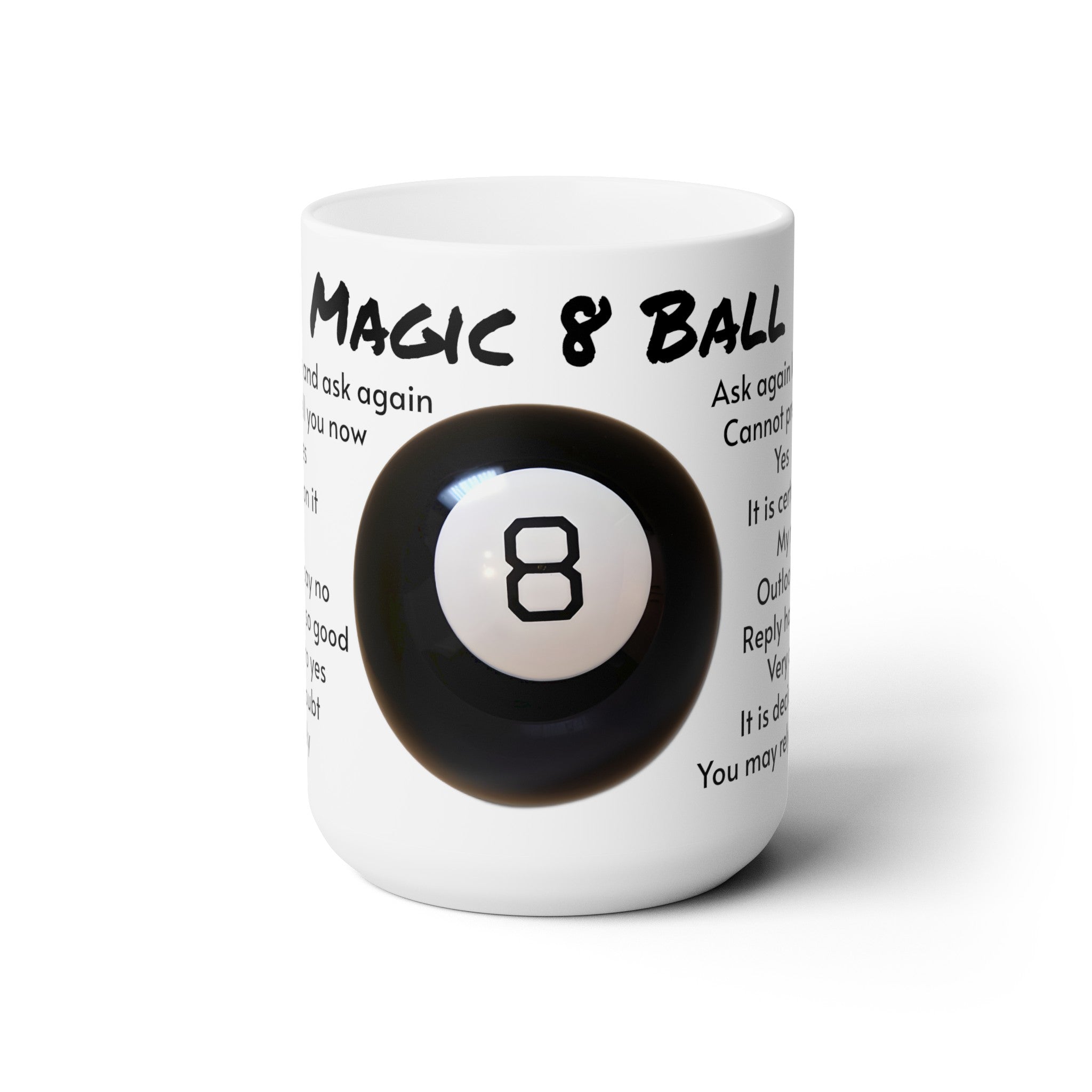 Magic 8 Ball Mug, Pop Culture Gift, Retro Game Mug, Fortune Telling Fun, Gag Gift Mug, Unique Gift Idea, Ceramic Mug 15oz, Nostalgic Gift, Fun Coffee Cup, Conversation Starter, Geeky Present, Vintage Style Gift, Gamer's Coffee Cup, Quirky Kitchenware, Magic Lover's Gift, Novelty Drinkware. Your imagination is the limit with this large 15 ounce custom mug. It’s microwave-safe, and can be washed in dishwasher or easily cleaned with a mild detergent. Customize with your brand or simply a full print of your logo, photos or cool design.