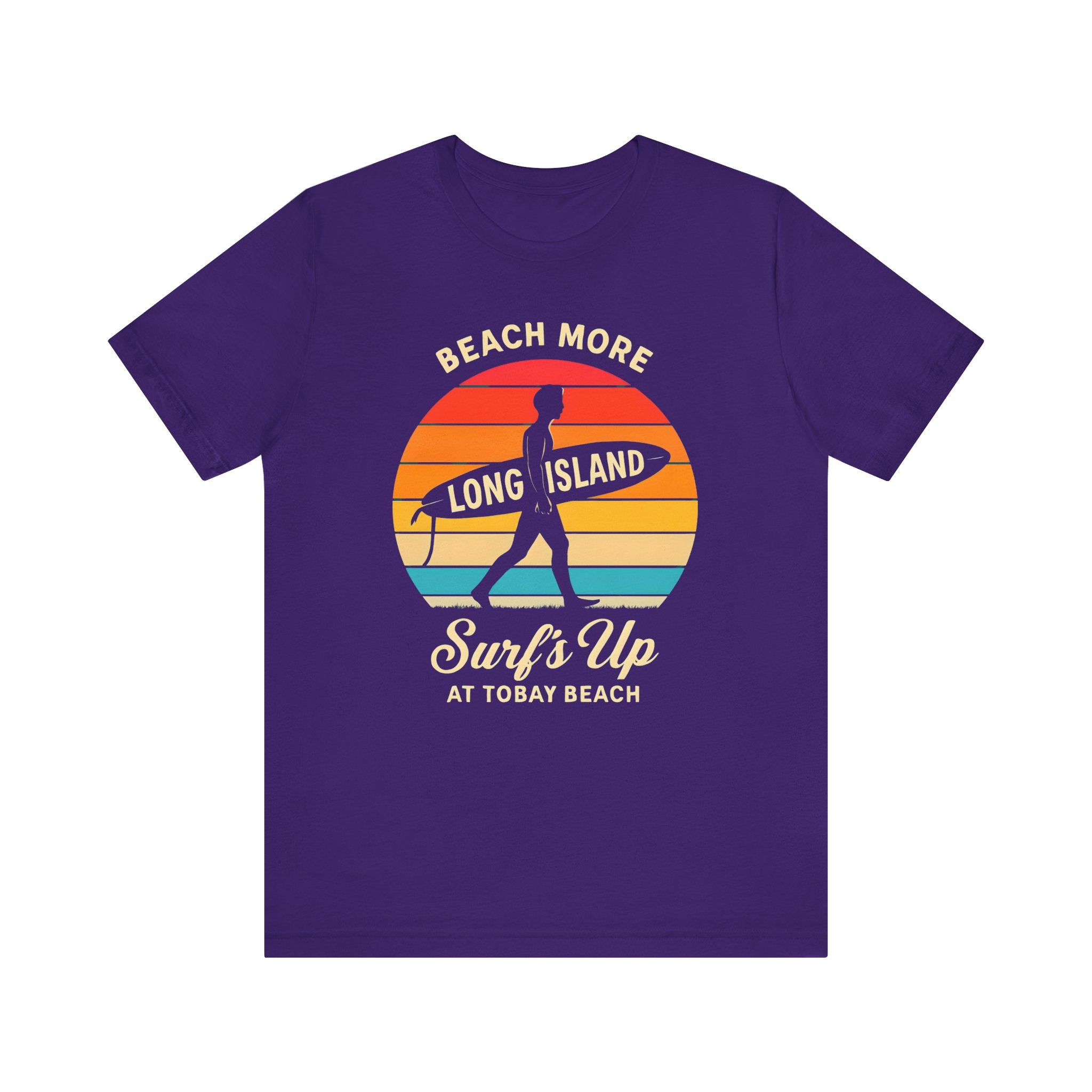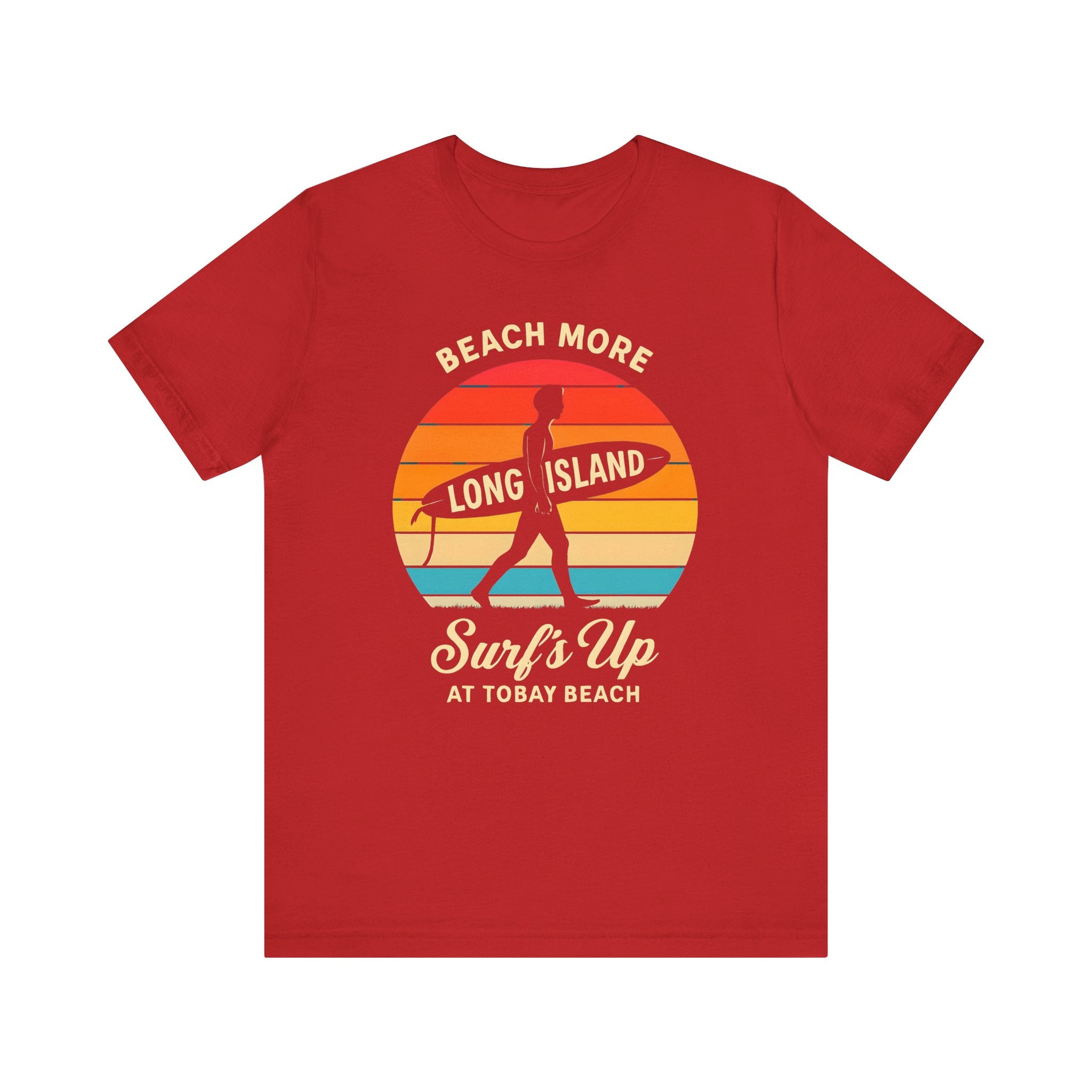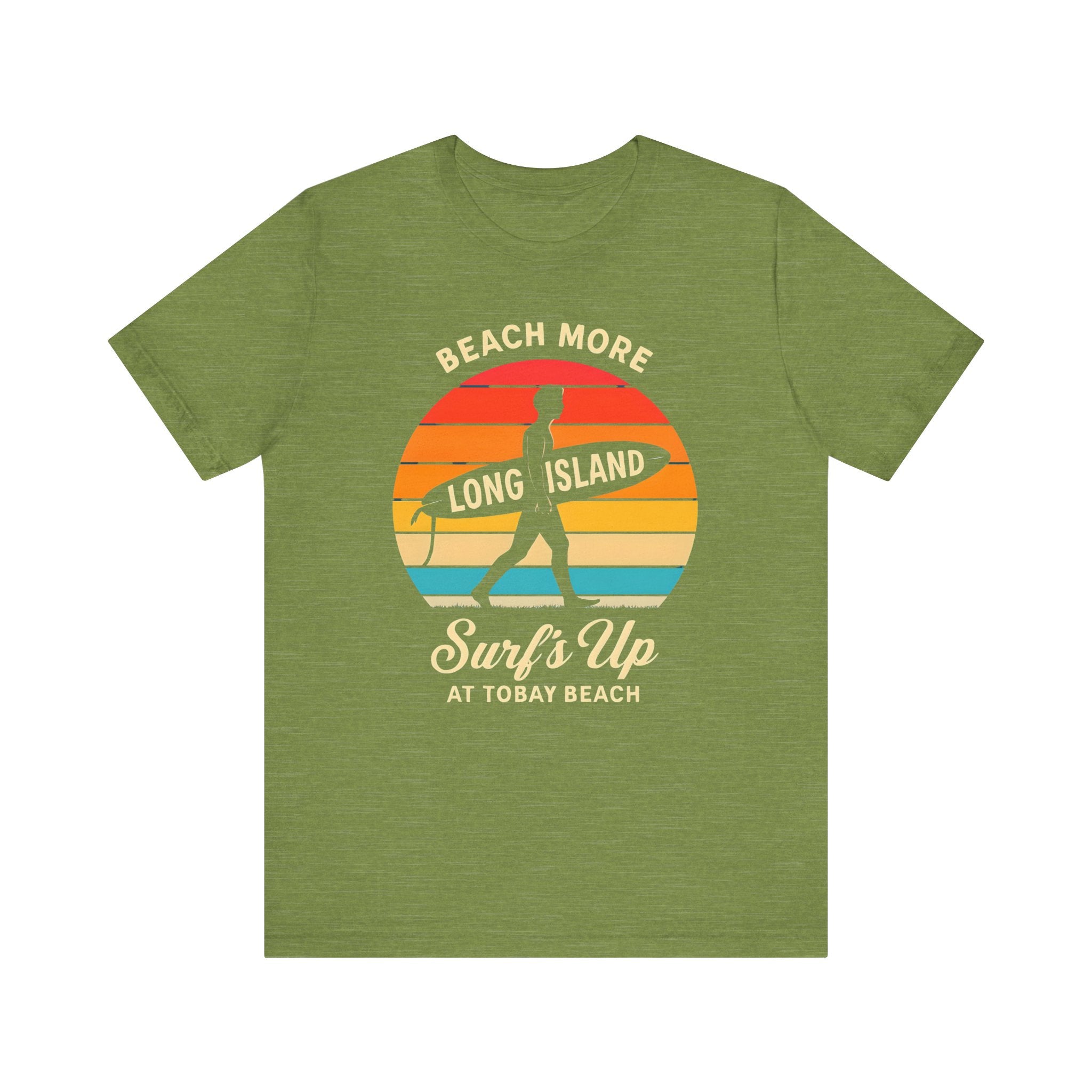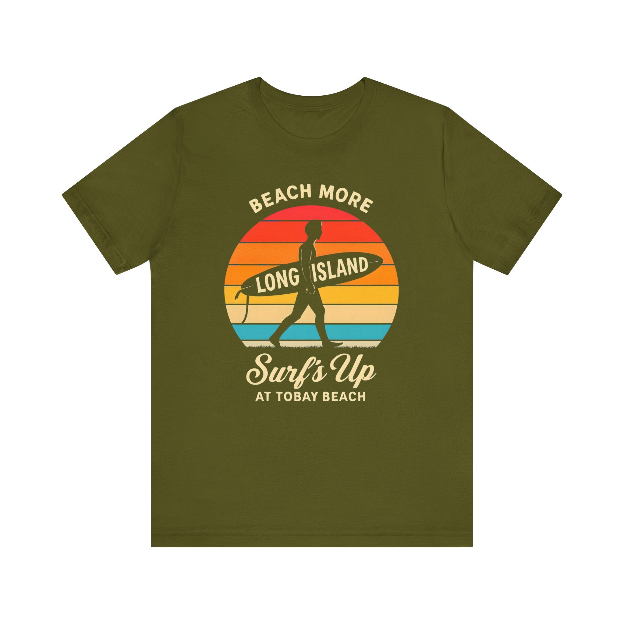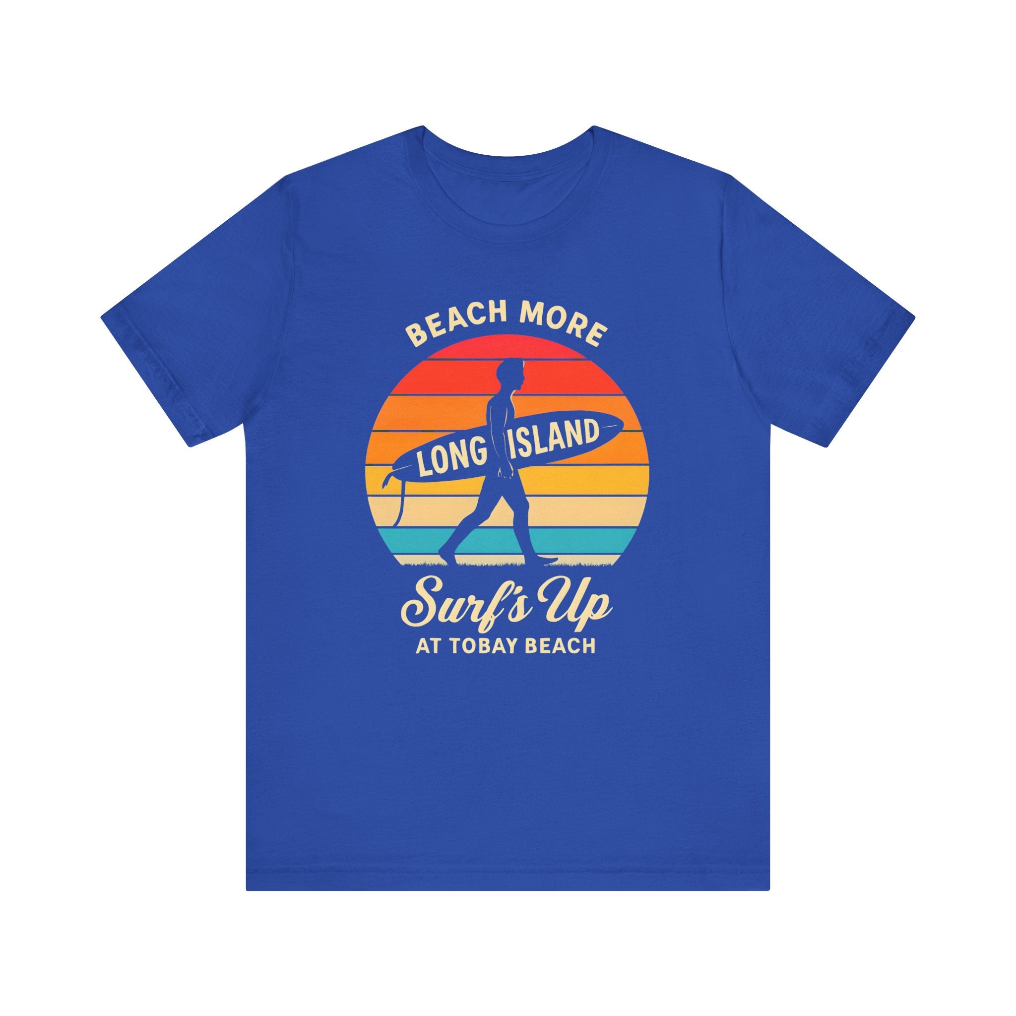 Tobay Beach Vibes Unisex Tee - Surf's Up Long Island. This summer shirt exudes casual beach lover vibes, perfect for surfing enthusiasts and vacation goers. Ideal for wearing during beach trips, summer vacations, or casual outings.