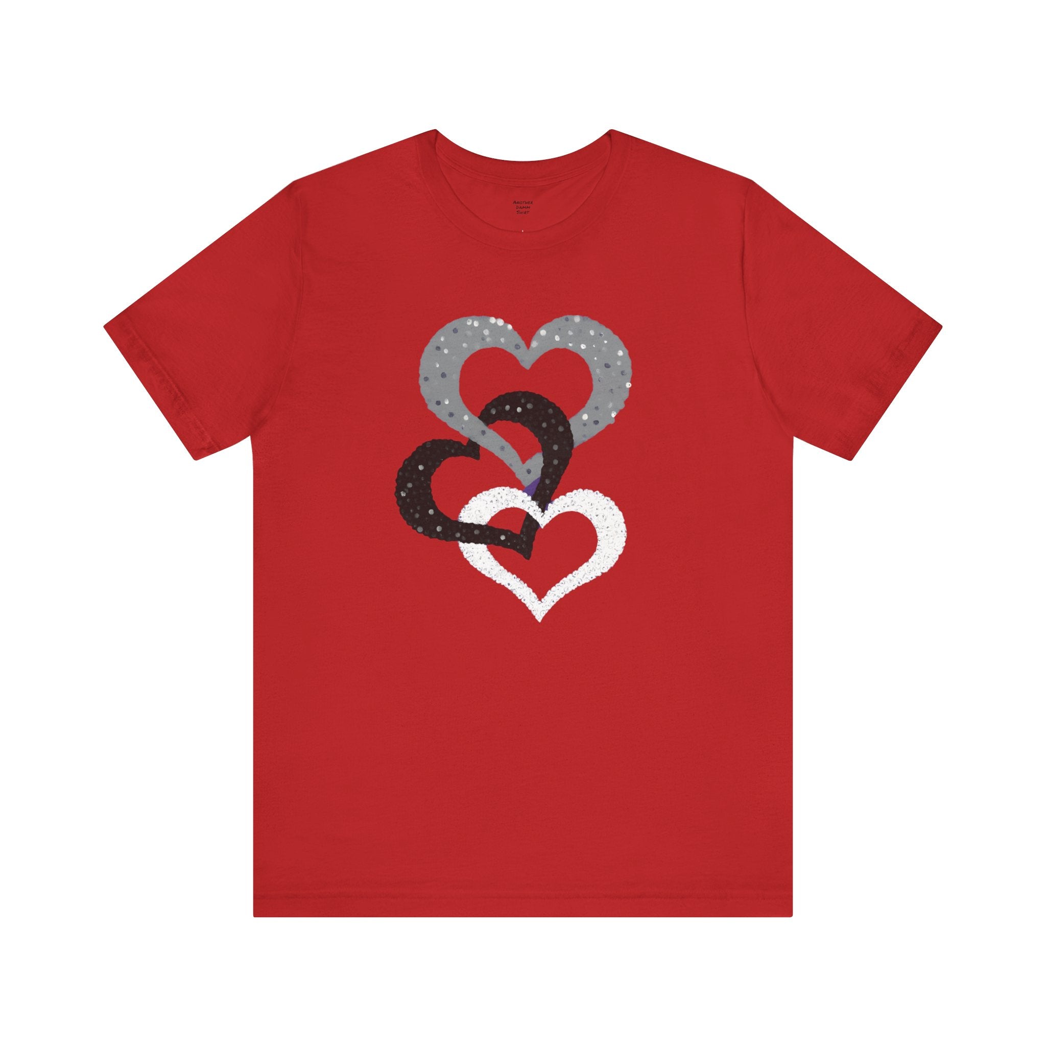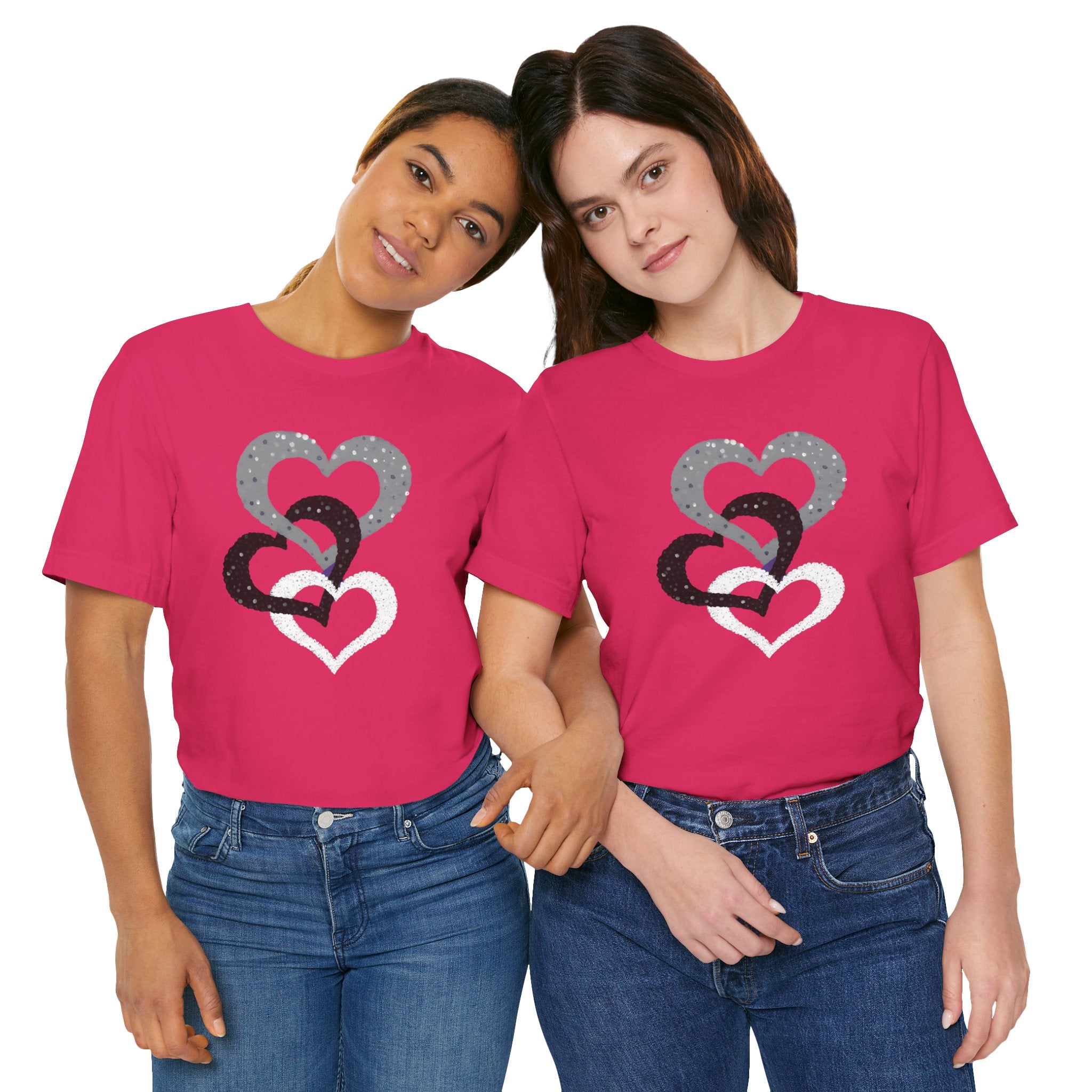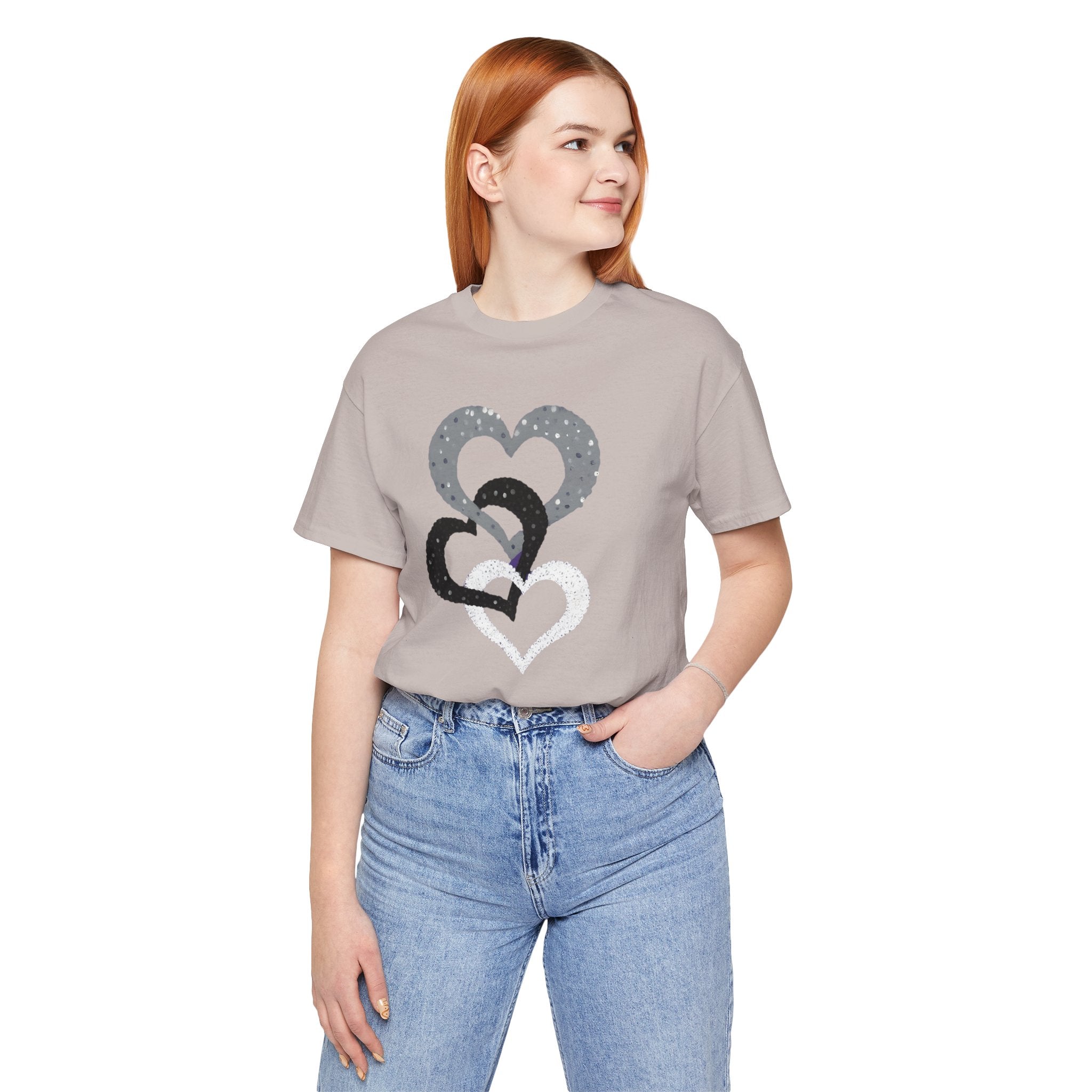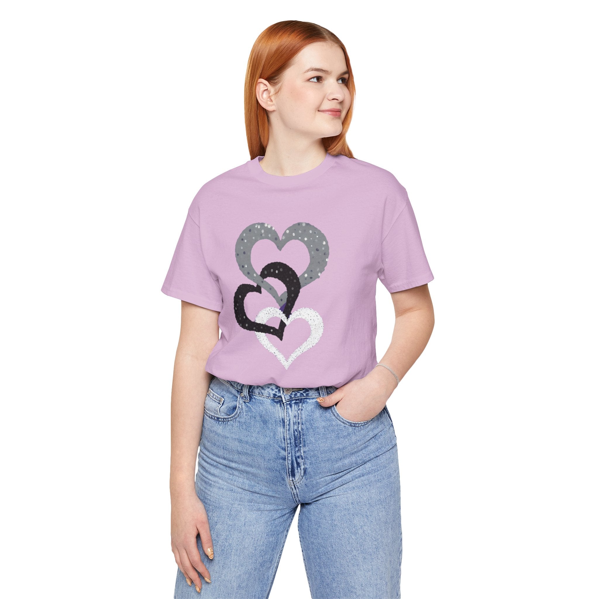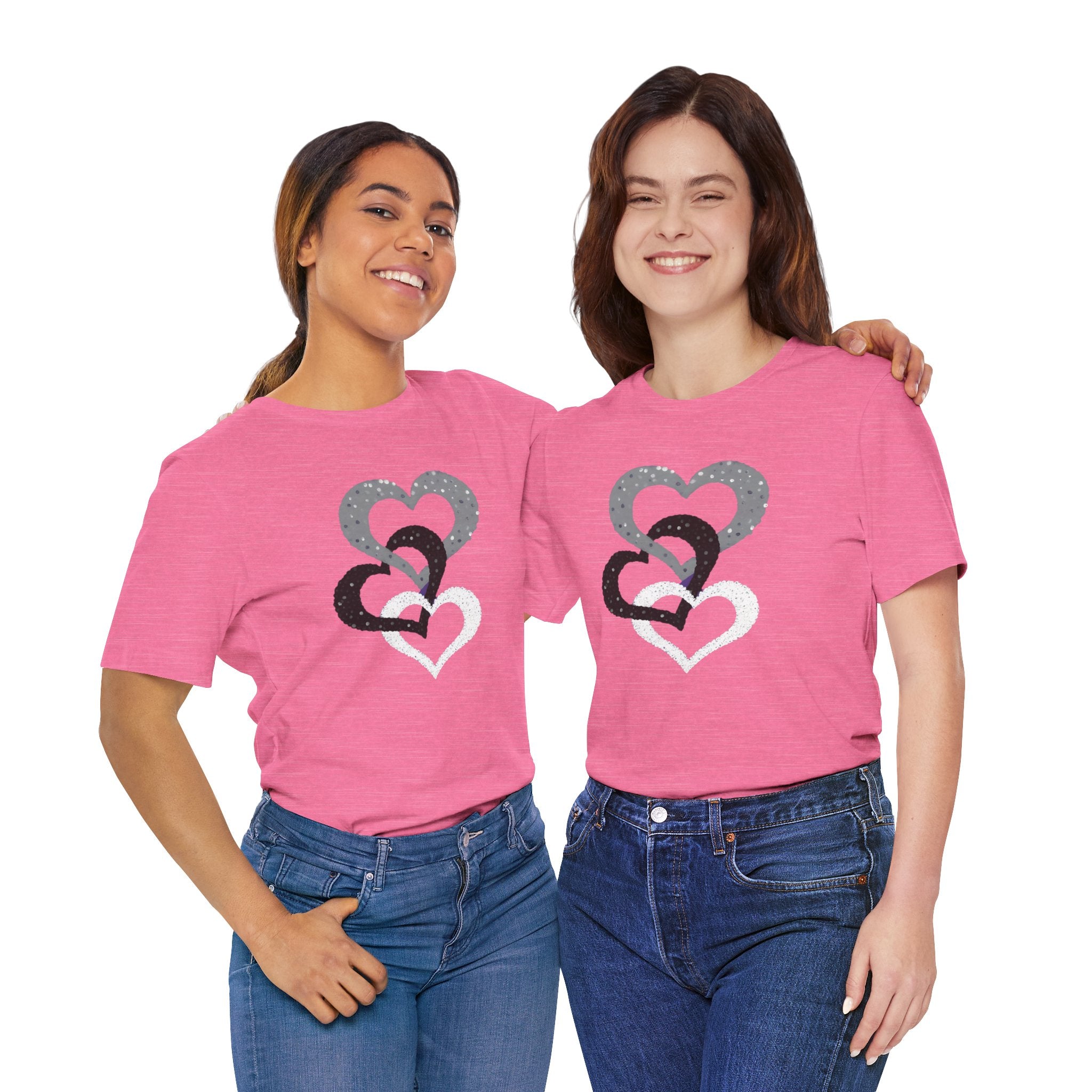 Love in Layers: Unisex Heart Design T-Shirt, perfect for casual wear and a great gift for her. This tee is ideal for Valentine's Day or everyday wear, giving off a casual and loving vibe. Suitable for adults.