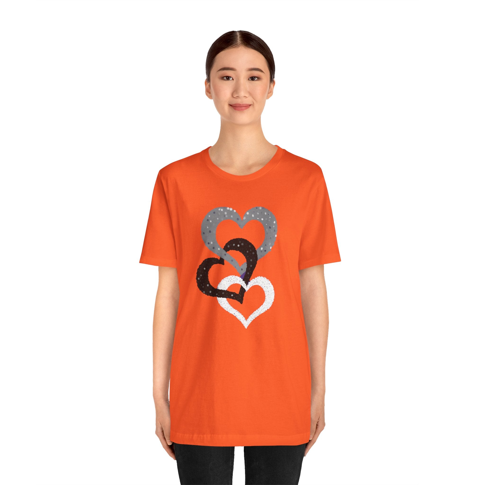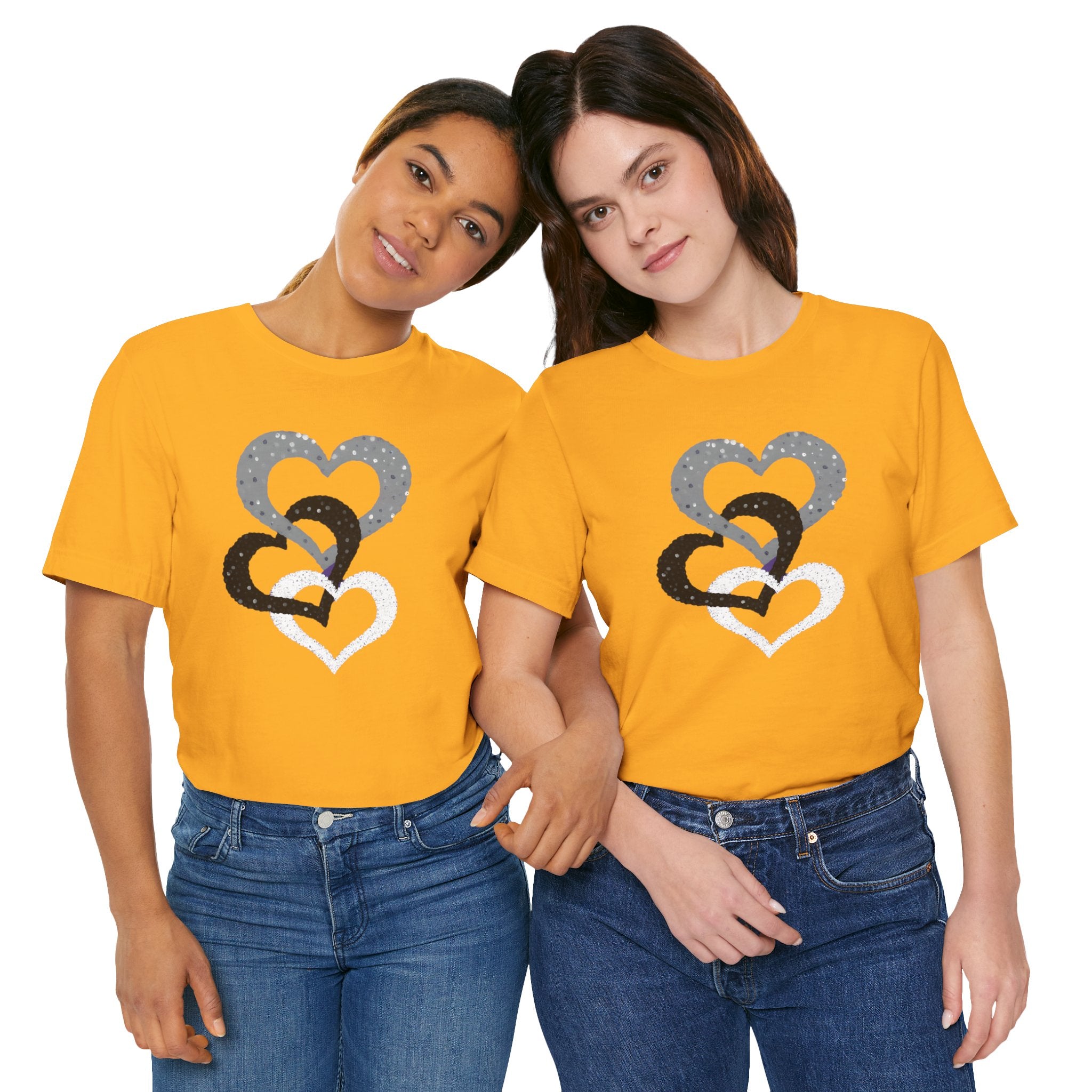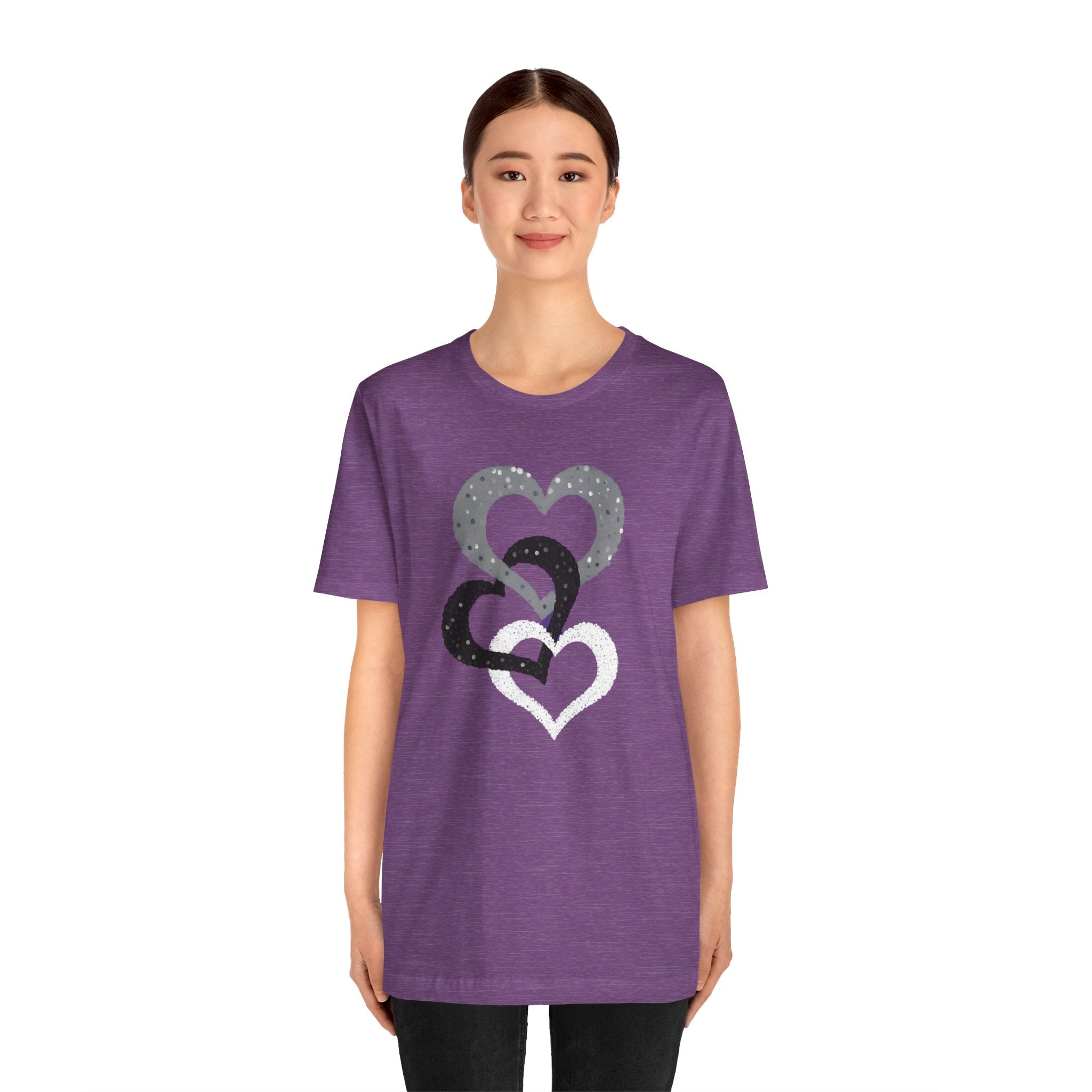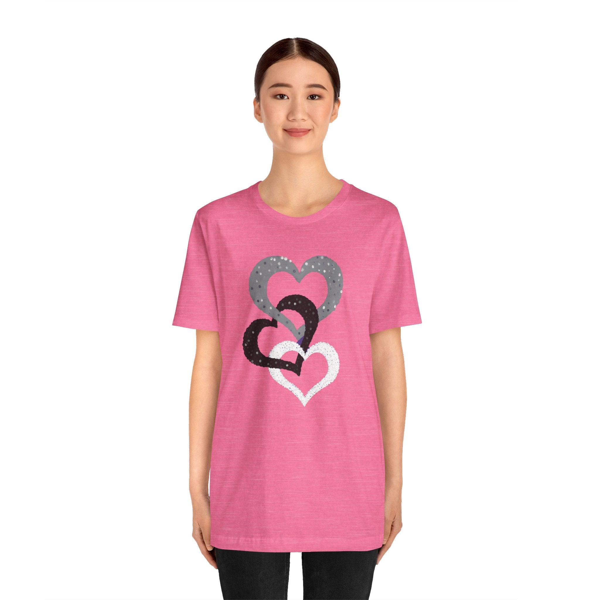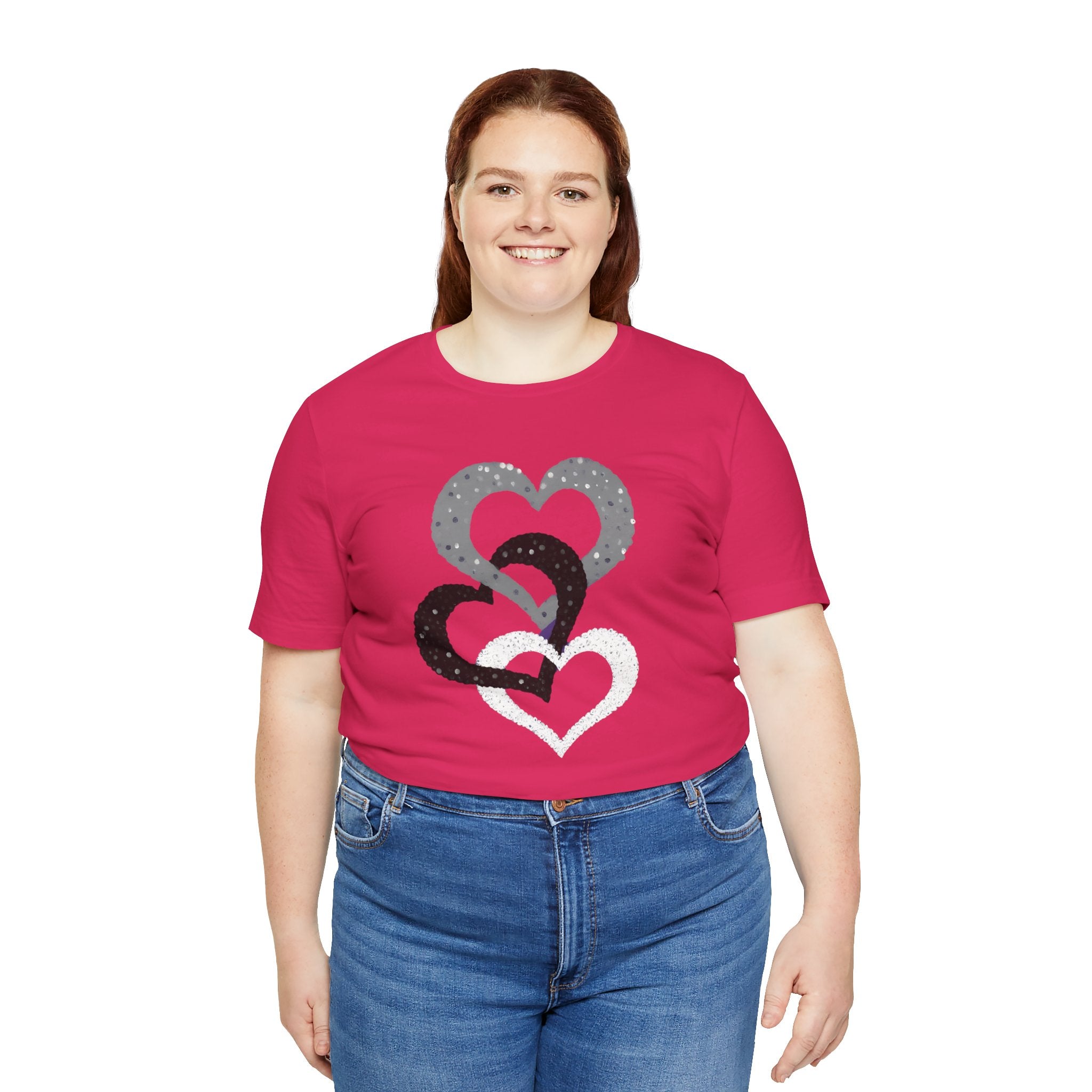 Love in Layers: Unisex Heart Design T-Shirt, perfect for casual wear and a great gift for her. This tee is ideal for Valentine's Day or everyday wear, giving off a casual and loving vibe. Suitable for adults.