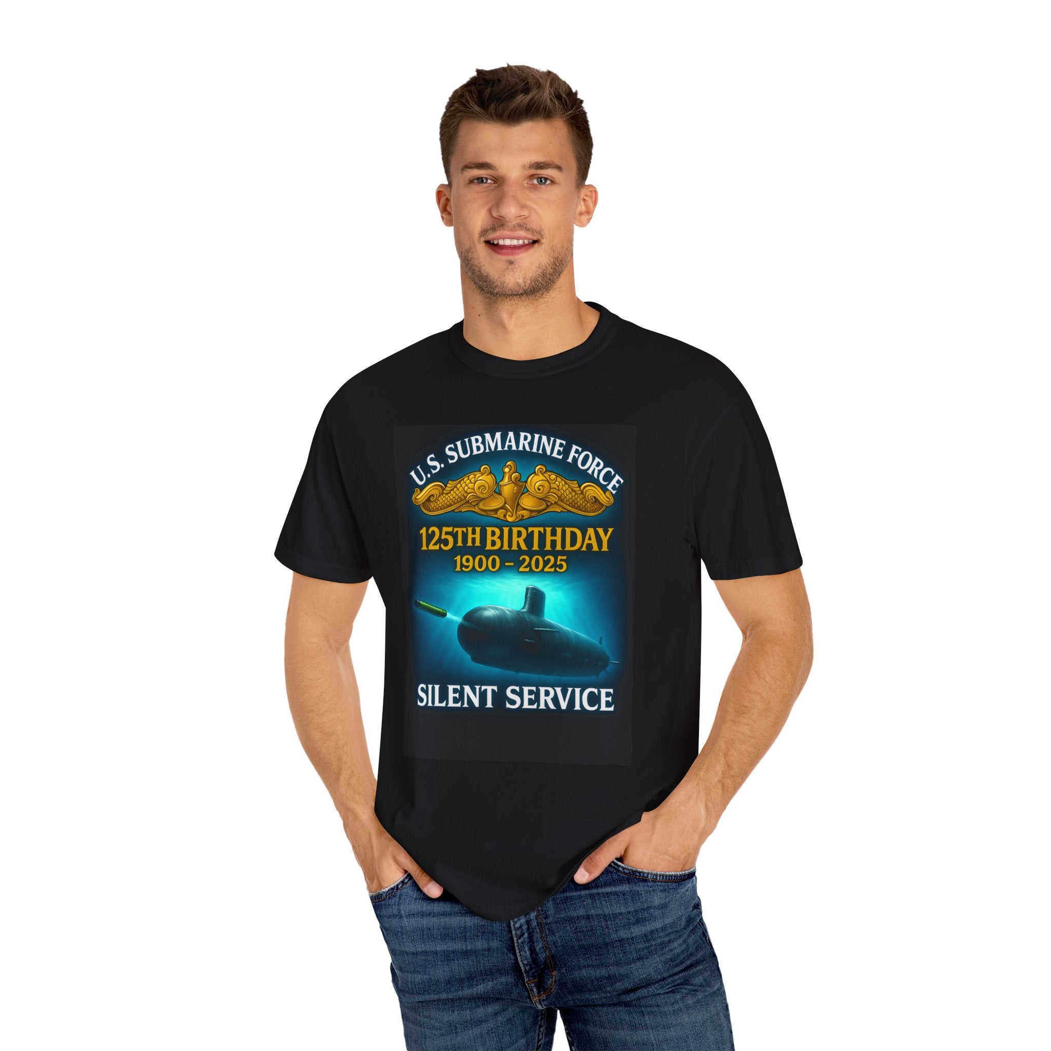 This garment-dyed tee honors the U.S. Submarine Force with a bold, vintage-inspired front print celebrating “125th Birthday 1900–2025” and the phrase “Silent Service.” The deep black cotton background makes the gold insignia and submarine artwork stand out with a subtle worn-in look from the garment-dye process. Feels soft to the touch and drapes with a relaxed fit — the kind of shirt you reach for on deck visits, reunion weekends, or quiet evenings remembering service and brotherhood. It reads like a nod to tradition: understated, respectful, and built to last.