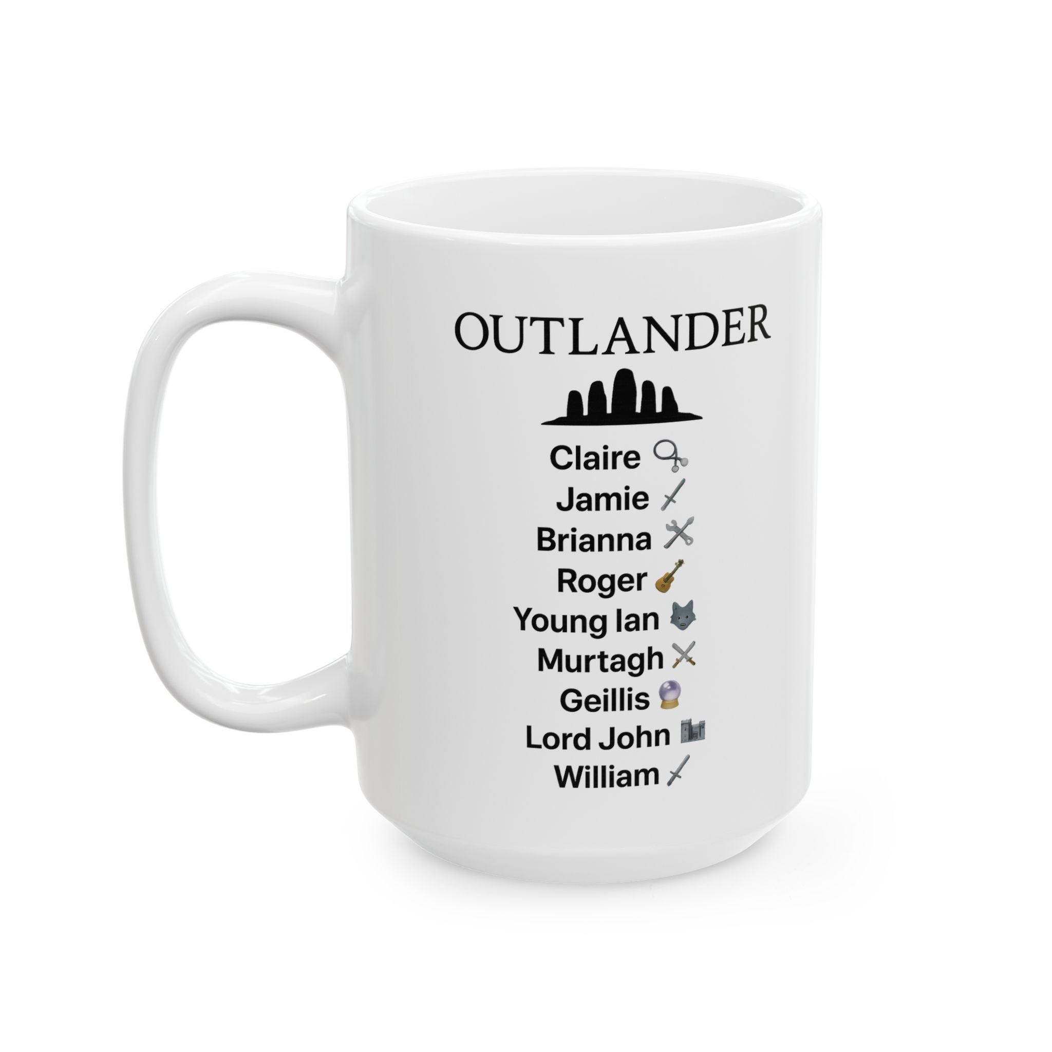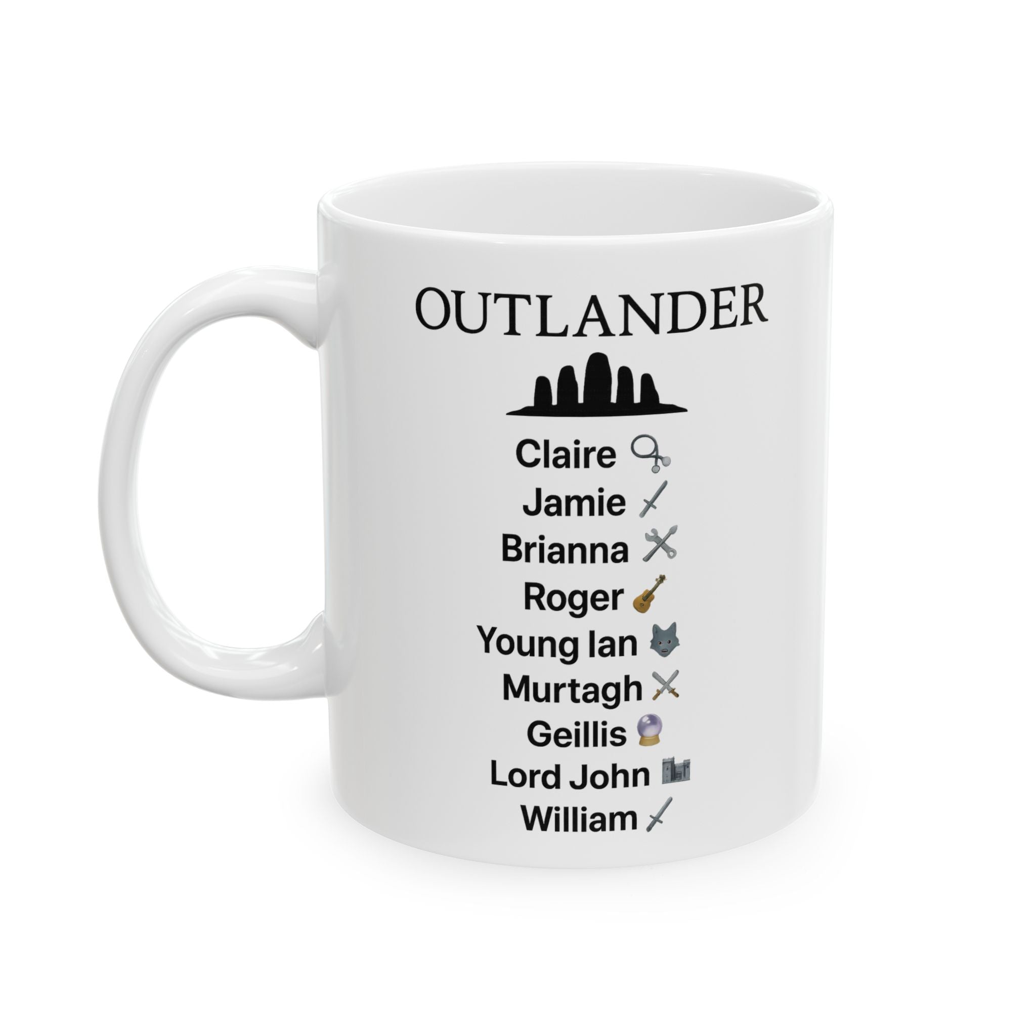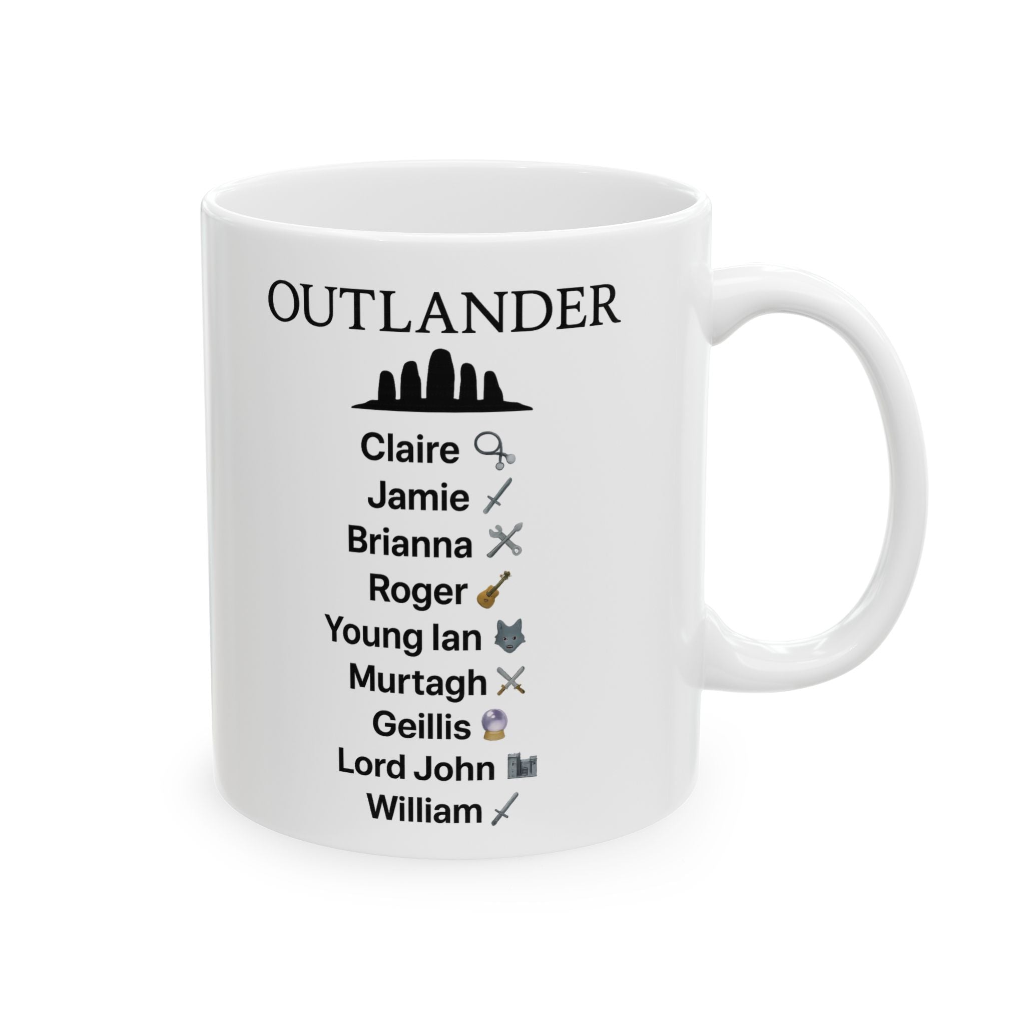 Unique Outlander Ceramic Mug - Perfect Gift for Coffee Lovers, Scottish Character Names with personalized Emojis, Unique Fan Gift, Tea Enthusiasts, Cozy Home Decor, Holiday Gifts. This mug brings a cozy and personalized touch to your daily coffee or tea routine. Perfect for Outlander fans and those who appreciate unique design. Ideal for gifting during holidays and special occasions.