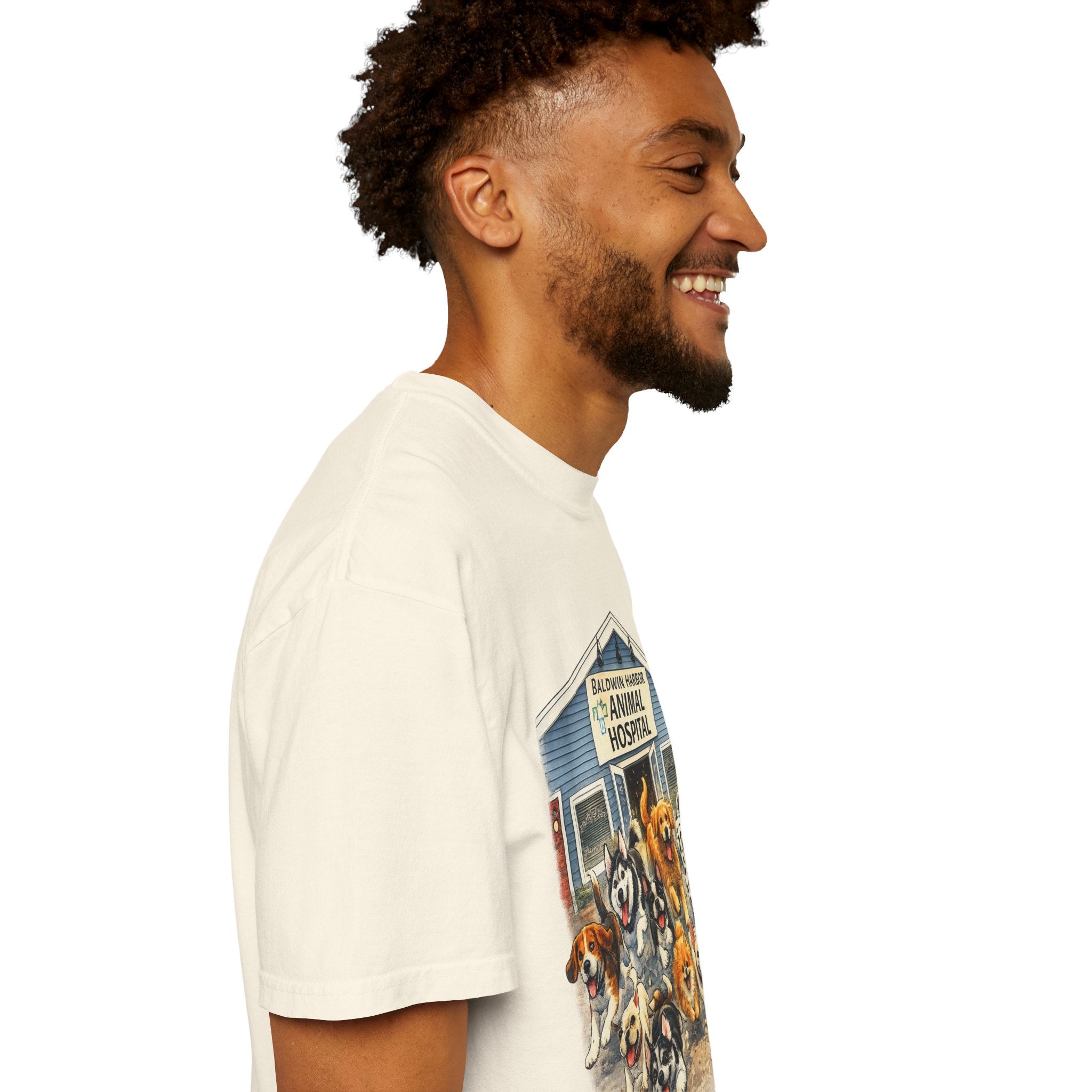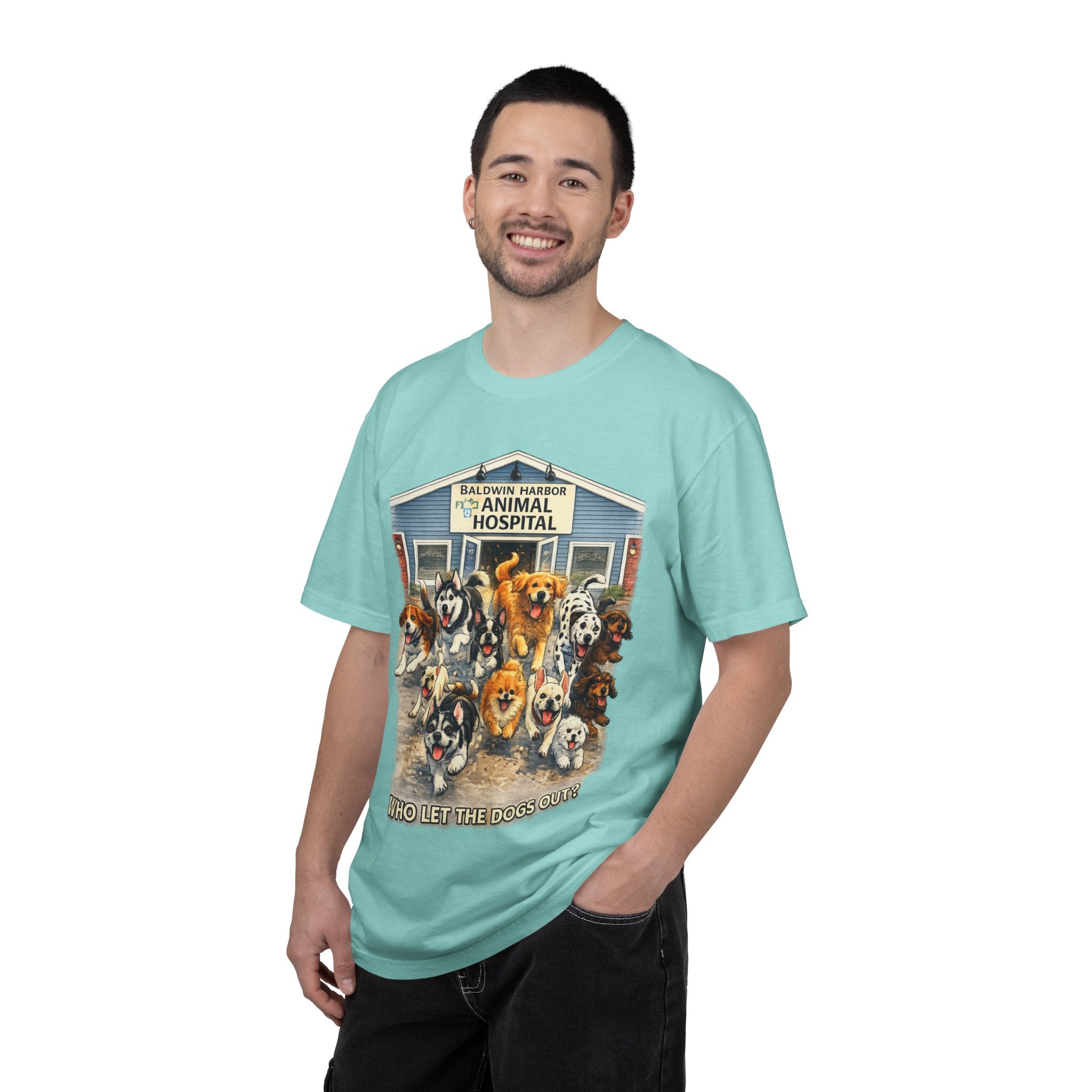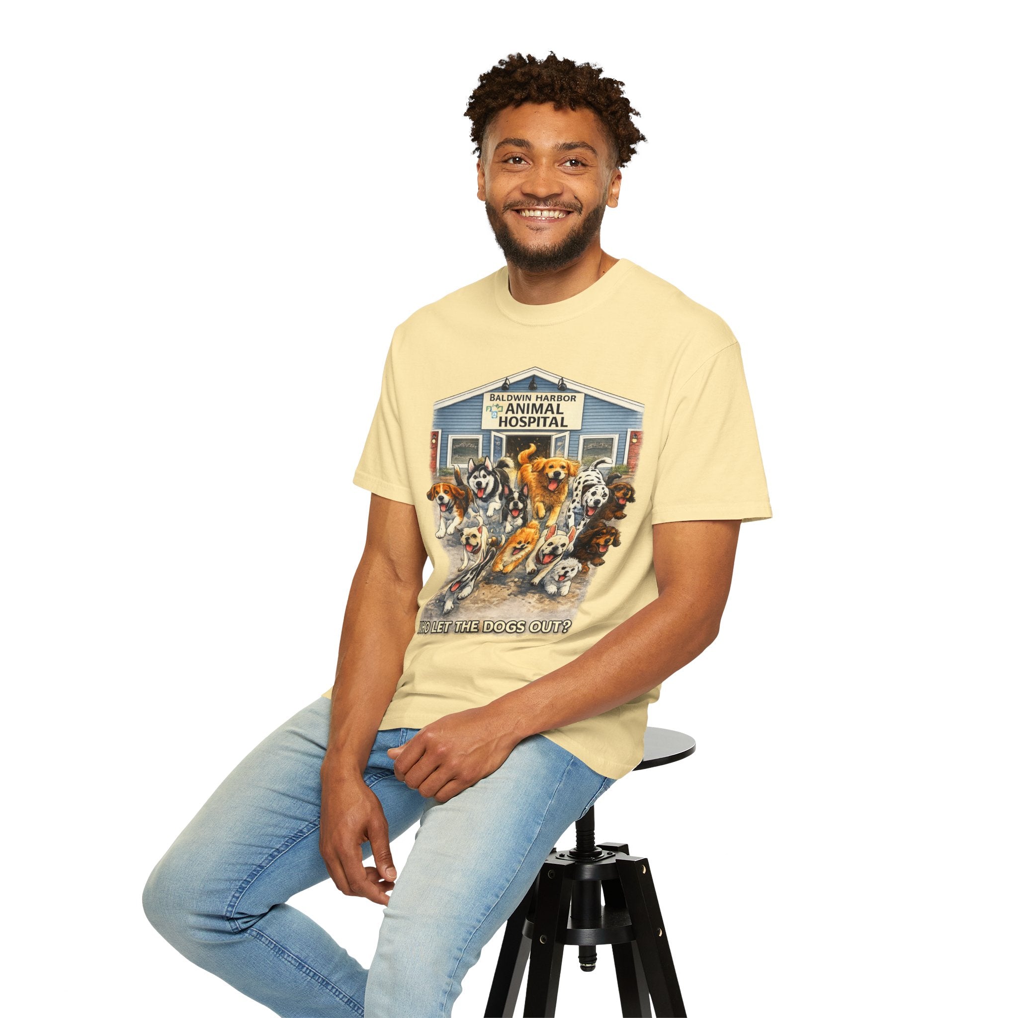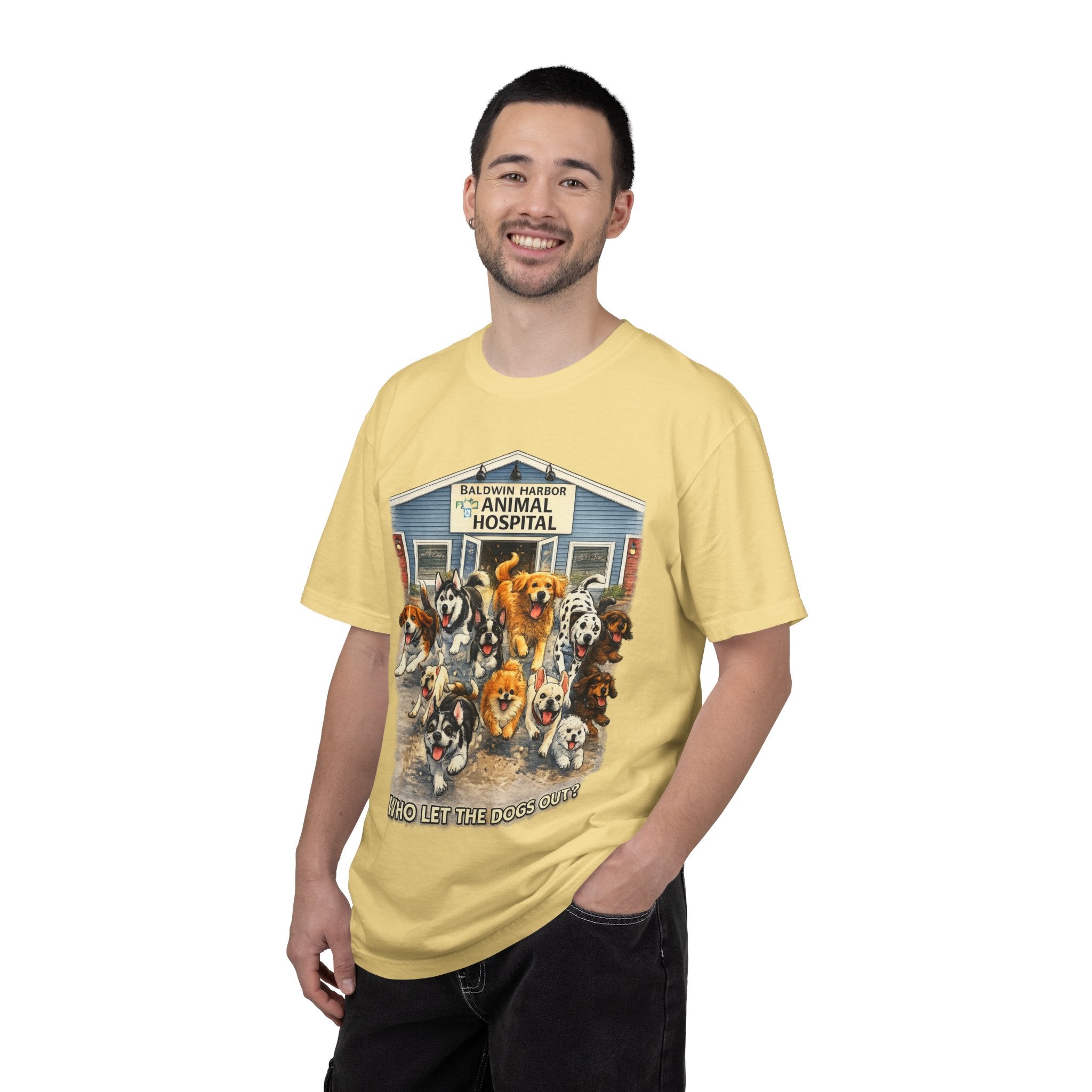 This garment-dyed tee brings warm, lived-in comfort with a playful, nostalgic print of happy dogs charging out of a seaside animal hospital. The heavyweight 100% ring-spun cotton softens with wear and wash, revealing the subtle texture and slightly faded tones unique to garment-dyed fabric. A relaxed cut and tubular knit (no side seams) make it easy to layer or wear solo. Wear it on weekend walks, at casual clinic shifts, or while volunteering at animal rescues — the artwork starts conversations and carries an easygoing, compassionate vibe.
