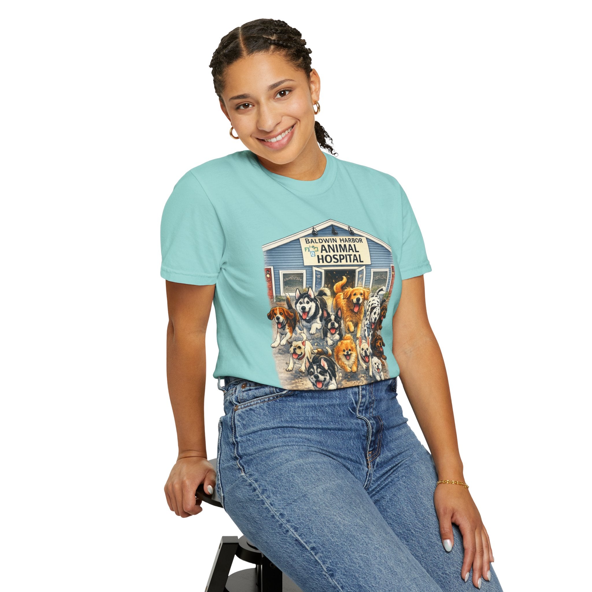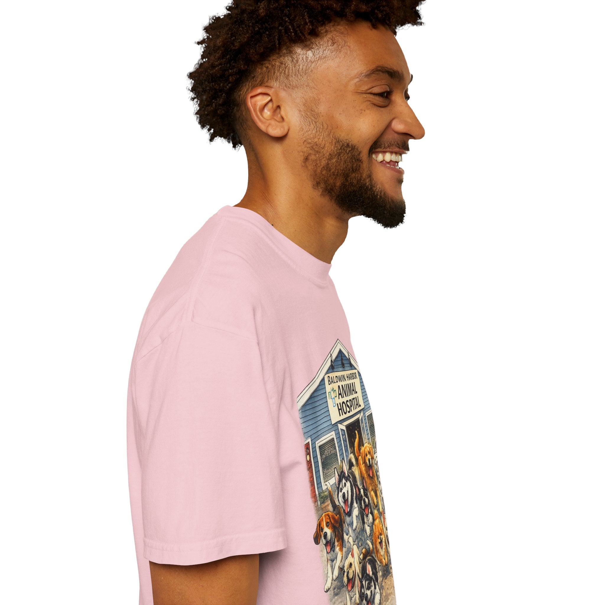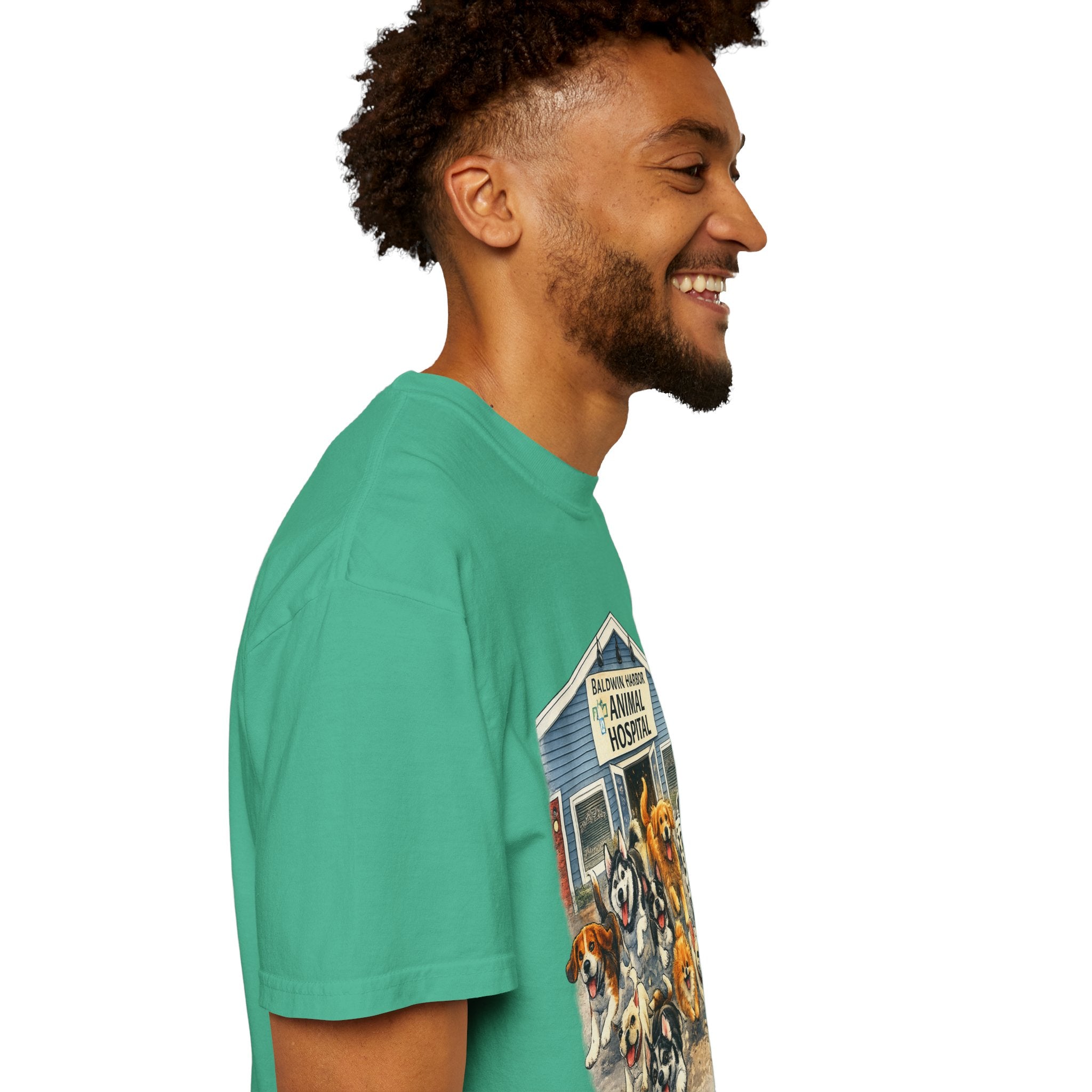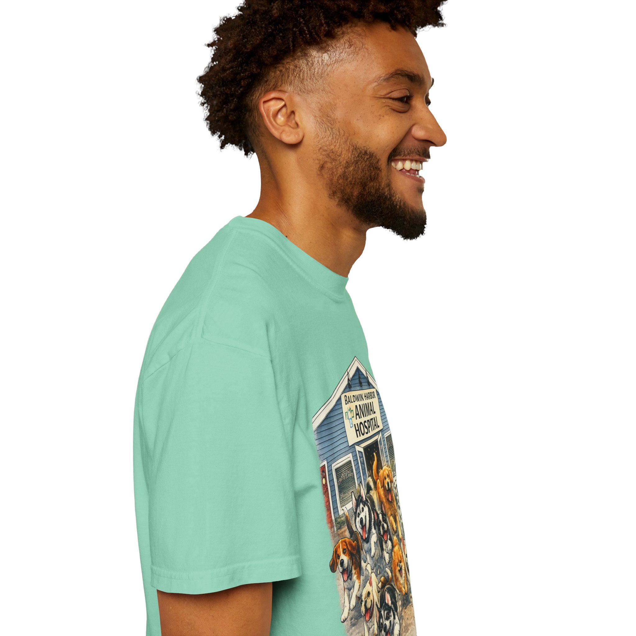 This garment-dyed tee brings warm, lived-in comfort with a playful, nostalgic print of happy dogs charging out of a seaside animal hospital. The heavyweight 100% ring-spun cotton softens with wear and wash, revealing the subtle texture and slightly faded tones unique to garment-dyed fabric. A relaxed cut and tubular knit (no side seams) make it easy to layer or wear solo. Wear it on weekend walks, at casual clinic shifts, or while volunteering at animal rescues — the artwork starts conversations and carries an easygoing, compassionate vibe.