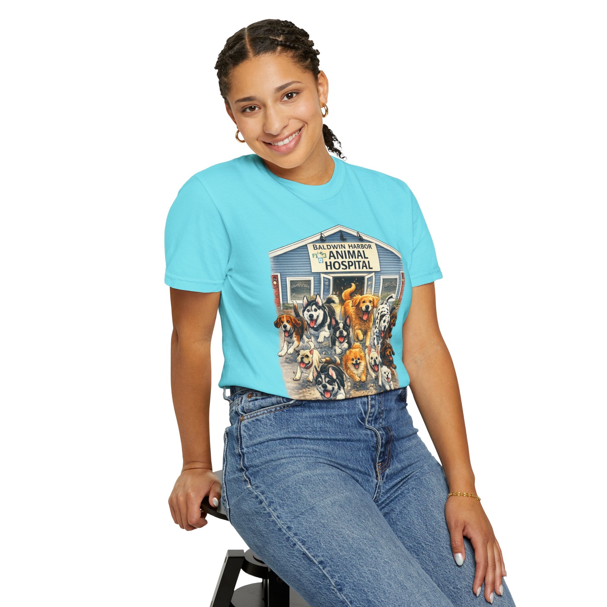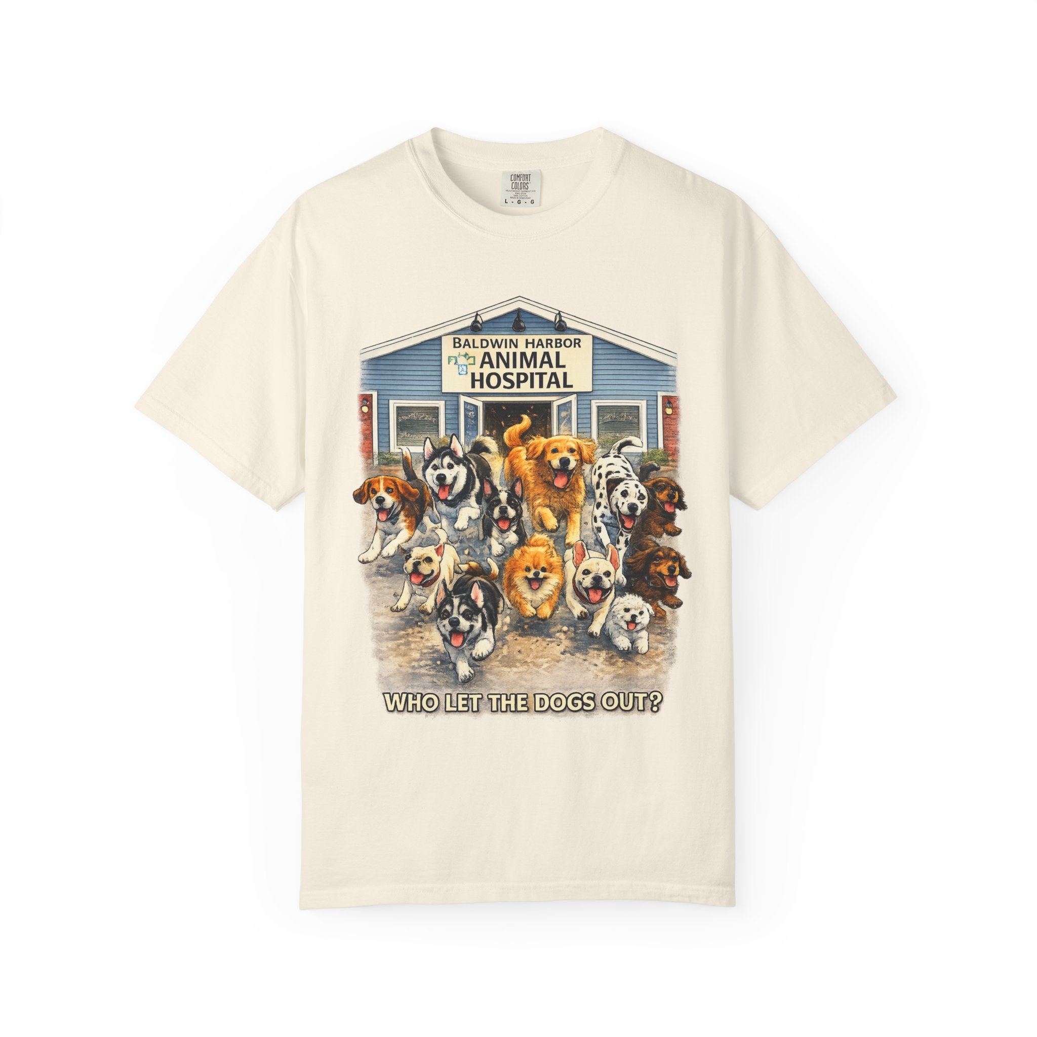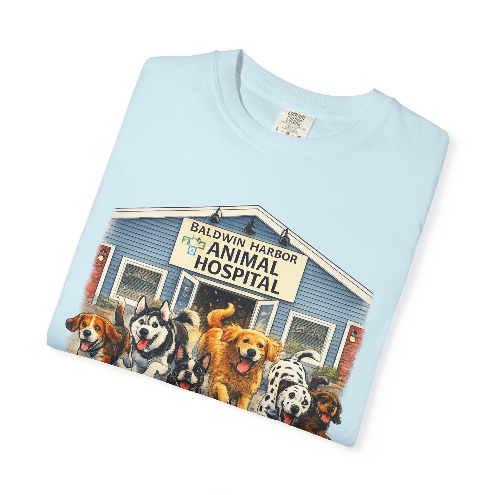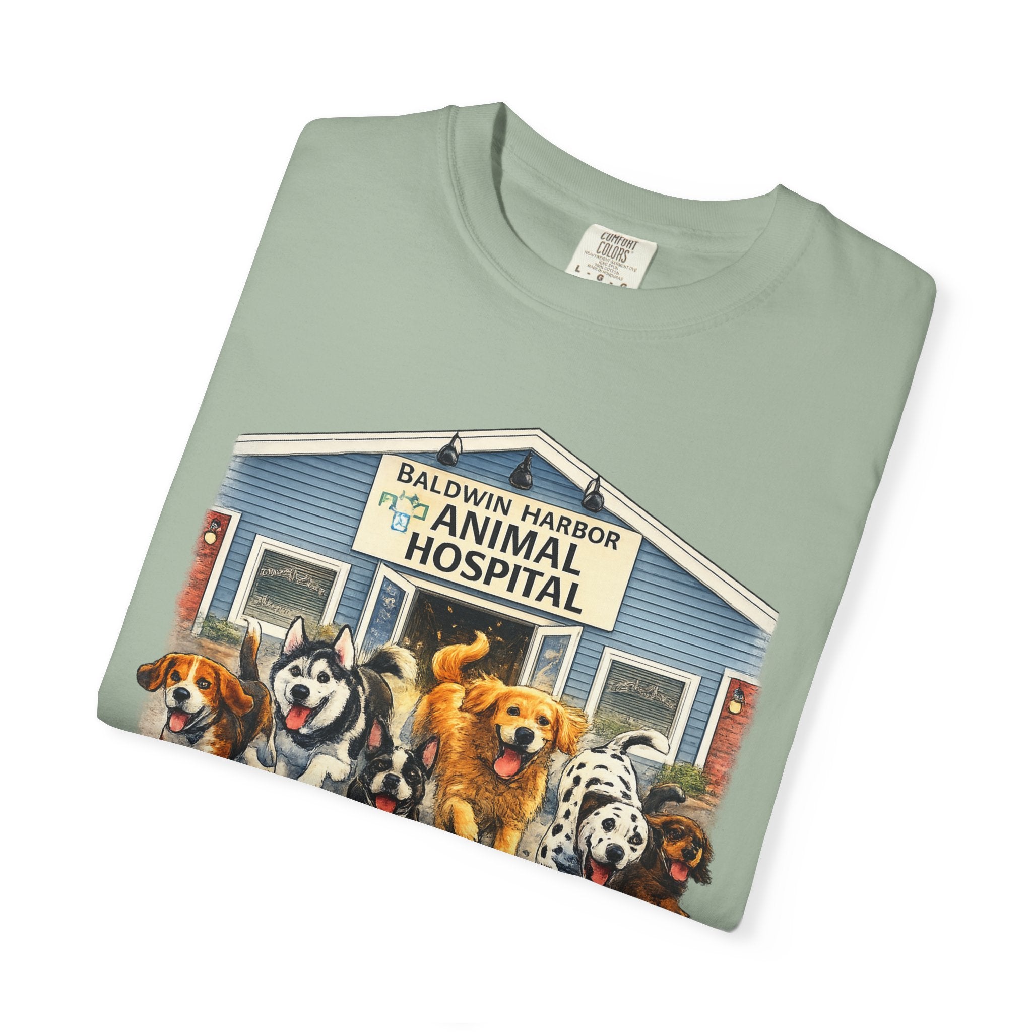 This garment-dyed tee brings warm, lived-in comfort with a playful, nostalgic print of happy dogs charging out of a seaside animal hospital. The heavyweight 100% ring-spun cotton softens with wear and wash, revealing the subtle texture and slightly faded tones unique to garment-dyed fabric. A relaxed cut and tubular knit (no side seams) make it easy to layer or wear solo. Wear it on weekend walks, at casual clinic shifts, or while volunteering at animal rescues — the artwork starts conversations and carries an easygoing, compassionate vibe.