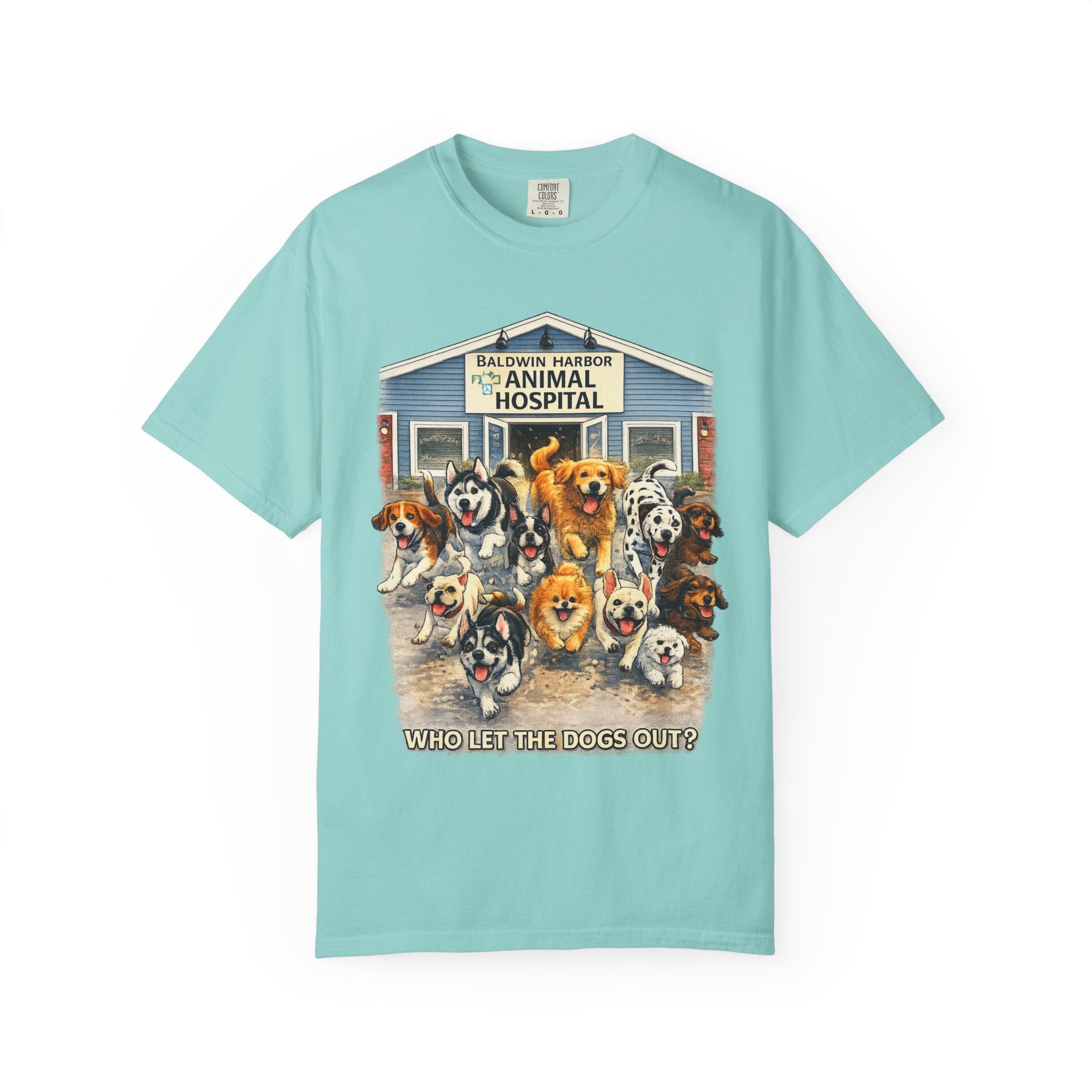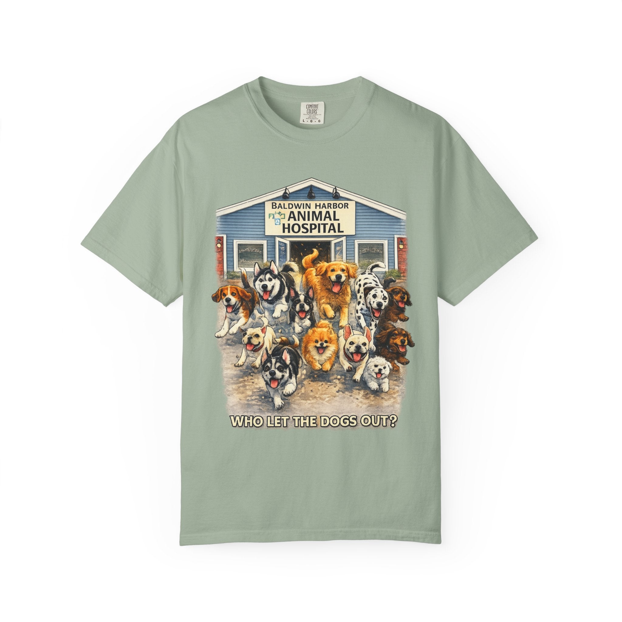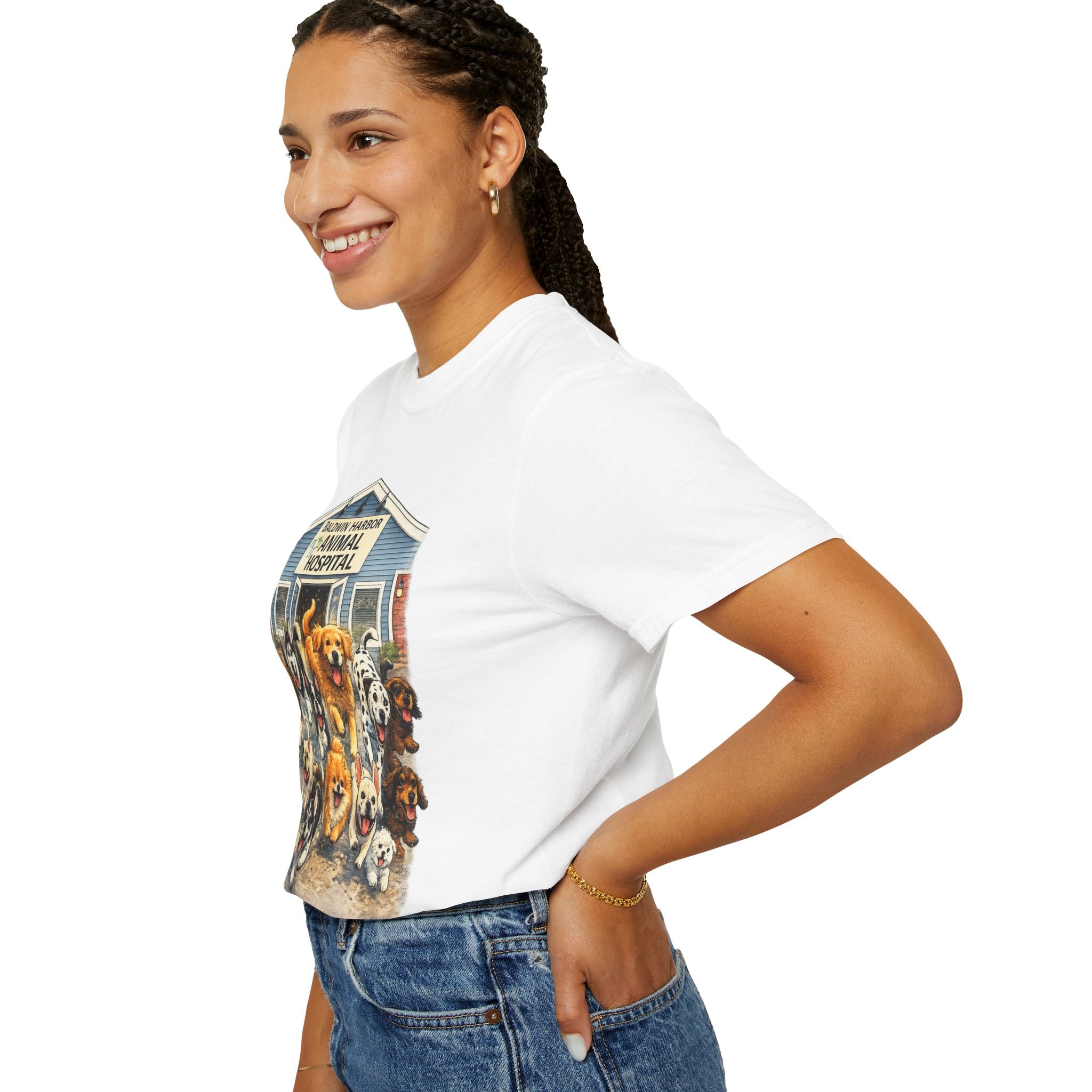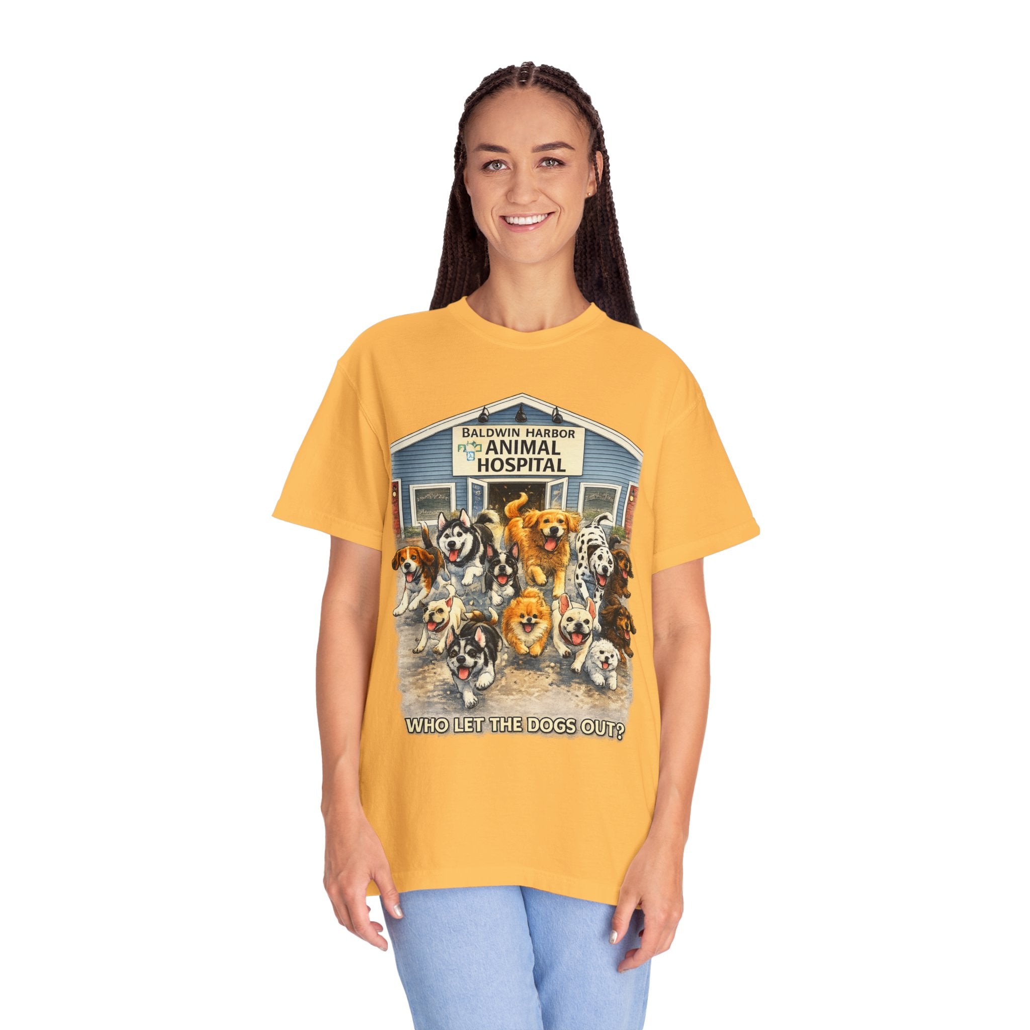 This garment-dyed tee brings warm, lived-in comfort with a playful, nostalgic print of happy dogs charging out of a seaside animal hospital. The heavyweight 100% ring-spun cotton softens with wear and wash, revealing the subtle texture and slightly faded tones unique to garment-dyed fabric. A relaxed cut and tubular knit (no side seams) make it easy to layer or wear solo. Wear it on weekend walks, at casual clinic shifts, or while volunteering at animal rescues — the artwork starts conversations and carries an easygoing, compassionate vibe.